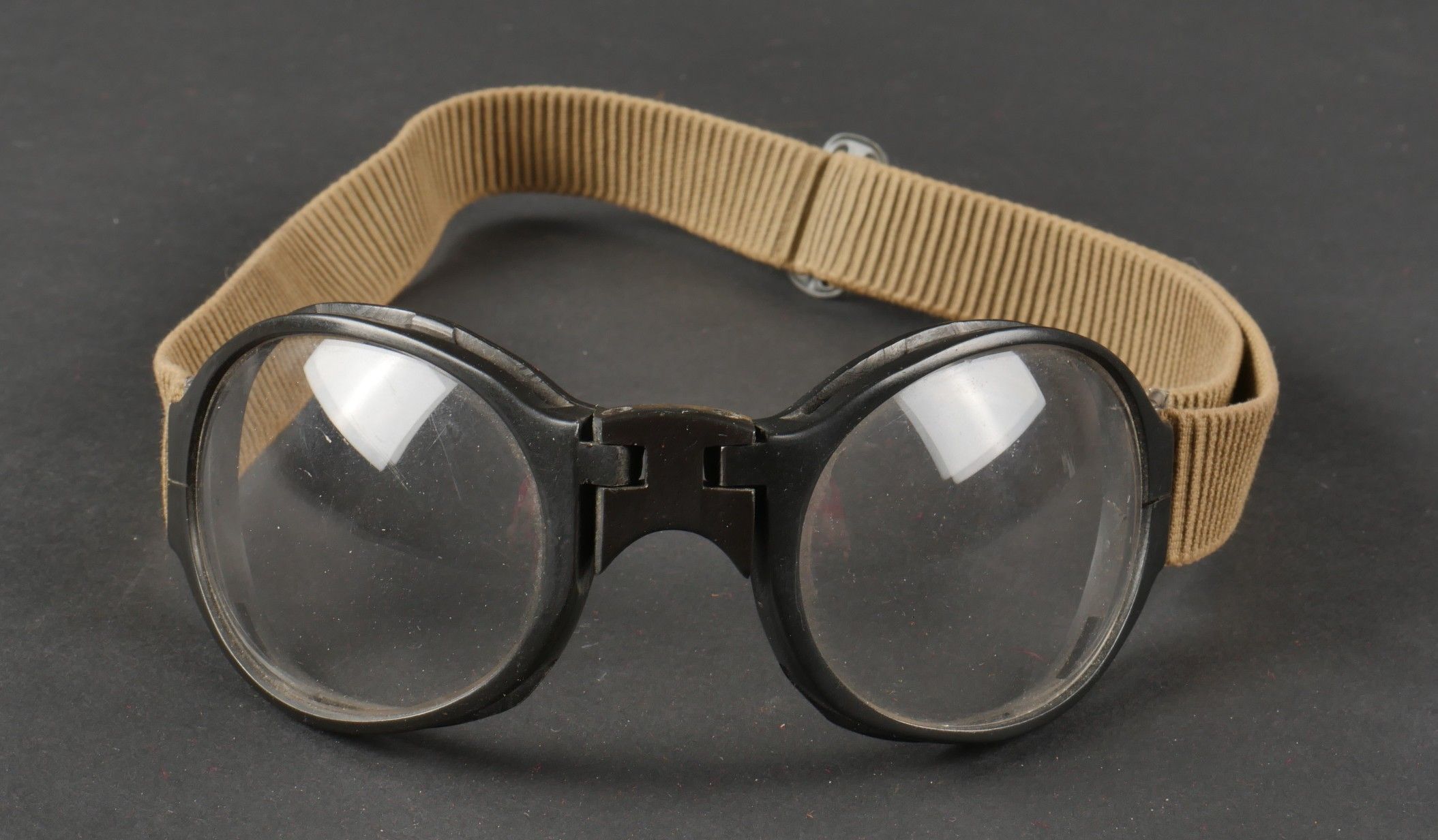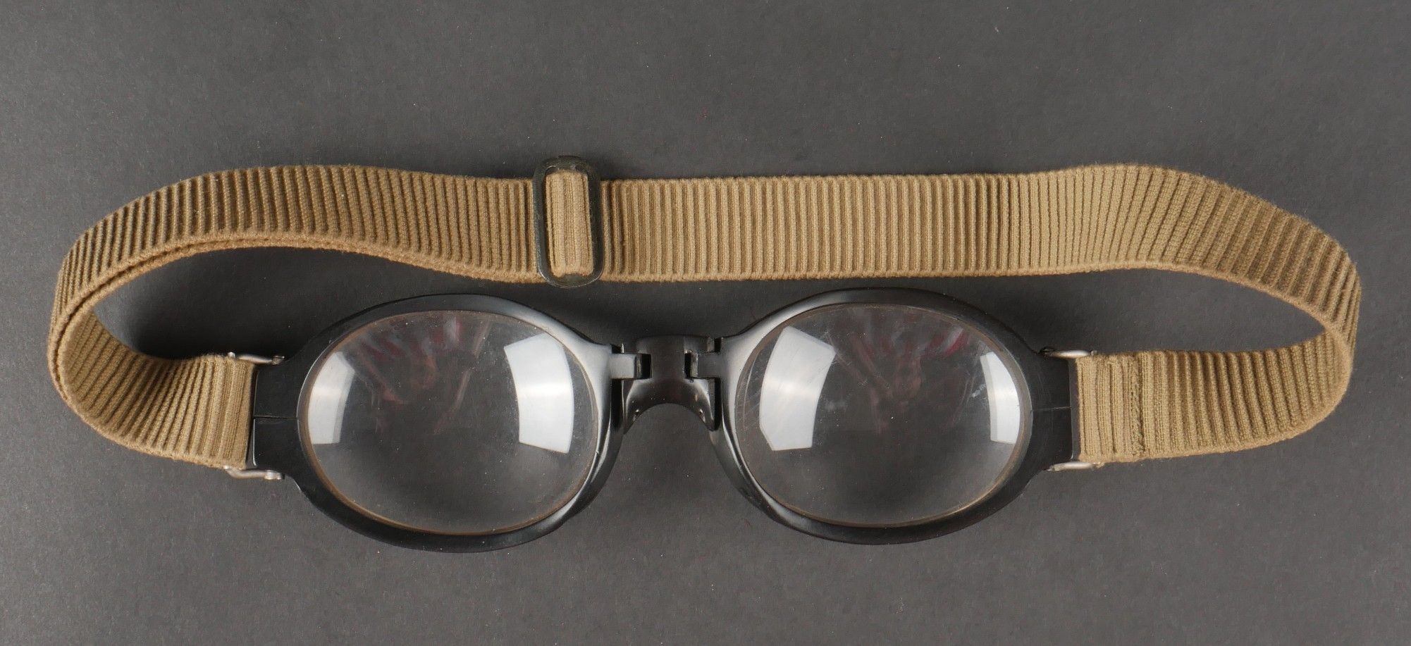 Lunettes de vol allemande. Armature pliante en bakélite noire. Verres blanc. Sans marquages visibles. Elastique de serrage souple. Ensemble en parfait état. A noter une légère usure et patine de la pièce. Etat I-. German flight goggles. Folding black Bakelite frame with white lenses. No visible markings. Soft elastic strap. The set is in excellent condition, with only light wear and patina. Condition I–.