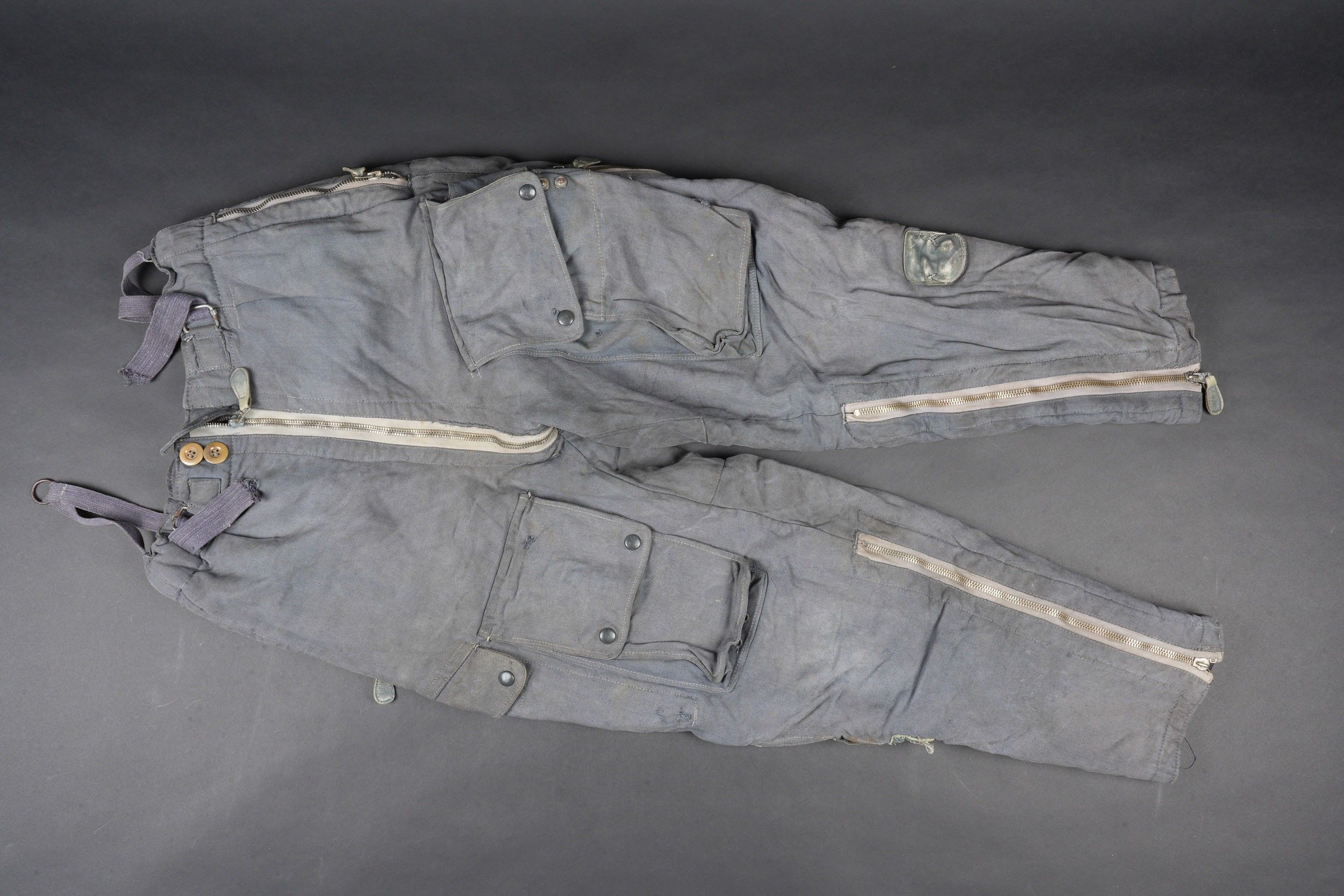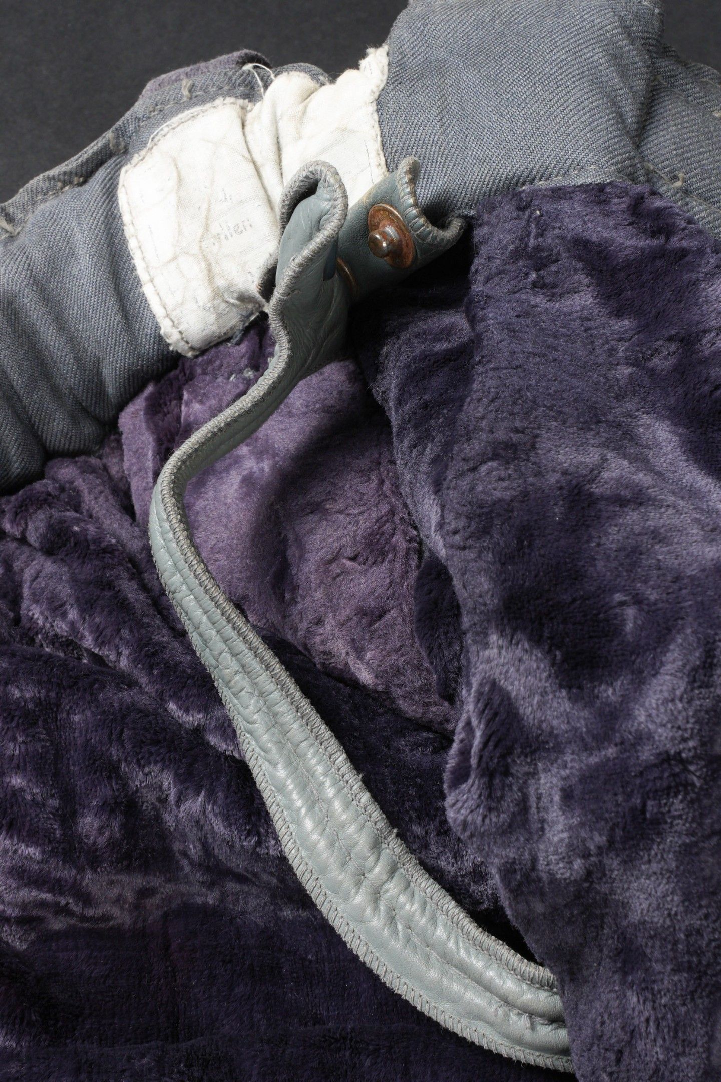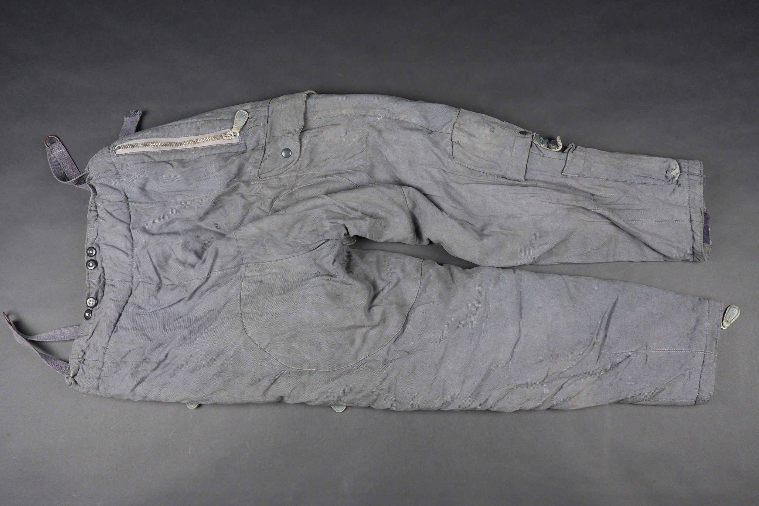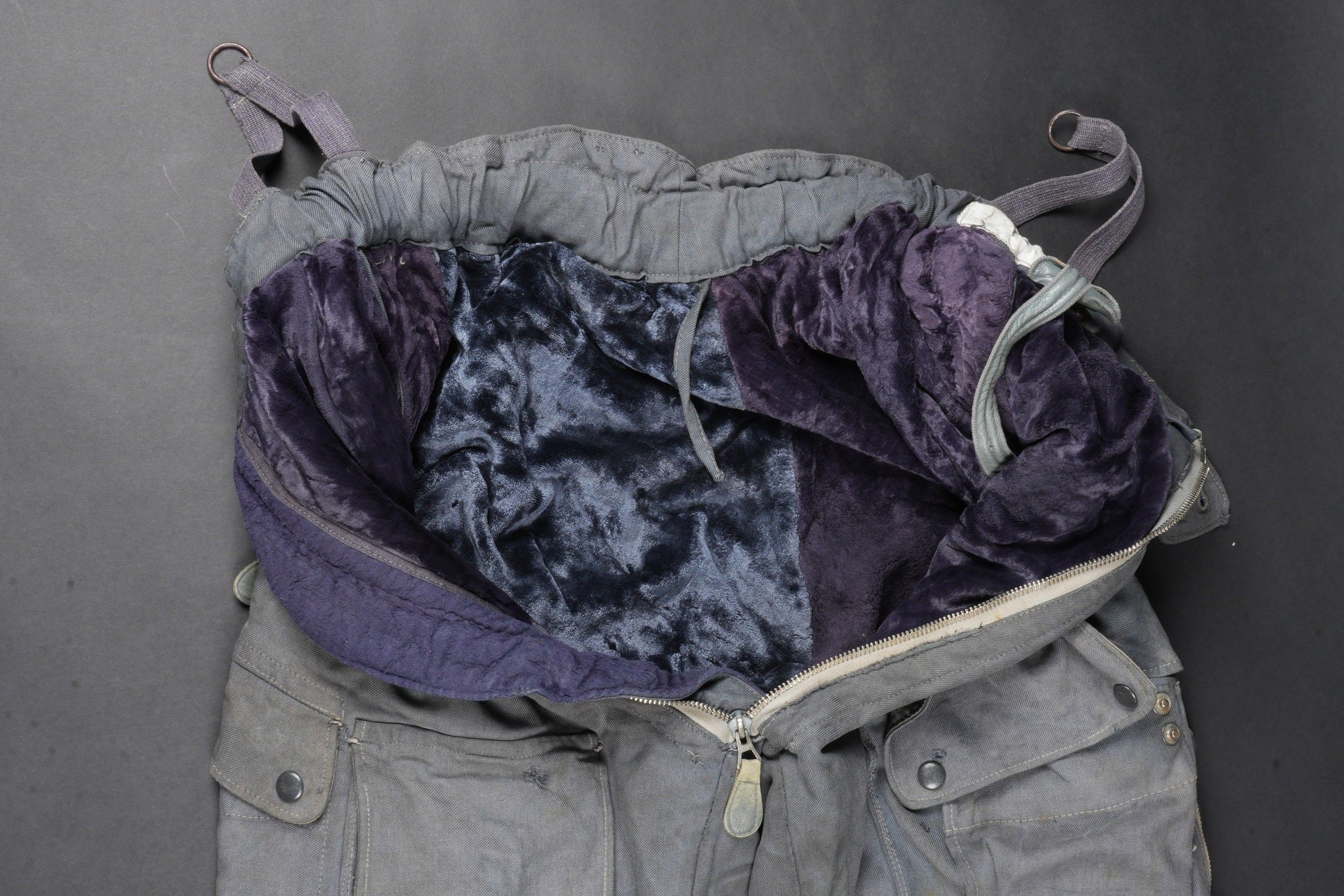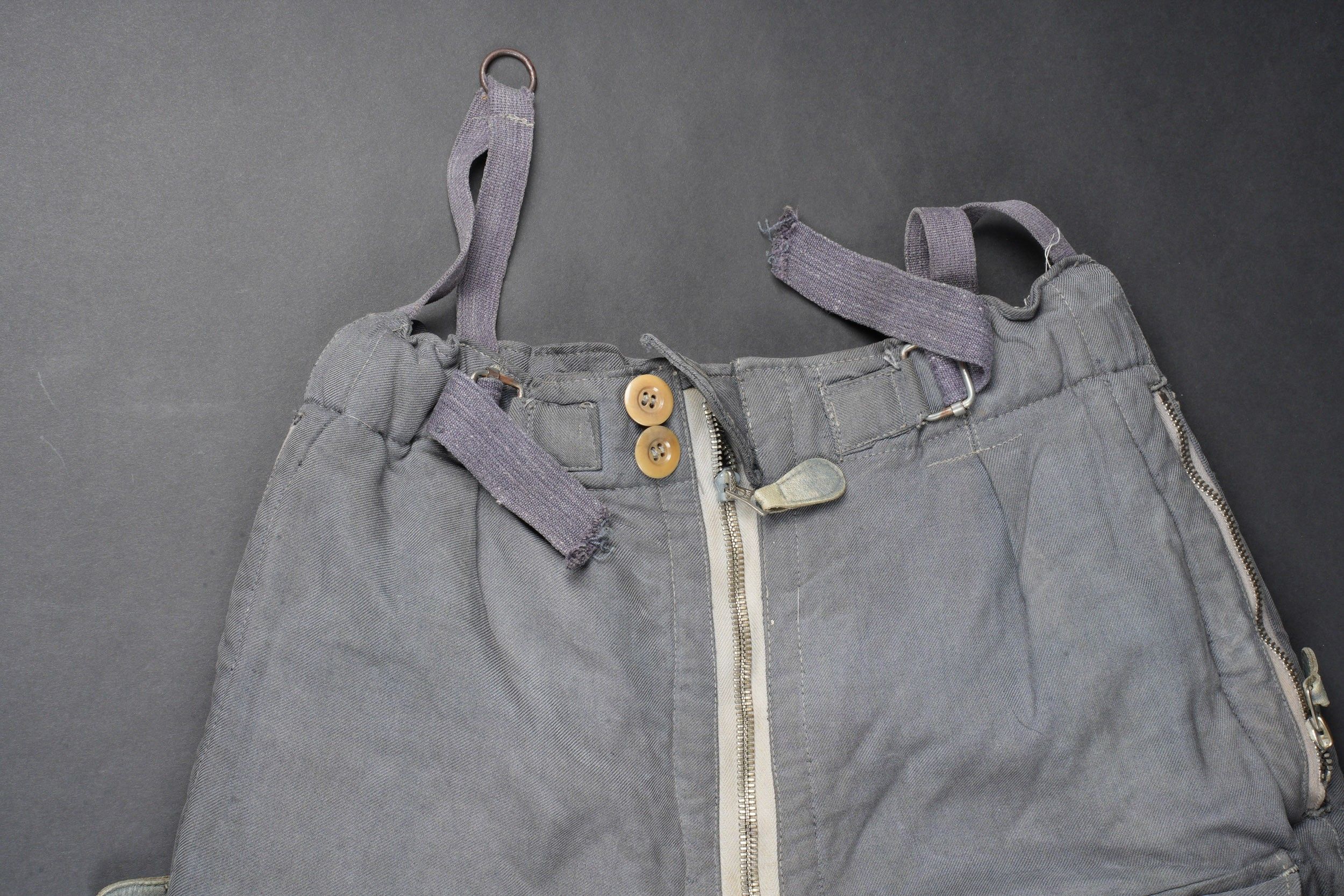 Pantalon de vol de la Luftwaffe. En tissu coton gris/bleu, doublé d'un velours violet. Les boutons pressions sont fonctionnels. Les fermetures éclaires sont fonctionnelles, marquées Zipp, Elite, Prym. Une tirette au bas de la jambe droite est manquante. Modèle électrique les prises interne sont présentes au niveau de la taille et des jambes. Les attaches pour bretelle sont complètes. Etiquette interne présente, mais illisible. A noter une certaine usure et patine de la pièce, ainsi que quelques tâches et accrocs. Etat II+. Luftwaffe flying trousers. Grey-blue cotton fabric, lined with violet velvet. Snap buttons functional. Zippers functional, marked Zipp, Elite, Prym. One pull tab missing on the right leg. Electric model with internal plugs at the waist and legs. Suspenders’ attachment points complete. Inside label present but illegible. Shows wear, patina, minor stains, and small tears. Condition II+.