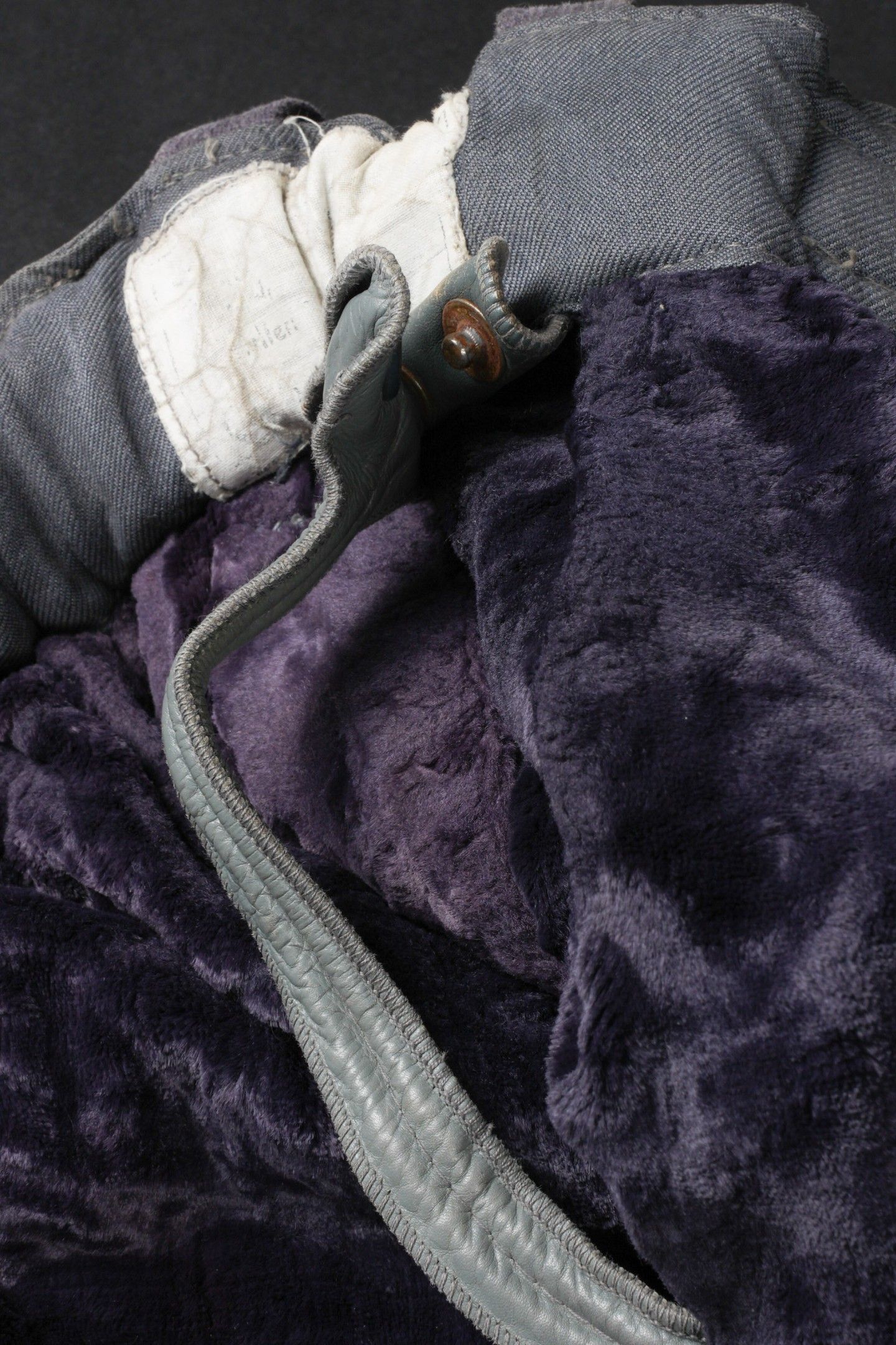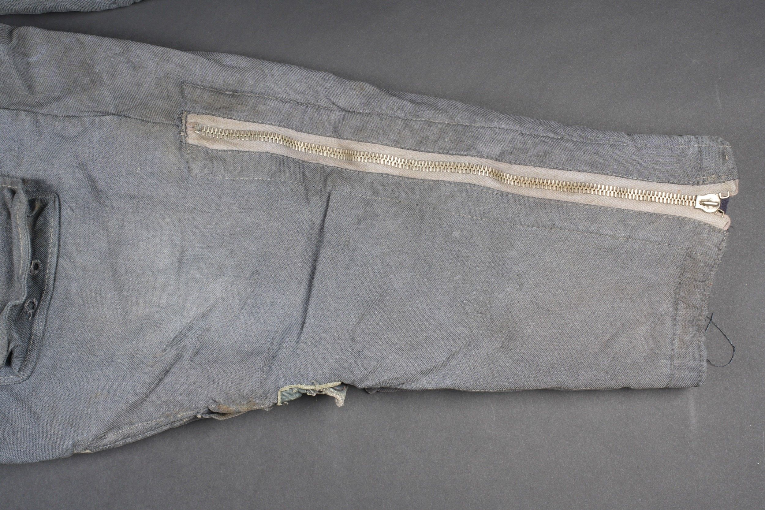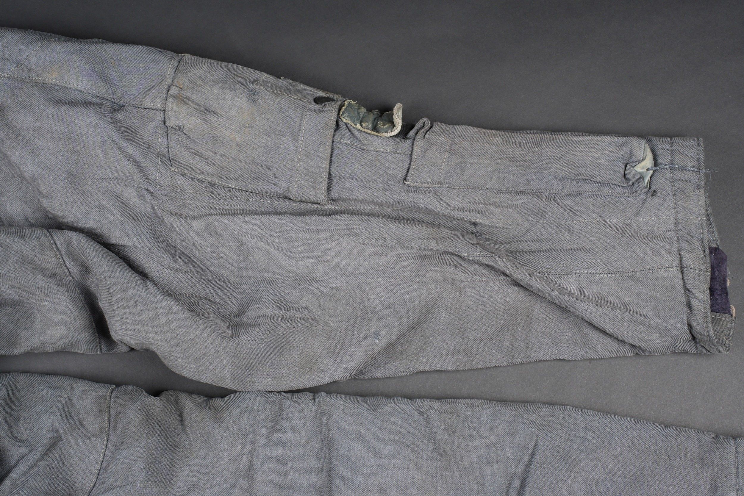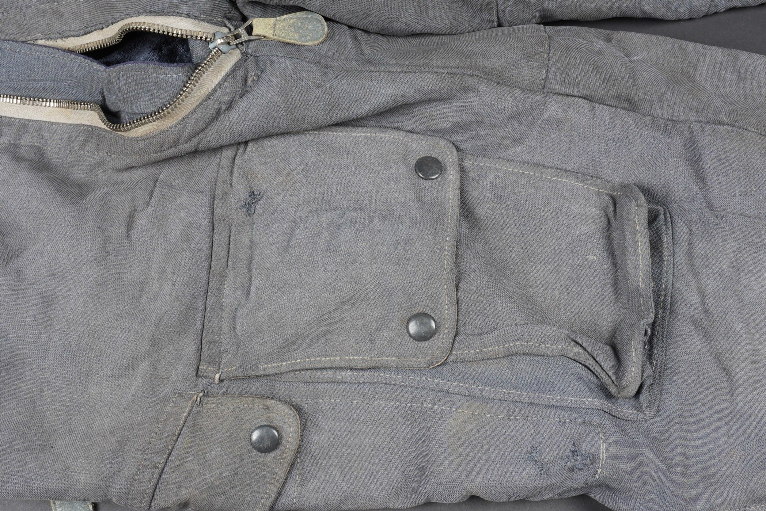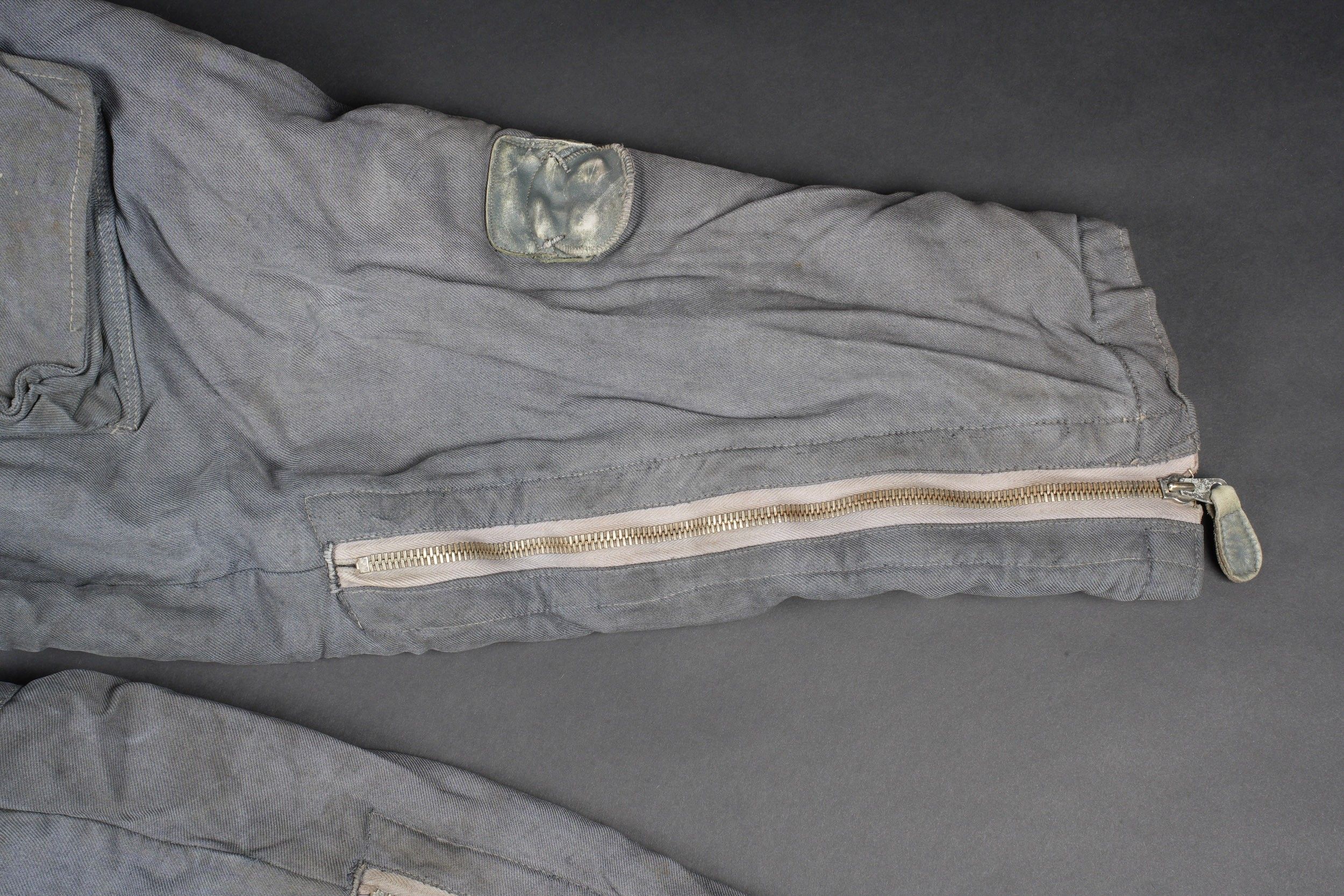 Pantalon de vol de la Luftwaffe. En tissu coton gris/bleu, doublé d'un velours violet. Les boutons pressions sont fonctionnels. Les fermetures éclaires sont fonctionnelles, marquées Zipp, Elite, Prym. Une tirette au bas de la jambe droite est manquante. Modèle électrique les prises interne sont présentes au niveau de la taille et des jambes. Les attaches pour bretelle sont complètes. Etiquette interne présente, mais illisible. A noter une certaine usure et patine de la pièce, ainsi que quelques tâches et accrocs. Etat II+. Luftwaffe flying trousers. Grey-blue cotton fabric, lined with violet velvet. Snap buttons functional. Zippers functional, marked Zipp, Elite, Prym. One pull tab missing on the right leg. Electric model with internal plugs at the waist and legs. Suspenders’ attachment points complete. Inside label present but illegible. Shows wear, patina, minor stains, and small tears. Condition II+.