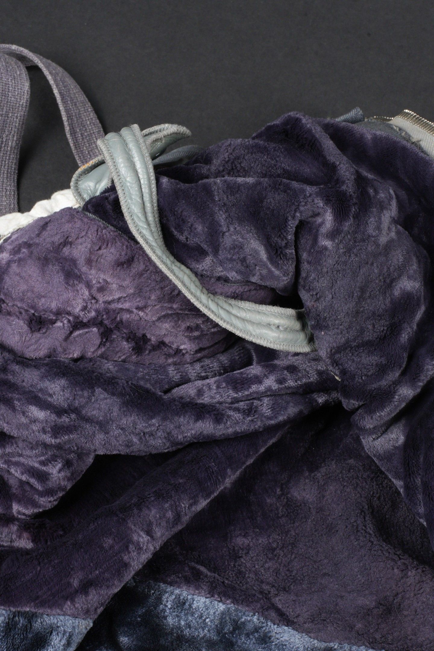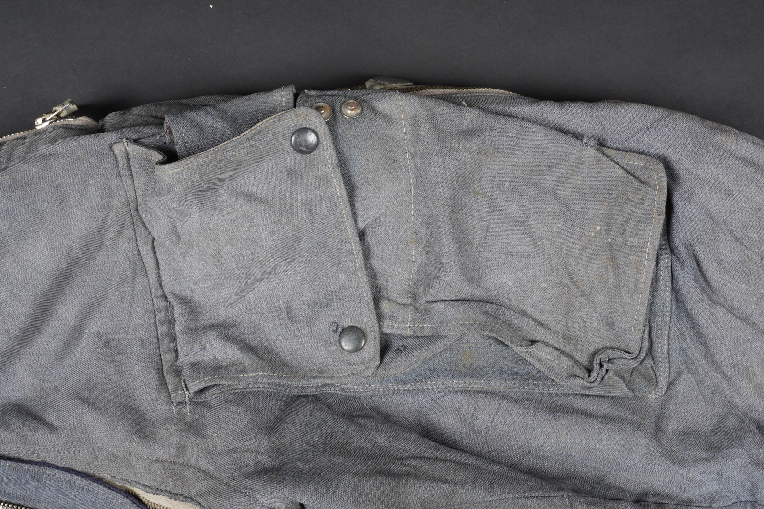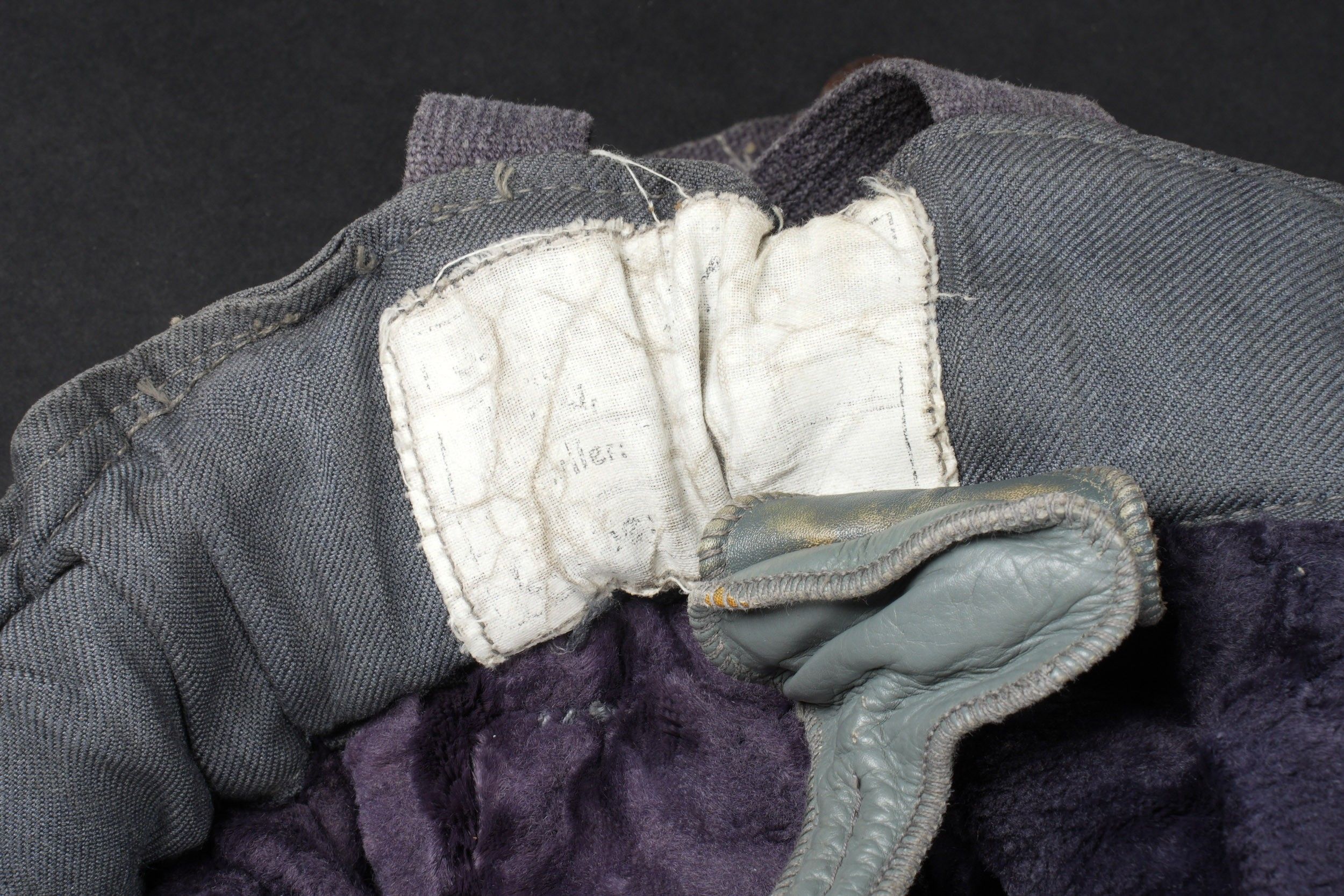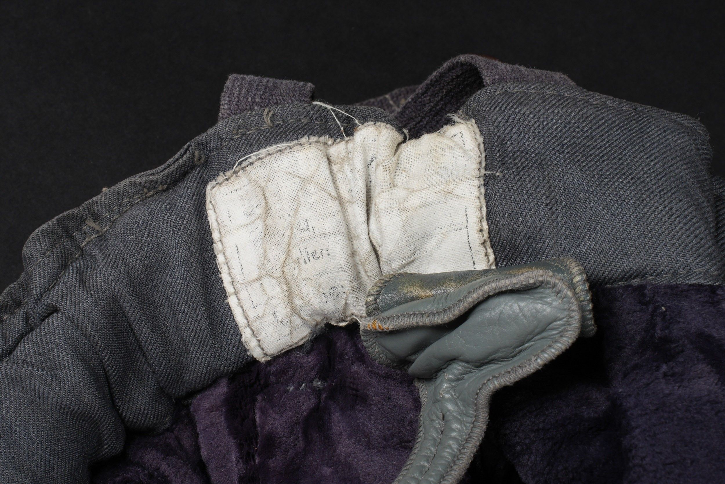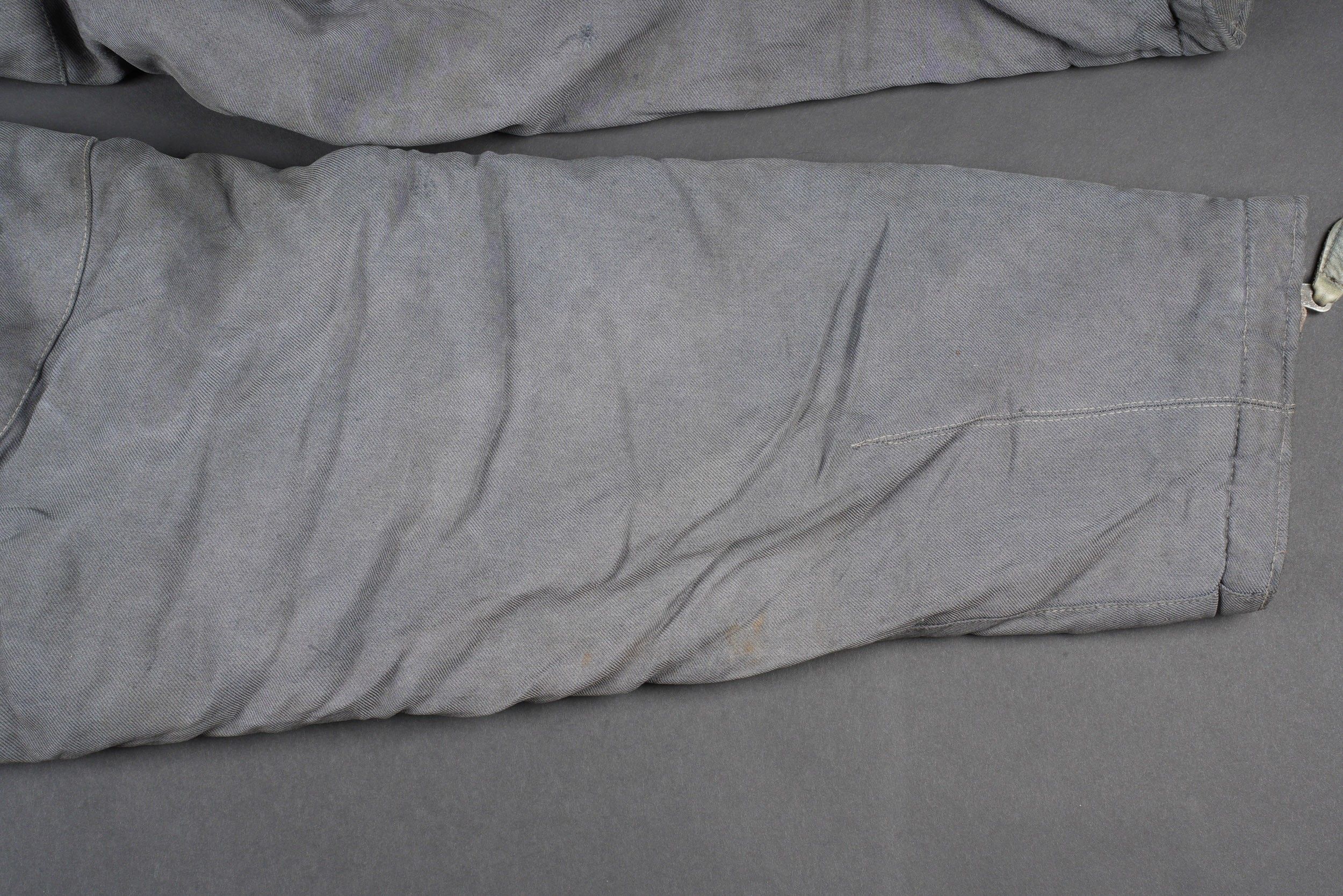 Pantalon de vol de la Luftwaffe. En tissu coton gris/bleu, doublé d'un velours violet. Les boutons pressions sont fonctionnels. Les fermetures éclaires sont fonctionnelles, marquées Zipp, Elite, Prym. Une tirette au bas de la jambe droite est manquante. Modèle électrique les prises interne sont présentes au niveau de la taille et des jambes. Les attaches pour bretelle sont complètes. Etiquette interne présente, mais illisible. A noter une certaine usure et patine de la pièce, ainsi que quelques tâches et accrocs. Etat II+. Luftwaffe flying trousers. Grey-blue cotton fabric, lined with violet velvet. Snap buttons functional. Zippers functional, marked Zipp, Elite, Prym. One pull tab missing on the right leg. Electric model with internal plugs at the waist and legs. Suspenders’ attachment points complete. Inside label present but illegible. Shows wear, patina, minor stains, and small tears. Condition II+.