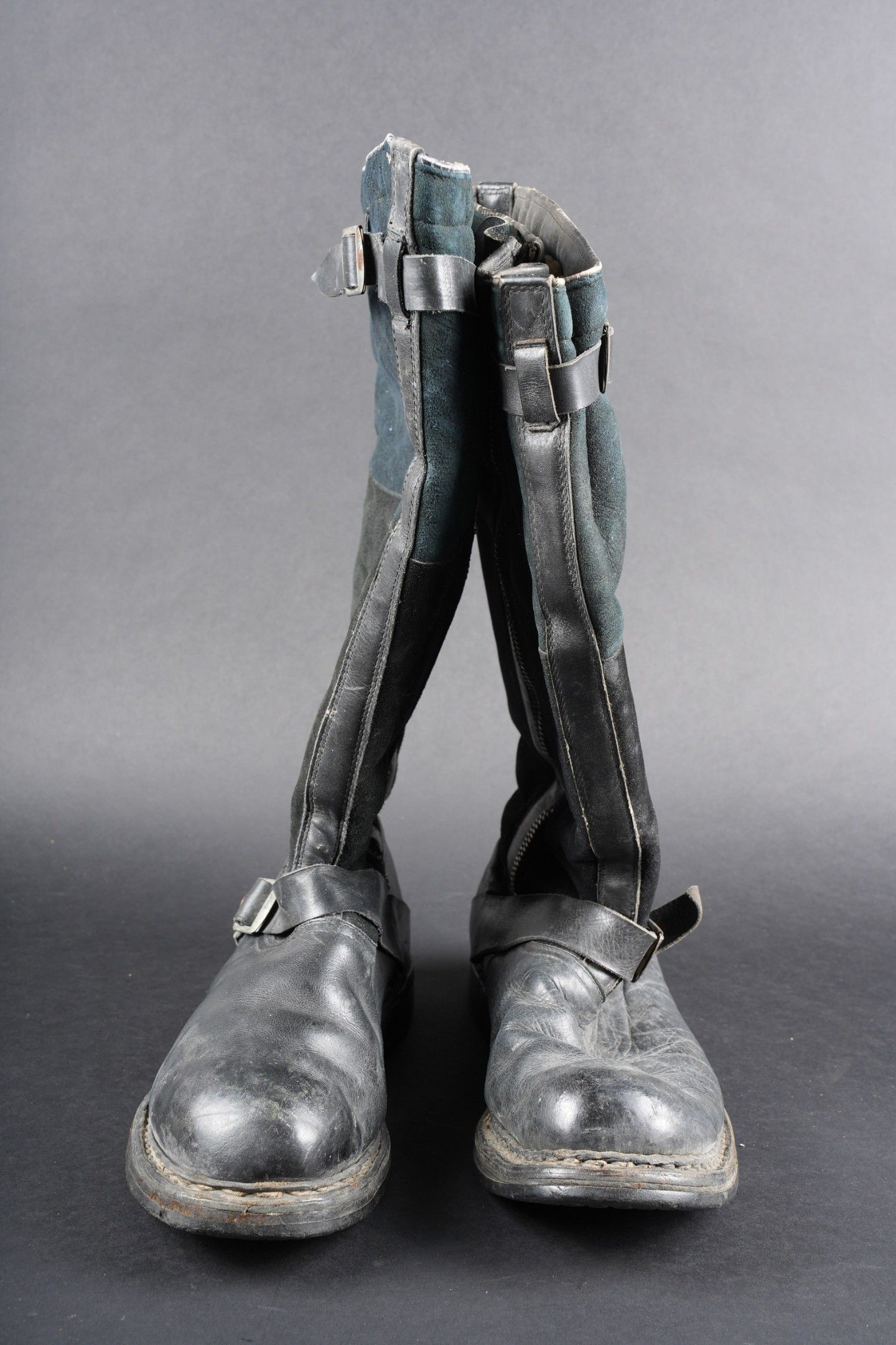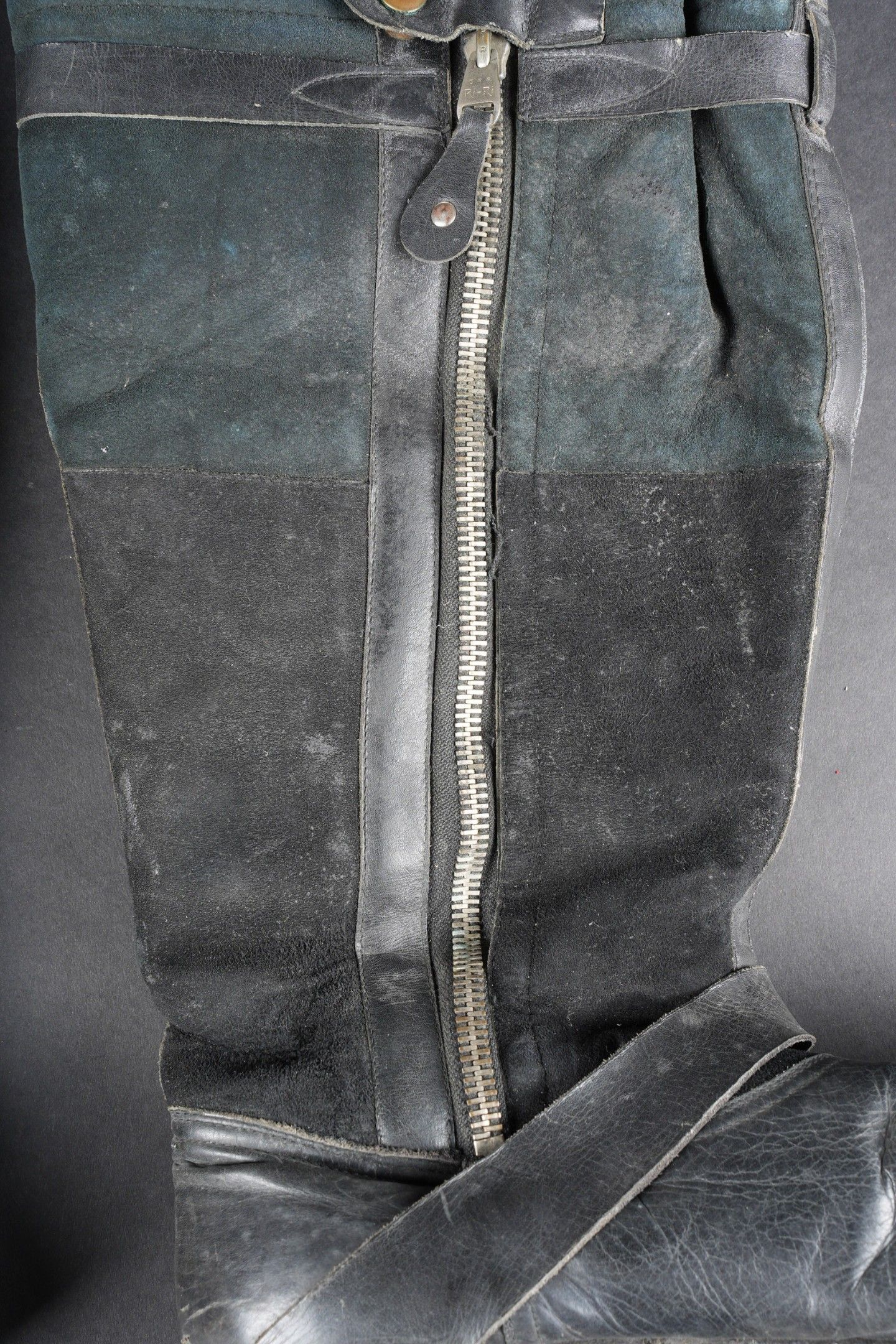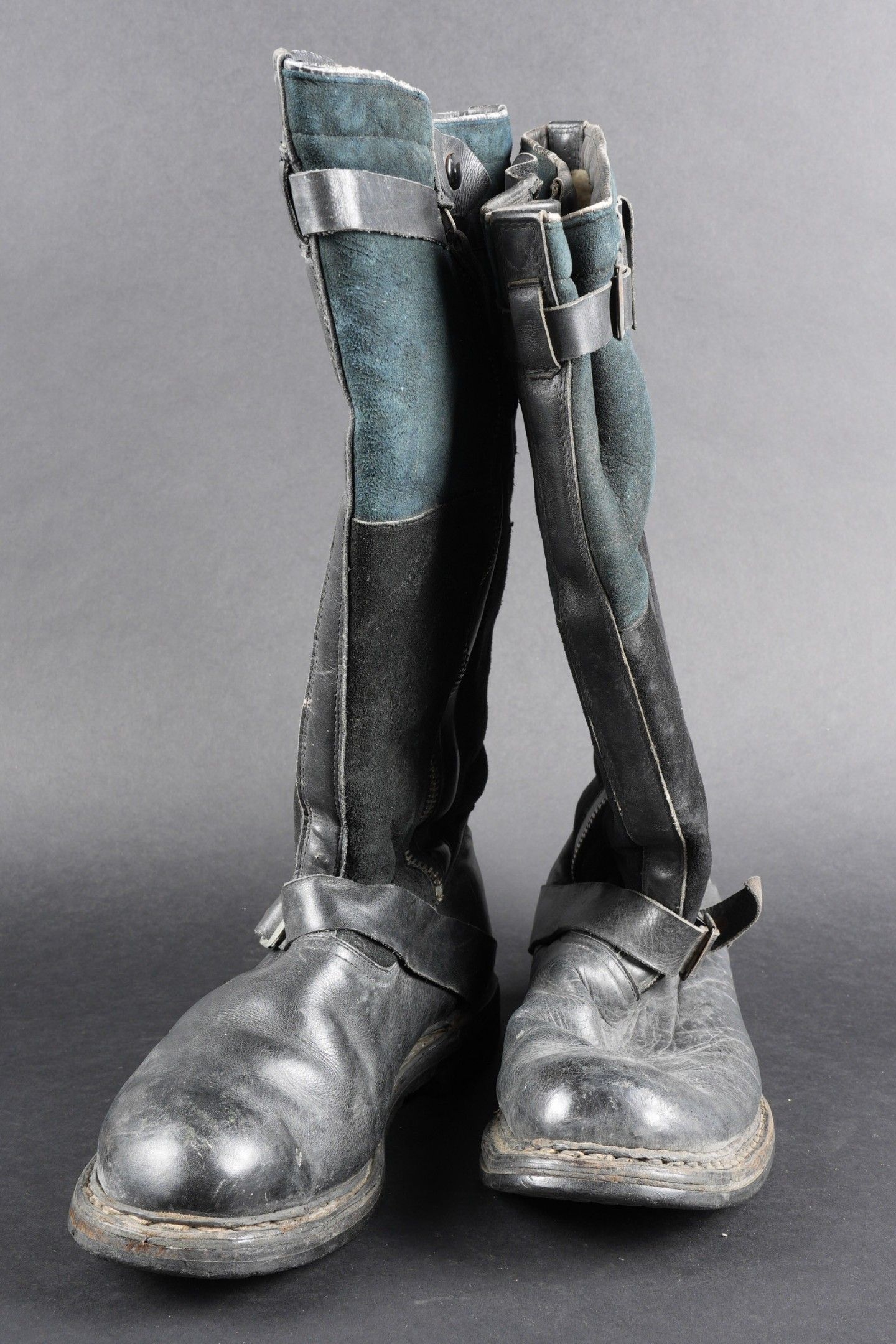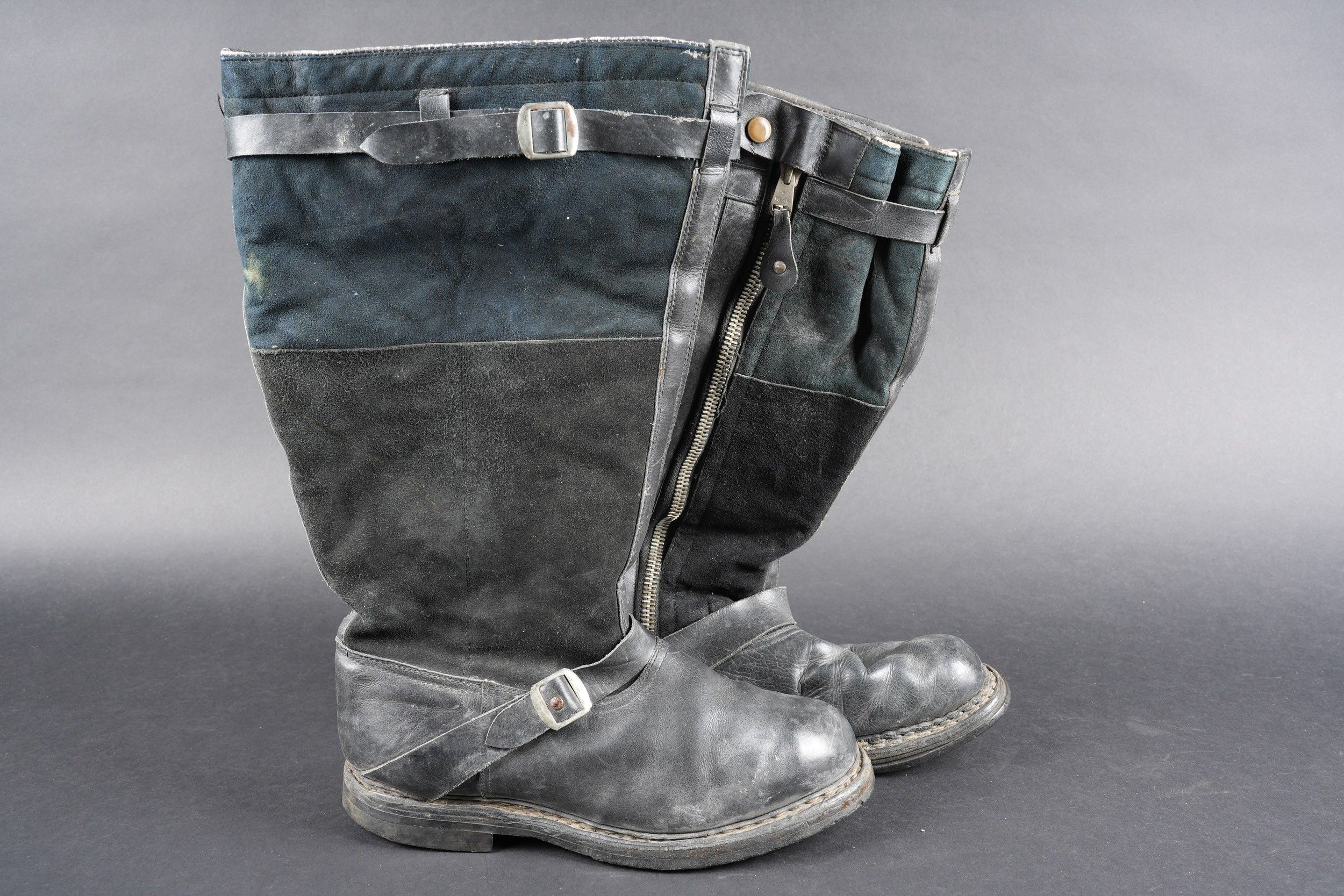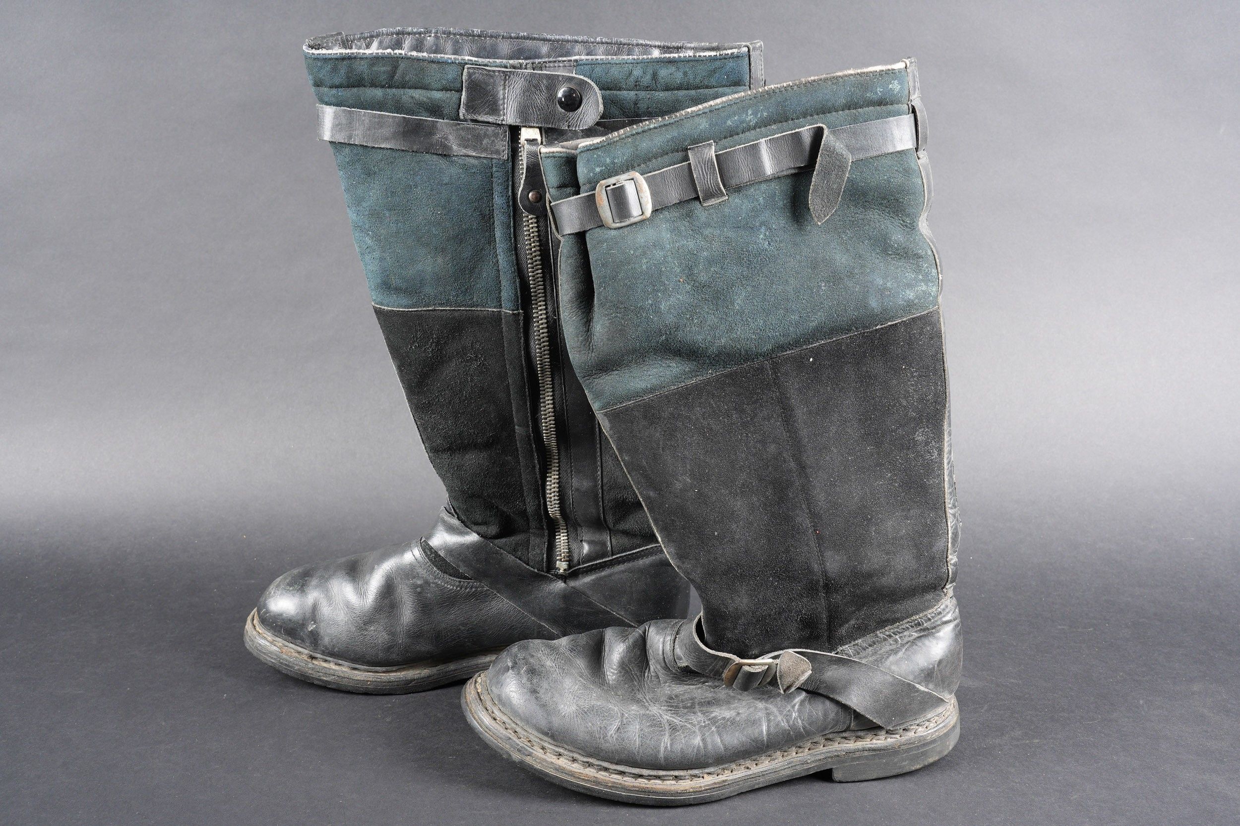 Bottes de pilote de la Luftwaffe. Paire homogène en cuir noir et daim bleu marine. Les lanières de serrage sont présentes. Intérieur doublé en fausse fourrure. Les fermetures éclaires sont fonctionnelles de fabrication RIRI. Semelles et talons en caoutchouc, usés. Etiquette marquée Dihlmann 1943. Les boutons pressions sont fonctionnels. A noter une certaine usure et patine des pièces. Etat II+. Luftwaffe pilot boots. Matching pair in black leather and navy-blue suede. Adjustment straps present. Faux fur lining. Zippers functional, made by RIRI. Rubber soles and heels worn. Label marked Dihlmann 1943. Press studs functional. Some wear and patina. Condition II+.