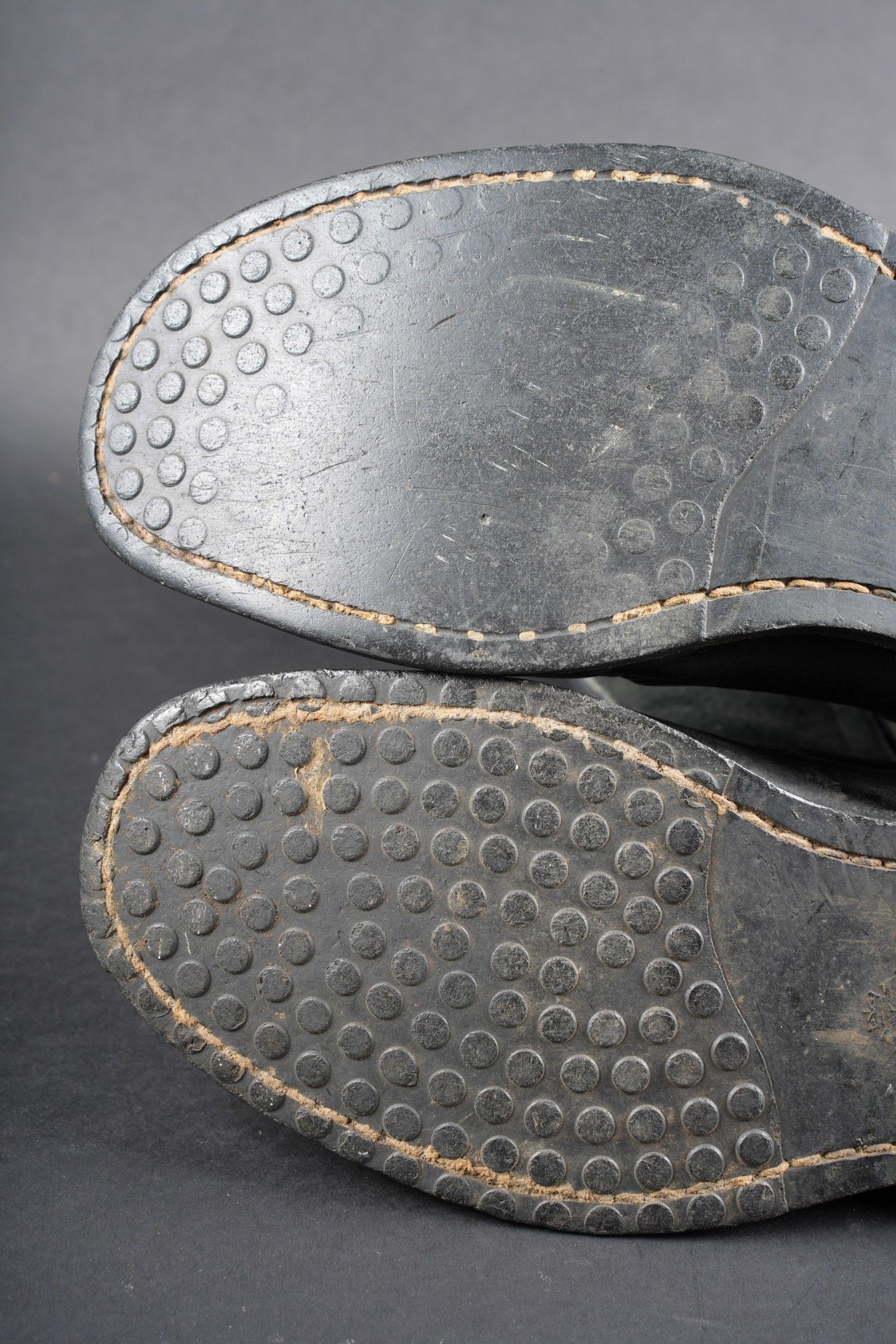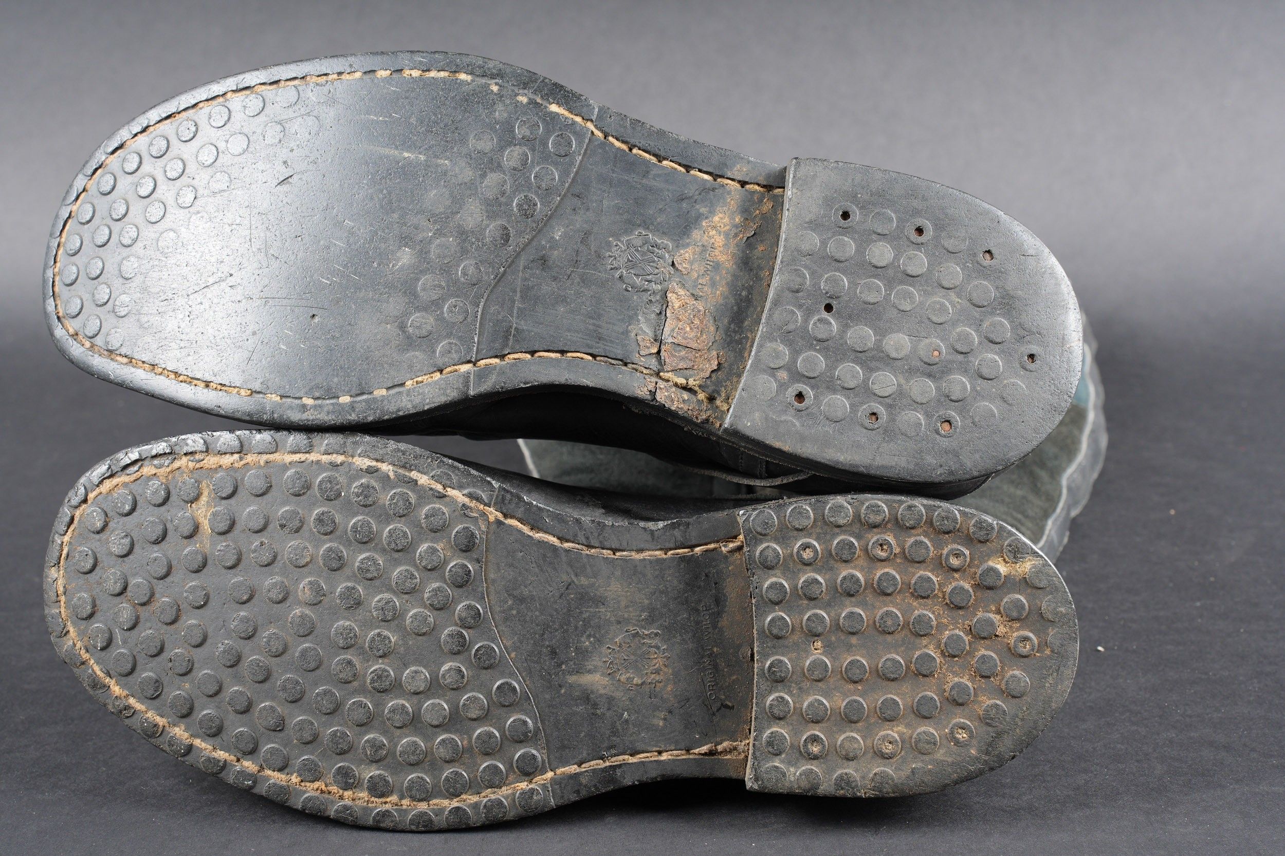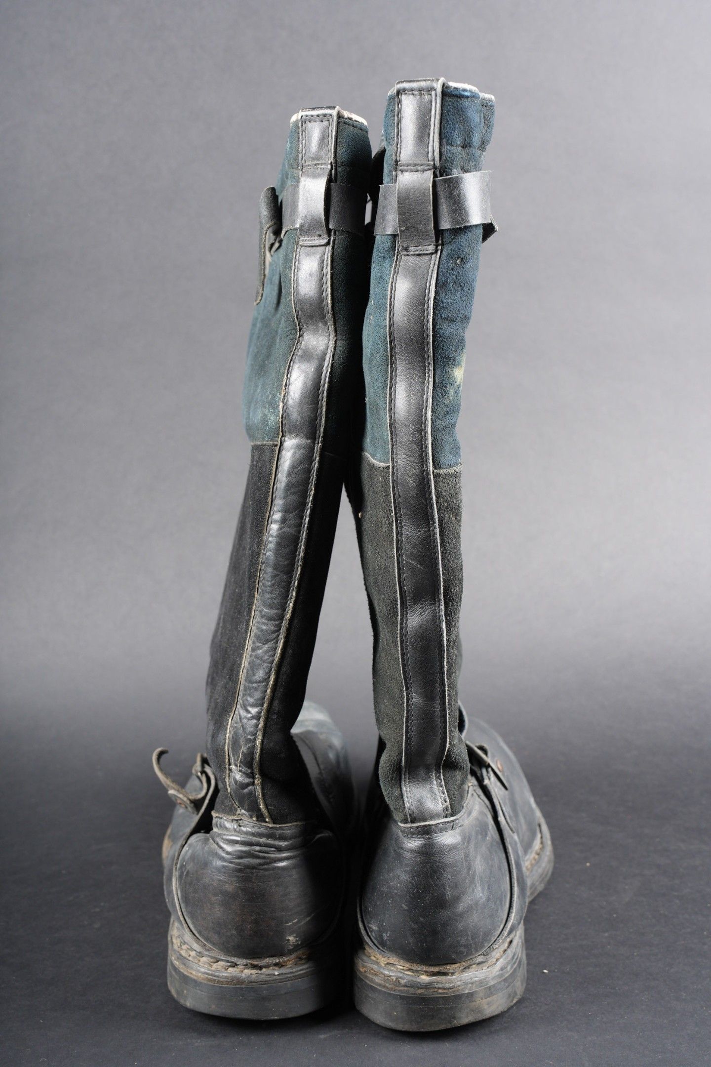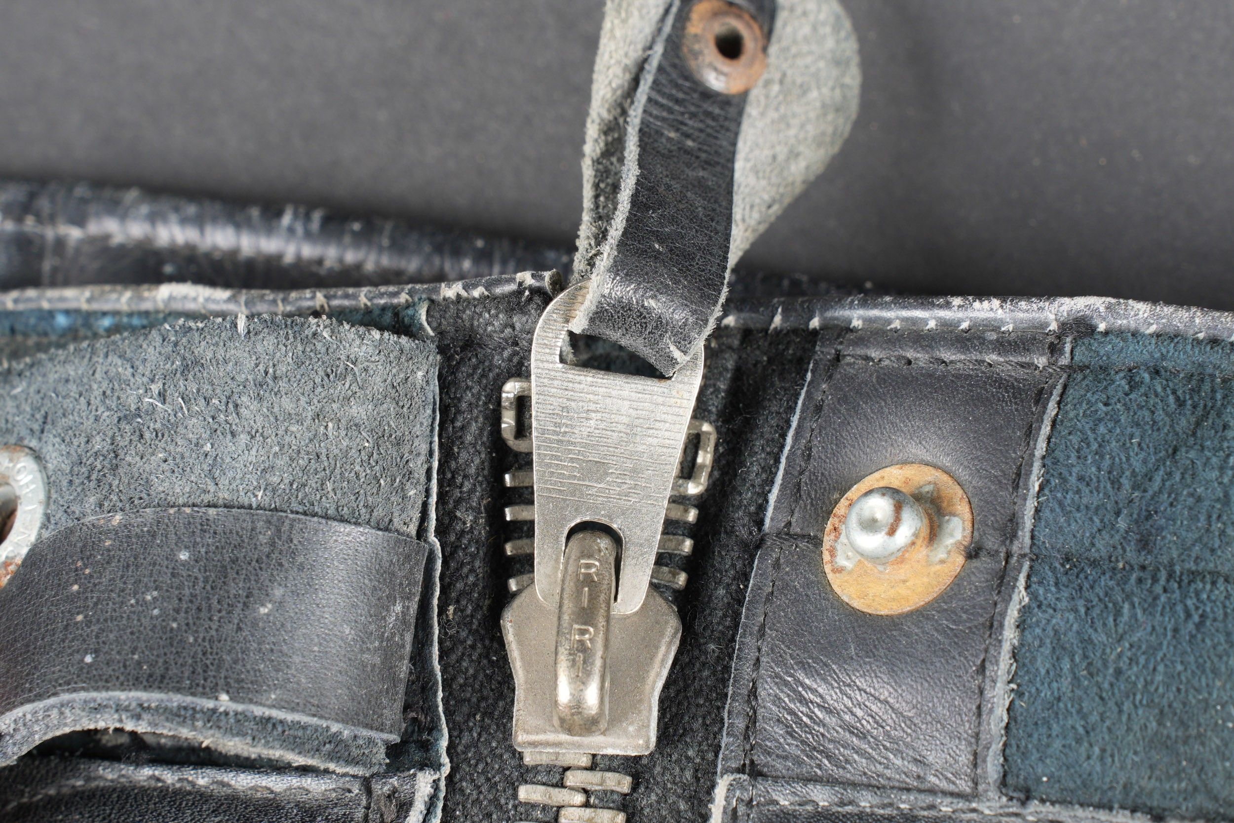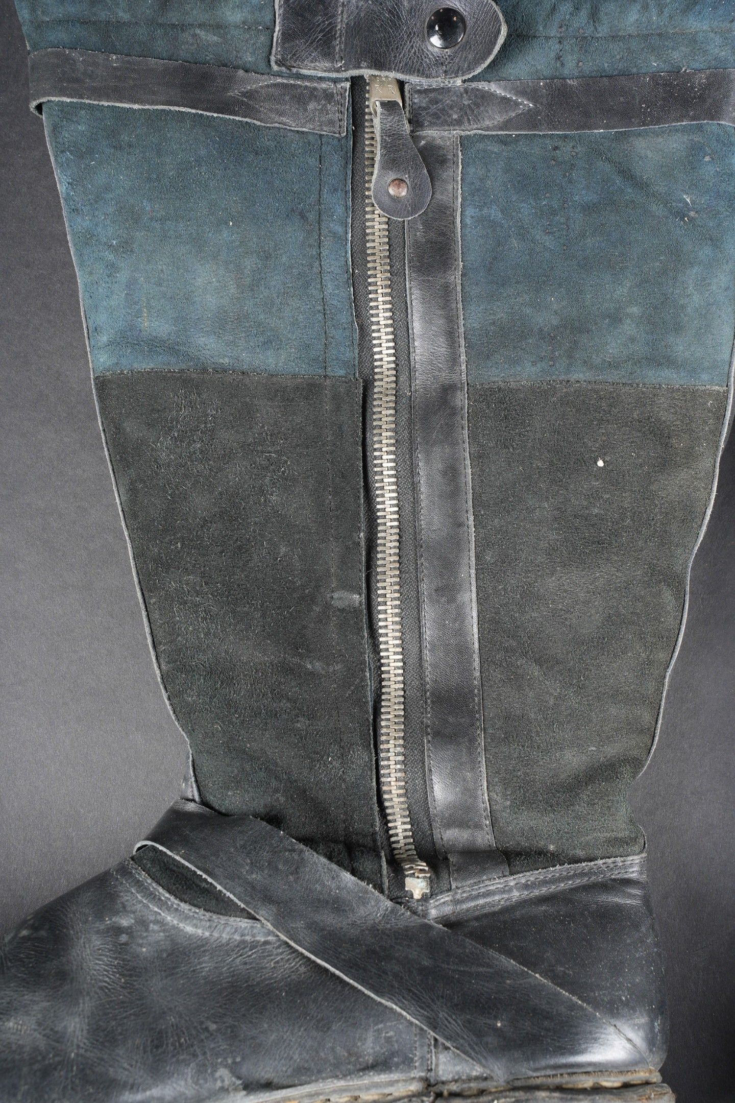 Bottes de pilote de la Luftwaffe. Paire homogène en cuir noir et daim bleu marine. Les lanières de serrage sont présentes. Intérieur doublé en fausse fourrure. Les fermetures éclaires sont fonctionnelles de fabrication RIRI. Semelles et talons en caoutchouc, usés. Etiquette marquée Dihlmann 1943. Les boutons pressions sont fonctionnels. A noter une certaine usure et patine des pièces. Etat II+. Luftwaffe pilot boots. Matching pair in black leather and navy-blue suede. Adjustment straps present. Faux fur lining. Zippers functional, made by RIRI. Rubber soles and heels worn. Label marked Dihlmann 1943. Press studs functional. Some wear and patina. Condition II+.