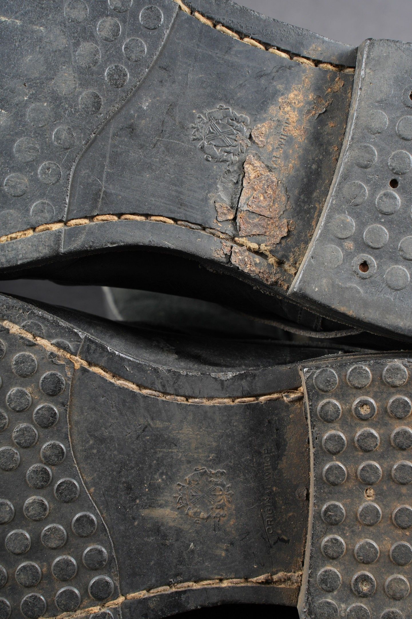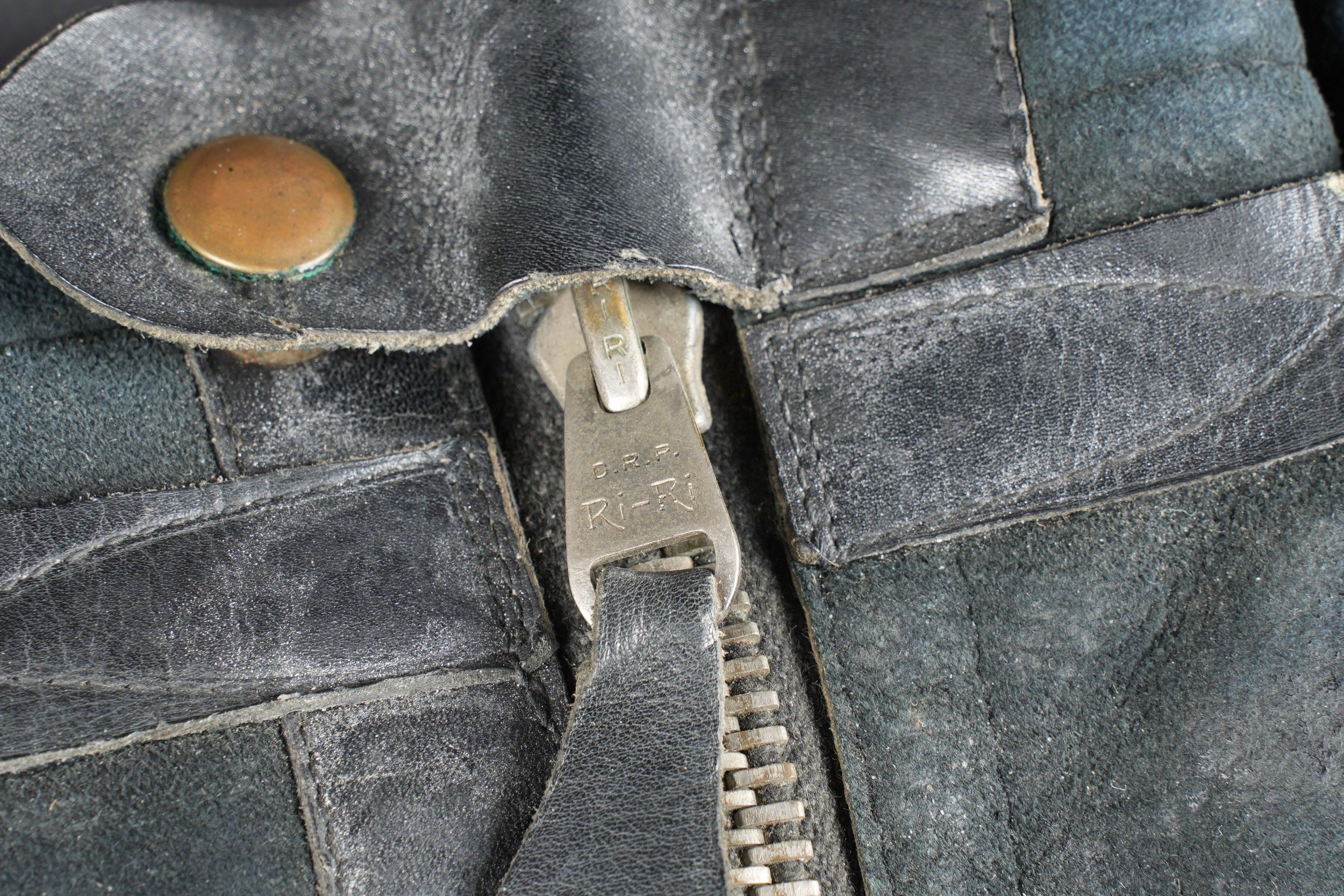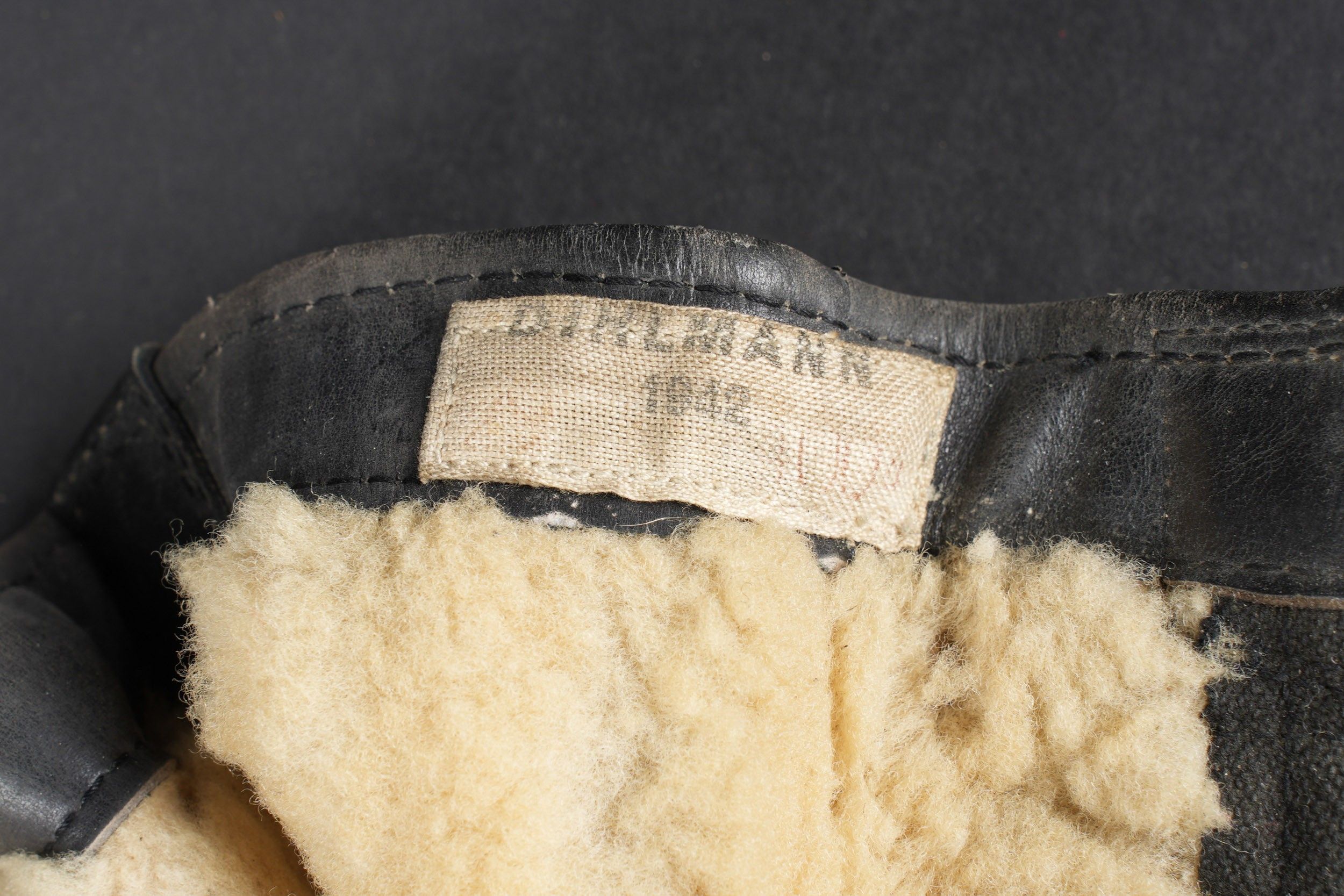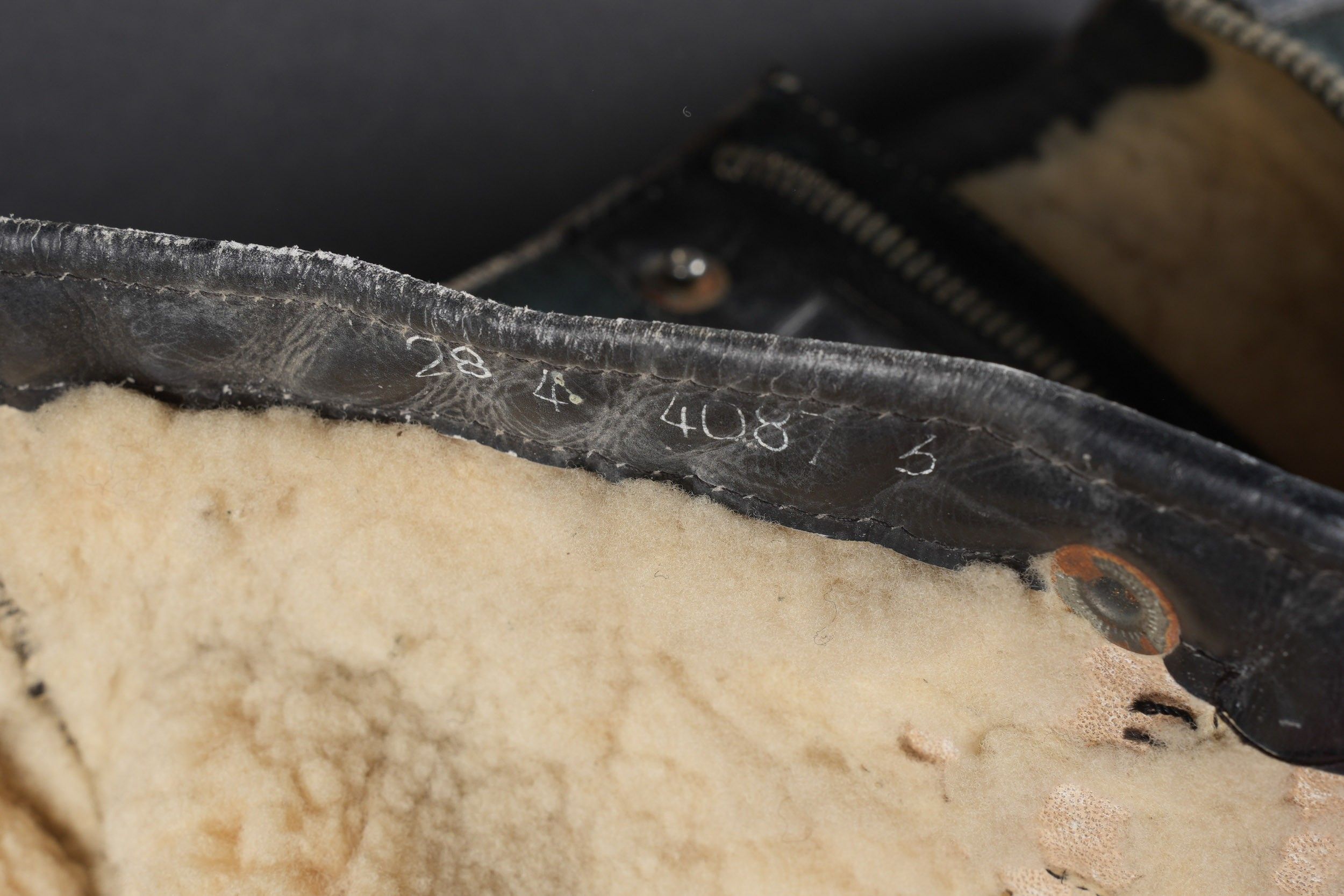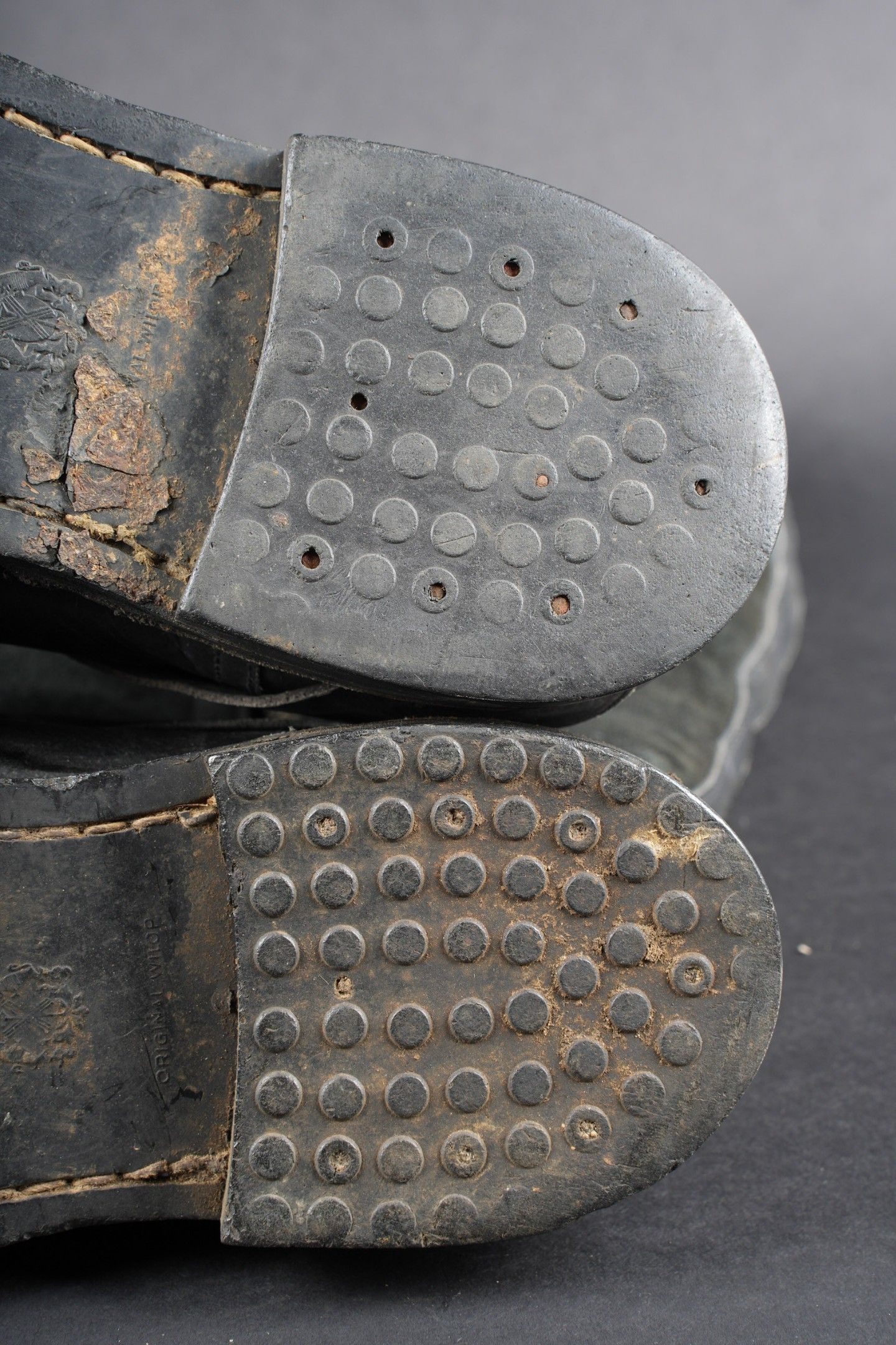 Bottes de pilote de la Luftwaffe. Paire homogène en cuir noir et daim bleu marine. Les lanières de serrage sont présentes. Intérieur doublé en fausse fourrure. Les fermetures éclaires sont fonctionnelles de fabrication RIRI. Semelles et talons en caoutchouc, usés. Etiquette marquée Dihlmann 1943. Les boutons pressions sont fonctionnels. A noter une certaine usure et patine des pièces. Etat II+. Luftwaffe pilot boots. Matching pair in black leather and navy-blue suede. Adjustment straps present. Faux fur lining. Zippers functional, made by RIRI. Rubber soles and heels worn. Label marked Dihlmann 1943. Press studs functional. Some wear and patina. Condition II+.