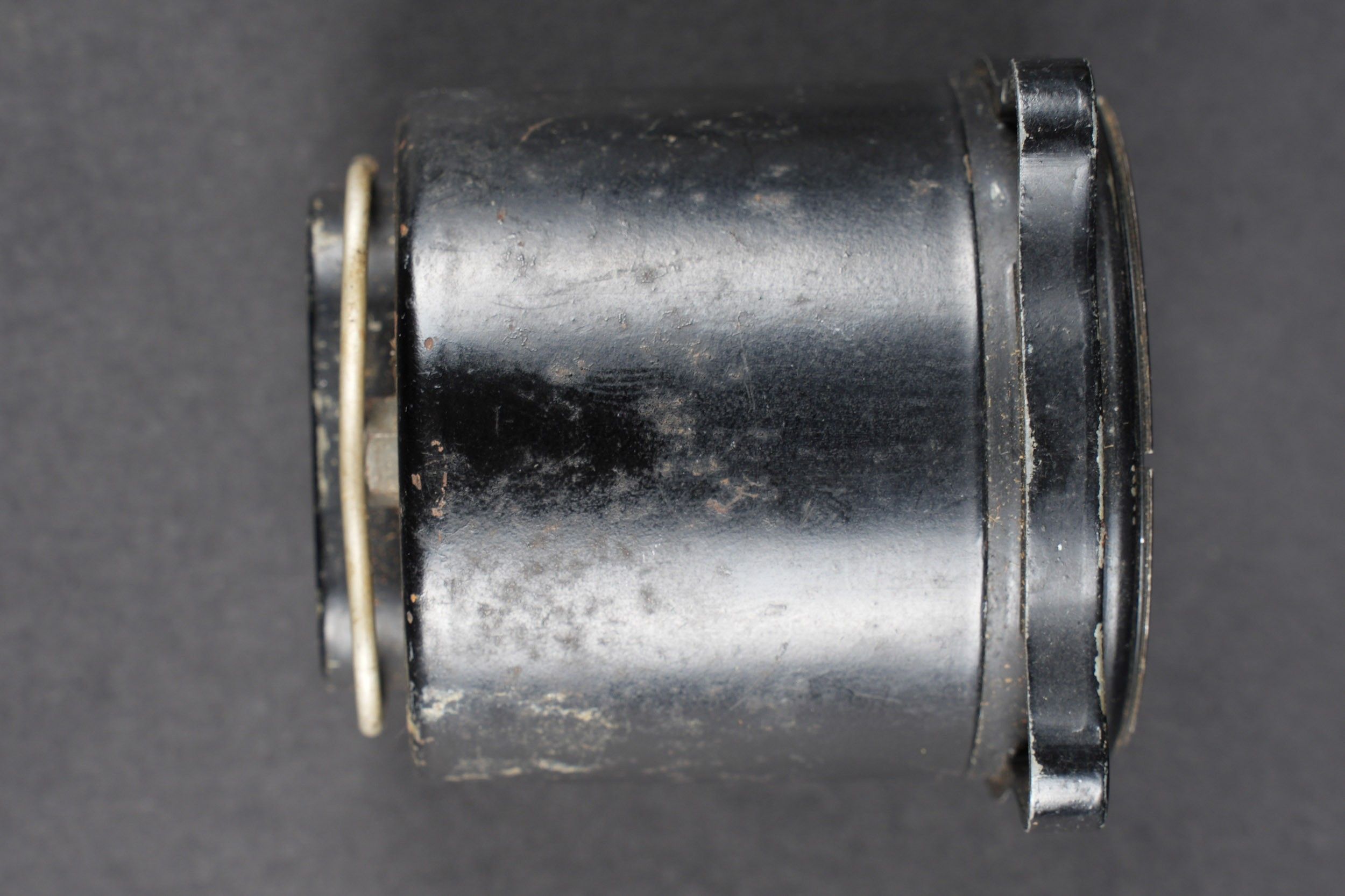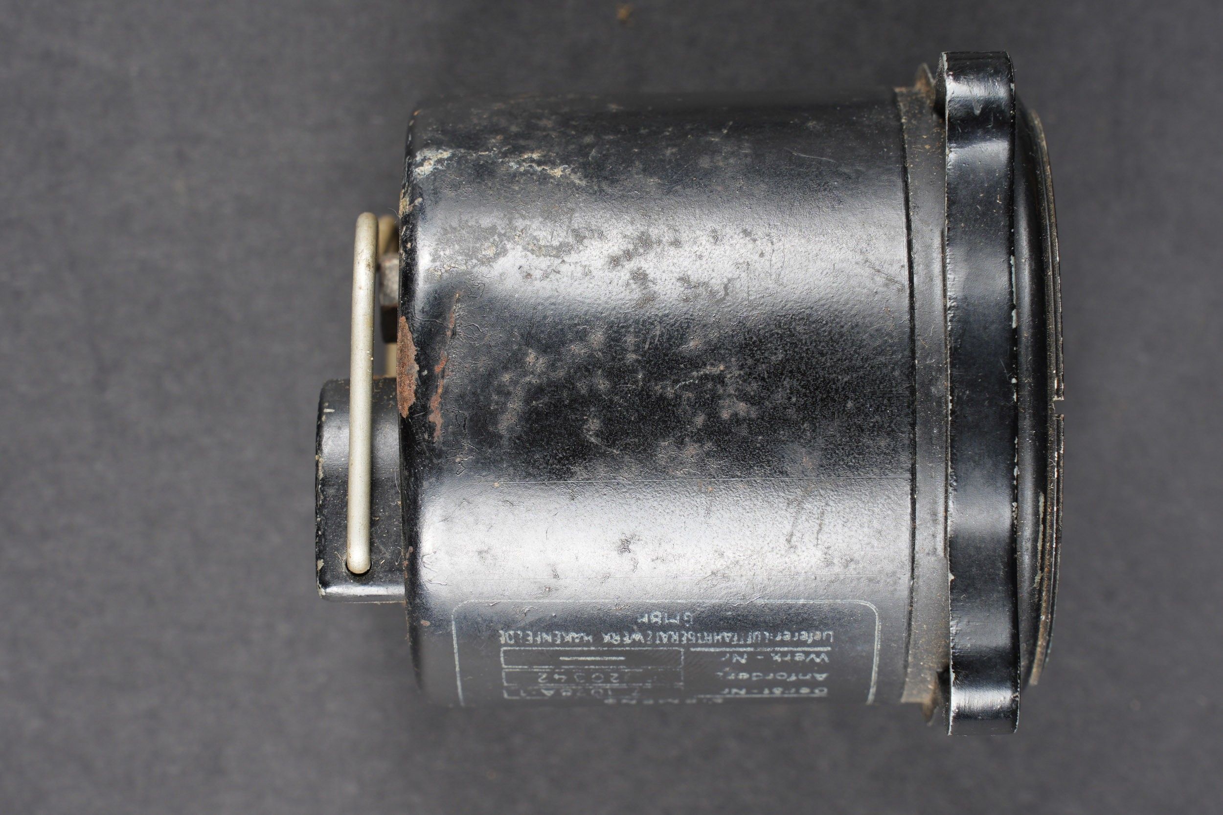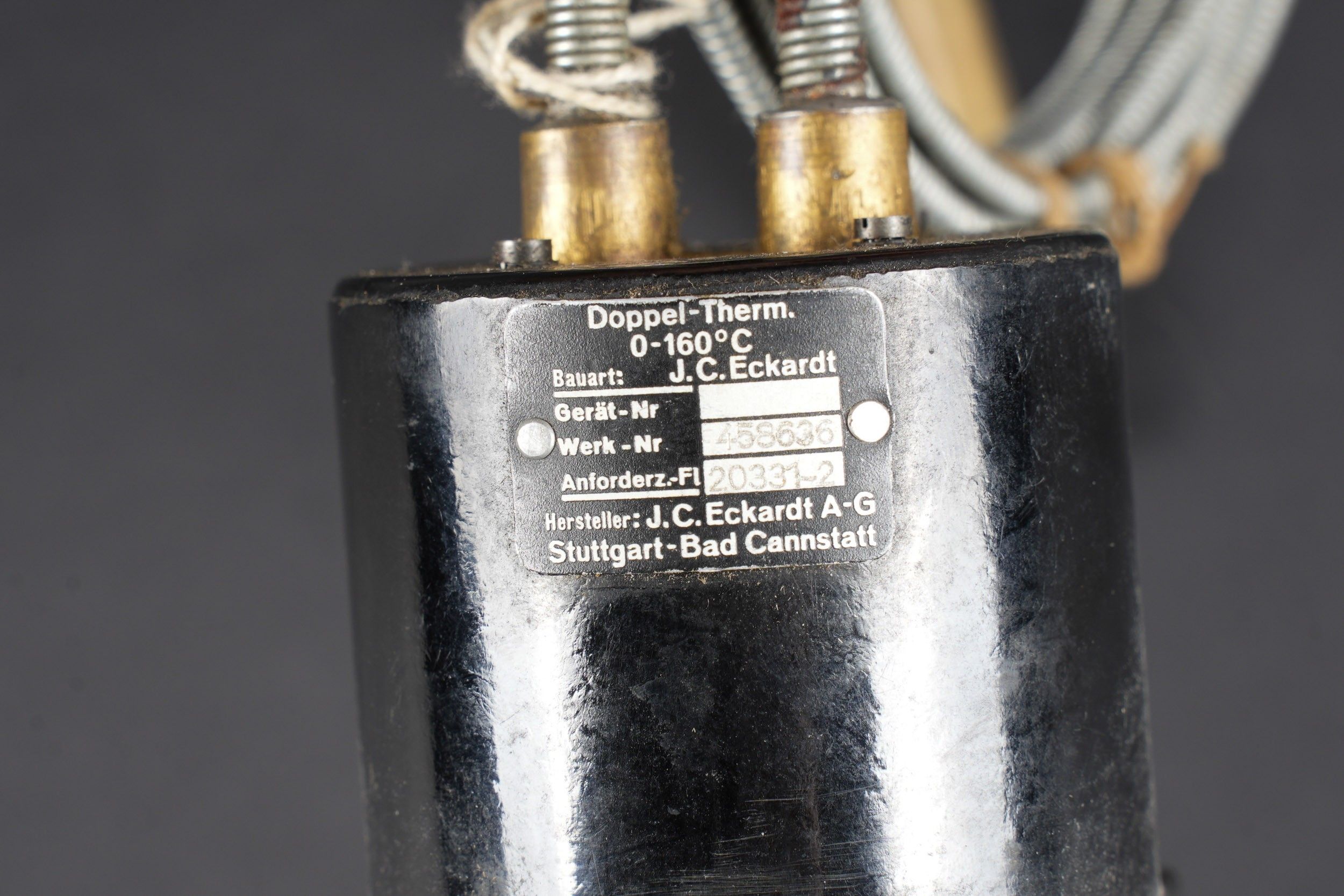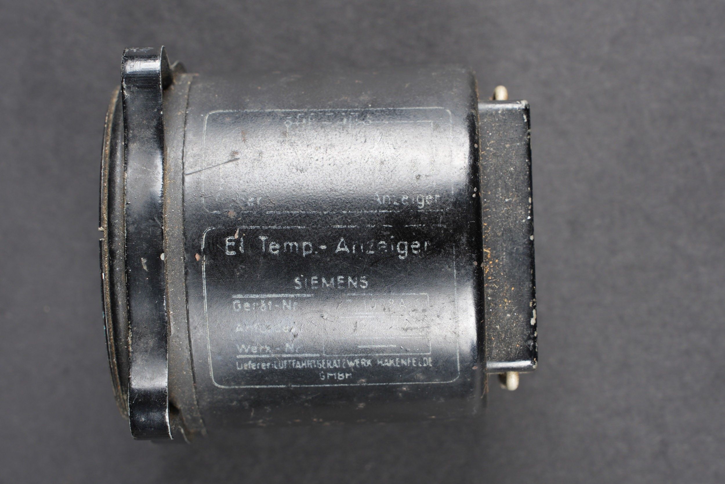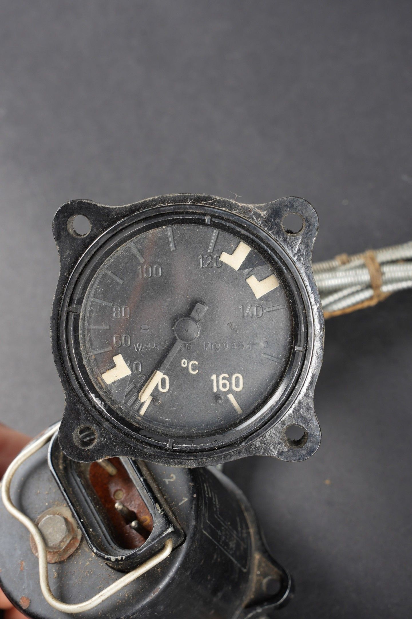 Instruments de bord de la Luftwaffe. Comprenant un indicateur de température, Dampfdruckthermometer, utilisé dans la majorité des avions allemand. Cadran complet, les chiffres sont partiellement effacés. Plaquette du fabricant JC Eckardt 458636, code FL 20331-2. Cet appareil se compose essentiellement d'un capteur de chaleur et du dispositif d'affichage. Les deux parties sont reliées l'une à l'autre par une ligne de mesure flexible. La douille d'immersion, qui doit être complètement immergée dans le liquide de refroidissement ou le lubrifiant à mesurer. Un instrument d'indicateur de température. Boitier en bakélite complet, vitre en parfait état. L'aiguilles est phosphorescente. Fabrication Siemens, code FL 20342. L'appareil était utilisé pour surveiller la température du lubrifiant et/ou du liquide de refroidissement. La jauge de température a été installée dans de nombreuses variantes du Messerschmitt Bf 109 et du Focke-Wulf FW 190. A noter une certaine usure et patine des pièces. Etat II+. Luftwaffe aircraft instruments. Including a Dampfdruckthermometer (temperature/pressure gauge) used in most German aircraft. Complete dial with partially faded numerals. Manufacturer plate JC Eckardt 458636, FL 20331-2. Device composed of a heat sensor and a display unit, both connected by a flexible measuring line. The immersion probe was placed in the coolant or lubricant. Complete Bakelite housing with intact glass. Luminous needle. Manufacturer Siemens, code FL 20342. Used to monitor oil and/or coolant temperature. This type of gauge was installed in many variants of the Messerschmitt Bf 109 and Focke-Wulf Fw 190. Shows wear and patina. Condition II+.