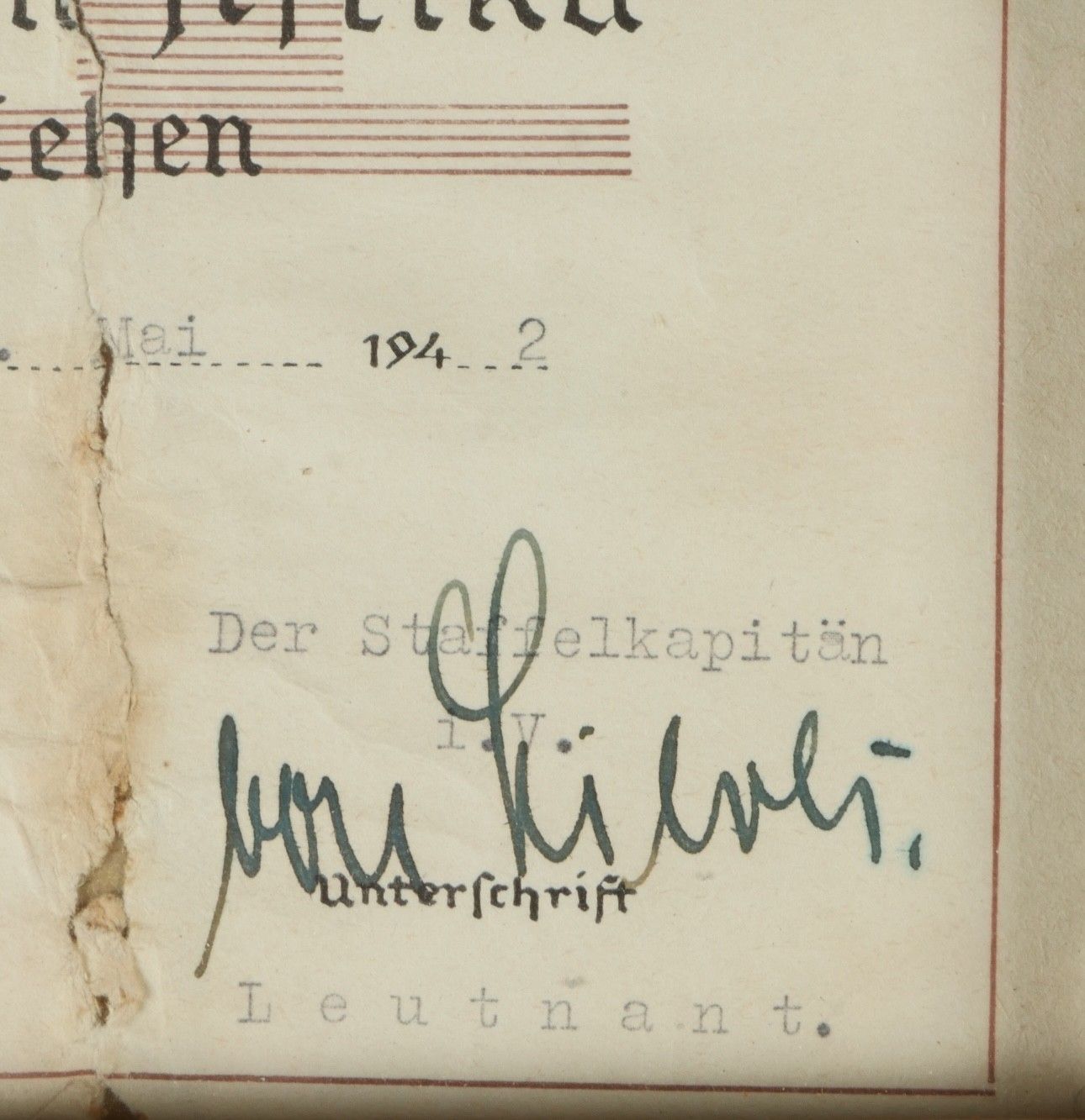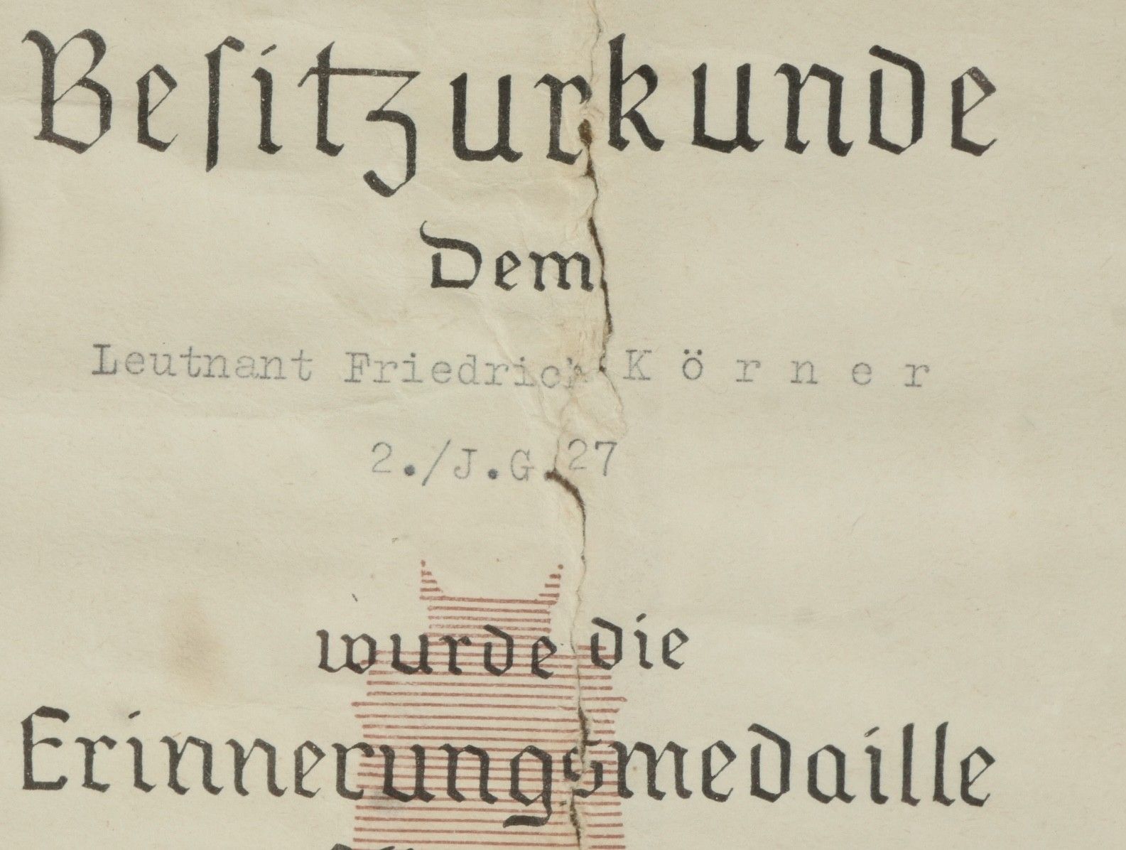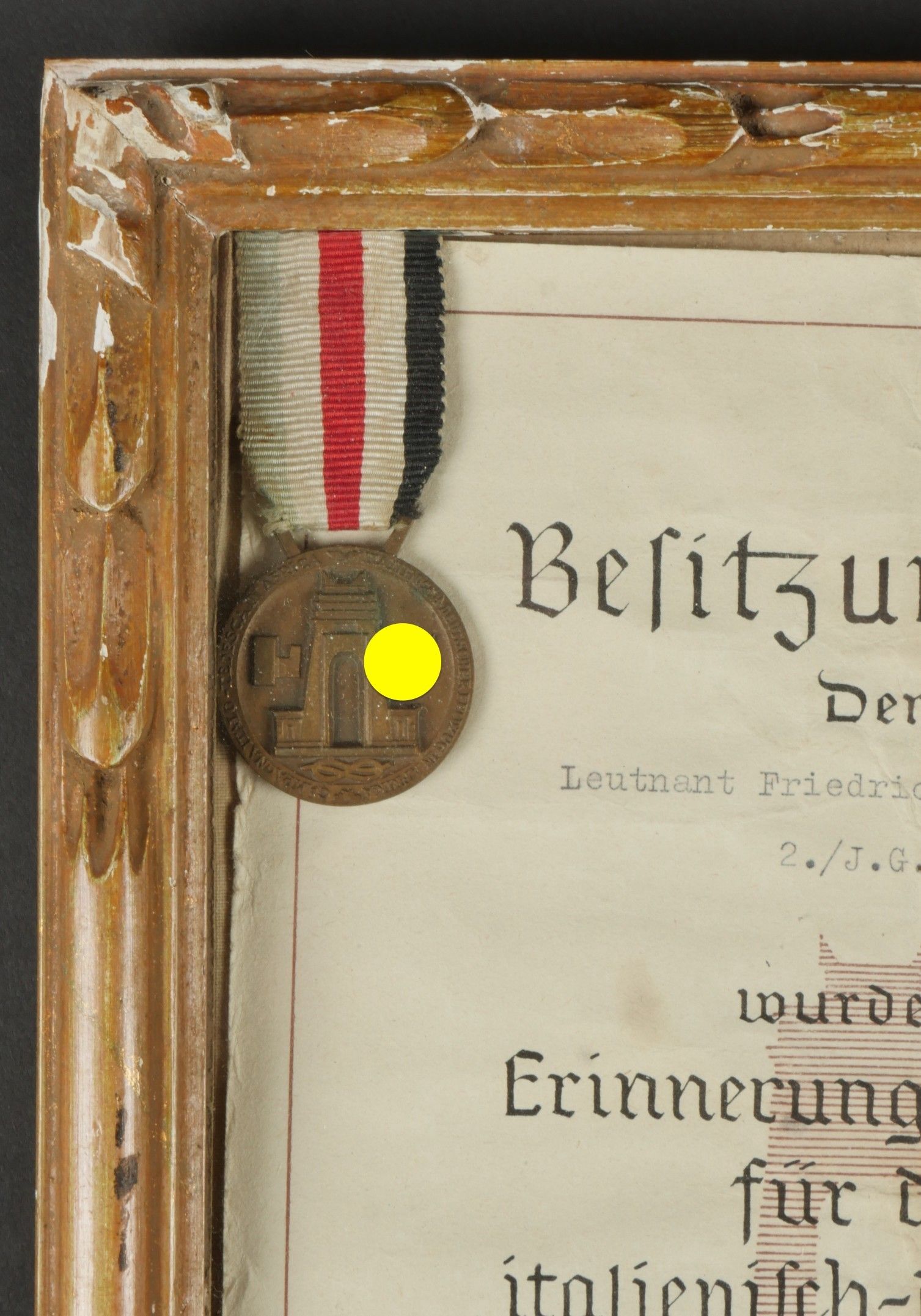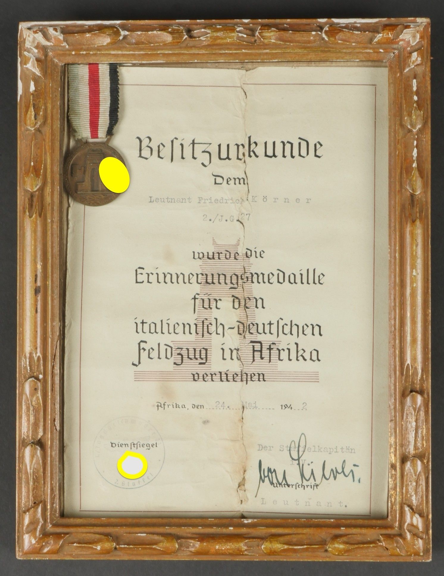 Diplôme de l'Italienisch Deutchen Feldzug in afrika du Ritterkreuzträger Friedrich Körner. Diplôme papier présentant quelques déchirures, attribué au Leutnant Friedrich Körner 2/JG 27, le 24 mai 1942, signature autographe du Staffelkapitän. Médaille complète avec son ruban. Sous cadre ancien. Dimensions 189,5 x 25,5 cm. Ce diplôme provient de la succession du Ritterkreuzträger Friedrich Körner. Friedrich Körner (24 janvier 1921 – 3 septembre 1998) fut un as de l’aviation de chasse de la Luftwaffe durant la Seconde Guerre mondiale. Il fut notamment décoré de la Croix de chevalier de la Croix de fer, distinction honorant un courage exceptionnel sur le champ de bataille ou un commandement militaire particulièrement efficace. Au cours de plus de 250 missions, Körner se vit attribuer 36 victoires aériennes confirmées, toutes obtenues aux commandes d’un Messerschmitt Bf 109. À l’issue de sa formation de pilote, puis de chasseur, il fut affecté, le 4 juillet 1941, au I. Gruppe (1er groupe) du Jagdgeschwader 27 (JG 27 – 27e escadre de chasse), alors engagé en Afrique du Nord. En juin 1942, il totalisait déjà 20 victoires, dont cinq en une seule journée, le 26 juin – performance qui fit de lui un « as en un jour », la journée la plus prolifique de sa carrière. Le 4 juillet 1942, exactement un an après son arrivée dans l’unité, il fut abattu au cours d’une tentative d’interception d’une formation de bombardiers de la Royal Air Force (RAF), au-dessus du front près d’El Alamein. Körner fut capturé et envoyé dans un camp de prisonniers au Canada, où il demeura jusqu’à sa libération en 1947. En janvier 1956, Friedrich Körner rejoignit la Bundesluftwaffe, la nouvelle armée de l’air de la République fédérale d’Allemagne, avec le grade d’Oberleutnant (lieutenant). Il y exerça d’abord la fonction d’instructeur de vol, avant de suivre une formation d’état-major. Il prit sa retraite le 30 juin 1979, avec le grade de général de brigade. Après sa carrière militaire, Körner s’installa à Paris avec son épouse. Il s’éteignit le 3 septembre 1998 à l’âge de 77 ans, à Bailly, dans le centre-nord de la France. Au cours de sa carrière militaire, Friedrich Körner fut l’objet de plusieurs distinctions. Il reçut tout d’abord la Croix de fer, successivement de 2e puis de 1re classe. Le 10 août 1942, alors qu’il servait avec le grade de lieutenant, il se vit décerner l’insigne d'honneur en or de la Luftwaffe. Quelques jours plus tard, le 21 août 1942, il fut décoré de la Croix allemande en or, alors qu’il appartenait au I. Gruppe du Jagdgeschwader 27. Enfin, le 6 septembre 1942, il fut élevé au rang de Chevalier de la Croix de fer, en tant que Leutnant et commandant de la 2e escadrille du Jagdgeschwader 27. A noter une certaine usure et patine de la pièce. Etat II+. Certificate from the Italienisch-Deutschen Feldzug in Afrika belonging to Knight’s Cross recipient Friedrich Körner. Paper document with minor tears, awarded to Leutnant Friedrich Körner, 2./JG 27, dated 24 May 1942, bearing the autograph of the Staffelkapitän. Complete medal with ribbon, displayed in an old frame. Dimensions 189.5 × 25.5 cm. From the estate of Ritterkreuzträger Friedrich Körner. Friedrich Körner (24 January 1921 – 3 September 1998) was a Luftwaffe fighter ace during the Second World War. He was notably decorated with the Knight’s Cross of the Iron Cross, awarded for exceptional bravery in combat or outstanding military leadership. Over the course of more than 250 missions, Körner achieved 36 confirmed aerial victories, all while flying a Messerschmitt Bf 109. After completing pilot and fighter training, he was assigned on 4 July 1941 to I./JG 27 (1st Group of Fighter Wing 27), then engaged in North Africa. By June 1942 he had already achieved 20 victories, including five in a single day on 26 June — making him an “ace in a day,” his most successful combat day. On 4 July 1942, exactly one year after joining the unit, he was shot down while intercepting a formation of RAF bombers near El Alamein. Captured, he was sent to a POW camp in Canada, where he remained until his release in 1947. In January 1956, Körner joined the newly formed Bundesluftwaffe (Federal German Air Force) as an Oberleutnant (Lieutenant). He served as a flight instructor and later completed staff officer training. He retired on 30 June 1979 with the rank of Brigadegeneral (Brigadier General). After his military career, he settled in Paris with his wife and passed away on 3 September 1998 at the age of 77 in Bailly, northern France. Throughout his career, Friedrich Körner received numerous decorations: Iron Cross 2nd and 1st Class, the Luftwaffe Honour Goblet (10 August 1942), the German Cross in Gold (21 August 1942), and finally the Knight’s Cross of the Iron Cross (6 September 1942) as Leutnant and commander of 2./JG 27. Shows wear and patina. Condition II+.