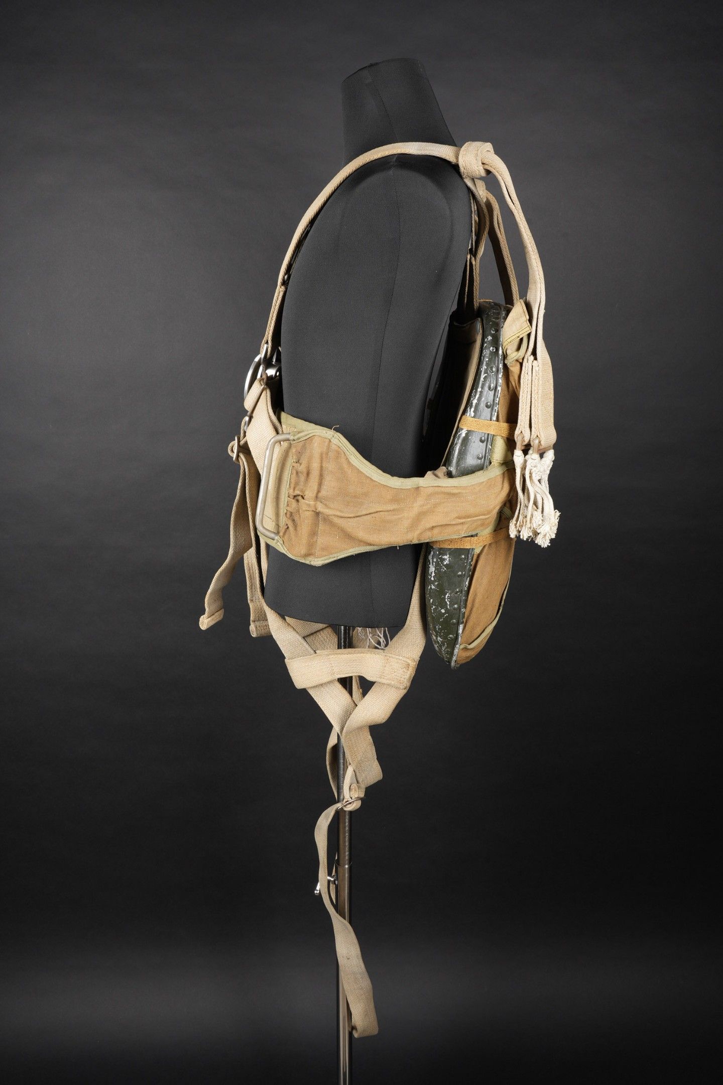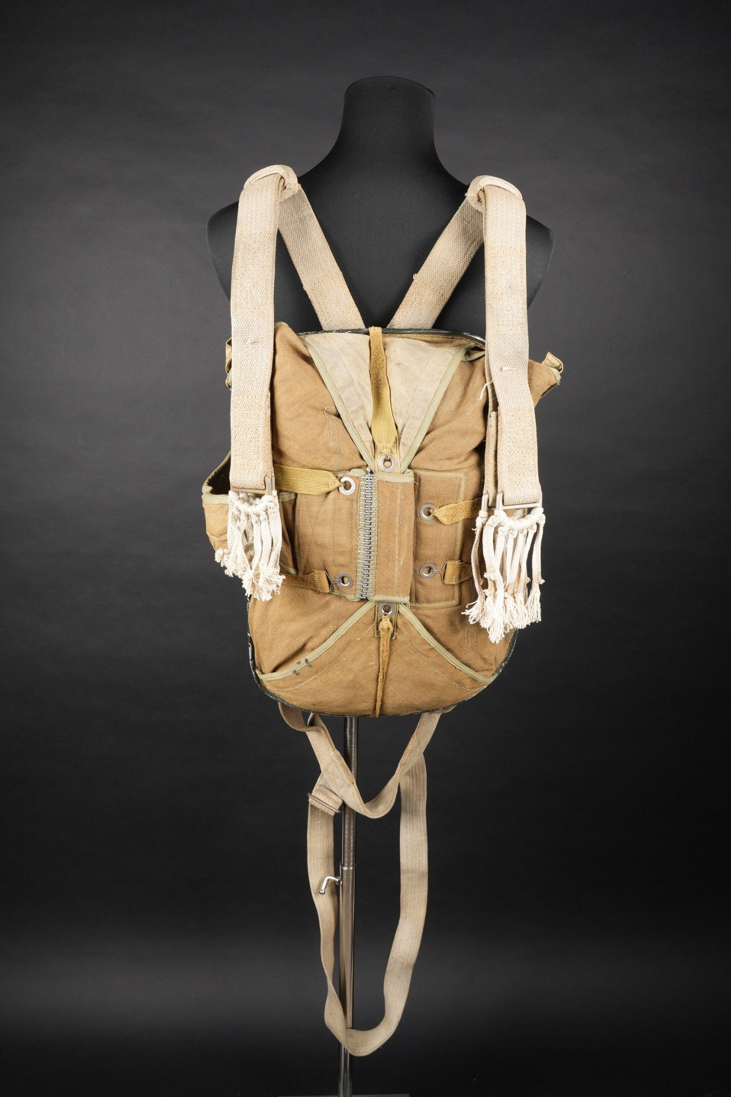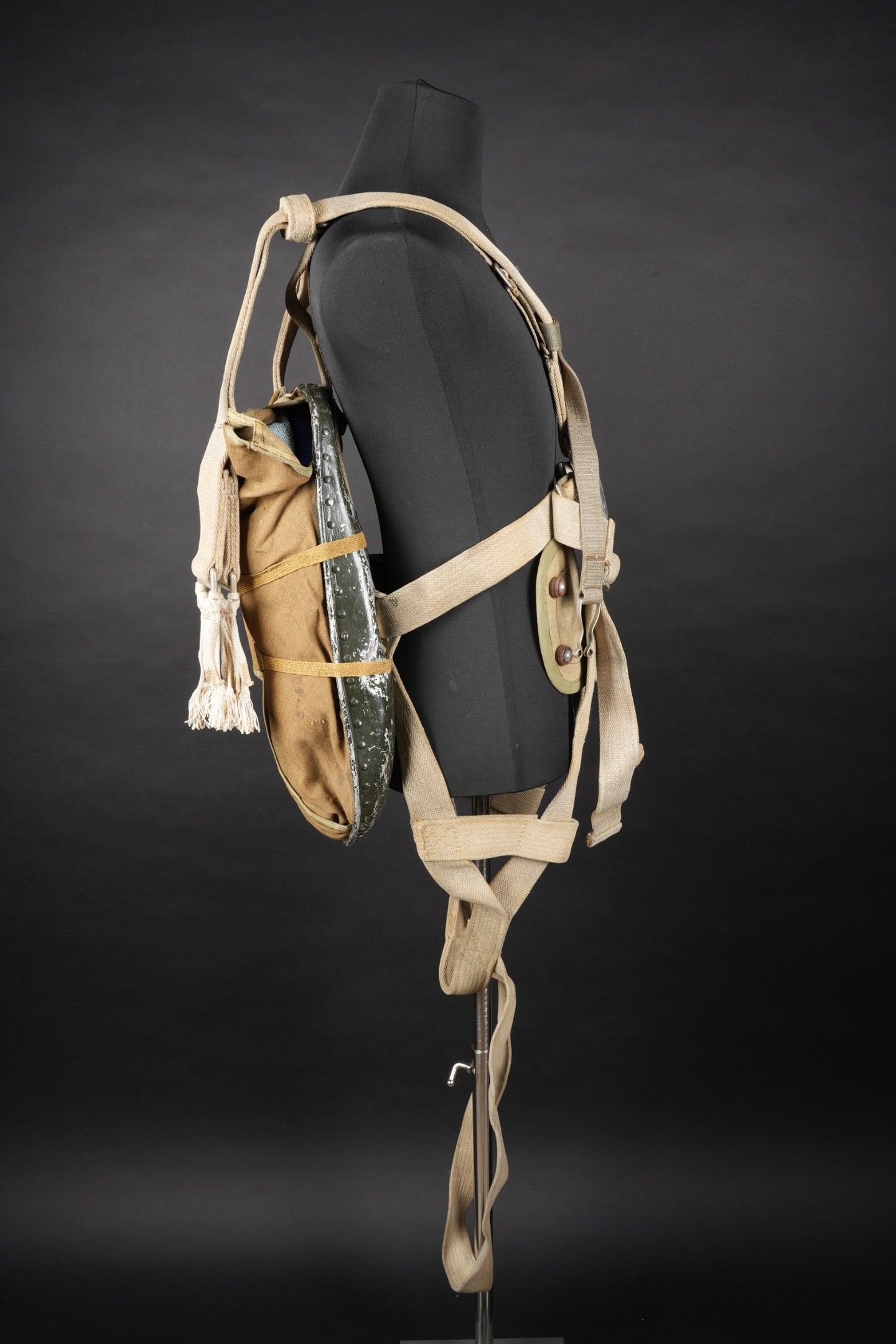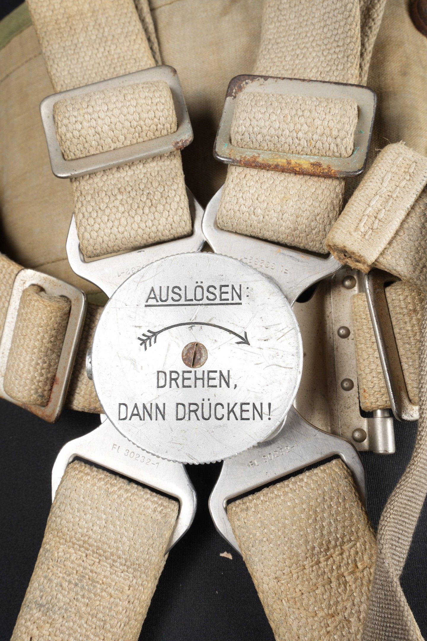 Parachute allemand. Modèle RH 136. Dos de la pièce, formée par une coque en aluminium, en peinture d'origine à 80%. La voilure est absente, ainsi que les suspentes. Sac en toile marron. Tous les élastiques de maintien sont complets. L'étiquette fabricant est absente. Fermeture éclaire complète. Marquages 42 sur le côté. Harnais complet, avec reste de suspentes. Le coussin dorsale est présent. Ceinture en épaisse toile grise, la poignée d'ouverture d'urgence est complète. Boucle marquée DR Gettwart Berlin numéro 4013223 FL 30232. Toutes les parties métallique de fermeture sont marquée FL 30232-1. A noter une certaine usure et patine de la pièce. Etat II+. German parachute. Model RH 136. Rear section made of aluminum shell, retaining about 80% of original paint. Canopy and suspension lines missing. Brown canvas pack. All elastic retaining straps complete. Manufacturer’s label missing. Zipper complete. Marked 42 on the side. Harness complete with remaining suspension lines. Back cushion present. Thick grey webbed waist belt with complete emergency release handle. Buckle marked DR Gettwart Berlin No. 4013223 FL 30232. All metal fittings marked FL 30232-1. Shows typical wear and patina. Condition II+.