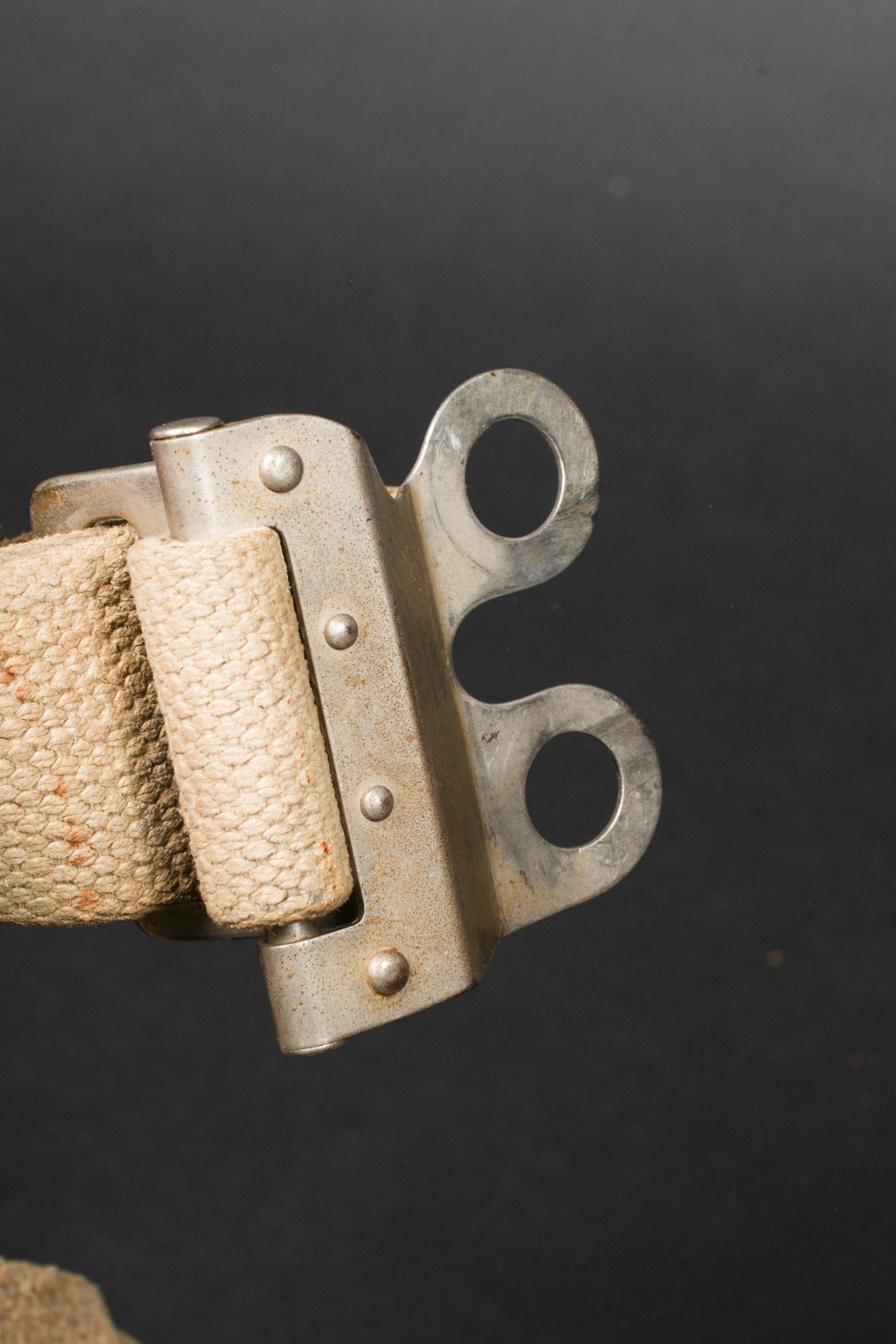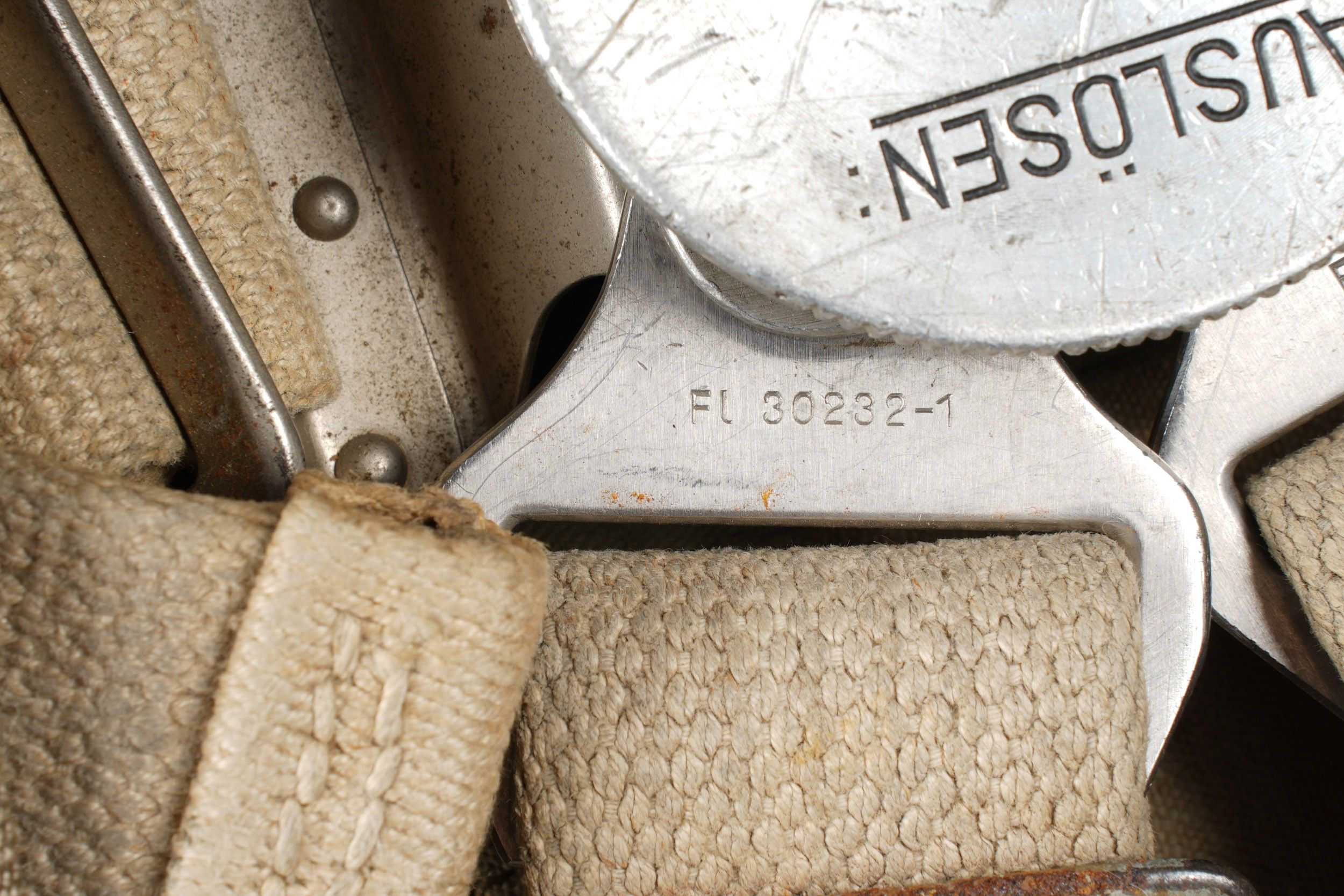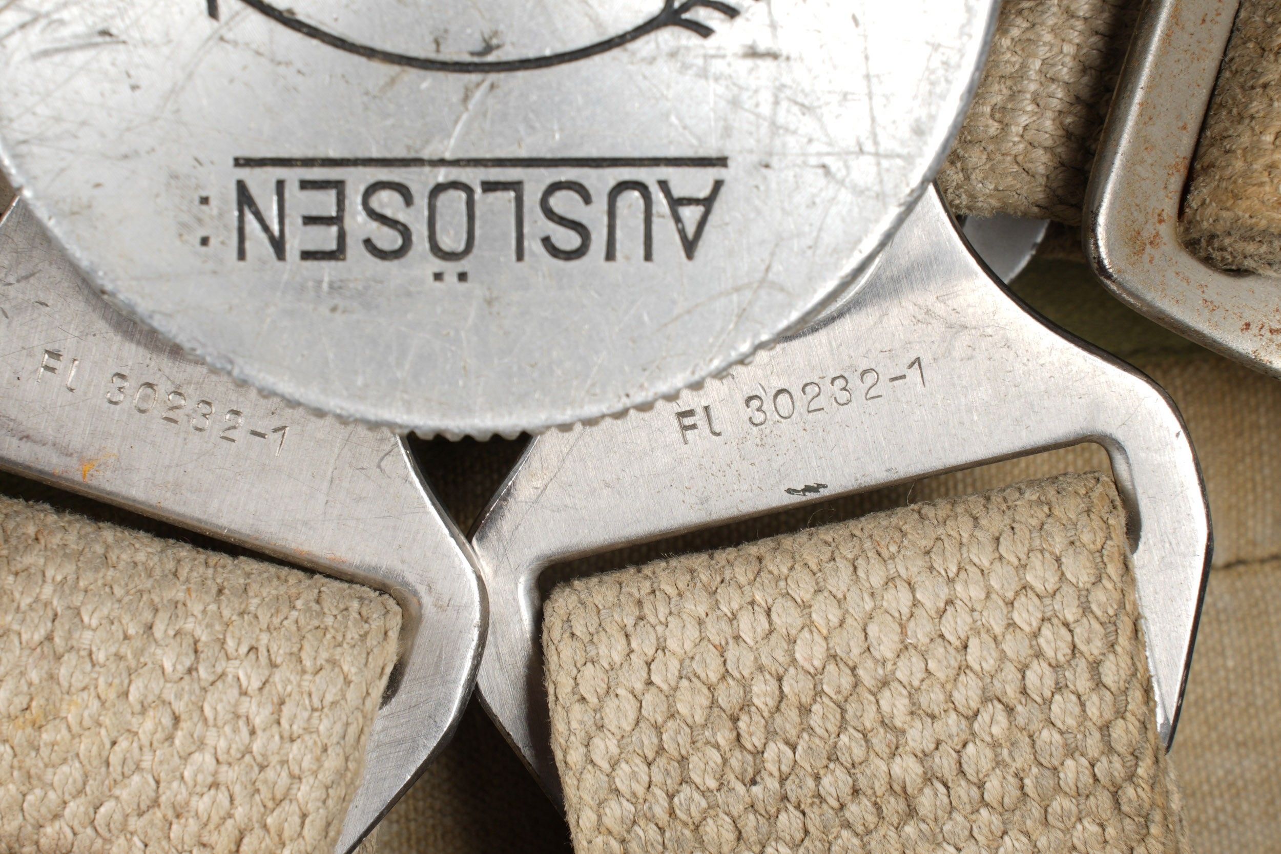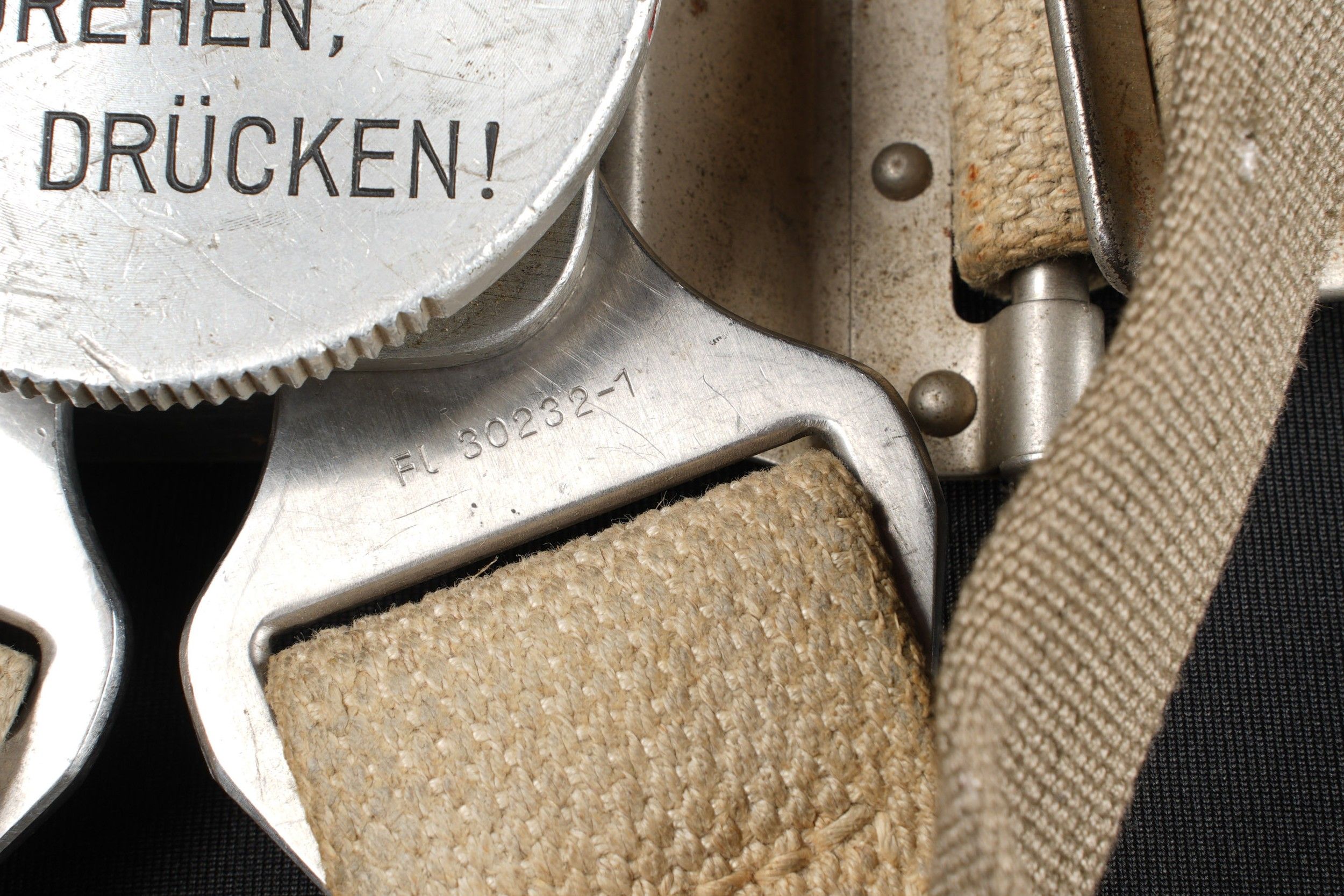 Parachute allemand. Modèle RH 136. Dos de la pièce, formée par une coque en aluminium, en peinture d'origine à 80%. La voilure est absente, ainsi que les suspentes. Sac en toile marron. Tous les élastiques de maintien sont complets. L'étiquette fabricant est absente. Fermeture éclaire complète. Marquages 42 sur le côté. Harnais complet, avec reste de suspentes. Le coussin dorsale est présent. Ceinture en épaisse toile grise, la poignée d'ouverture d'urgence est complète. Boucle marquée DR Gettwart Berlin numéro 4013223 FL 30232. Toutes les parties métallique de fermeture sont marquée FL 30232-1. A noter une certaine usure et patine de la pièce. Etat II+. German parachute. Model RH 136. Rear section made of aluminum shell, retaining about 80% of original paint. Canopy and suspension lines missing. Brown canvas pack. All elastic retaining straps complete. Manufacturer’s label missing. Zipper complete. Marked 42 on the side. Harness complete with remaining suspension lines. Back cushion present. Thick grey webbed waist belt with complete emergency release handle. Buckle marked DR Gettwart Berlin No. 4013223 FL 30232. All metal fittings marked FL 30232-1. Shows typical wear and patina. Condition II+.