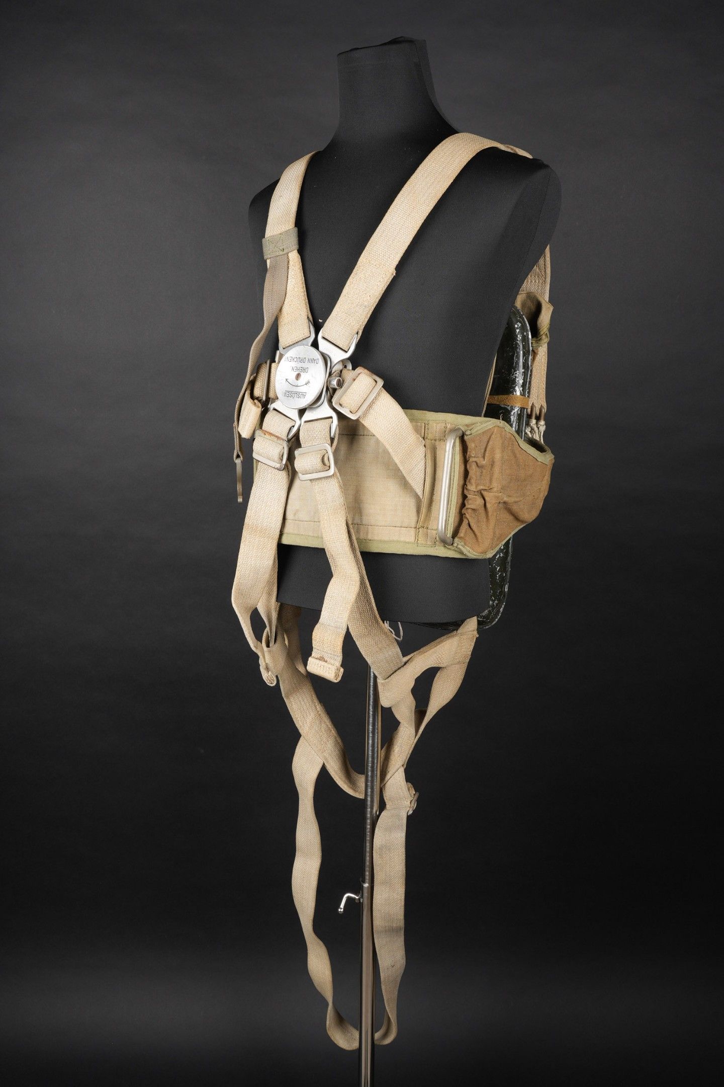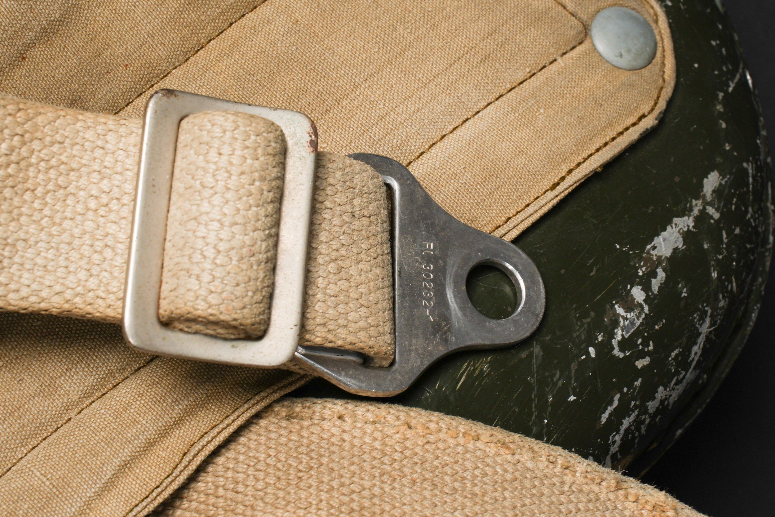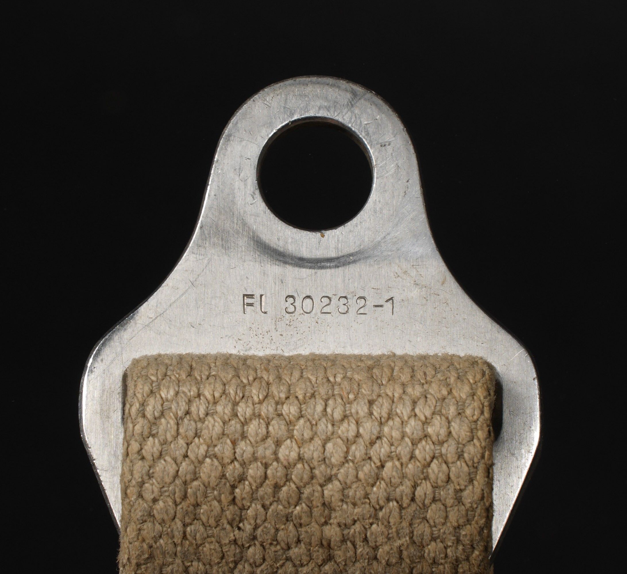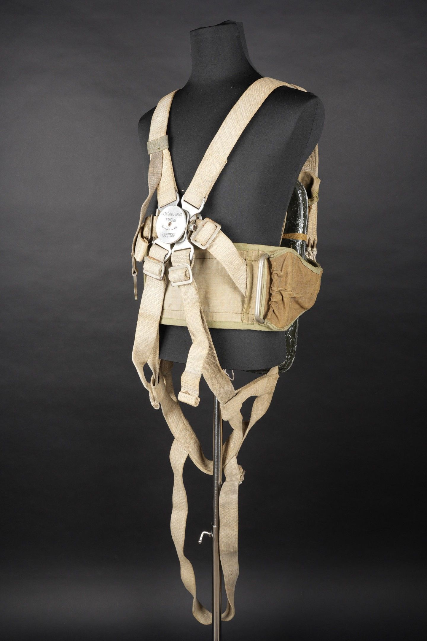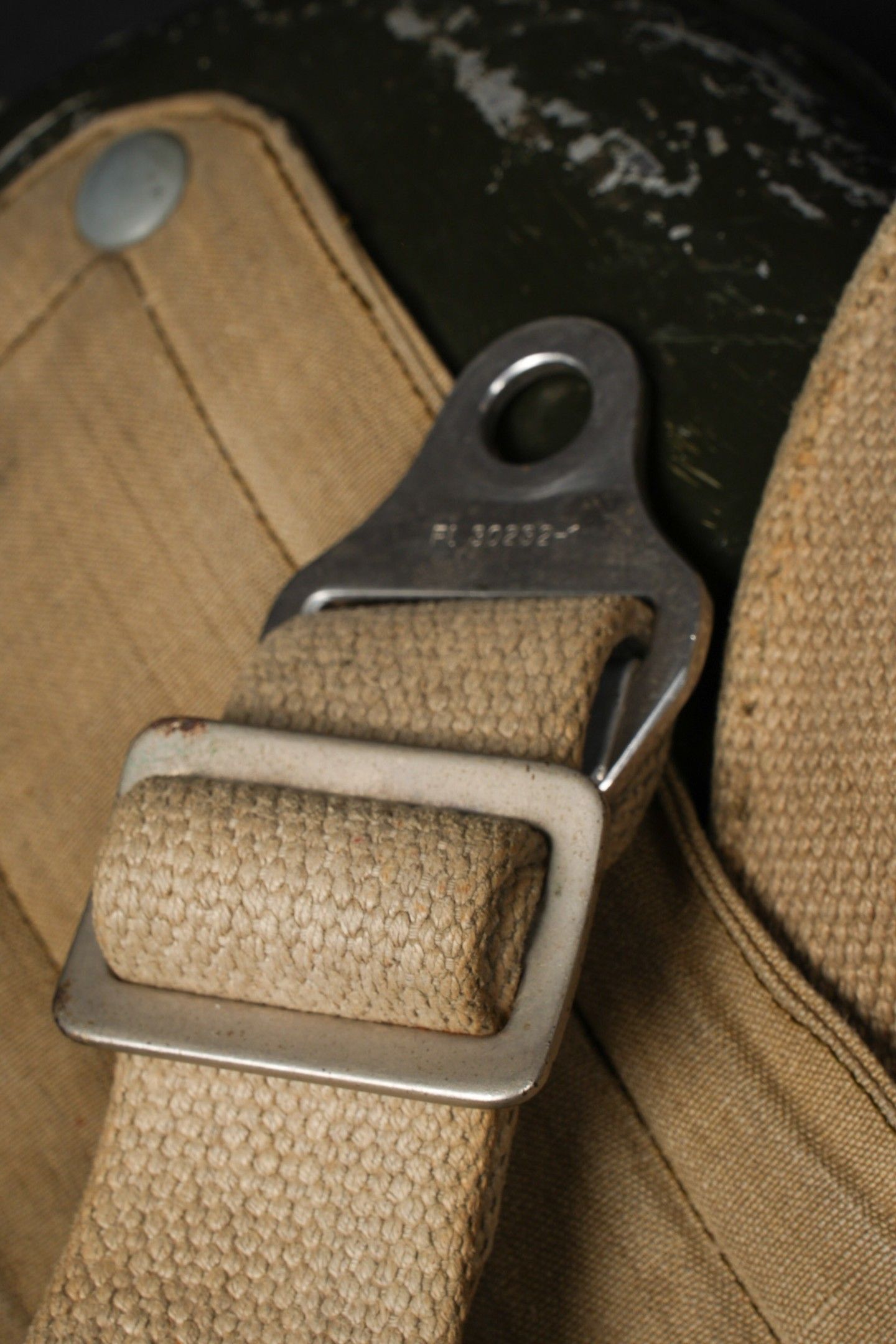 Parachute allemand. Modèle RH 136. Dos de la pièce, formée par une coque en aluminium, en peinture d'origine à 80%. La voilure est absente, ainsi que les suspentes. Sac en toile marron. Tous les élastiques de maintien sont complets. L'étiquette fabricant est absente. Fermeture éclaire complète. Marquages 42 sur le côté. Harnais complet, avec reste de suspentes. Le coussin dorsale est présent. Ceinture en épaisse toile grise, la poignée d'ouverture d'urgence est complète. Boucle marquée DR Gettwart Berlin numéro 4013223 FL 30232. Toutes les parties métallique de fermeture sont marquée FL 30232-1. A noter une certaine usure et patine de la pièce. Etat II+. German parachute. Model RH 136. Rear section made of aluminum shell, retaining about 80% of original paint. Canopy and suspension lines missing. Brown canvas pack. All elastic retaining straps complete. Manufacturer’s label missing. Zipper complete. Marked 42 on the side. Harness complete with remaining suspension lines. Back cushion present. Thick grey webbed waist belt with complete emergency release handle. Buckle marked DR Gettwart Berlin No. 4013223 FL 30232. All metal fittings marked FL 30232-1. Shows typical wear and patina. Condition II+.