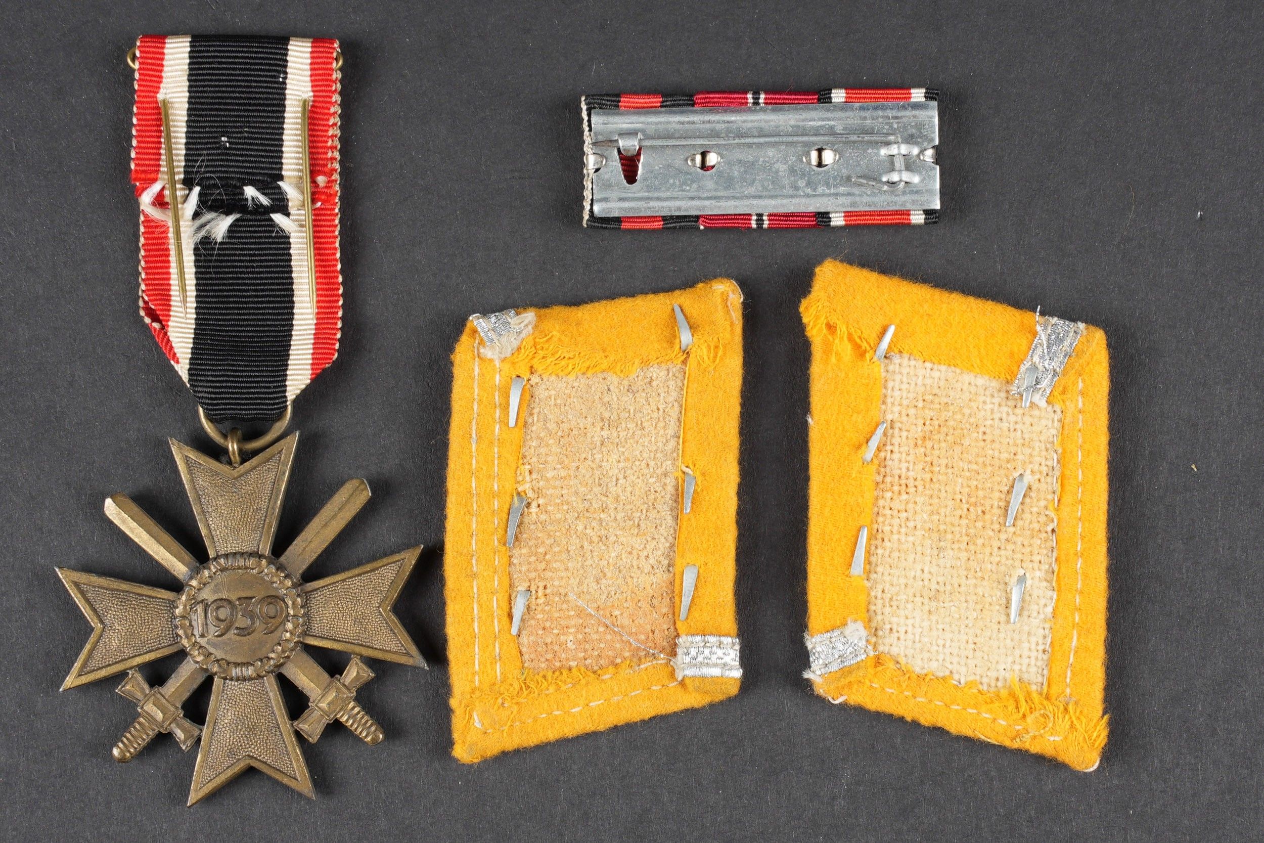 Insignes du personnel volant ou parachutiste de la Luftwaffe. Comprenant une paire homogène de pattes de col de Feldwebel du personnel volant ou parachutiste. Une barrette de rubans de décorations de la croix de fer de seconde classe, de la médaille du Front de l'Est et de la médaille des Sudètes, attache complète. Une KVK avec glaive, ruban complet. A noter une certaine usure et patine des pièces. Etat II+. Luftwaffe flying or parachute personnel insignia. Set comprising a matching pair of Feldwebel collar tabs for flying or parachute personnel, a medal ribbon bar with awards for the Iron Cross 2nd Class, the Eastern Front Medal, and the Sudeten Medal (complete pin), and a War Merit Cross with swords and full ribbon. Shows some wear and patina. Condition II+.