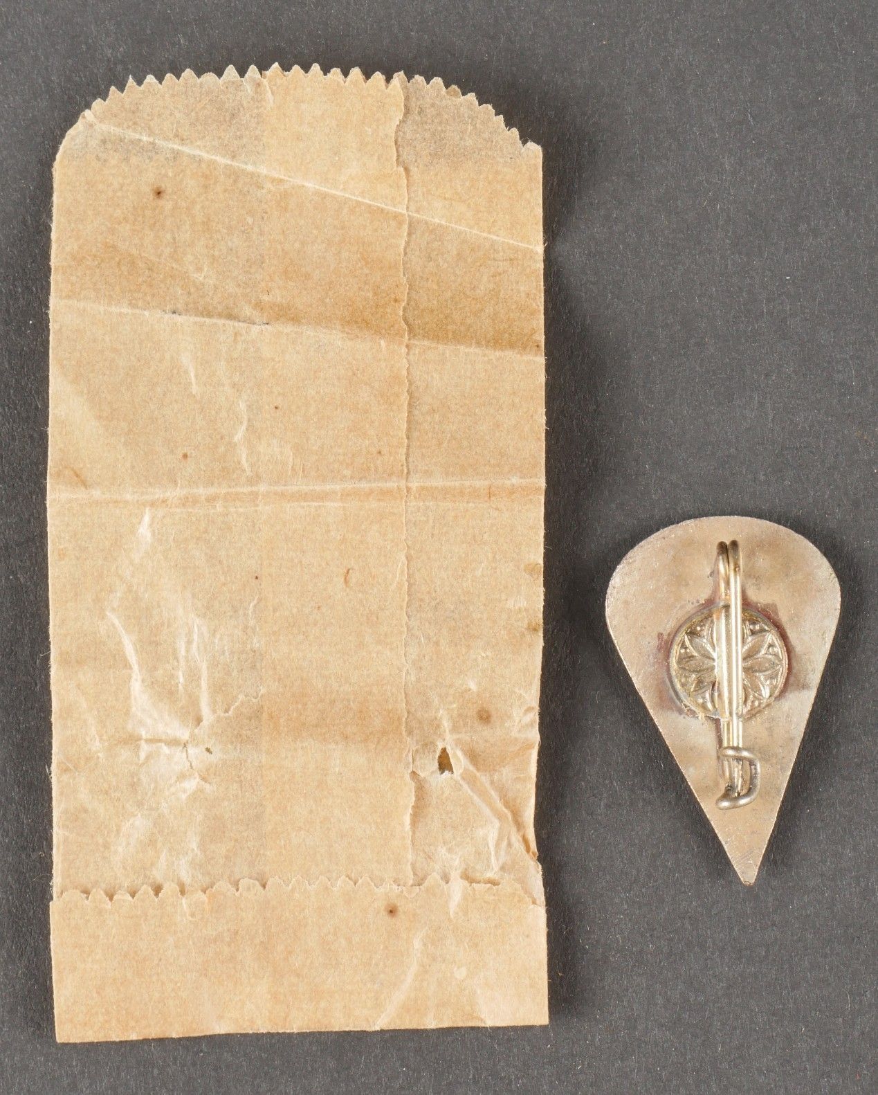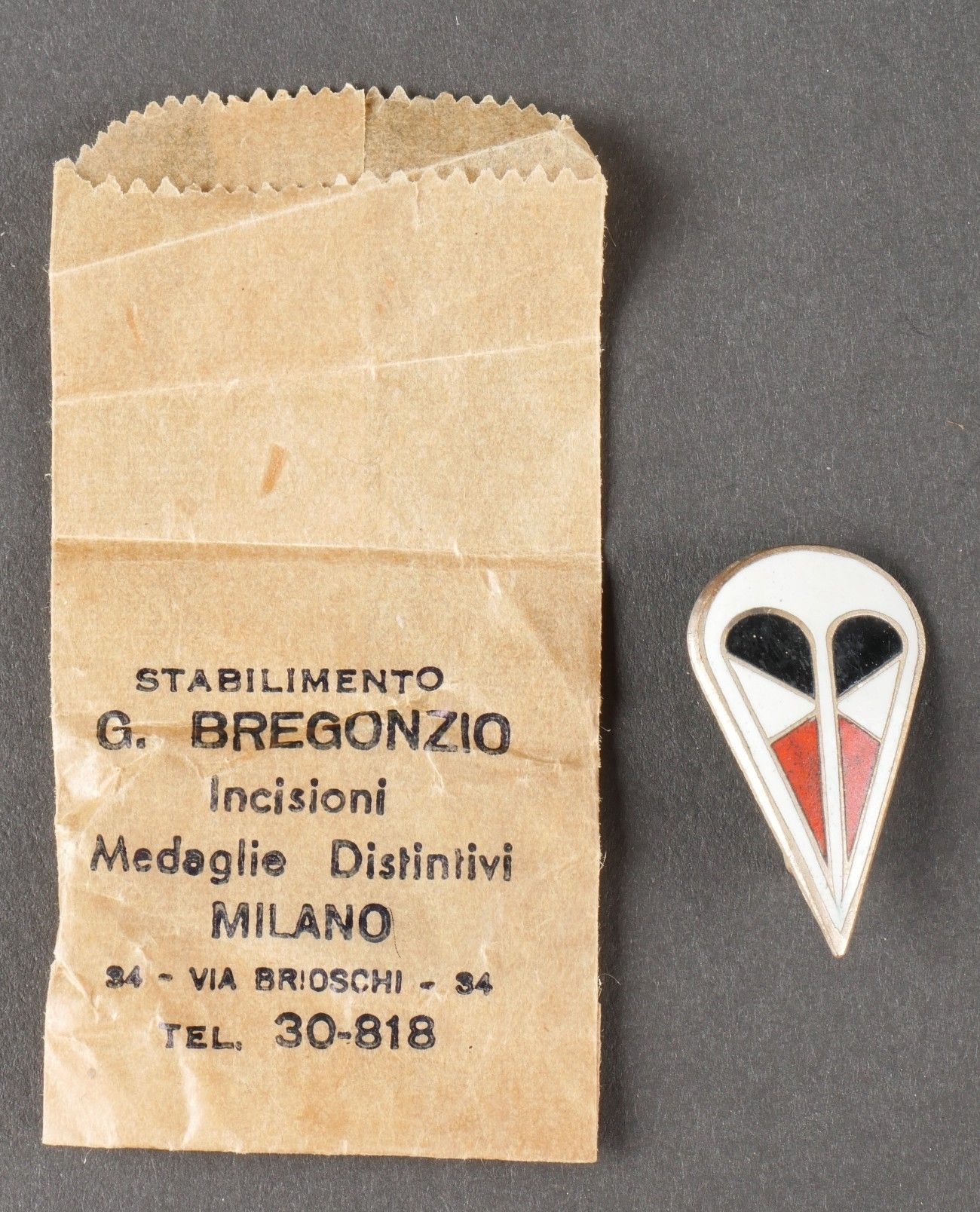 Insigne de coiffure des parachutistes allemand. En métal émaillé, attache complète. Cet insigne se fixe généralement sur les calots ou casquettes M-43. Sachet d'origine du fabricant G Bregonzio Incisioni Medaglie Distintivi Milano. A noter une légère usure et patine de la pièce. Etat I-. German paratrooper cap badge. Enameled metal badge with complete attachment. This type was typically fitted to M-43 side caps. Supplied in its original bag from the manufacturer G. Bregonzio Incisioni Medaglie Distintivi, Milano. Shows light wear and patina. Condition I–.