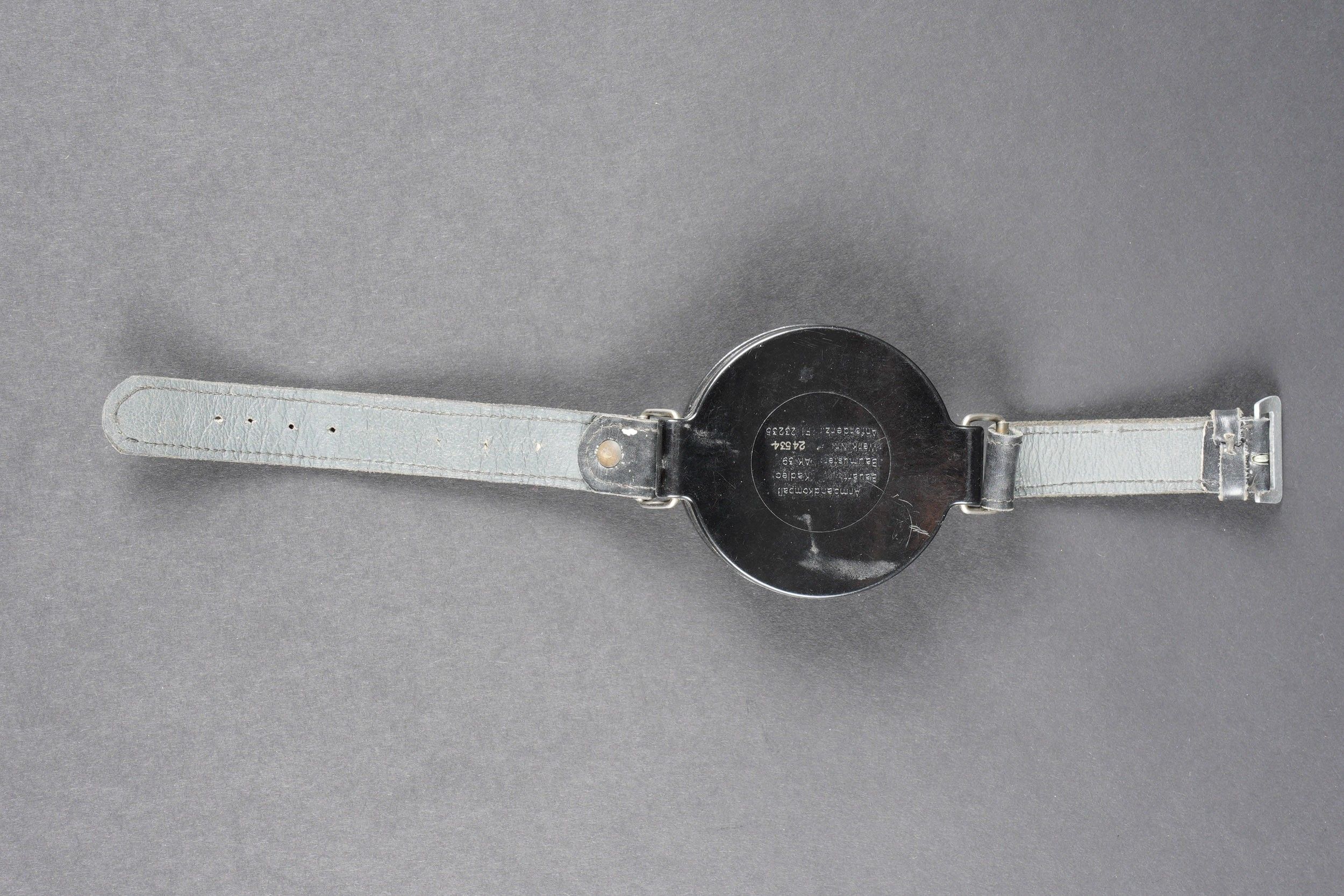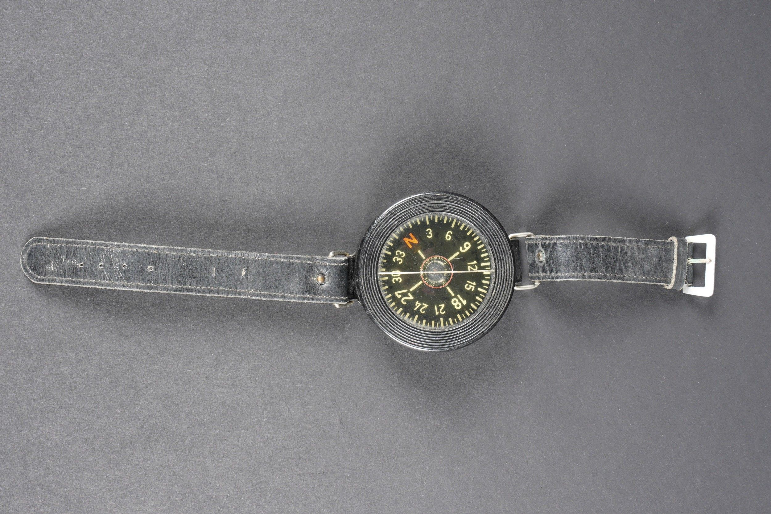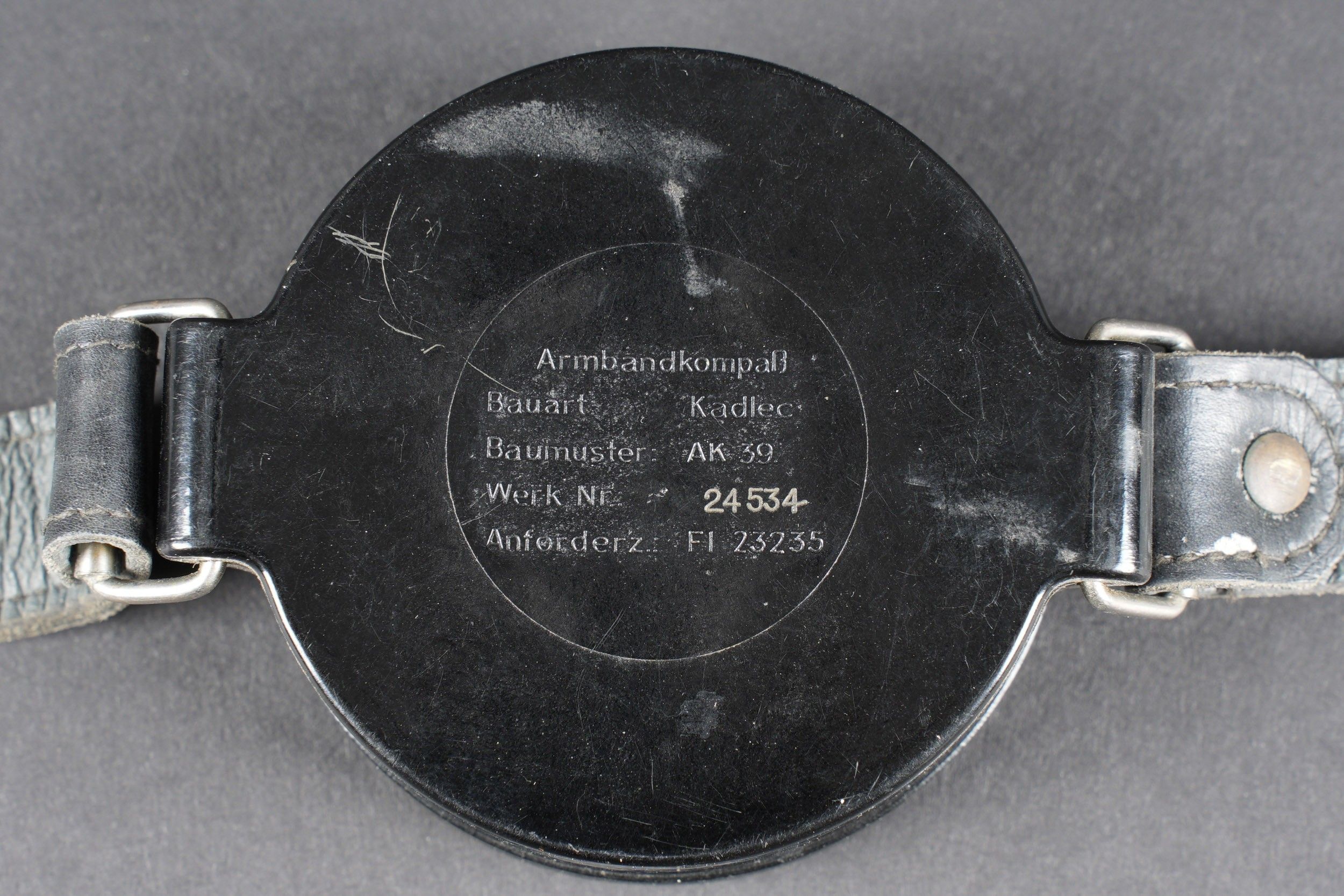 Boussole de poignée. En bakélite, cadran noir. Le liquide interne est complet. Fonctionnelle. Marquages Kadlec AK 39 FL 23235. Bracelet en cuir noir complet, boucle à un seul ardillon complet. A noter une certaine usure et patine de la pièce. Etat II+. Handle compass. Bakelite body with black dial. Liquid-filled and fully functional. Marked Kadlec AK 39 FL 23235. Complete black leather strap with single-prong buckle. Shows wear and patina. Condition II+.
