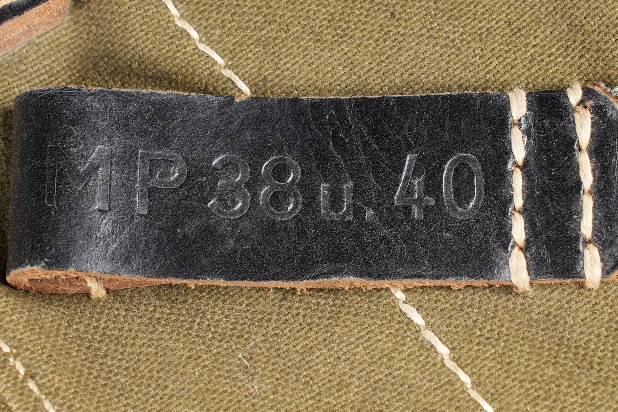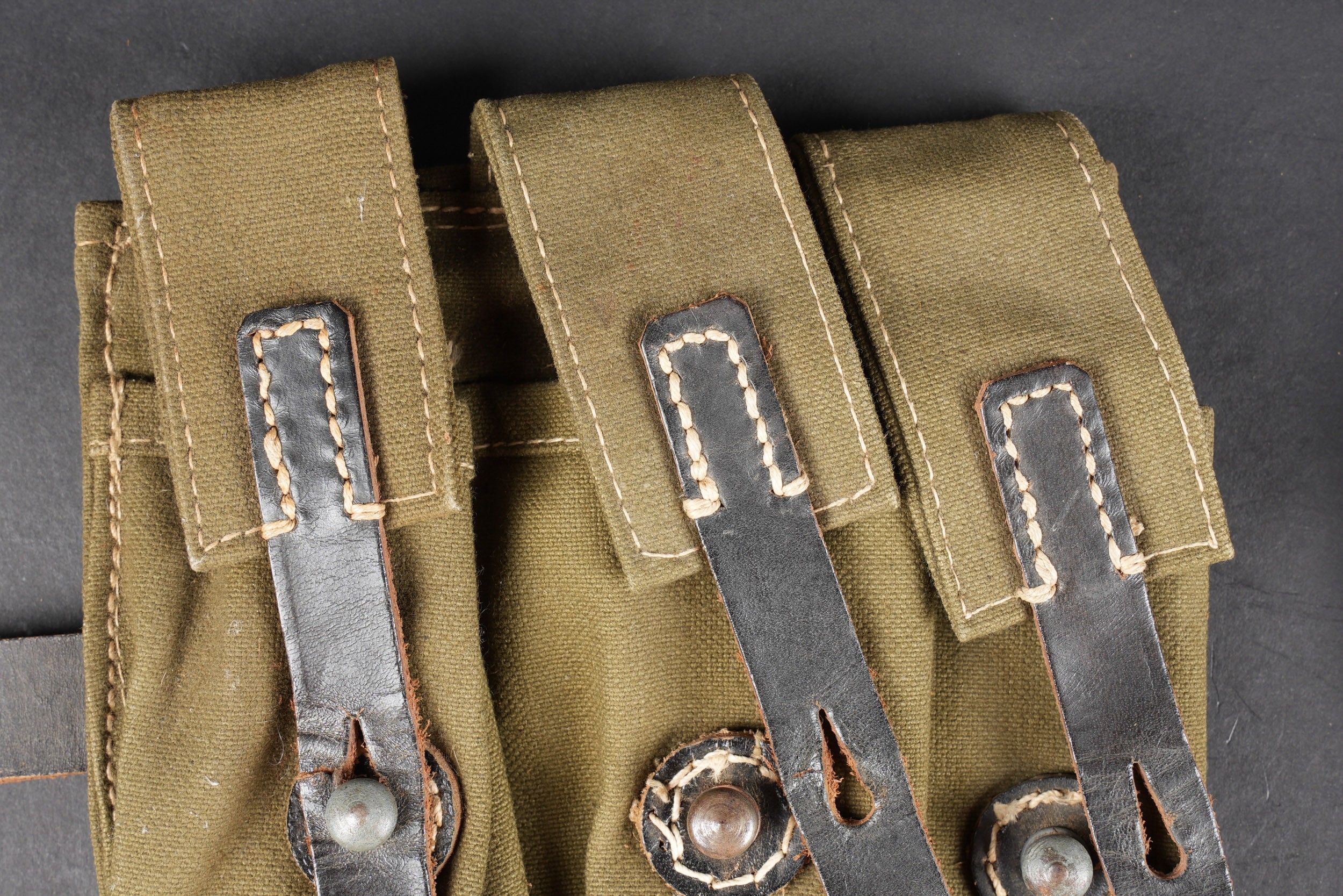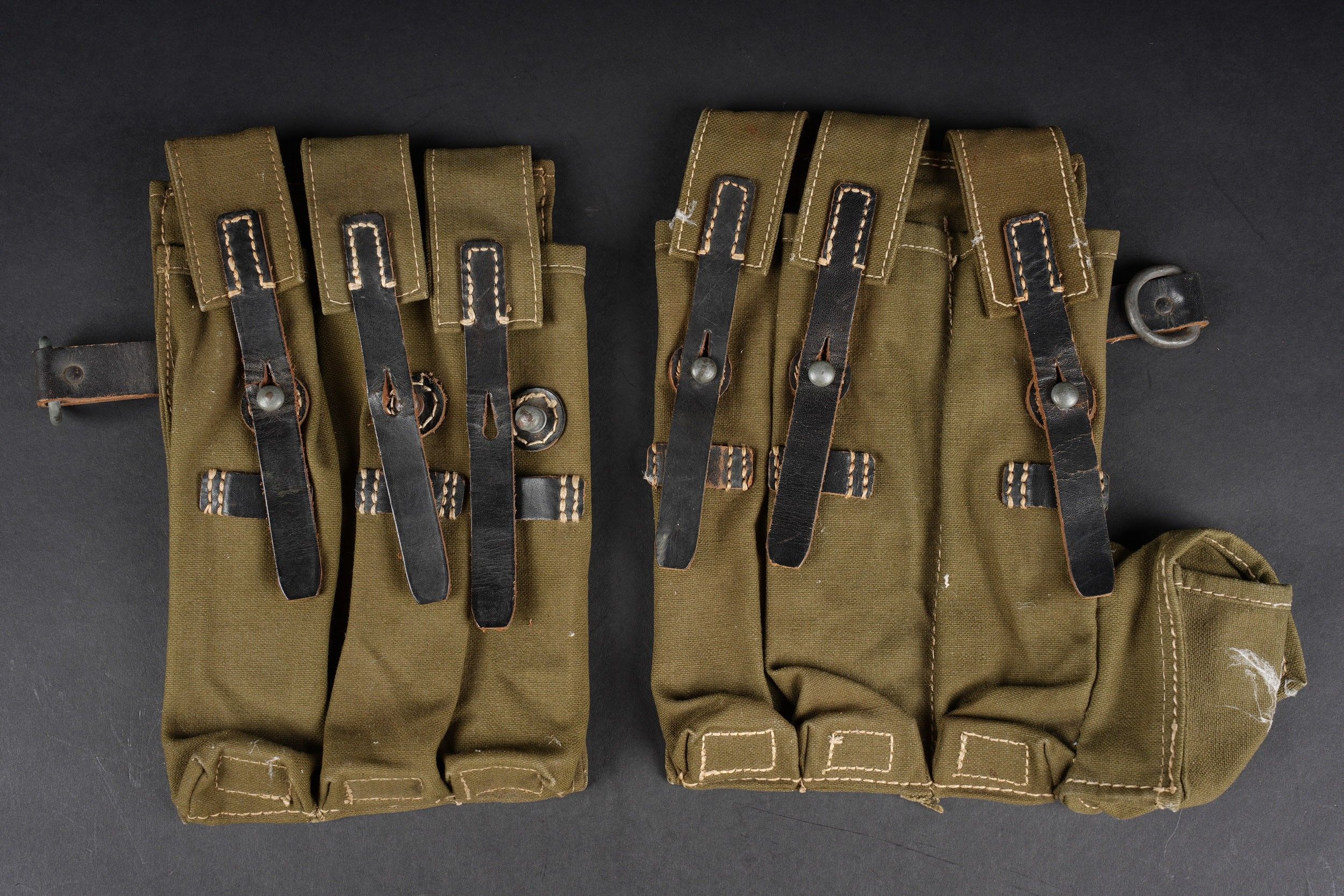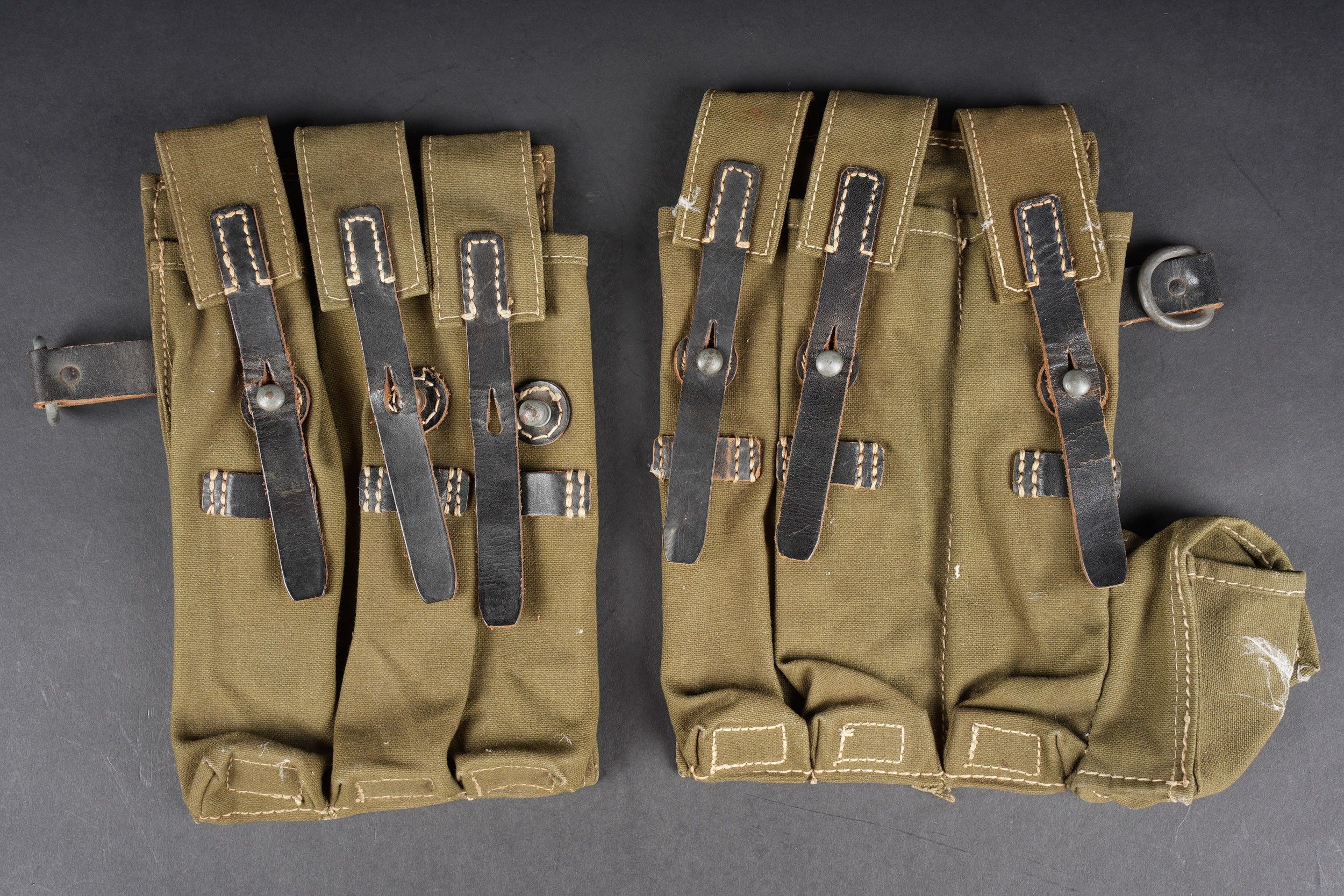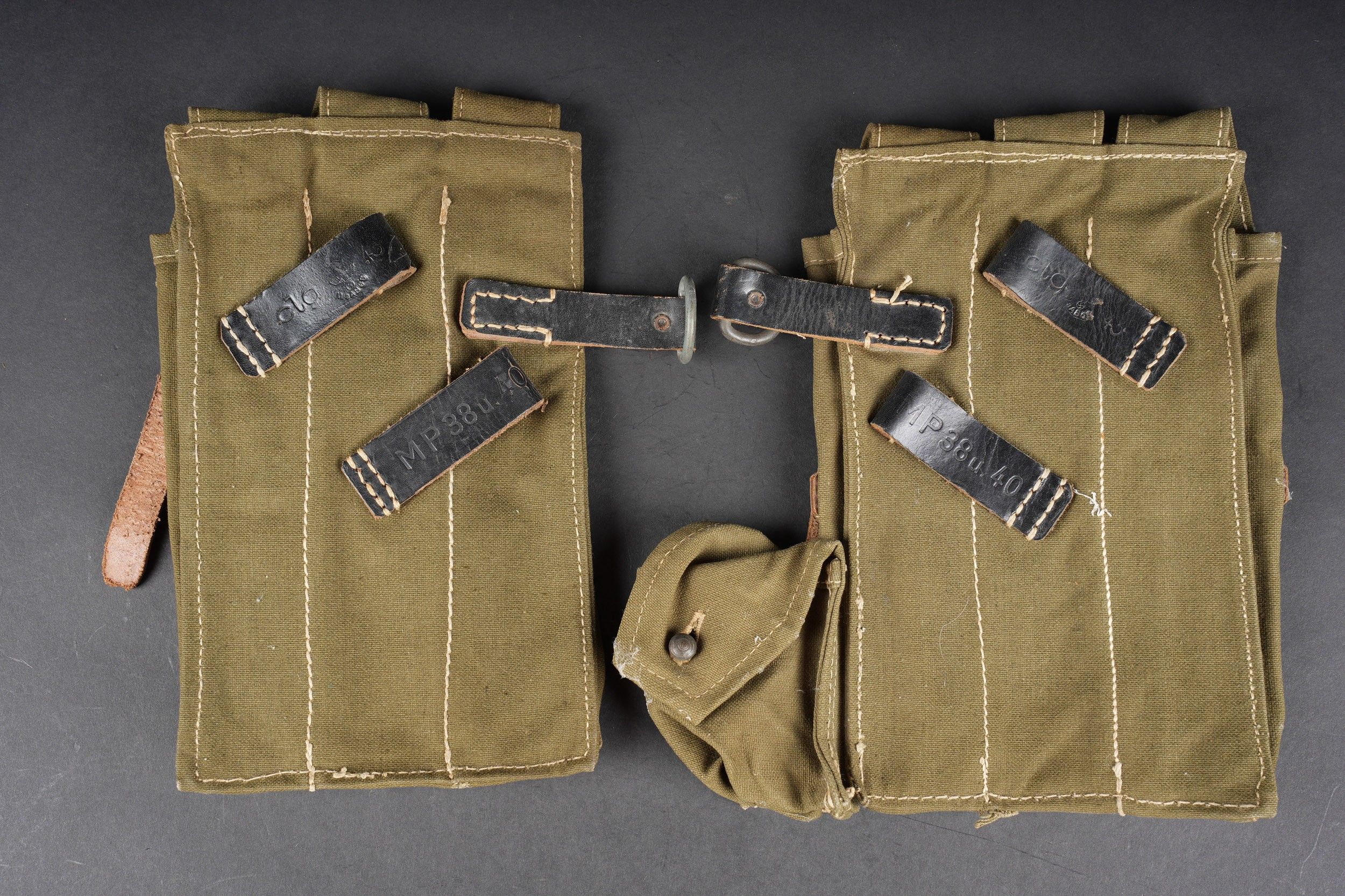 Paire de portes chargeurs de pistolet mitrailleur MP 40. Paire homogène en épais tissu Feldgrau et cuir noir. Toutes les sangles sont complètes. Cuir relativement sec. Les anneaux arrières sont présents. La pochette pour la chargette est présente. Les passants au dos sont marquées CLG 43 avec aigle Waa, ainsi que les mentions MP 38u.40. A noter une légère usure et patine des pièces. Etat I-. Pair of MP 40 magazine pouches. Matching pair made of heavy Feldgrau fabric and black leather. All straps complete. Leather relatively dry. Rear D-rings present. Loader pocket intact. Rear belt loops marked CLG 43 with Waffenamt eagle and MP 38u.40 inscription. Shows light wear and patina. Condition I–.