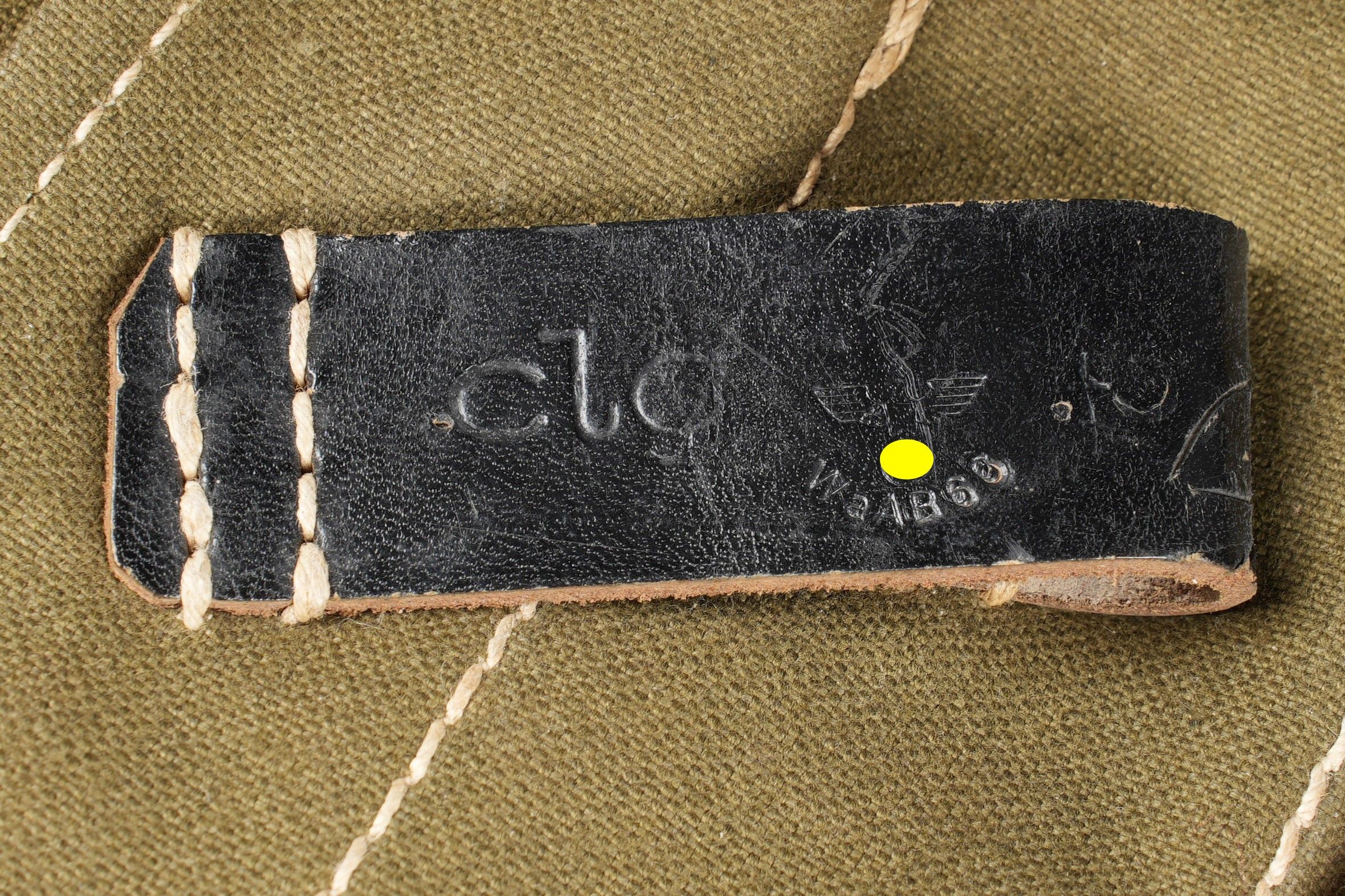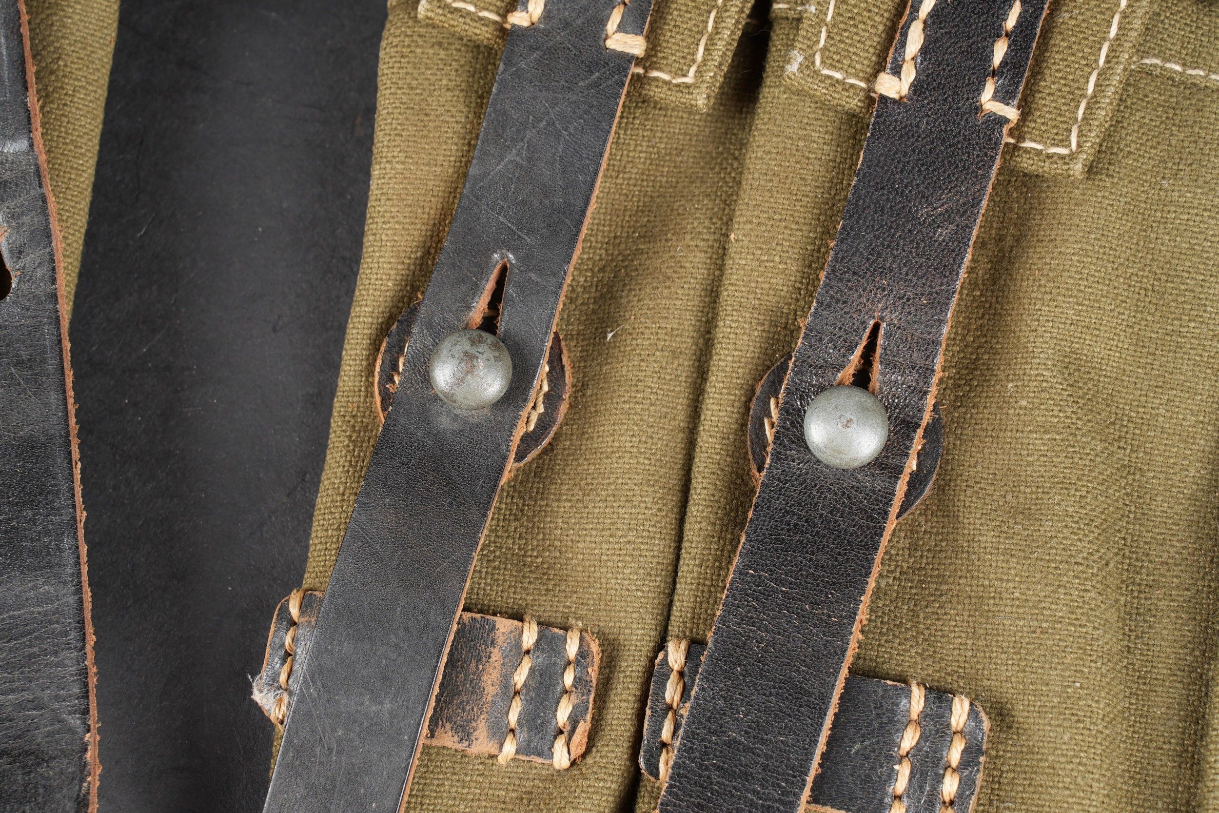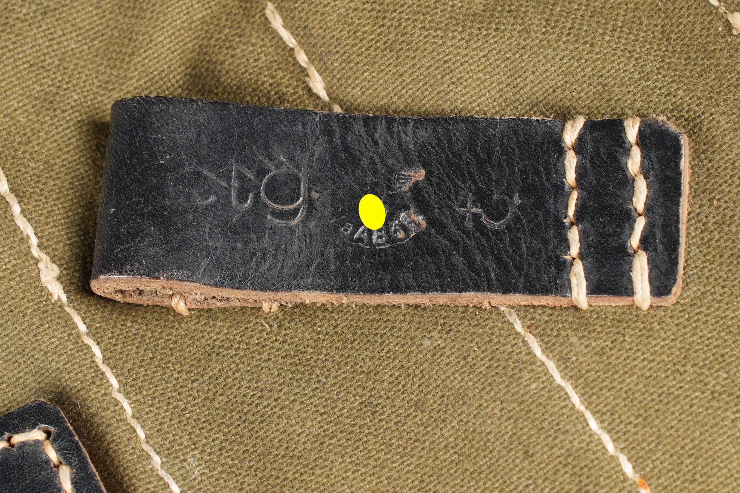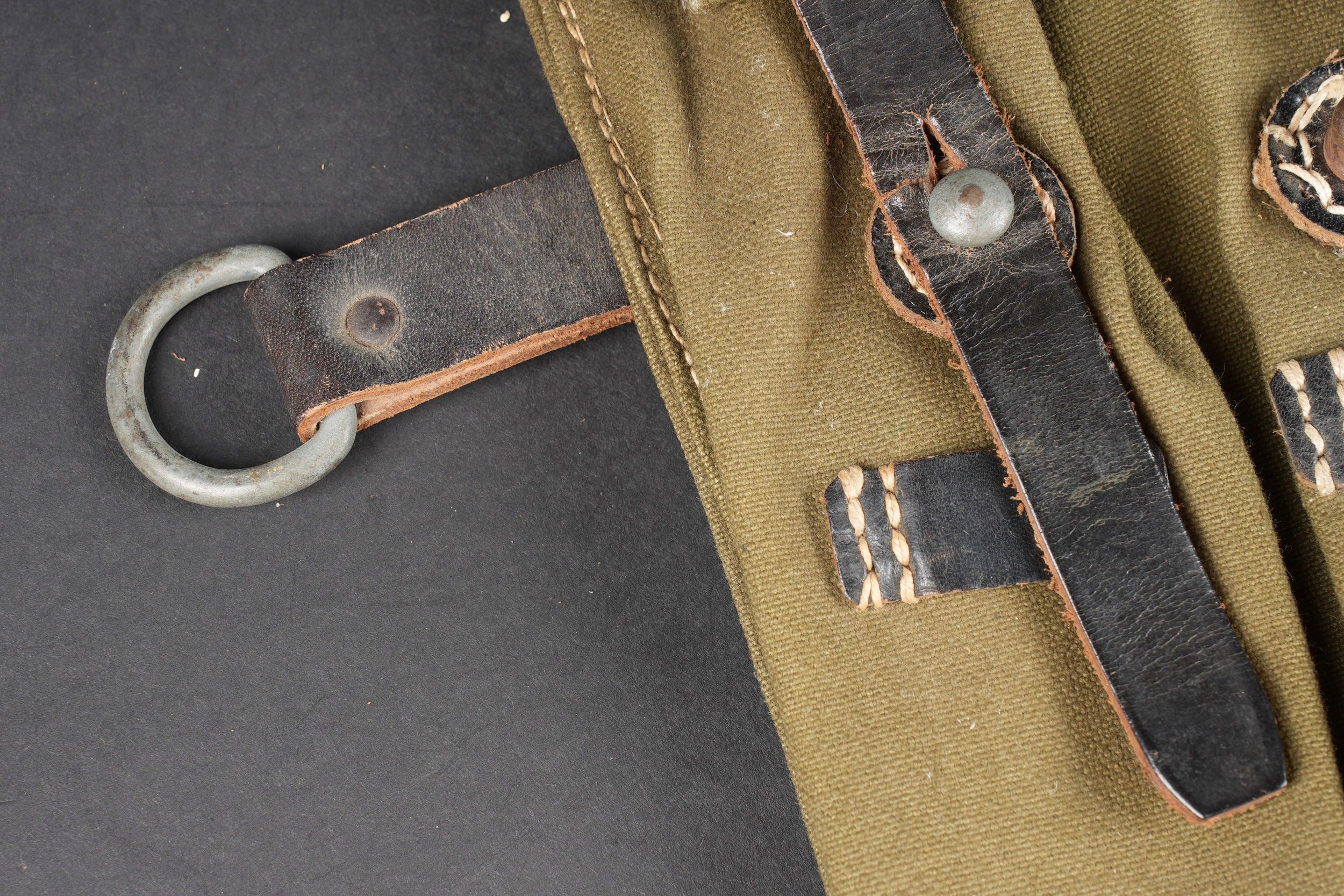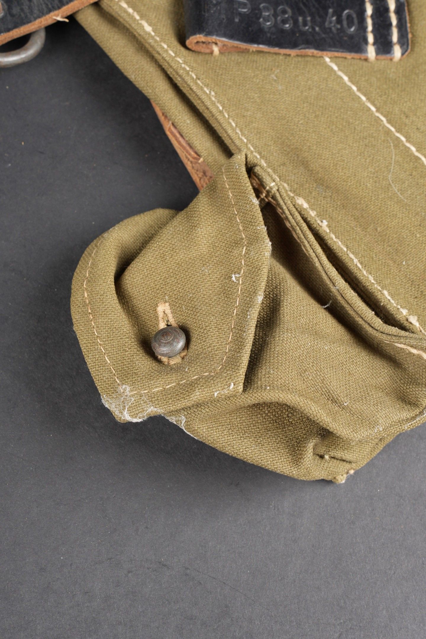 Paire de portes chargeurs de pistolet mitrailleur MP 40. Paire homogène en épais tissu Feldgrau et cuir noir. Toutes les sangles sont complètes. Cuir relativement sec. Les anneaux arrières sont présents. La pochette pour la chargette est présente. Les passants au dos sont marquées CLG 43 avec aigle Waa, ainsi que les mentions MP 38u.40. A noter une légère usure et patine des pièces. Etat I-. Pair of MP 40 magazine pouches. Matching pair made of heavy Feldgrau fabric and black leather. All straps complete. Leather relatively dry. Rear D-rings present. Loader pocket intact. Rear belt loops marked CLG 43 with Waffenamt eagle and MP 38u.40 inscription. Shows light wear and patina. Condition I–.