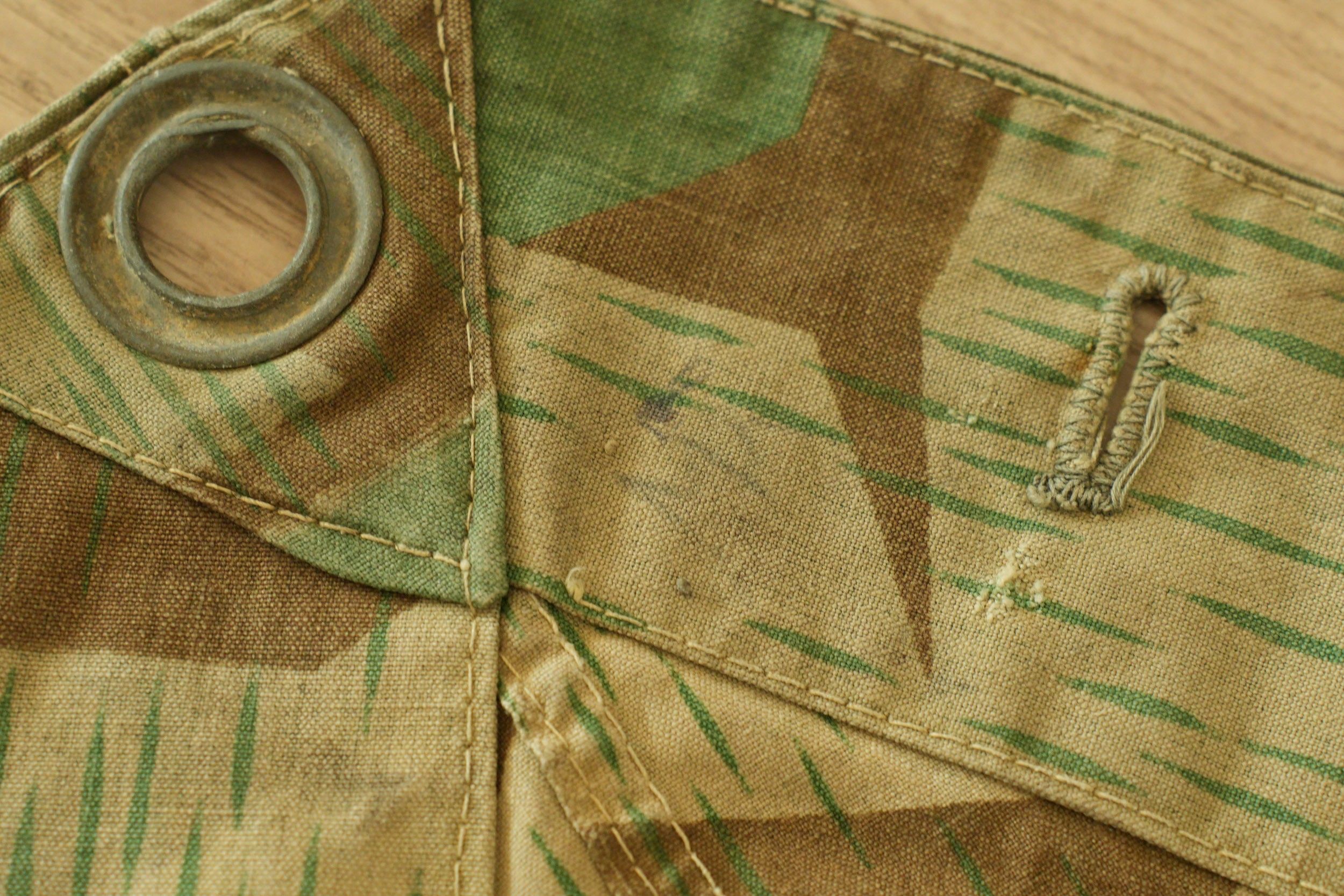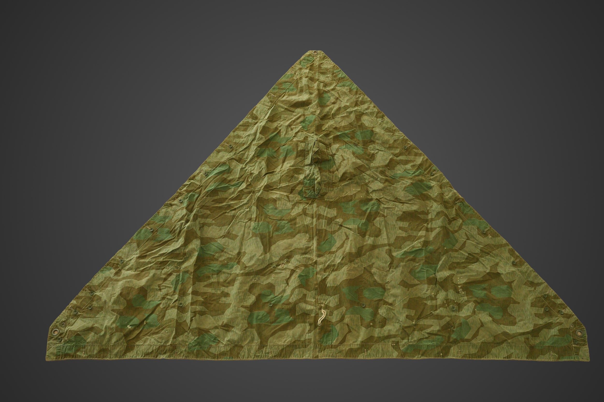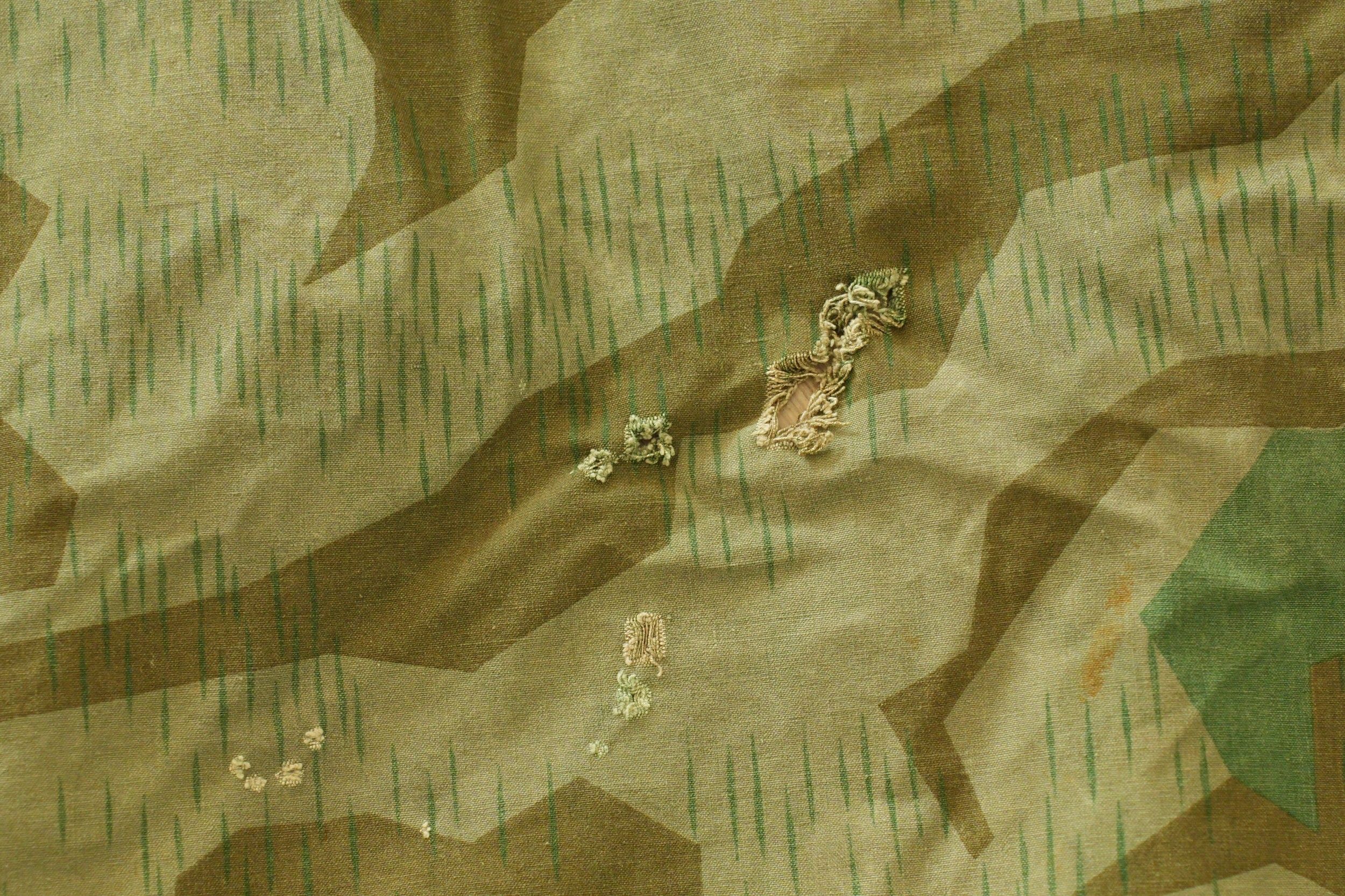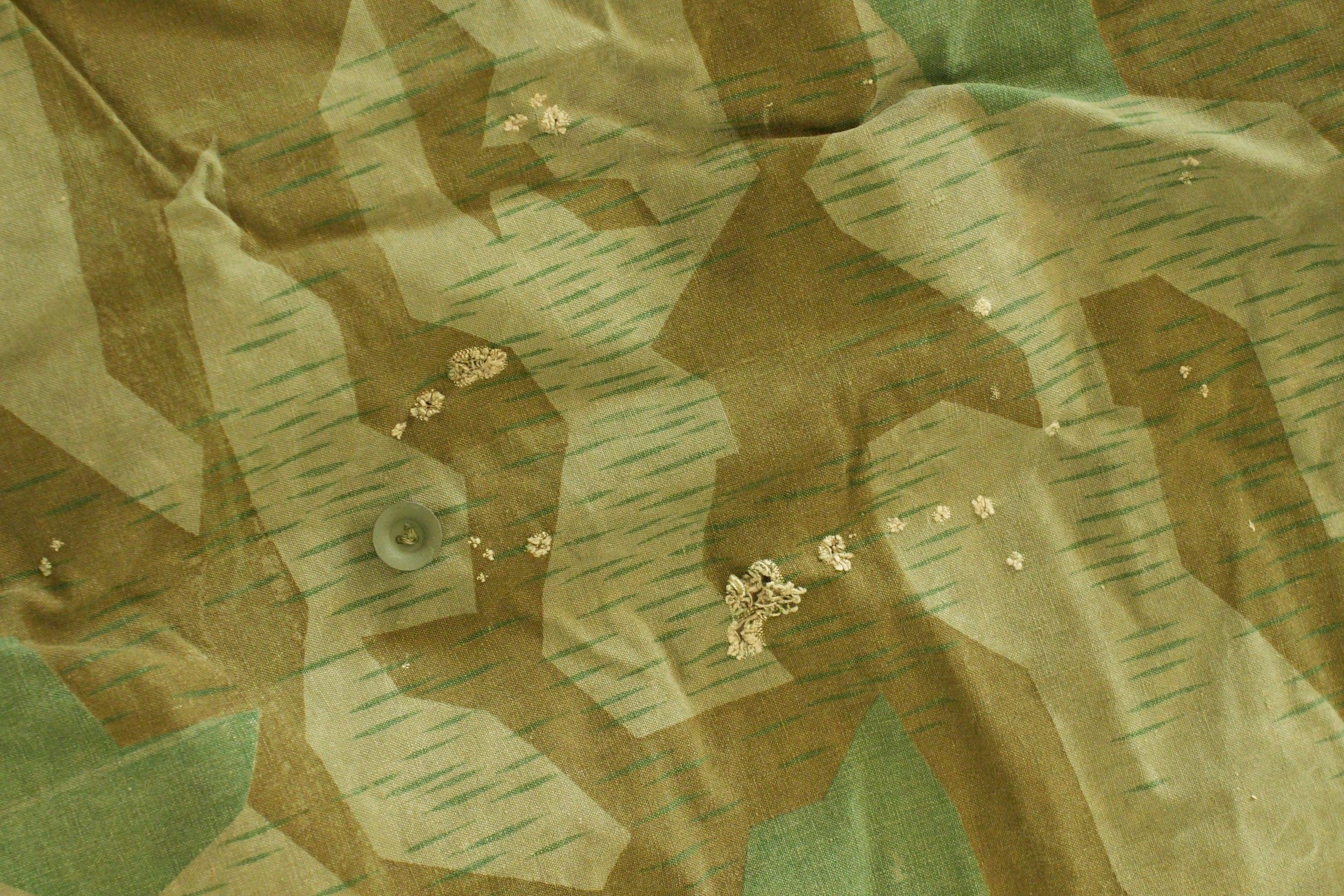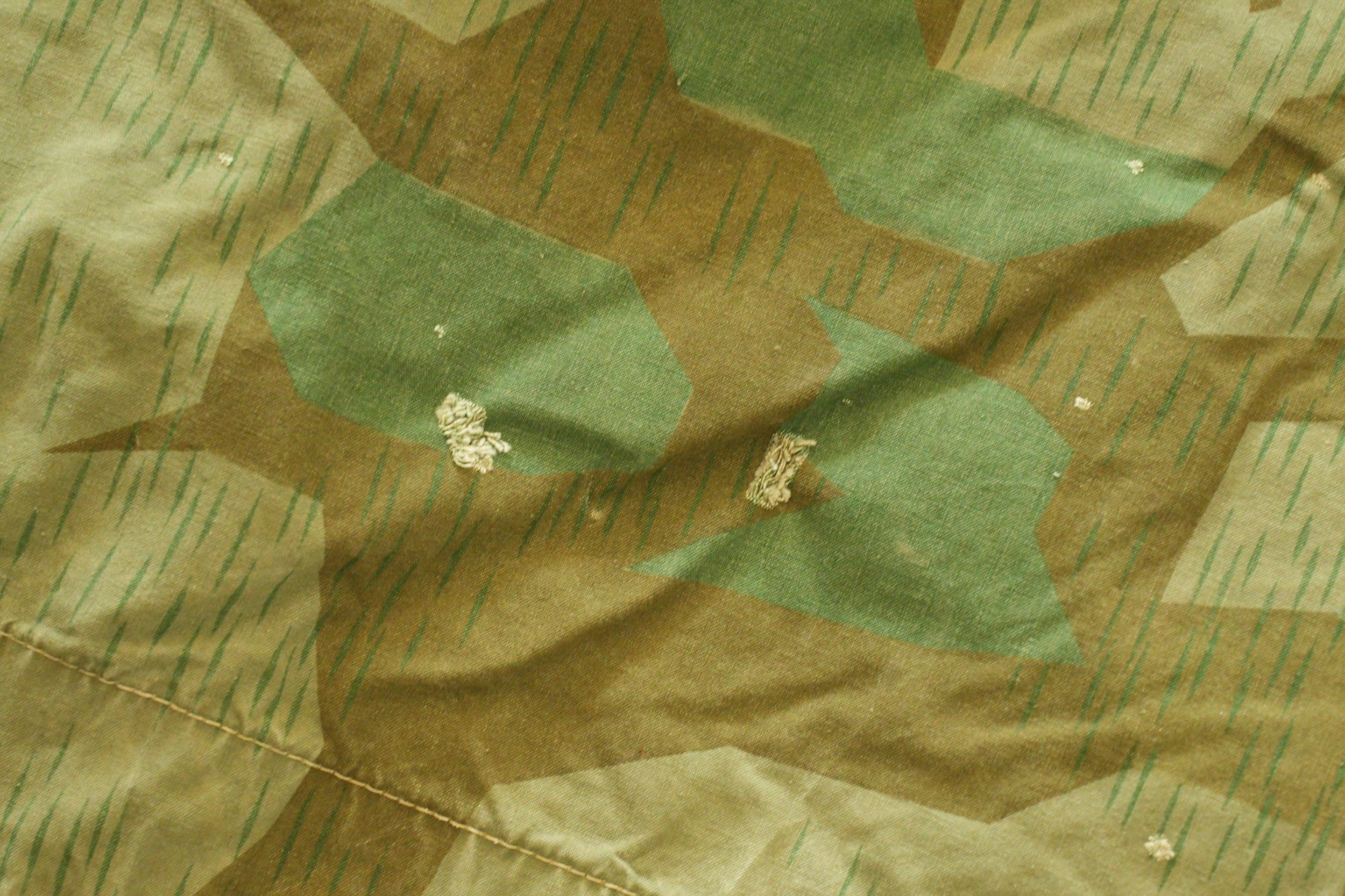 Toile de tente allemande. En tissu camouflé éclat. La majorité des boutons sont présents, ainsi que quelques cordelettes. Marquages présents mais illisibles. A noter une certaine usure et patine de la pièce, ainsi que quelques tâches et accrocs. Etat II+. German tent section. Made of splinter camouflage fabric. Most buttons present, as well as some original tie cords. Markings present but illegible. Shows wear, patina, stains, and small tears. Condition II+.