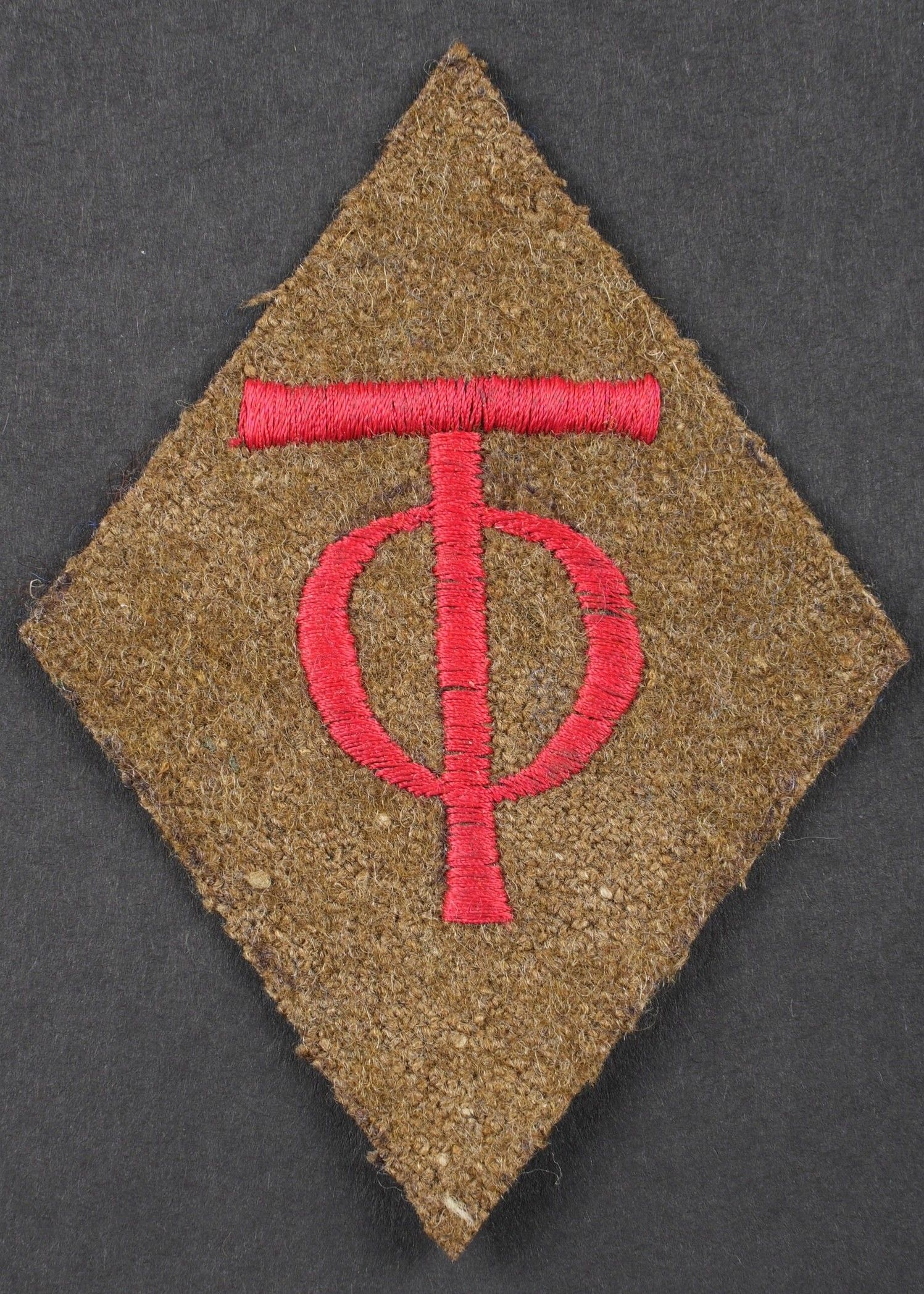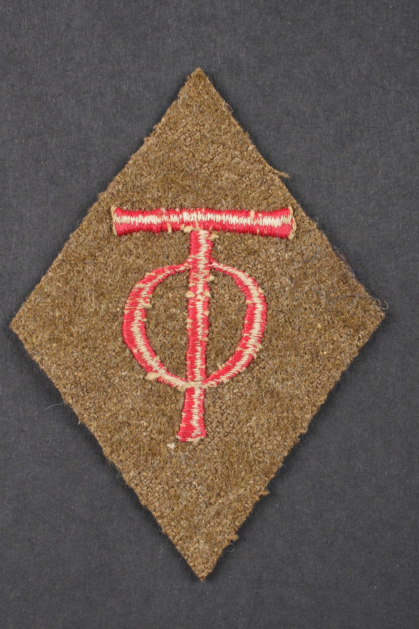 Insigne de l'organisation Todt. Modèle pour manche, en drap marron, logo de l'organisation Todt brodé en fil rouge. Insigne visiblement décousu d'une vareuse. A noter une légère usure et patine de la pièce. Etat I-. Organisation Todt sleeve insignia. Brown wool patch featuring the Organisation Todt logo embroidered in red thread. The insignia appears to have been removed from a tunic. Shows light wear and patina. Condition I–.