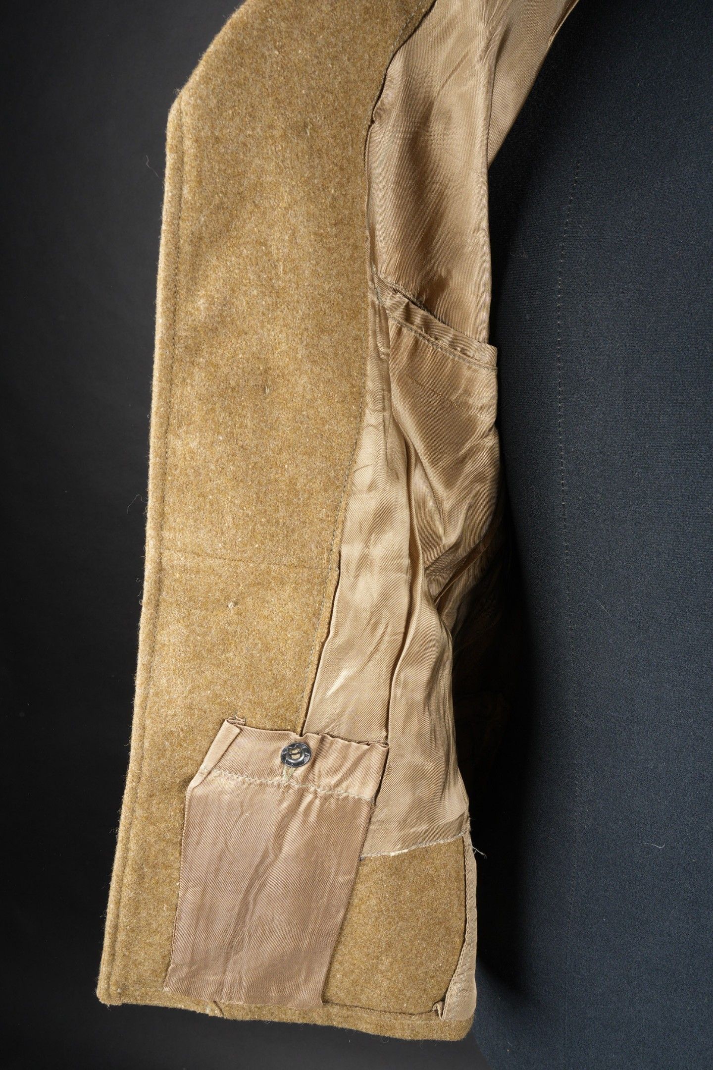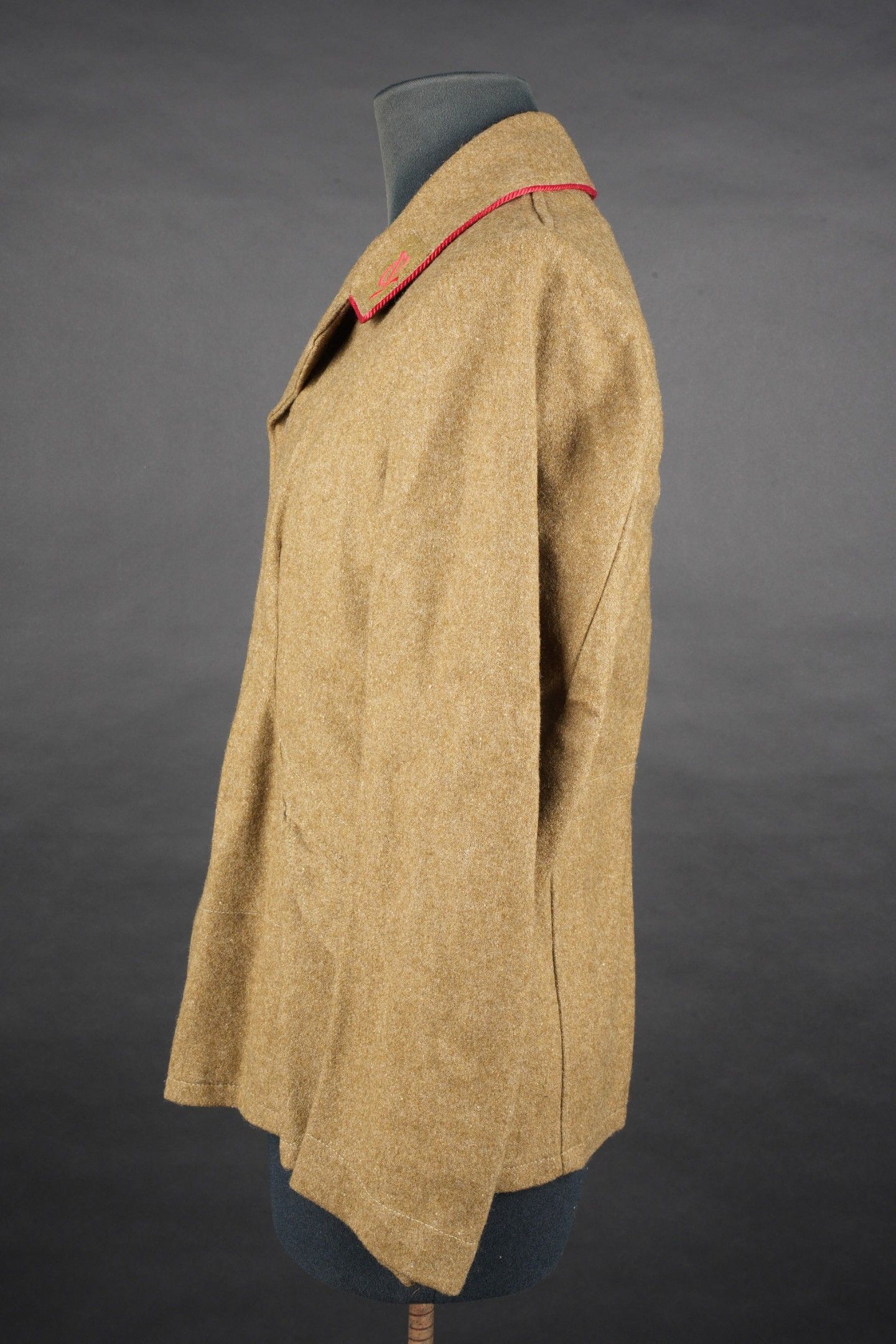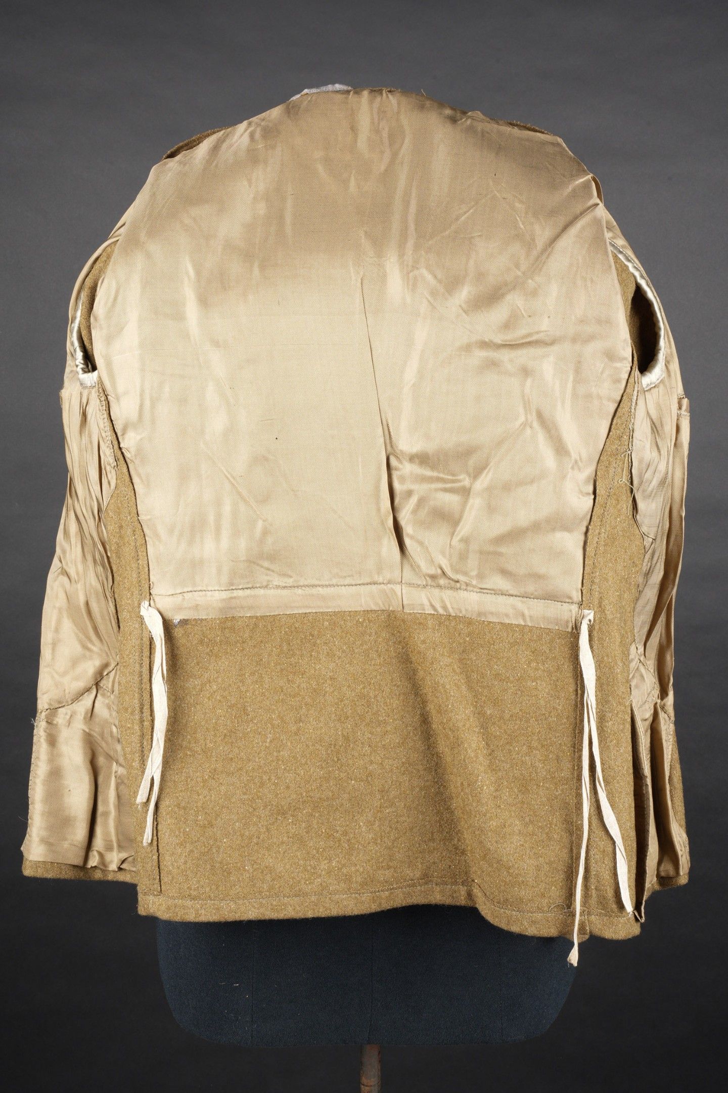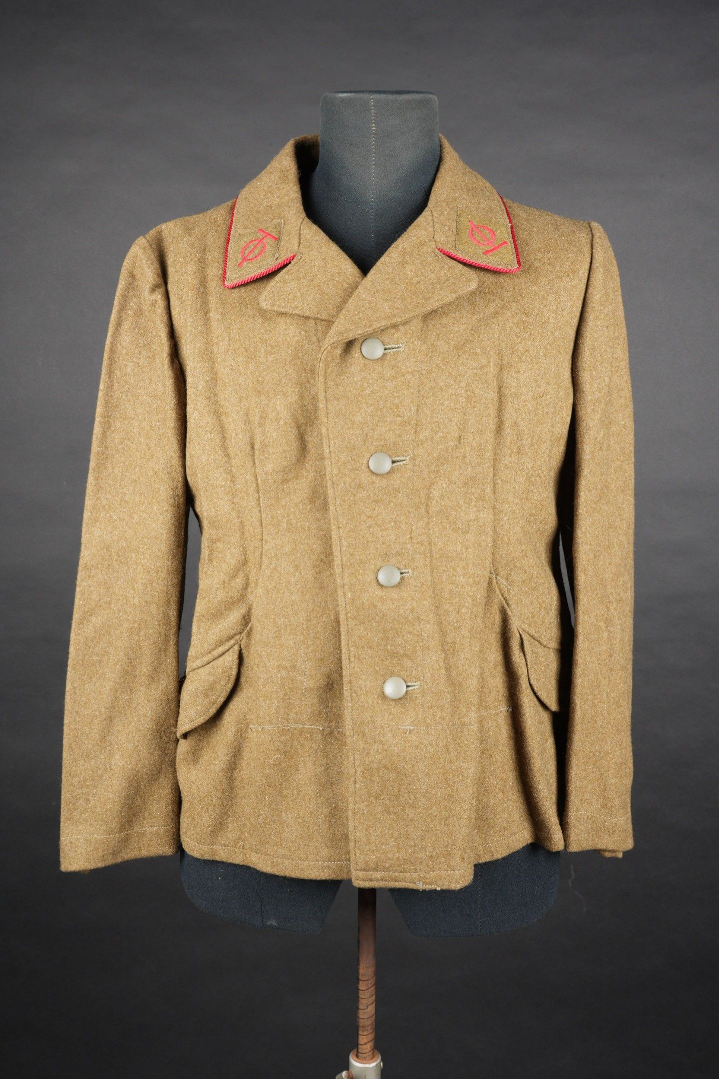 Vareuse du personnel féminin de l'Organisation Todt. En drap marron. Tous les boutons sont présents, et majoritairement en couleur d'origine. Liseré rouge faisant le tour du col. Insignes de l'organisation Todt cousu main au niveau du col. Un insigne est même monté à l'envers. Intérieur doublé en satinette marron. Le cordon de serrage à la taille est présent. Marquage Org Todt, E Reitz 25. A noter une légère usure et patine de la pièce. Etat I-. Organisation Todt women’s tunic. Brown wool. All buttons present and mostly retaining original color. Red piping around the collar. Hand-sewn Organisation Todt collar tabs, one applied upside down. Brown satinette lining with adjustable waist cord. Marked Org Todt E. Reitz 25. Shows light wear and patina. Condition I–.