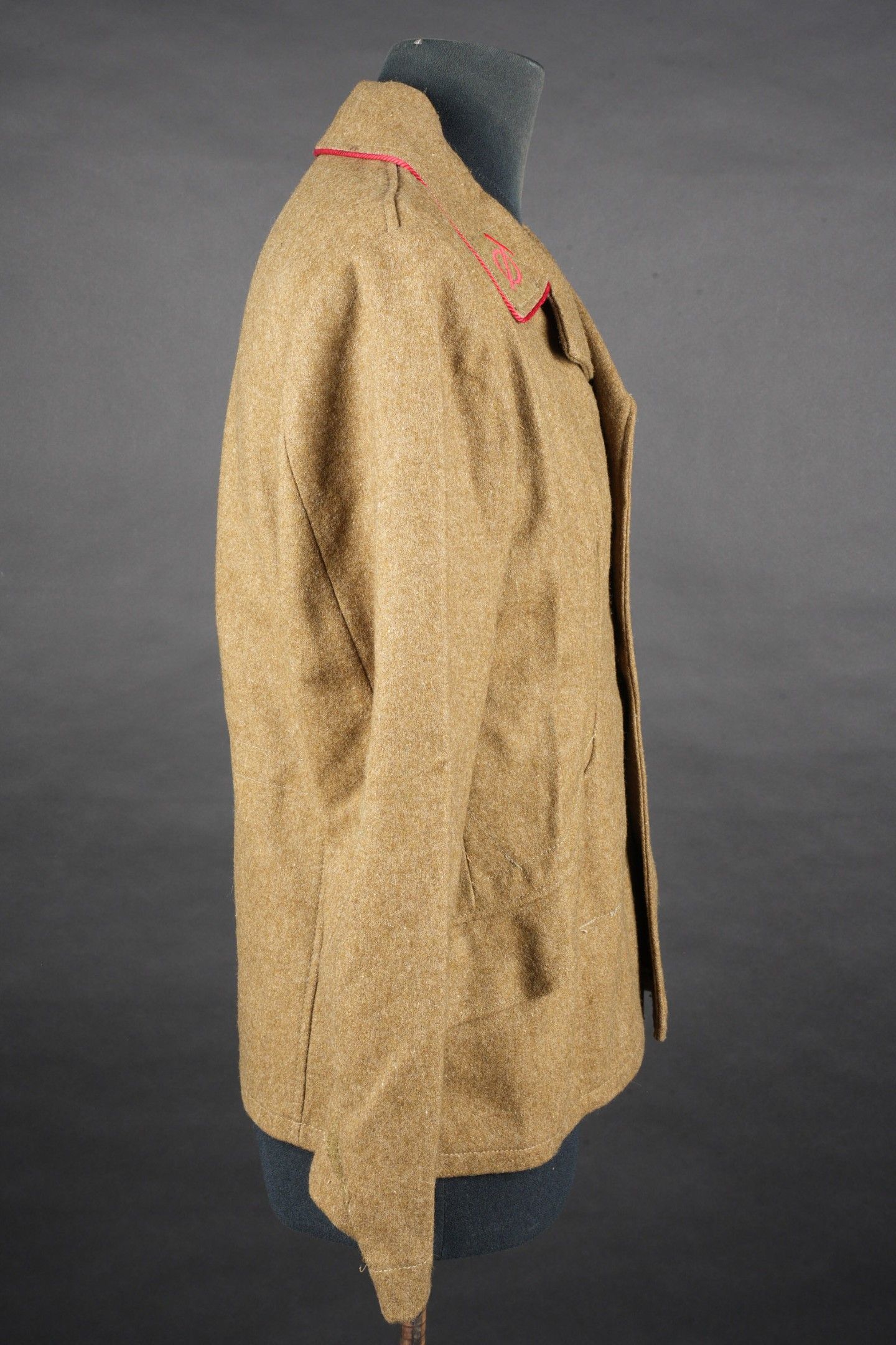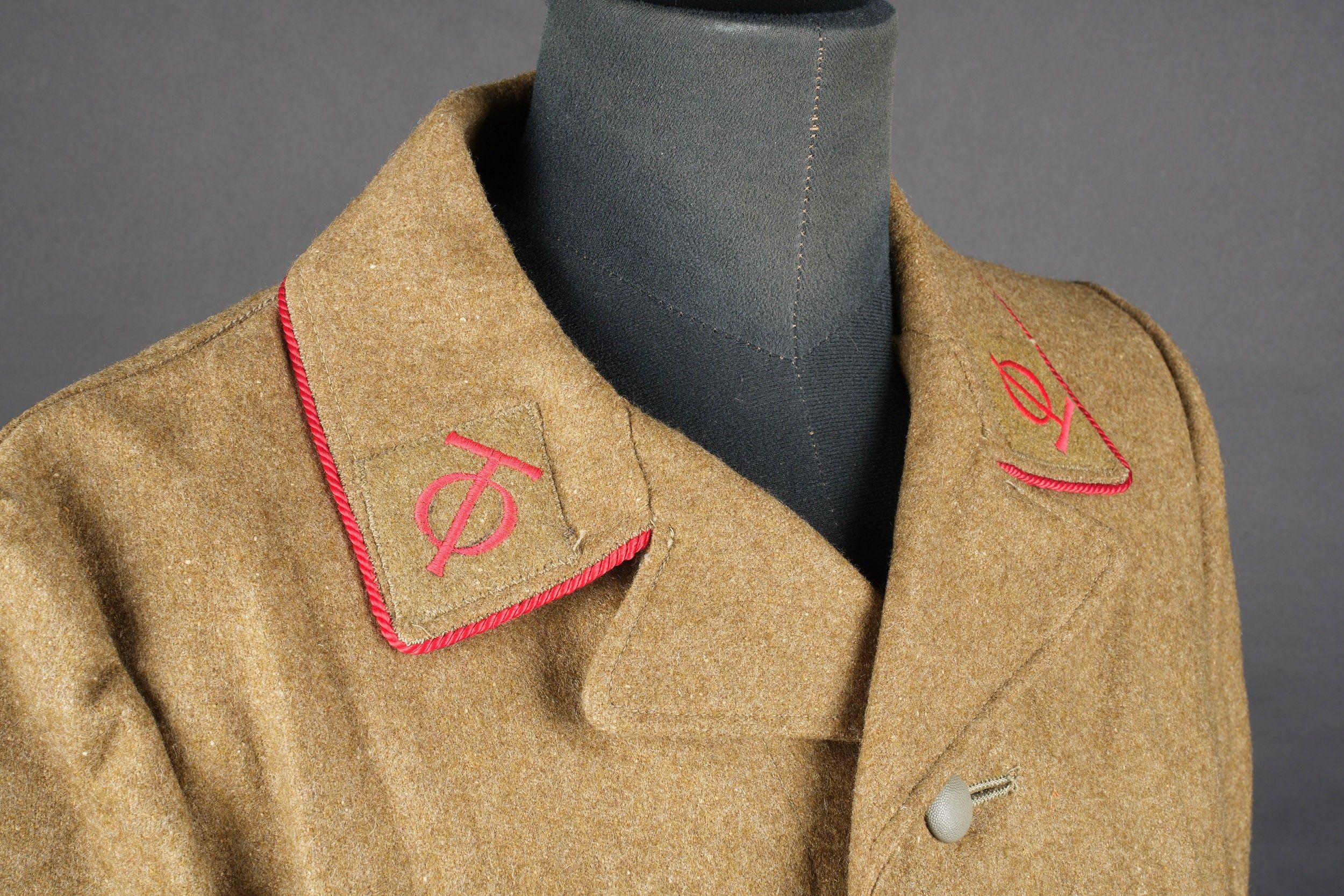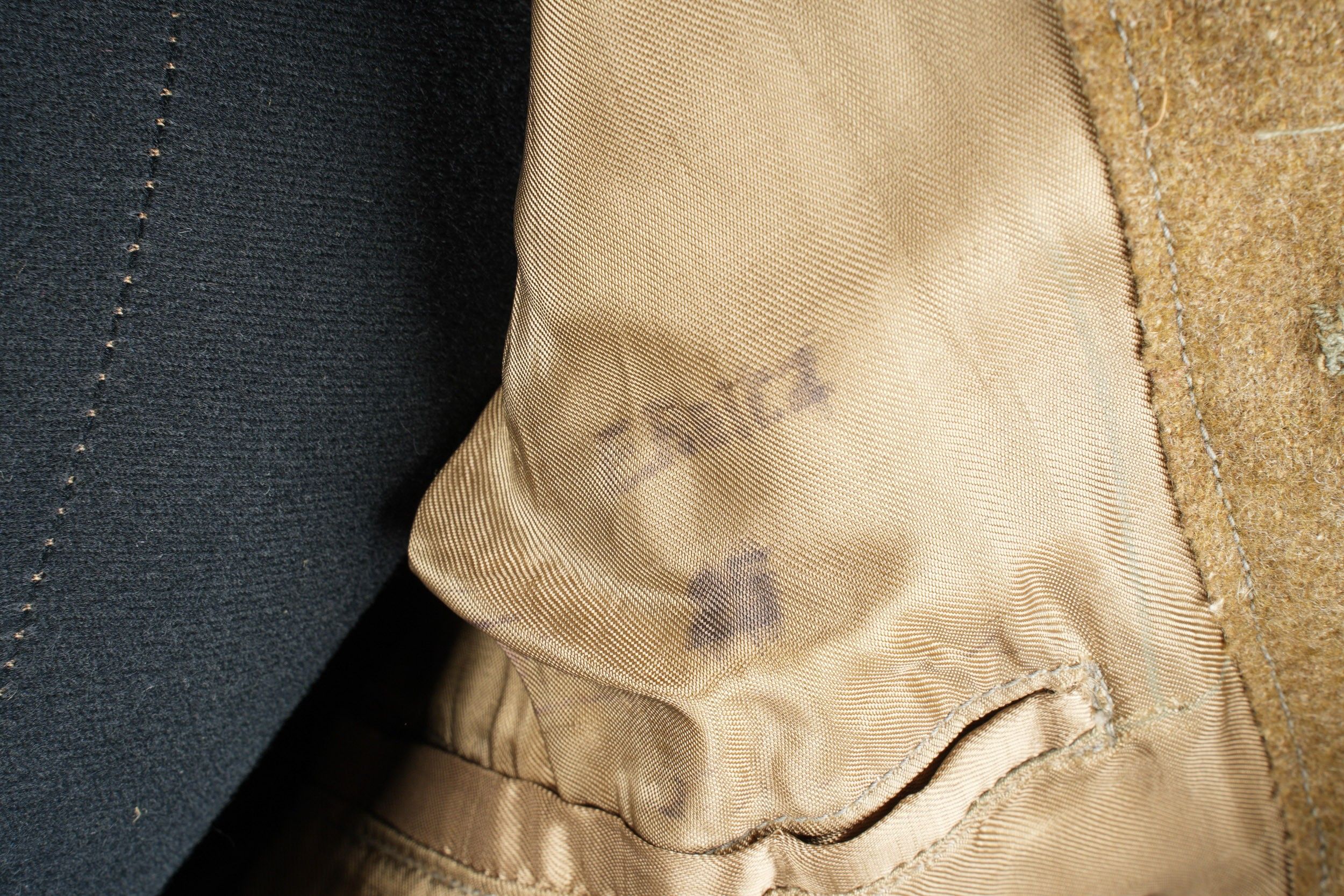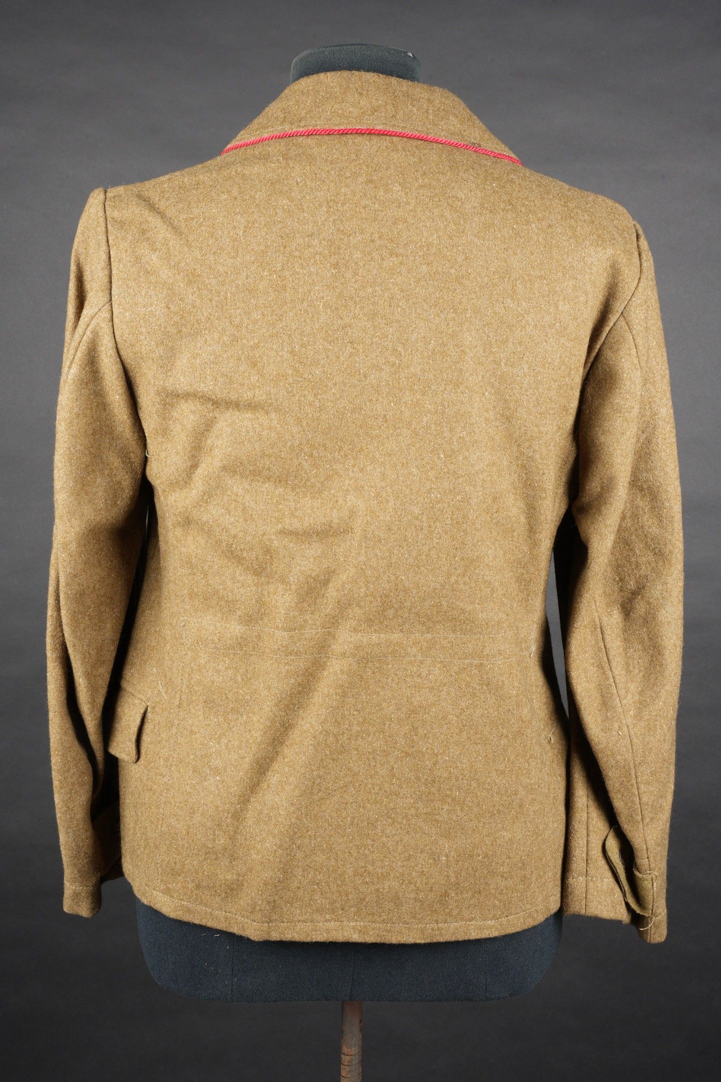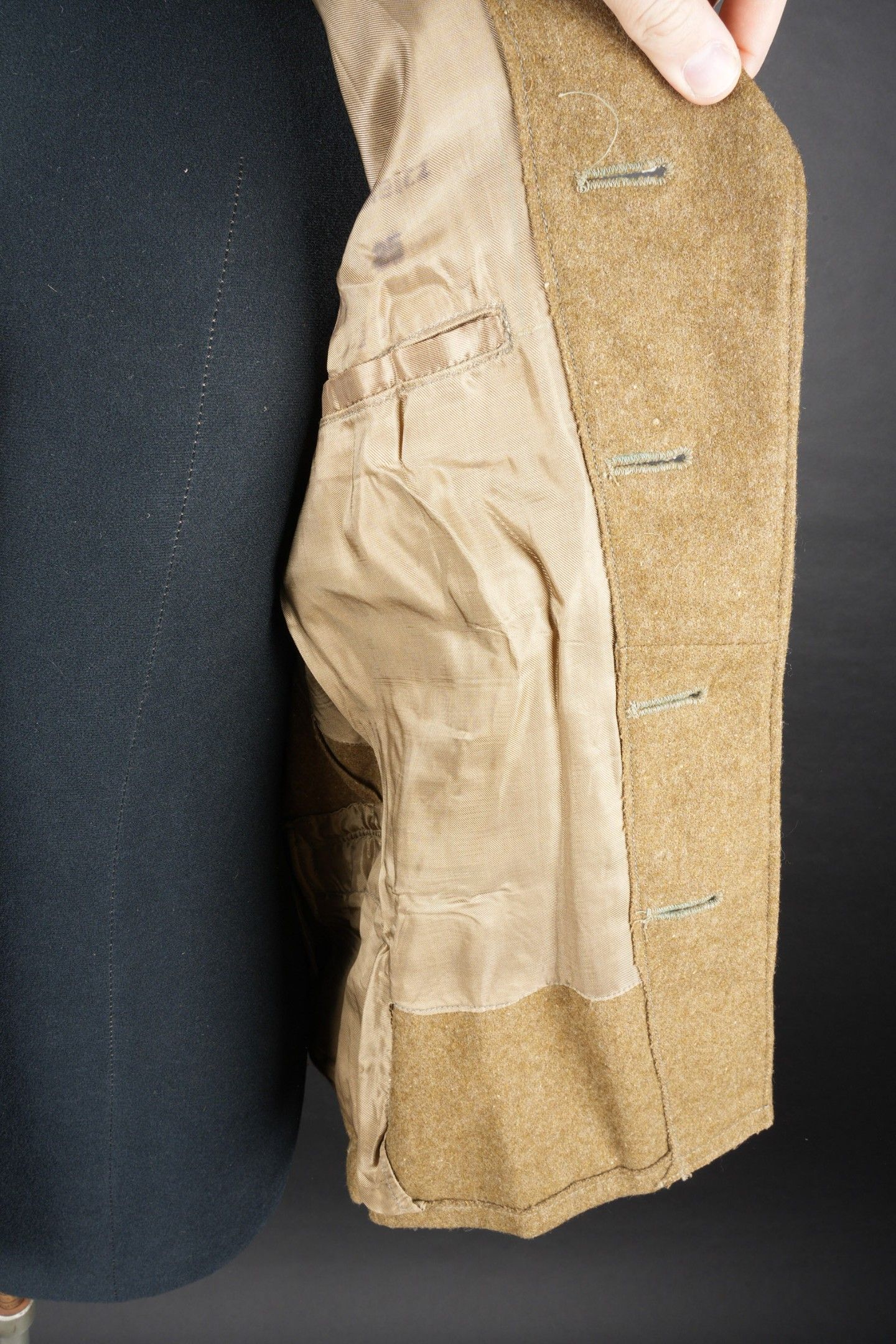 Vareuse du personnel féminin de l'Organisation Todt. En drap marron. Tous les boutons sont présents, et majoritairement en couleur d'origine. Liseré rouge faisant le tour du col. Insignes de l'organisation Todt cousu main au niveau du col. Un insigne est même monté à l'envers. Intérieur doublé en satinette marron. Le cordon de serrage à la taille est présent. Marquage Org Todt, E Reitz 25. A noter une légère usure et patine de la pièce. Etat I-. Organisation Todt women’s tunic. Brown wool. All buttons present and mostly retaining original color. Red piping around the collar. Hand-sewn Organisation Todt collar tabs, one applied upside down. Brown satinette lining with adjustable waist cord. Marked Org Todt E. Reitz 25. Shows light wear and patina. Condition I–.