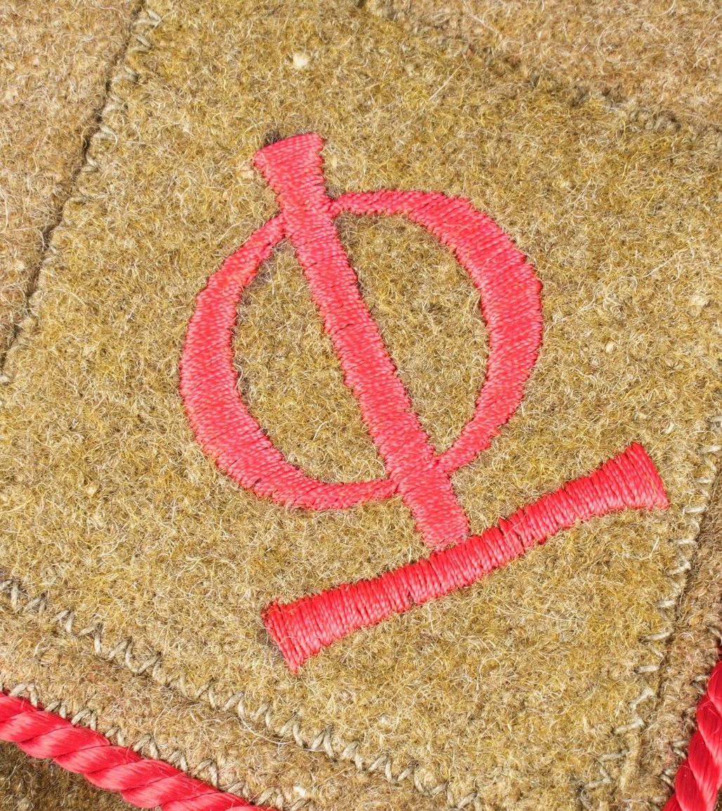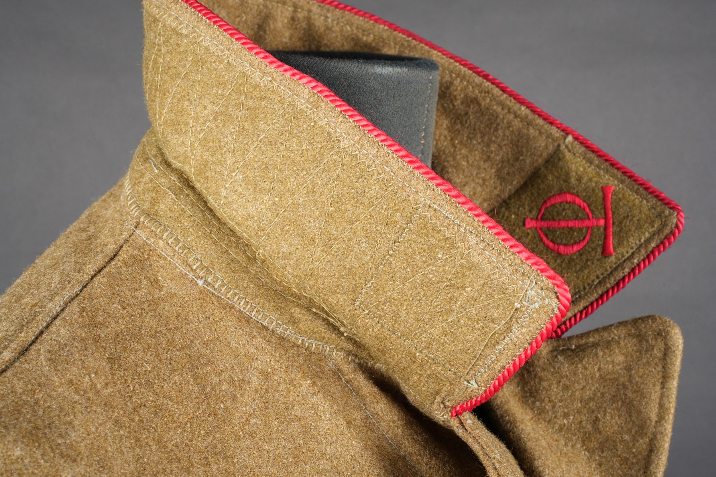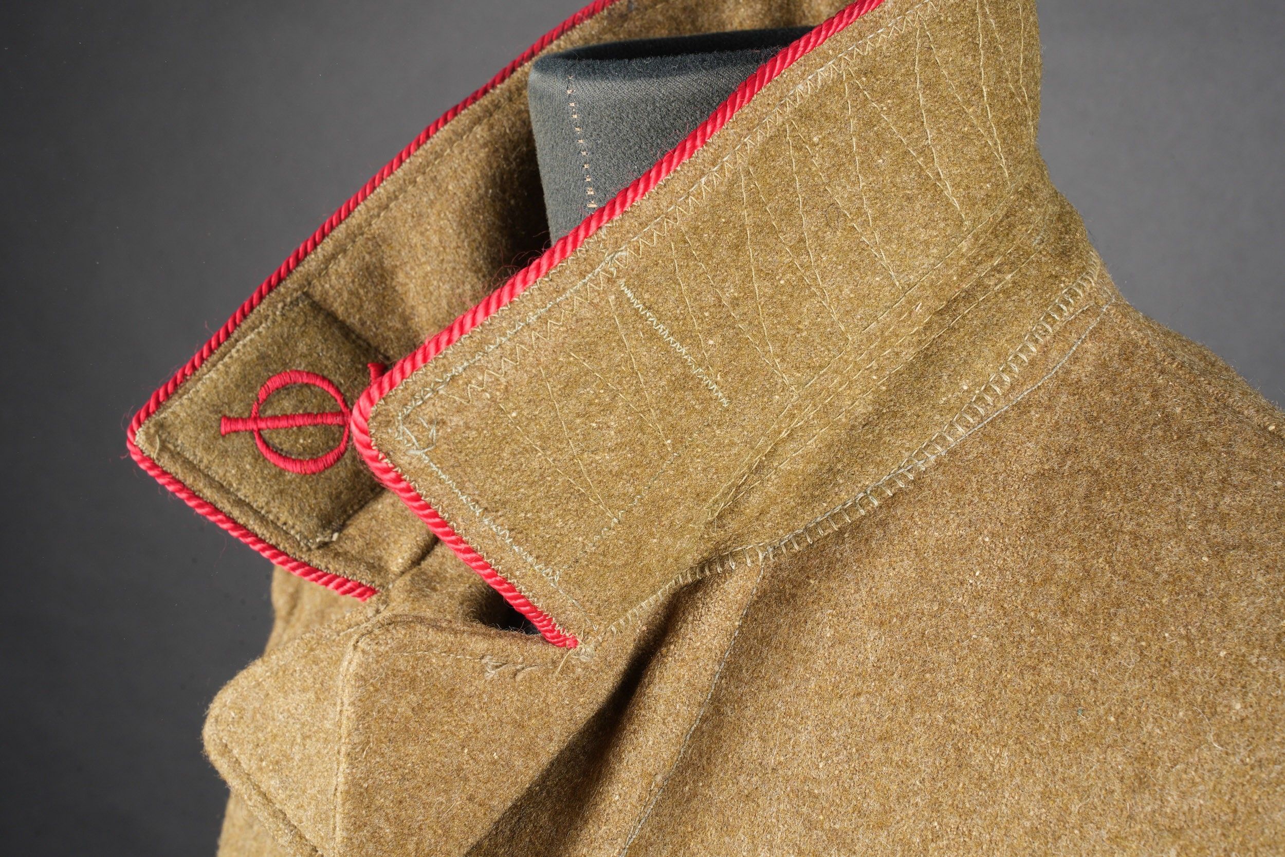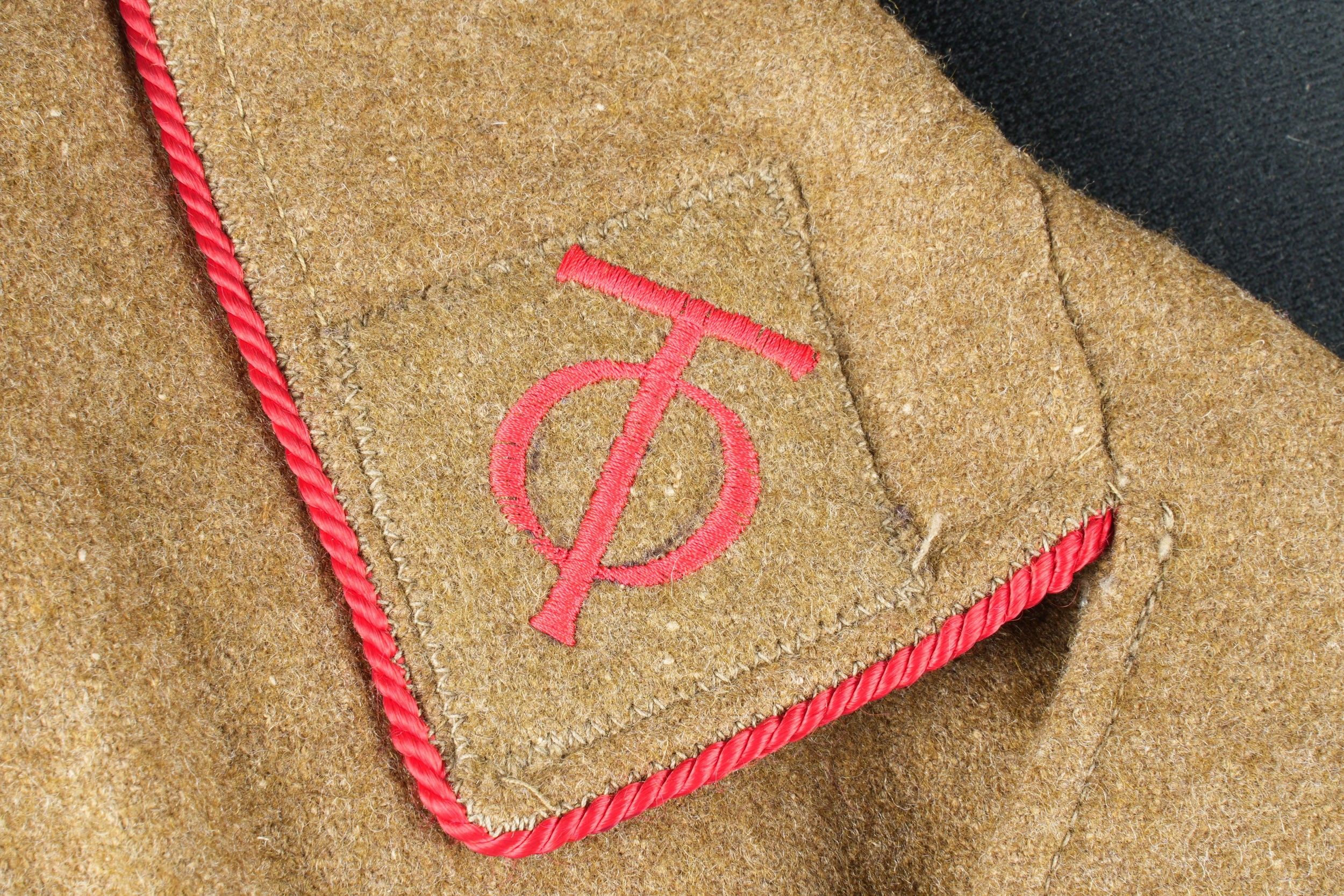 Vareuse du personnel féminin de l'Organisation Todt. En drap marron. Tous les boutons sont présents, et majoritairement en couleur d'origine. Liseré rouge faisant le tour du col. Insignes de l'organisation Todt cousu main au niveau du col. Un insigne est même monté à l'envers. Intérieur doublé en satinette marron. Le cordon de serrage à la taille est présent. Marquage Org Todt, E Reitz 25. A noter une légère usure et patine de la pièce. Etat I-. Organisation Todt women’s tunic. Brown wool. All buttons present and mostly retaining original color. Red piping around the collar. Hand-sewn Organisation Todt collar tabs, one applied upside down. Brown satinette lining with adjustable waist cord. Marked Org Todt E. Reitz 25. Shows light wear and patina. Condition I–.