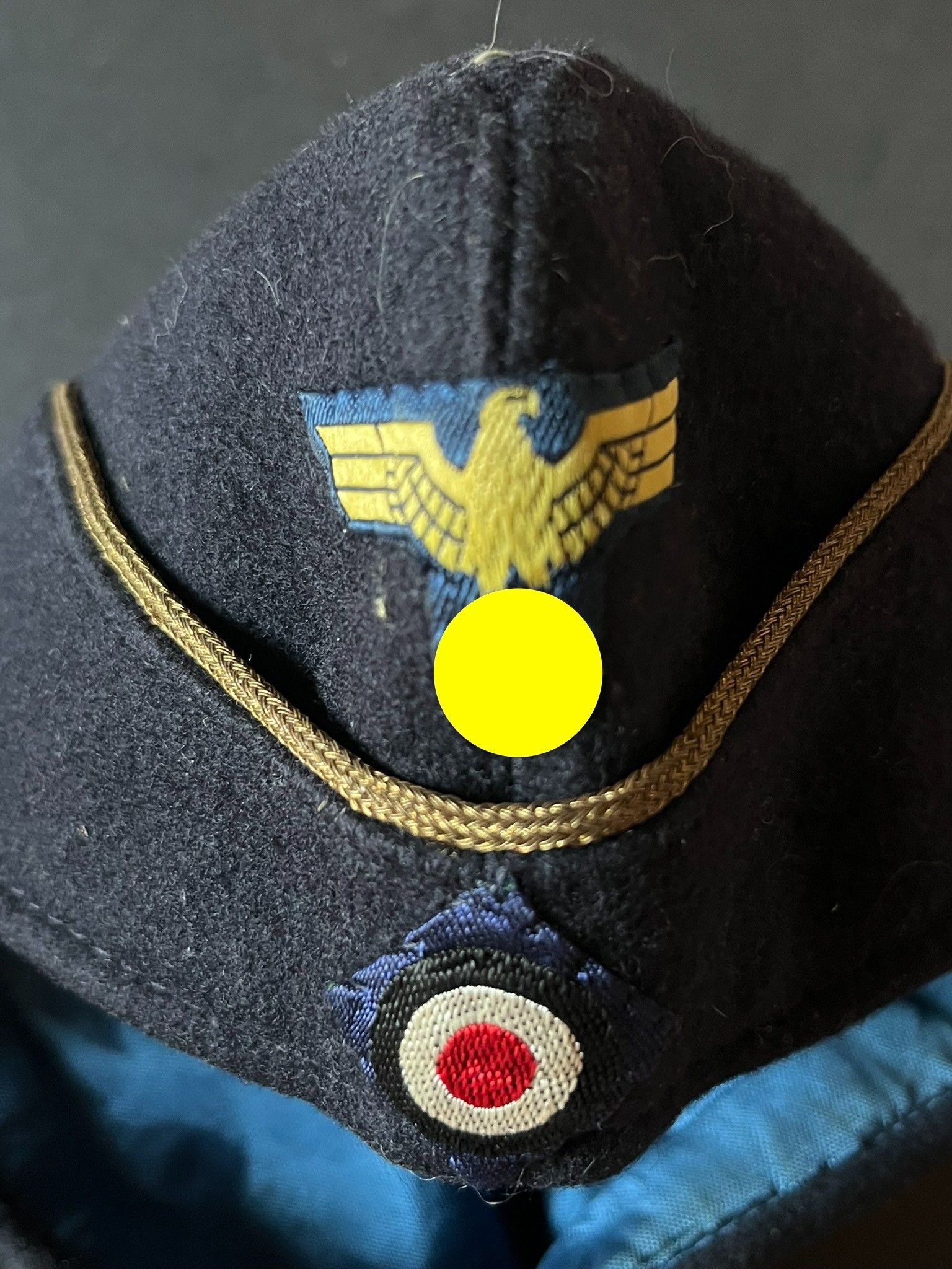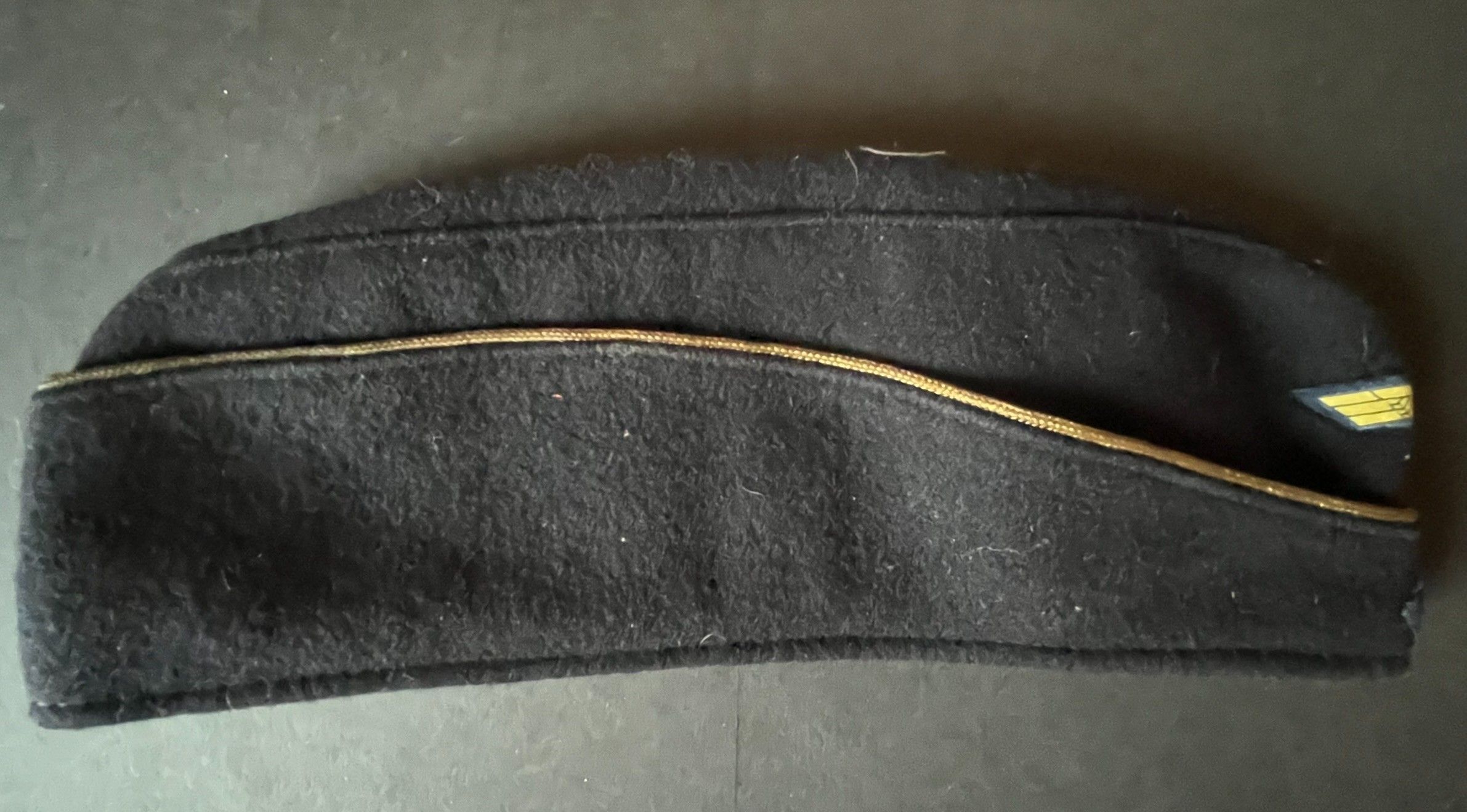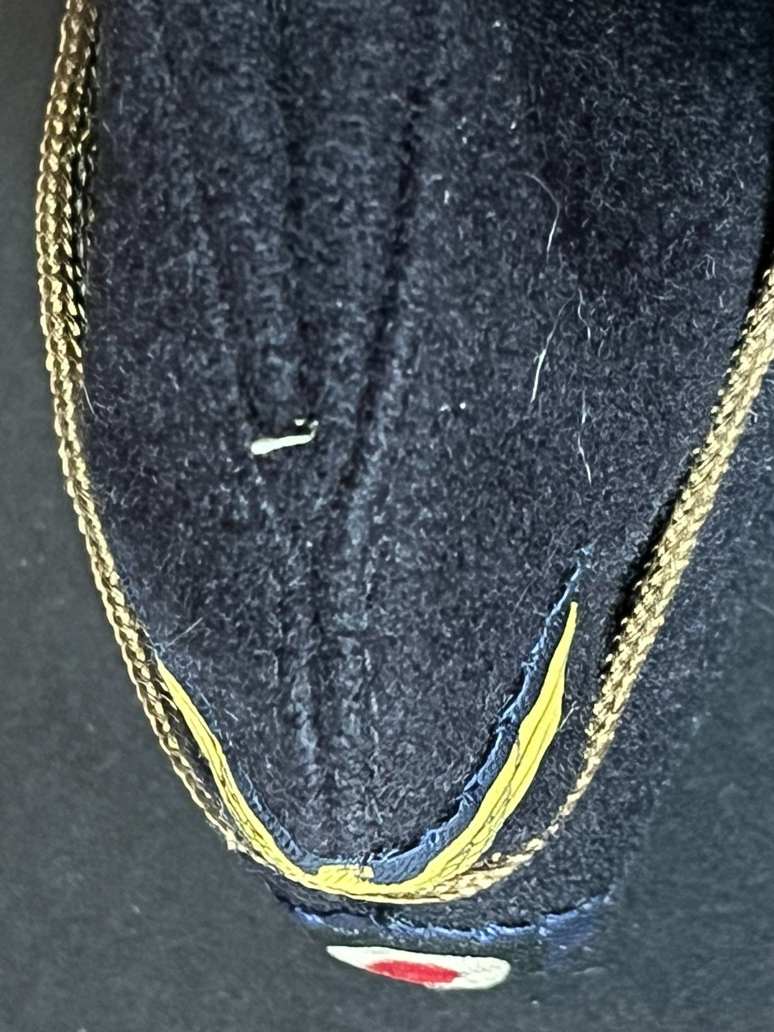 Calot de tenue de service d'officier de la marine de guerre Kriegsmarine en drap avec soutache dorée et doublure en satinette bleue complet avec ses insignes brodés en coton Taille environ 58. Kriegsmarine officer’s service cap. Dark blue wool with gold soutache and blue satin lining, complete with embroidered cotton insignia. Approx. size 58.