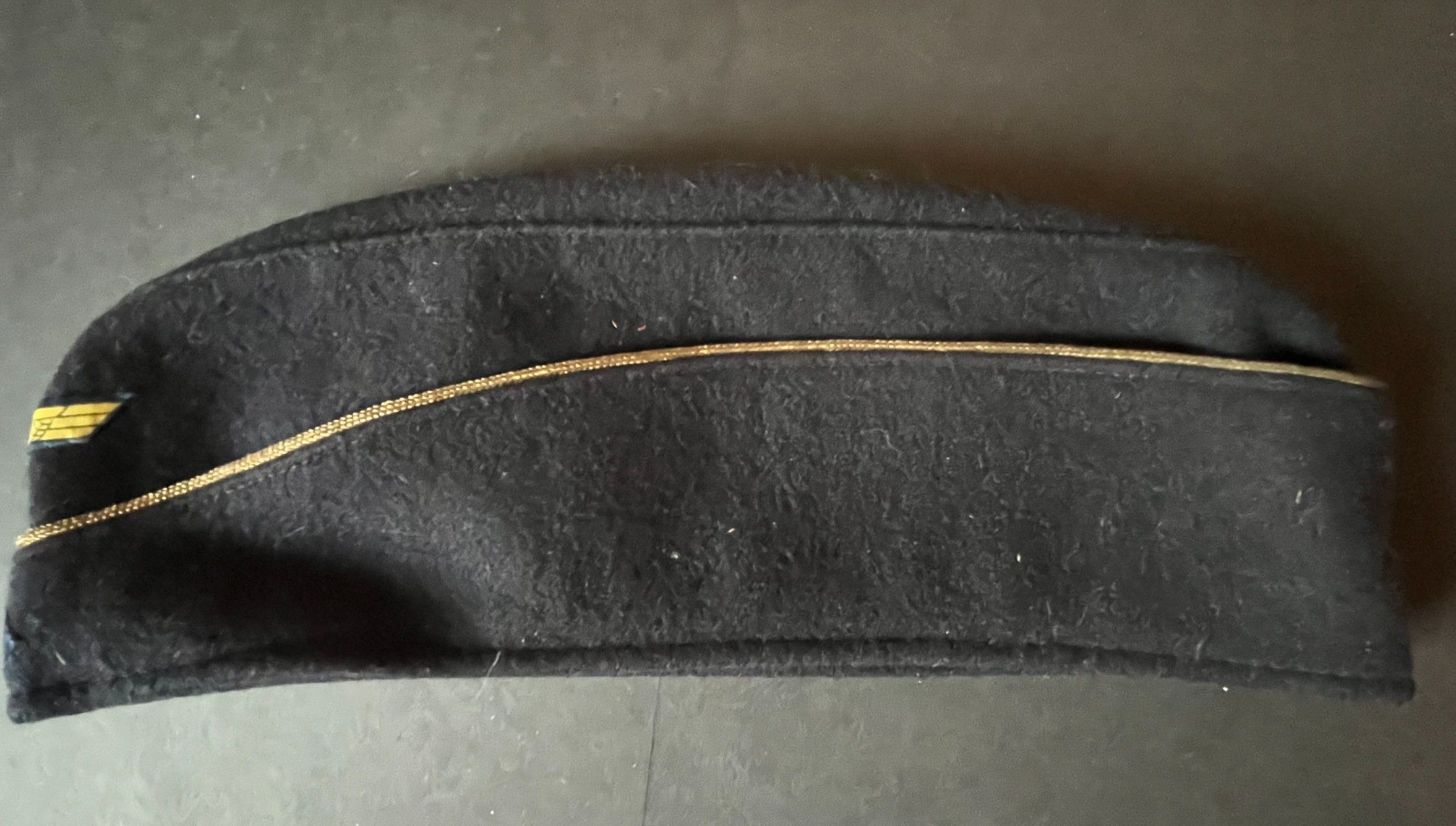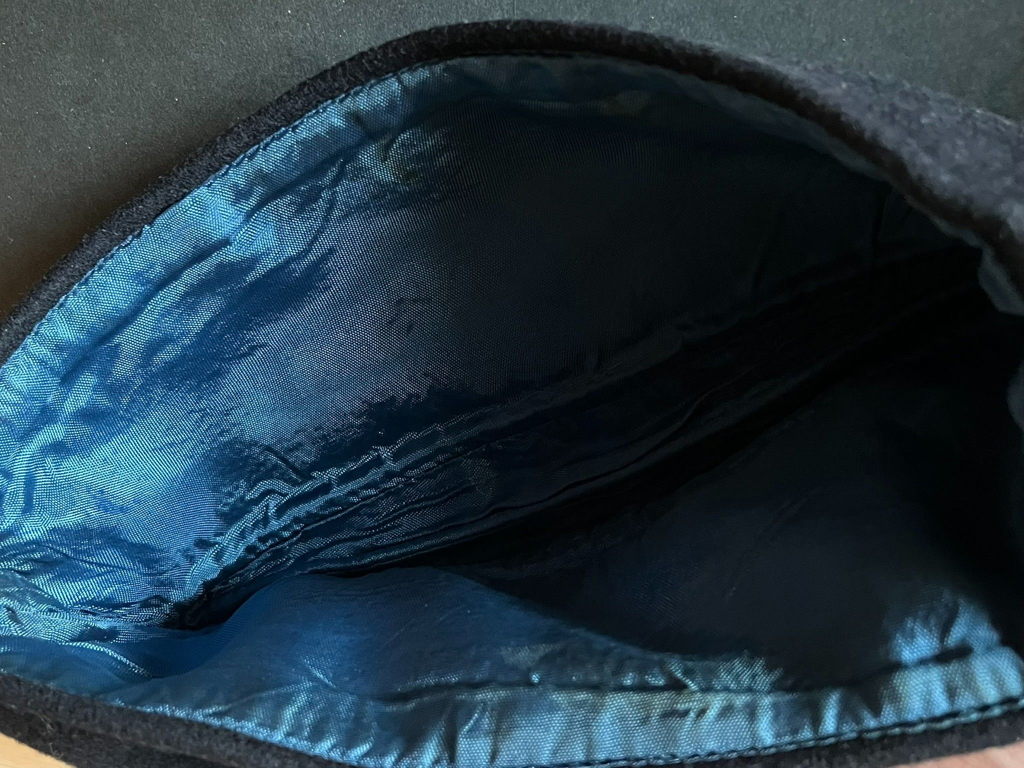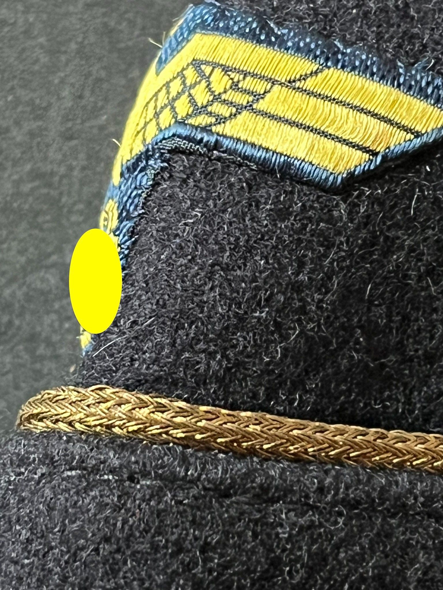 Calot de tenue de service d'officier de la marine de guerre Kriegsmarine en drap avec soutache dorée et doublure en satinette bleue complet avec ses insignes brodés en coton Taille environ 58. Kriegsmarine officer’s service cap. Dark blue wool with gold soutache and blue satin lining, complete with embroidered cotton insignia. Approx. size 58.