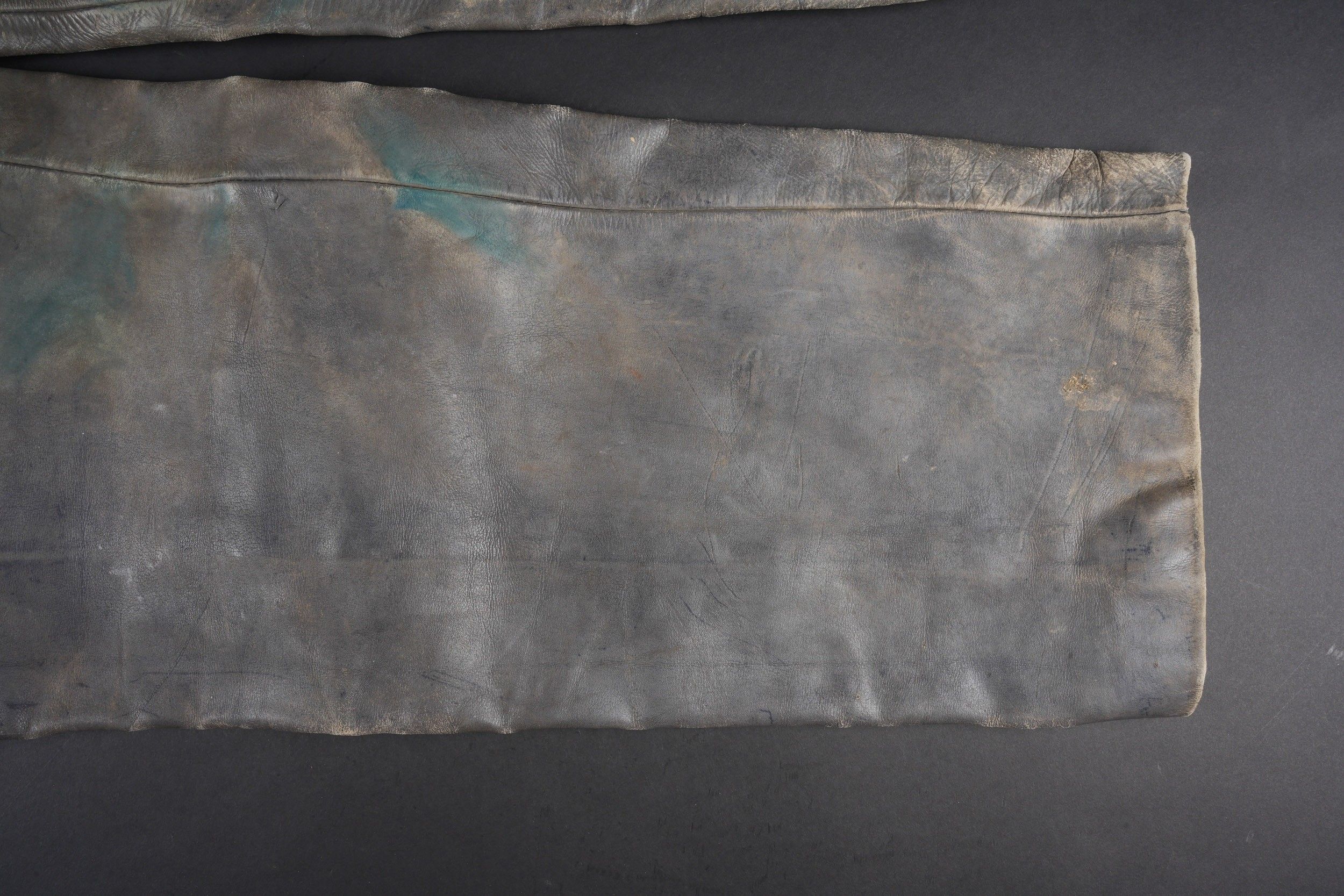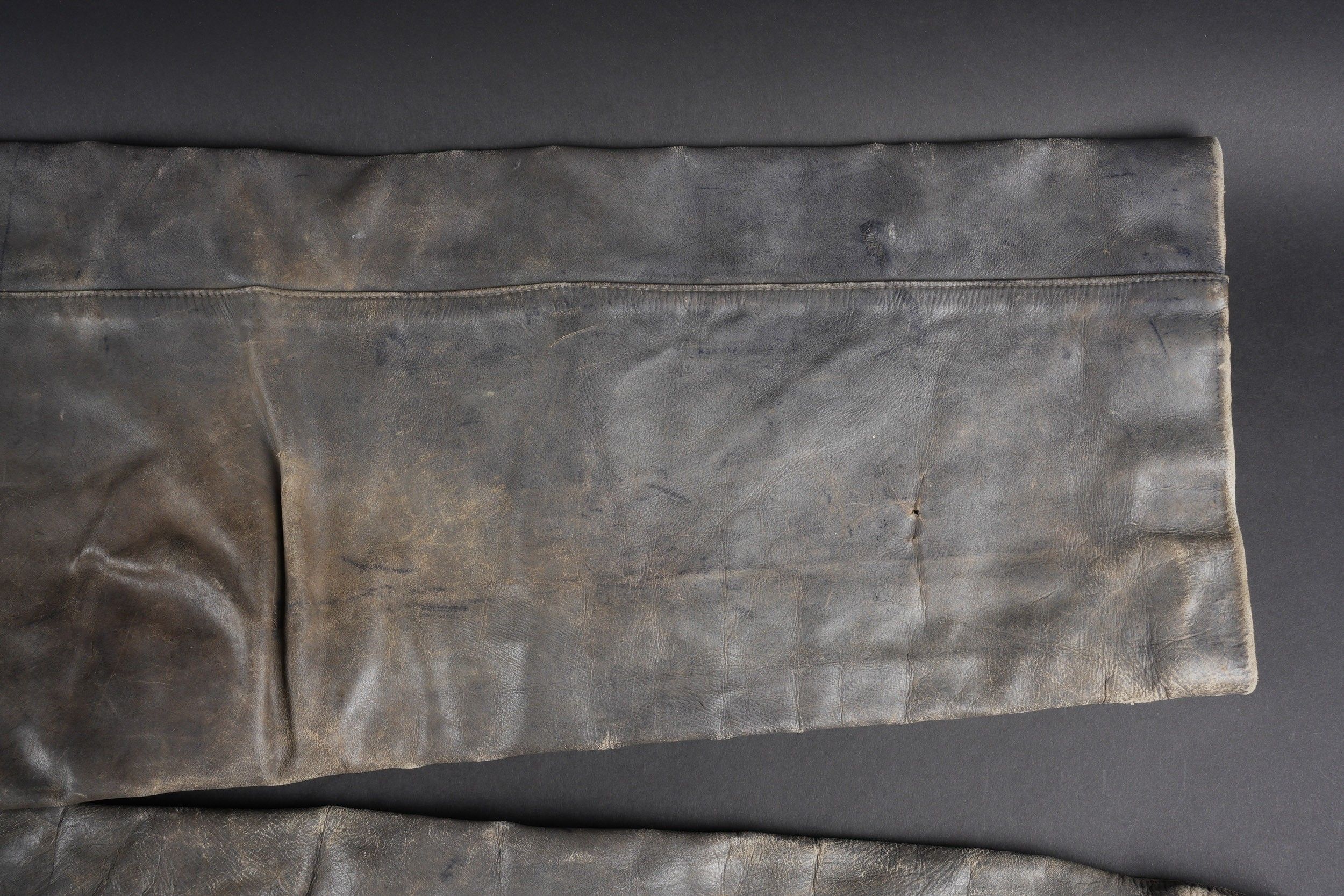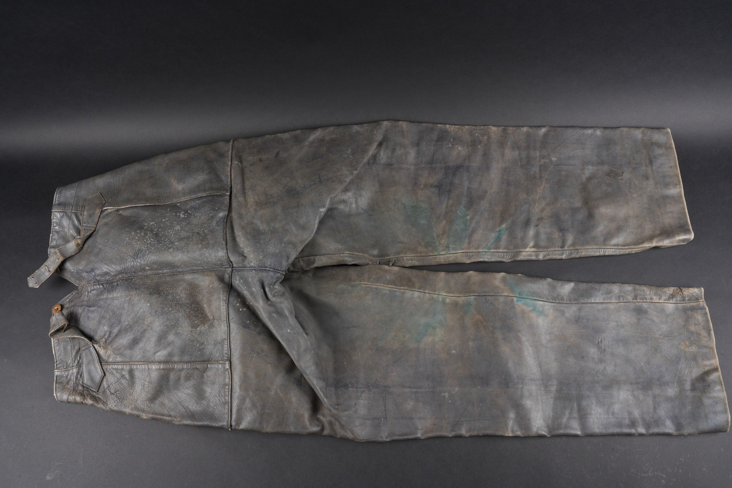 Pantalon en cuir de la Kriegsmarine. En cuir noir. Usé. Tous les boutons sont présents. Martingale complète. Intérieur doublé en tissu coton gris. Sans marquages visibles. A noter une certaine usure et patine de la pièce. Etat II+. Kriegsmarine leather trousers. Black leather, worn. All buttons present, martingale intact, grey cotton lining. No visible markings. Some wear and patina. Condition II+