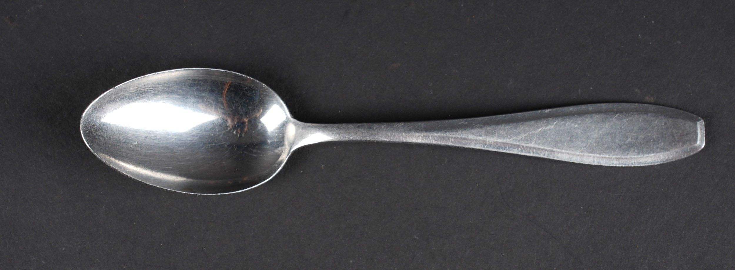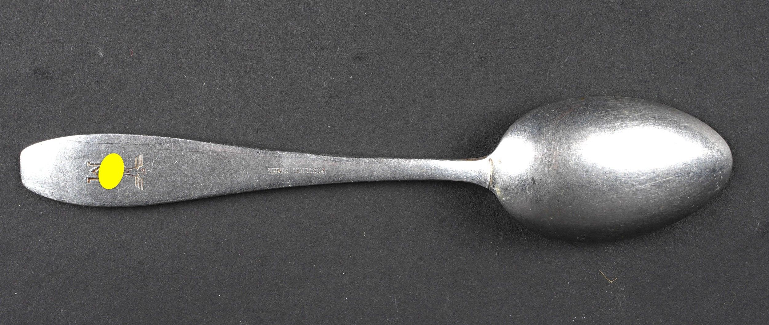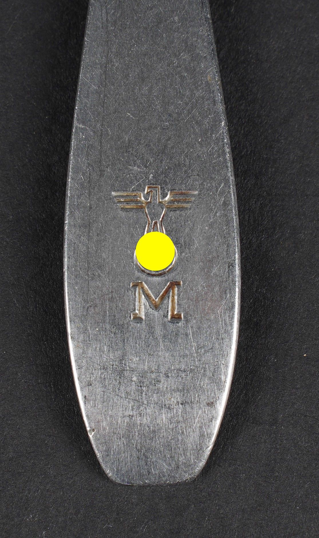 Petite cuillère de la Kriegsmarine. En métal, beau marquage de la Kriegsmarine. A noter une certaine usure et patine de la pièce. Etat II+. Kriegsmarine teaspoon. Metal construction with clear Kriegsmarine marking. Some wear and patina. Condition II+.