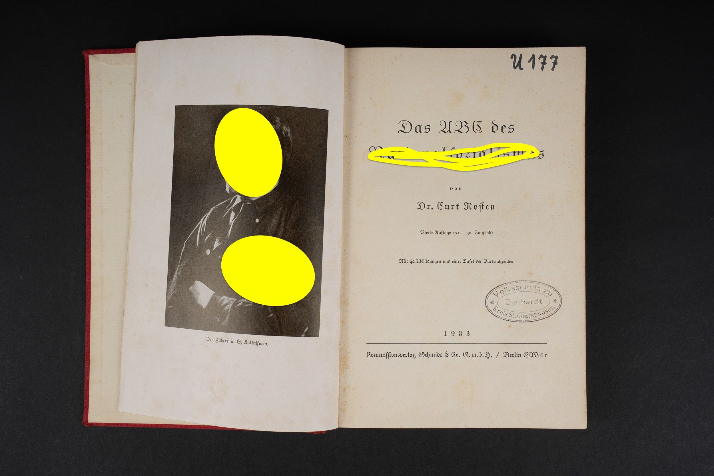 Livre ABC des Nationalsozialismus. Belle couverture en toile rouge avec l'insigne national allemand. Mention ABS des Nationalsozialismus en gothique. Marquages U177 sur la tranche. Daté 1933. Tampon Volksschule Zu Kreis St Goarshausen. Le marquages U 177 peut correspondre à Le Unterseeboot 177, mis en service le 15 novembre 1942. Affecté à la formation de combat 10. Unterseebootsflottille à Lorient avant de rejoindre le 1er décembre 1942 la 12. Unterseebootsflottille à Bordeaux. Sa troisième patrouille part de la base sous-marine de La Rochelle le 2 janvier 1944 sous les ordres du korvettenkapitän Heinz Buchholz. Après 36 jours en mer, l'U-177 est coulé le 6 février 1944 dans l'océan Atlantique sud, à l'ouest de l'île de l'Ascension, par des charges de profondeur lancées d'un avion américain Consolidated B-24 Liberator de l'escadron VB-107/B-3, alors qu'il se trouve en compagnie de l'U-66 pour se ravitailler. 50 membres d'équipage sur les 65 meurent dans cette attaque. L'U-66 parvient à s'échapper. A noter une certaine usure et patine de la pièce. Etat II+. Book ABC des Nationalsozialismus. Attractive red cloth cover with the German national emblem and Gothic title ABS des Nationalsozialismus. Marked U177 on the spine. Dated 1933. Stamped Volksschule Zu Kreis St. Goarshausen.”The U177 marking may correspond to the submarine U-177, commissioned on 15 November 1942, assigned first to the 10th U-boat Flotilla at Lorient, then to the 12th Flotilla at Bordeaux from 1 December 1942. Its third patrol departed from the La Rochelle submarine base on 2 January 1944 under the command of Korvettenkapitän Heinz Buchholz. After 36 days at sea, U-177 was sunk on 6 February 1944 in the South Atlantic, west of Ascension Island, by depth charges from a U.S. Consolidated B-24 Liberator of Squadron VB-107/B-3, while refueling alongside U-66. Fifty of the sixty-five crew members were killed in the attack. U-66 managed to escape. Some wear and patina on the piece. Condition II+.