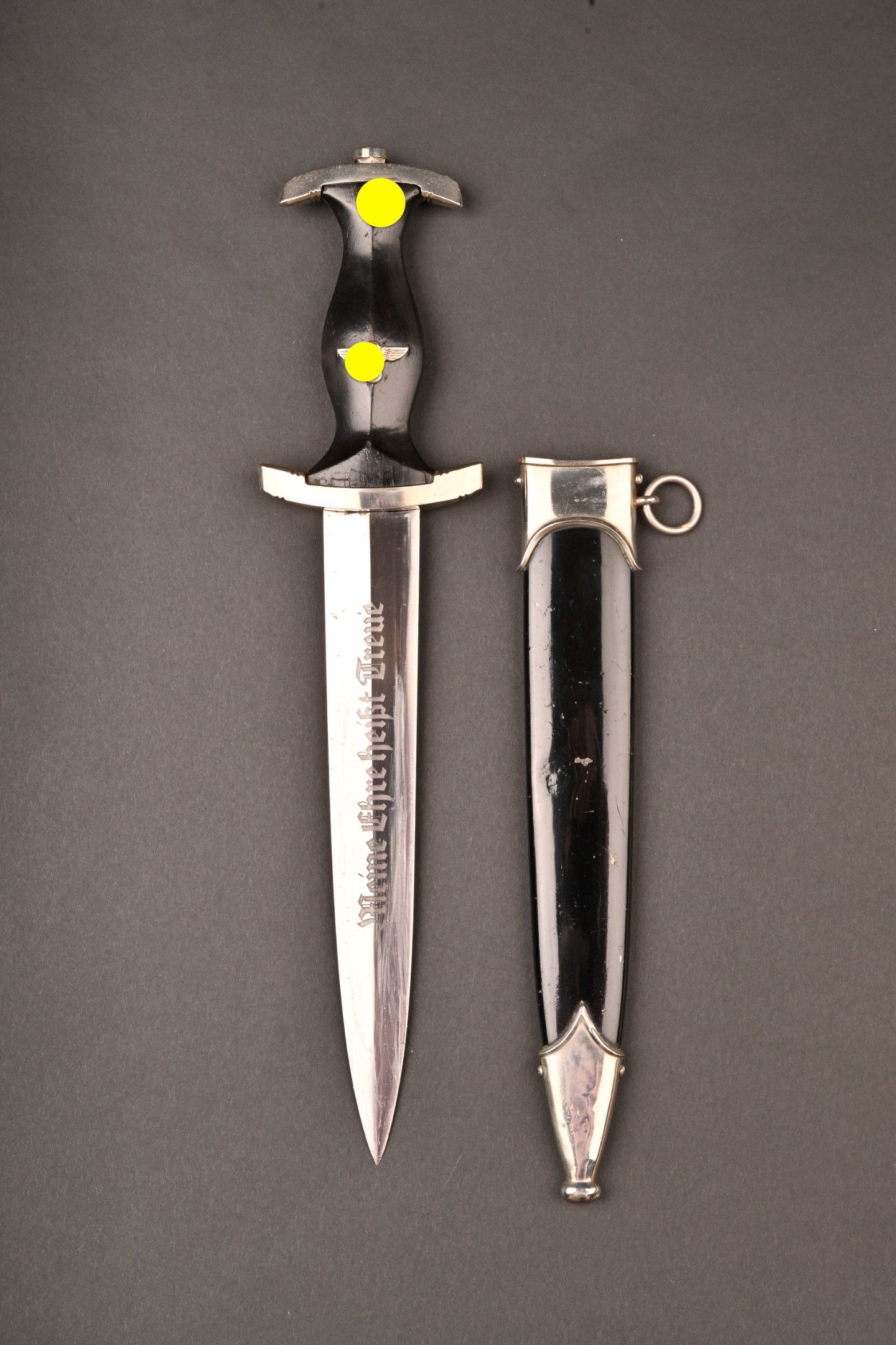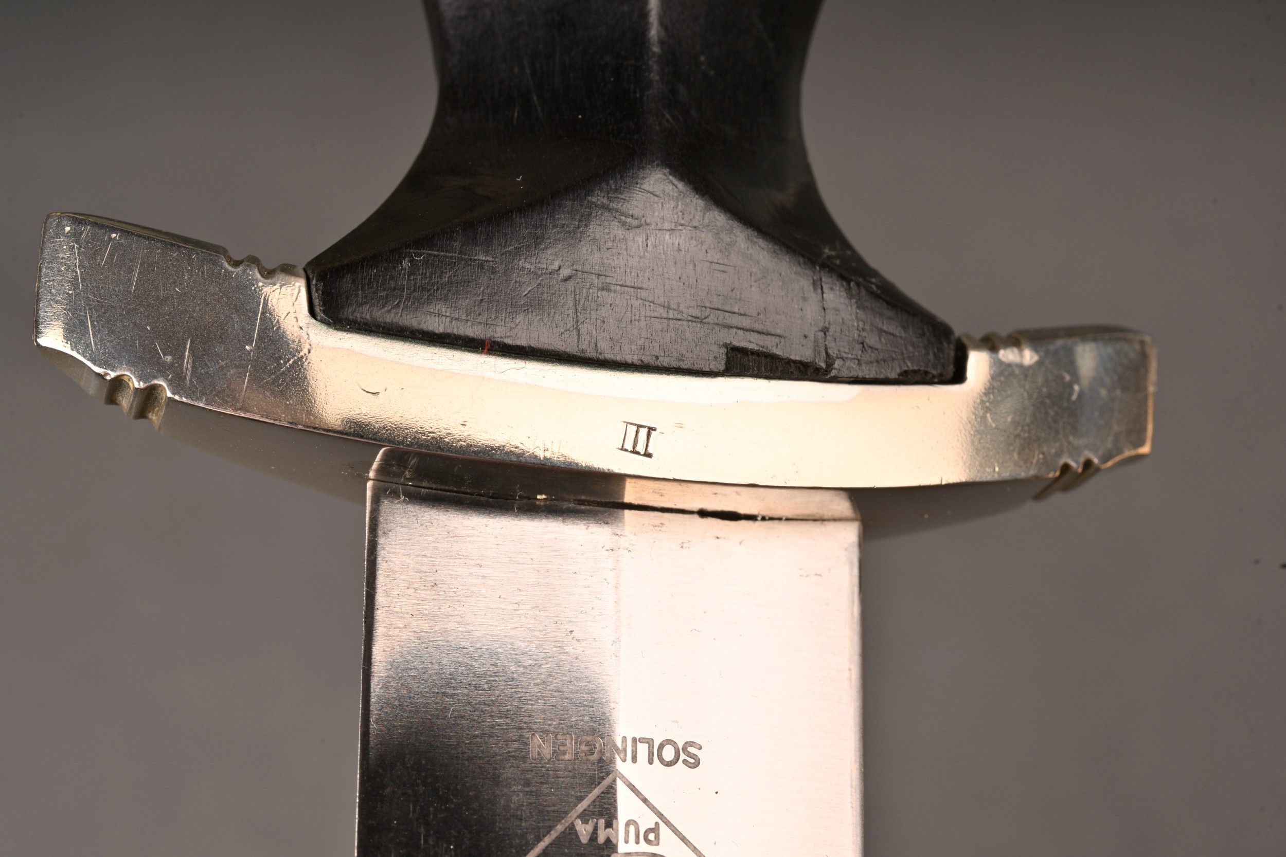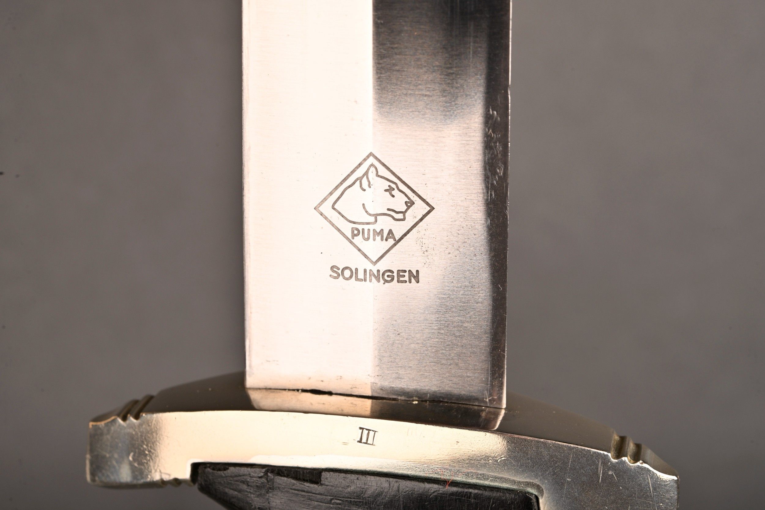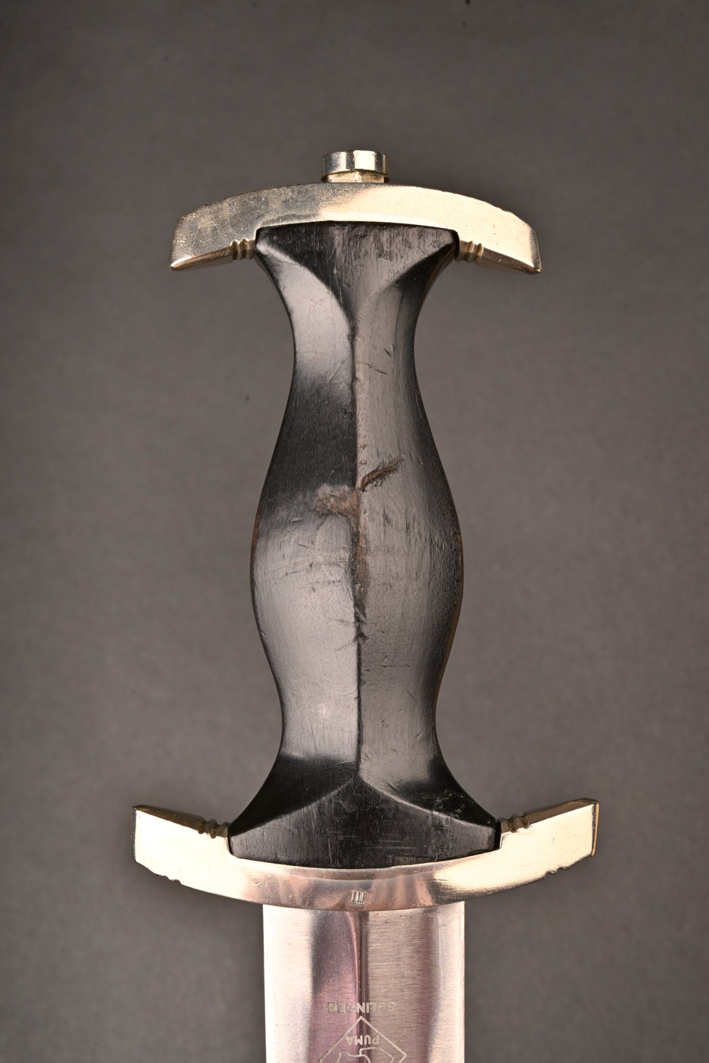 Dague SS modèle 1933 Puma. Dague de la période précoce aux garnitures en maillechort (dague et fourreau). Quelques minimes éclats de peinture perceptibles sur la peinture noire du fourreau encore très présente à 95%. La fusée est en bon état avec de petites traces de chocs attestant de son port. Un petit éclat est visible à la base de la fusée, près de la garde sur son avers, mais qui n’altère en rien la qualité générale de cette pièce. La garde présente le chiffre romain III frappé au dos de la garde indique le passage de cet exemplaire par le centre de contrôle et de distribution SS de Berlin. La lame est en parfait état, une belle devise gravée sur l’avers et la marque du fabricant Puma au dos. Belle pièce représentative de la période précoce. Fabricant peu courant pour une dague de la SS. SS Dagger Model 1933 Puma Early period dagger with nickel silver fittings on dagger and scabbard. Minor paint chips visible on the black lacquer scabbard, which retains 95% of its finish. The grip shows light impact traces from wear with a small chip at the base near the crossguard that does not affect overall appearance. The crossguard bears the Roman numeral III stamped on the reverse, indicating inspection through the SS control center in Berlin. The blade is in perfect condition with a fine motto etching on the obverse and the Puma maker mark on the reverse. Fine early-period piece. An uncommon manufacturer for an SS dagger.