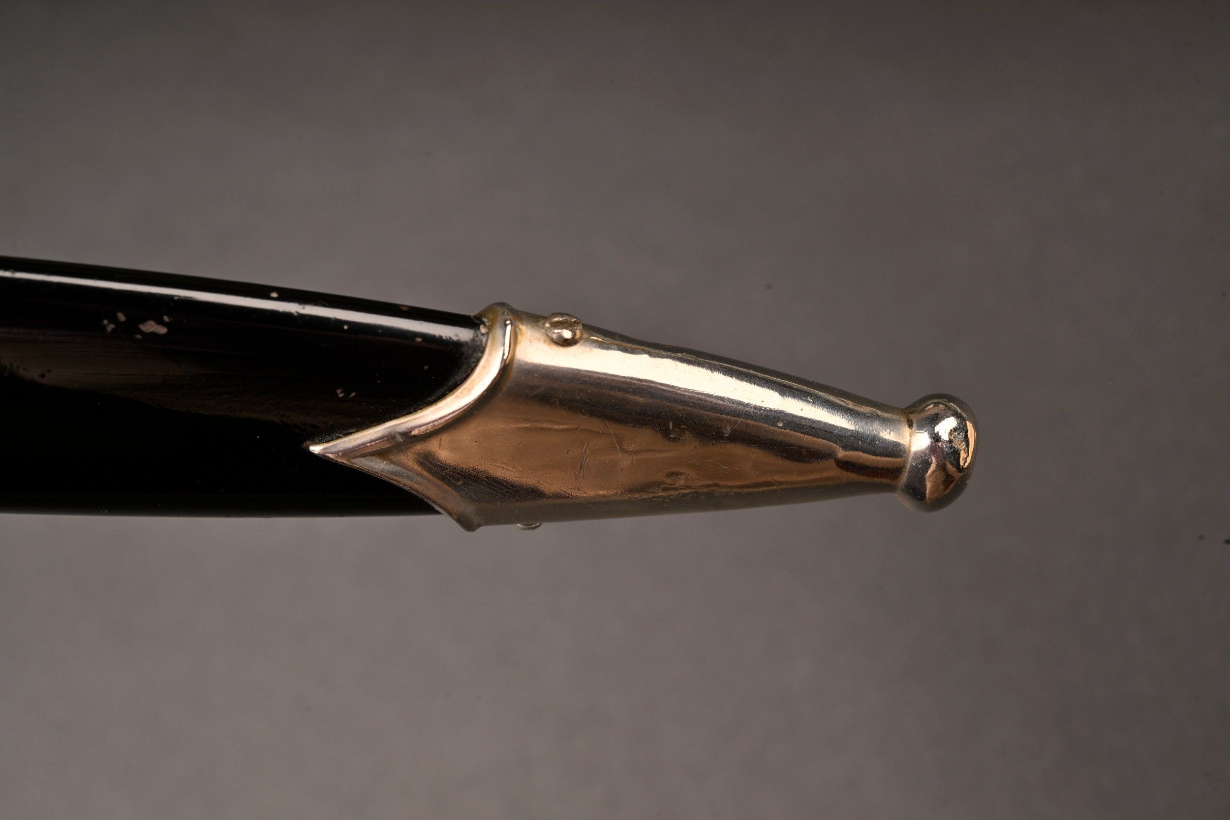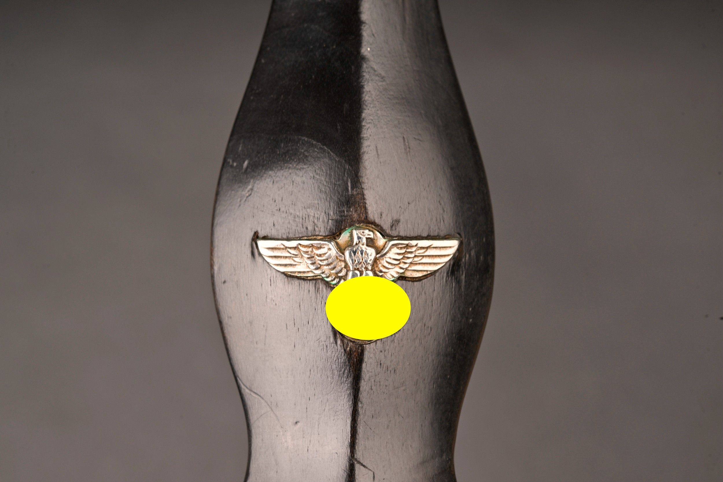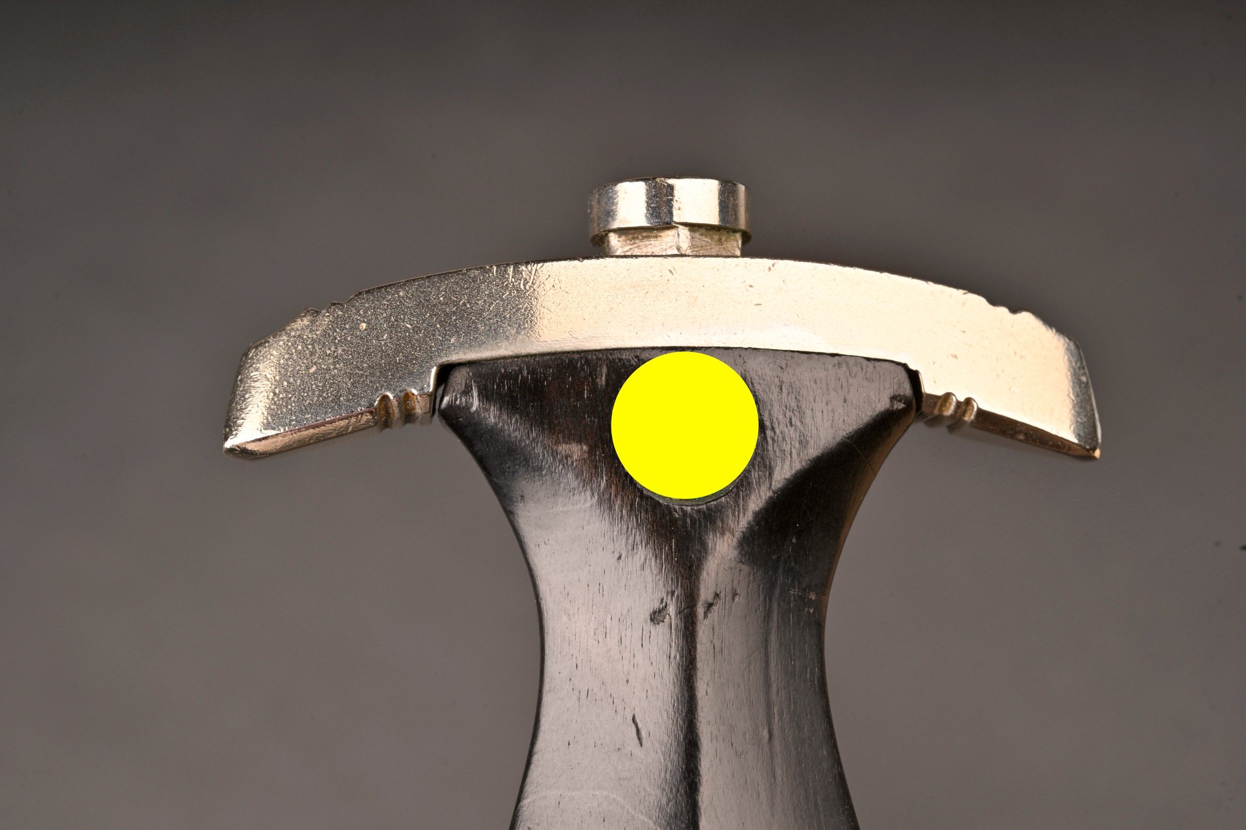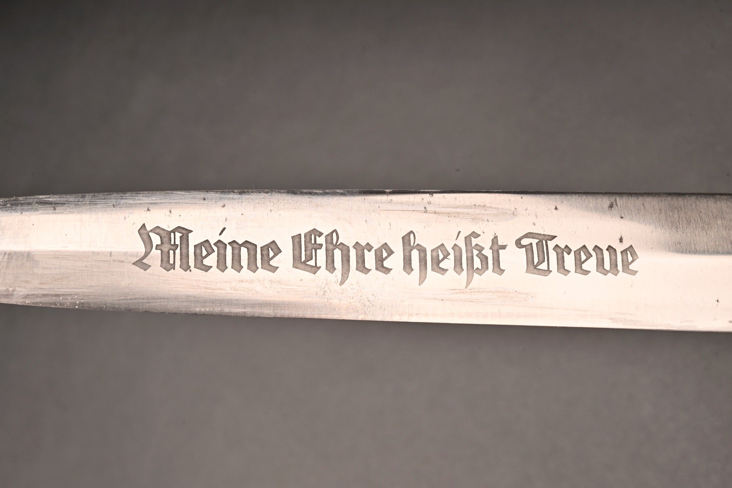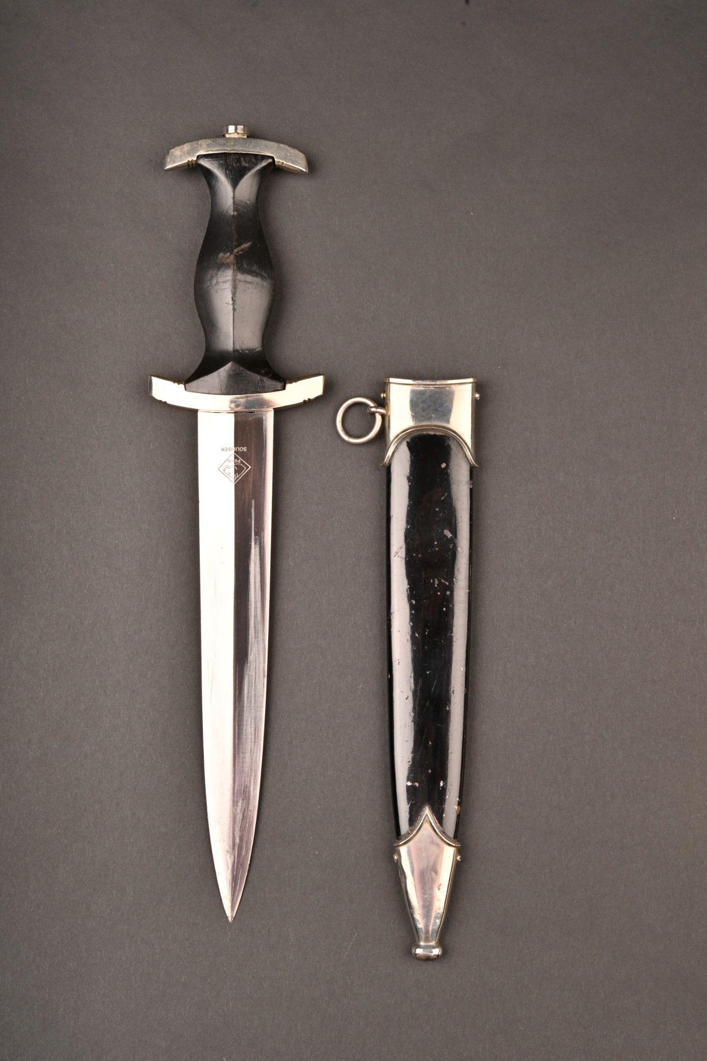 Dague SS modèle 1933 Puma. Dague de la période précoce aux garnitures en maillechort (dague et fourreau). Quelques minimes éclats de peinture perceptibles sur la peinture noire du fourreau encore très présente à 95%. La fusée est en bon état avec de petites traces de chocs attestant de son port. Un petit éclat est visible à la base de la fusée, près de la garde sur son avers, mais qui n’altère en rien la qualité générale de cette pièce. La garde présente le chiffre romain III frappé au dos de la garde indique le passage de cet exemplaire par le centre de contrôle et de distribution SS de Berlin. La lame est en parfait état, une belle devise gravée sur l’avers et la marque du fabricant Puma au dos. Belle pièce représentative de la période précoce. Fabricant peu courant pour une dague de la SS. SS Dagger Model 1933 Puma Early period dagger with nickel silver fittings on dagger and scabbard. Minor paint chips visible on the black lacquer scabbard, which retains 95% of its finish. The grip shows light impact traces from wear with a small chip at the base near the crossguard that does not affect overall appearance. The crossguard bears the Roman numeral III stamped on the reverse, indicating inspection through the SS control center in Berlin. The blade is in perfect condition with a fine motto etching on the obverse and the Puma maker mark on the reverse. Fine early-period piece. An uncommon manufacturer for an SS dagger.