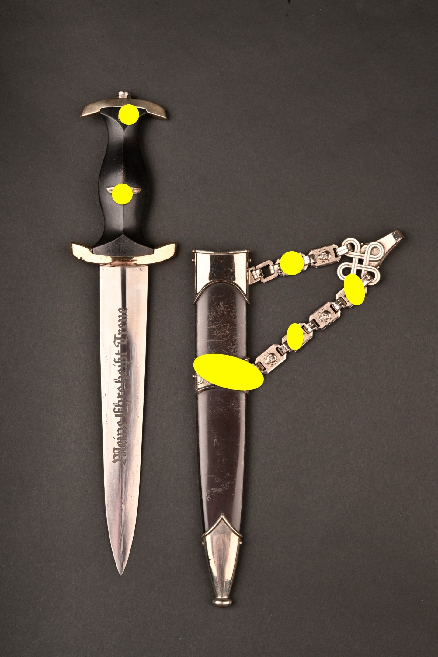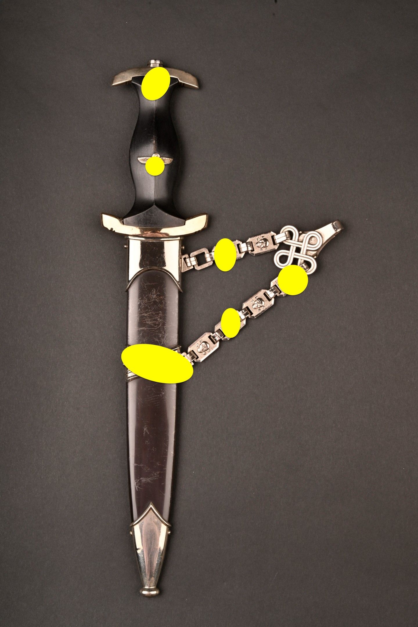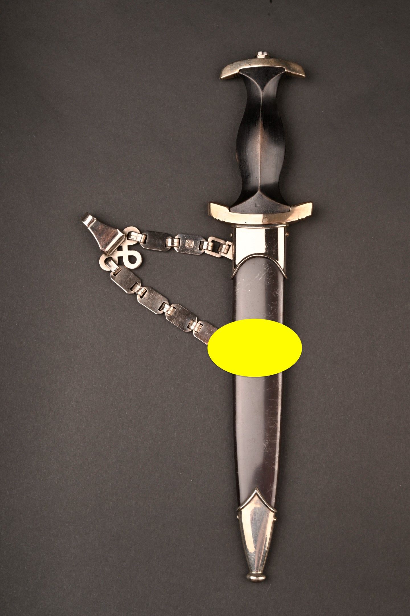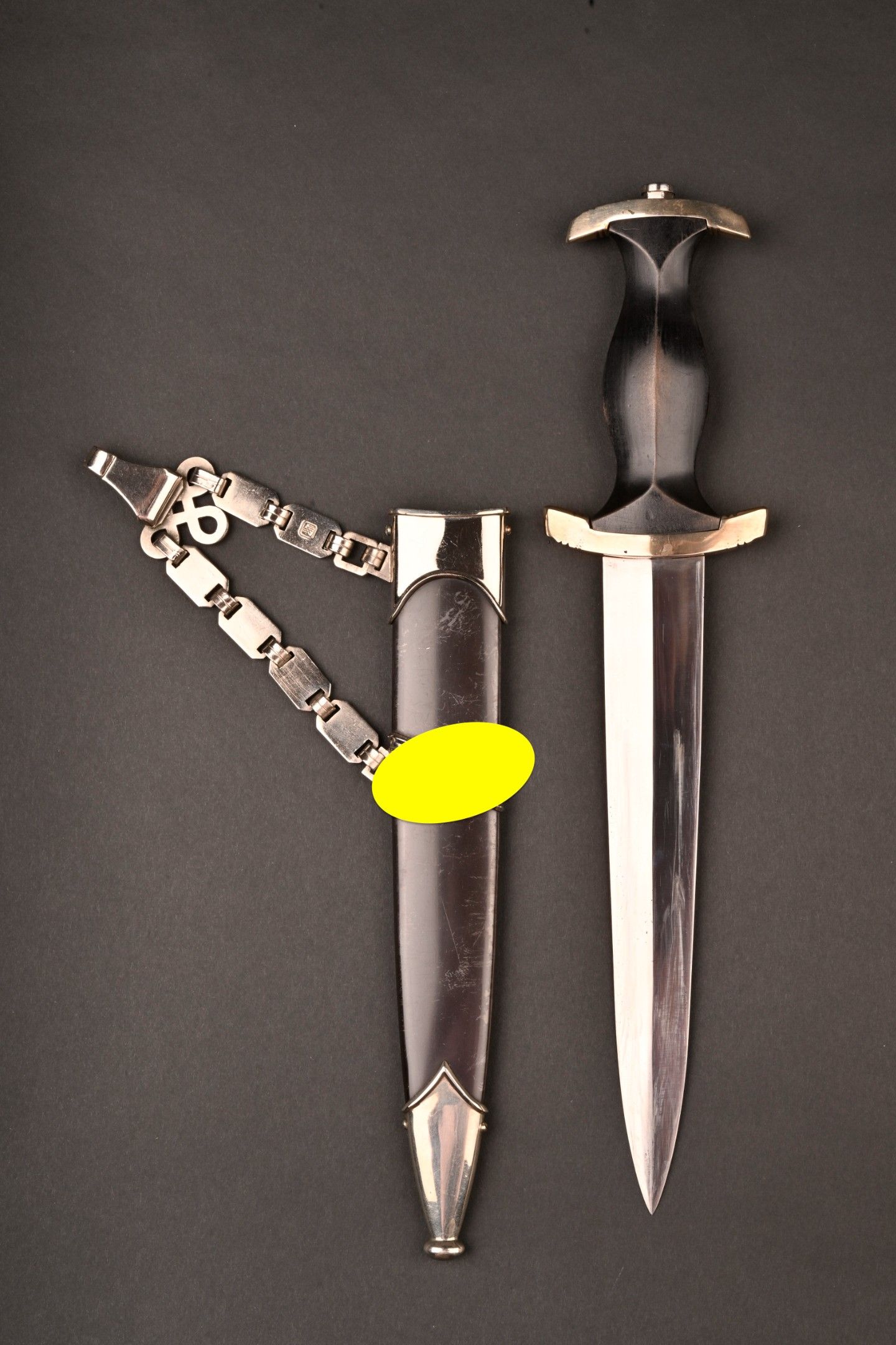 Dague SS modèle 1936. Comme il se doit, cette dague ne comporte aucune marque de fabricant, ce qui est conforme au modèle. La fusée est sans trace de choc ni de manipulation, si ce n’est une infime trace perceptible à la base au dos. Toutes les garnitures de la dague sont en maillechort. Aucune marque de centre de contrôle et de distribution n’apparait au dos de la garde, ce qui là aussi parfaitement conforme au modèle. La lame est sans défaut avec une belle devise. Le fourreau conserve la quasi-totalité de son bronzage et ses garnitures sont en métal nickelé. La bélière à double chainette possède ses maillons en métal nickelé et le nœud sans fin est évidé, ce qui permet d’apercevoir une partie des lettres DRGM. Le kulturzeichen est bien présent sur le second maillon de la chainette supérieure. Le mélange de matériaux maillechort (pour la dague) et métal nickelé (pour le fourreau) est caractéristique des productions sorties entre 1939 et 1943. Dague qui devient très difficile de trouver en très bel état comme c’est le cas pour cet exemplaire. SS Dagger Model 1936 As expected this dagger bears no maker mark which is correct for the model. The grip shows no impact or handling marks apart from a tiny mark near the base on the reverse. All fittings are nickel silver and the crossguard bears no control or distribution center marking which again is correct for the model. The blade is flawless with a finely etched motto. The scabbard retains nearly all of its blued finish and the fittings are nickel plated metal. The double chain hanger has nickel plated links with an openwork endless knot showing part of the DRGM lettering. The kulturzeichen is visible on the second upper chain link. The combination of nickel silver on the dagger and nickel-plated fittings on the scabbard is typical of production between 1939 and 1943. Dagger of exceptional preservation and difficult to find in this condition.