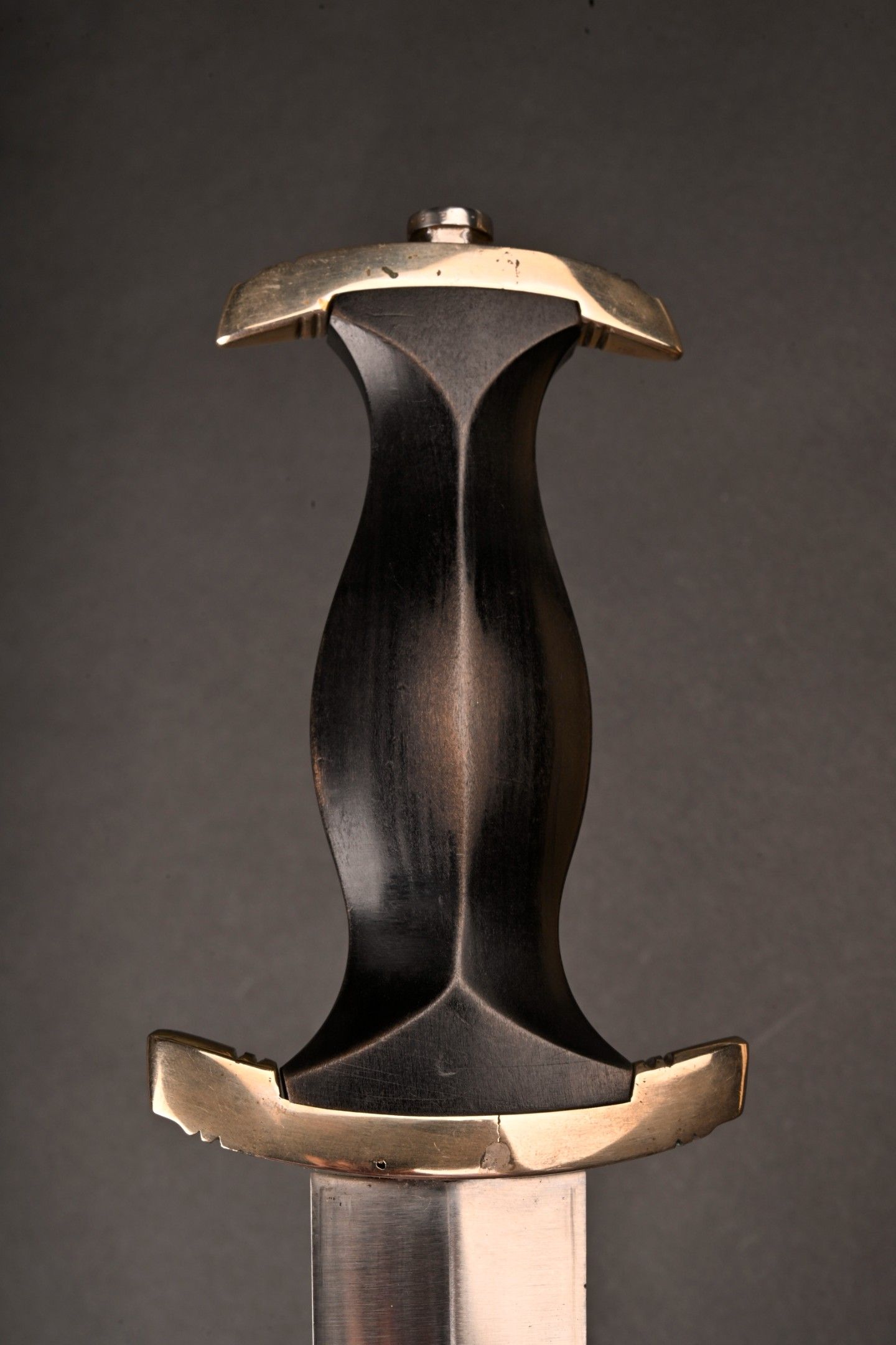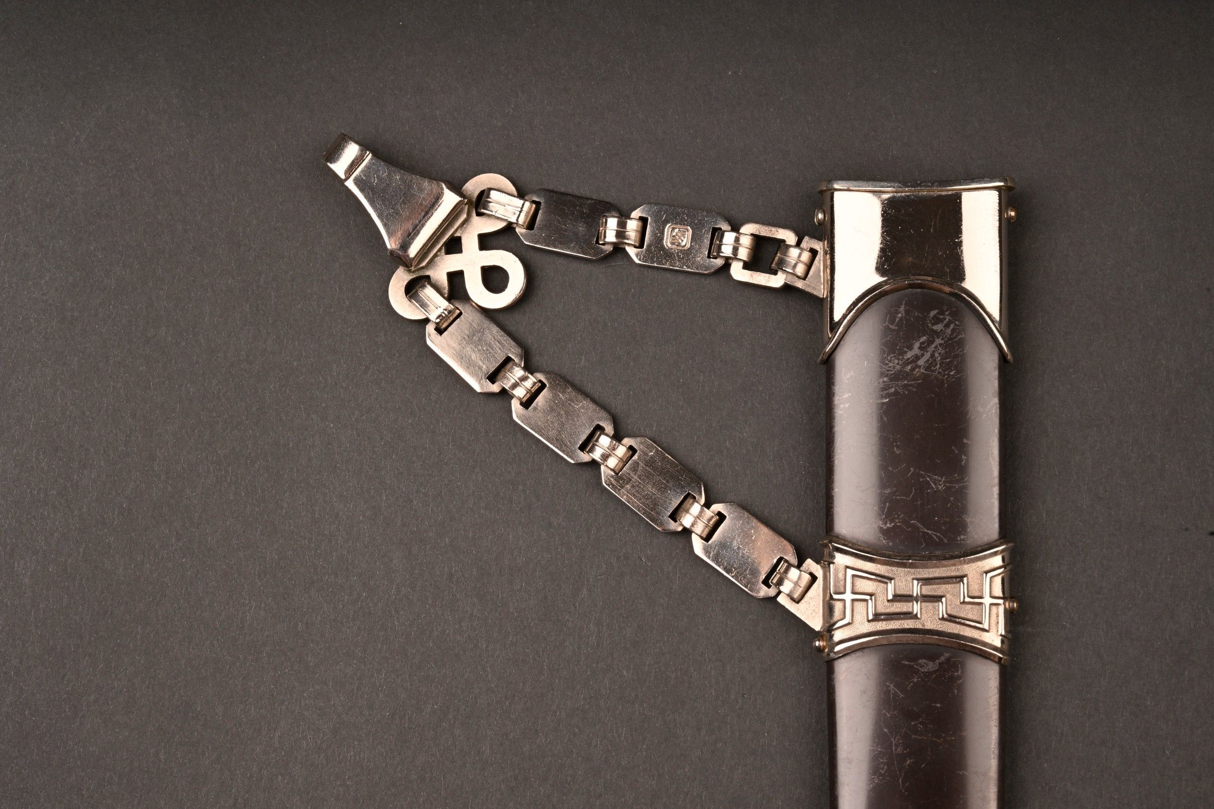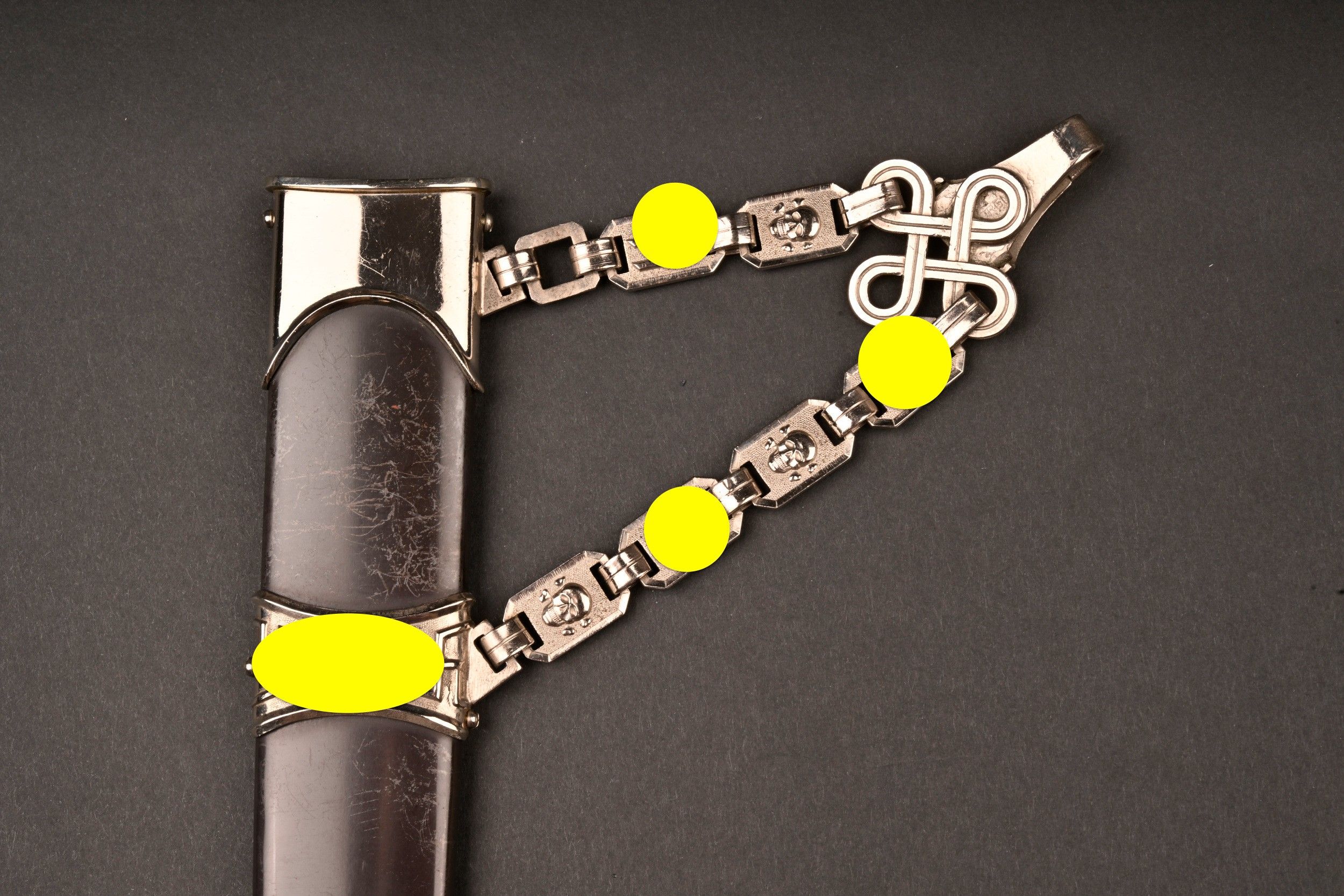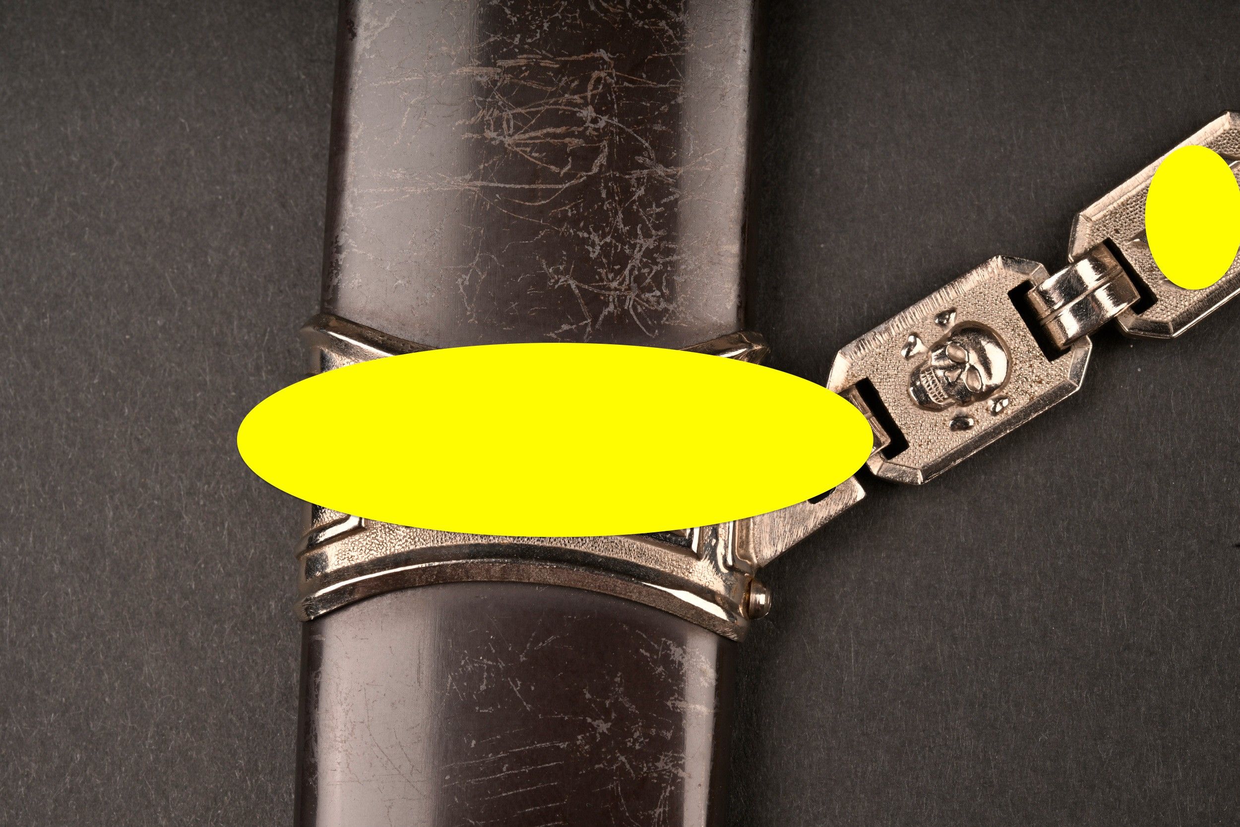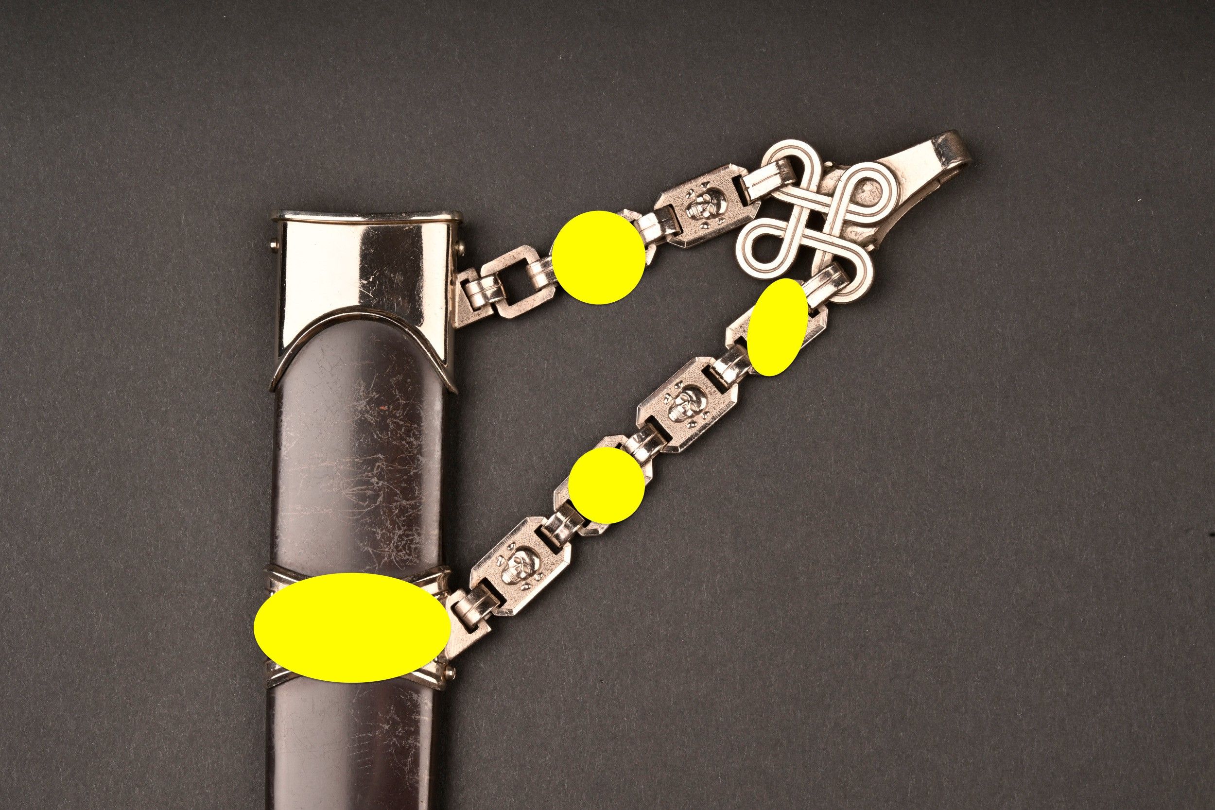 Dague SS modèle 1936. Comme il se doit, cette dague ne comporte aucune marque de fabricant, ce qui est conforme au modèle. La fusée est sans trace de choc ni de manipulation, si ce n’est une infime trace perceptible à la base au dos. Toutes les garnitures de la dague sont en maillechort. Aucune marque de centre de contrôle et de distribution n’apparait au dos de la garde, ce qui là aussi parfaitement conforme au modèle. La lame est sans défaut avec une belle devise. Le fourreau conserve la quasi-totalité de son bronzage et ses garnitures sont en métal nickelé. La bélière à double chainette possède ses maillons en métal nickelé et le nœud sans fin est évidé, ce qui permet d’apercevoir une partie des lettres DRGM. Le kulturzeichen est bien présent sur le second maillon de la chainette supérieure. Le mélange de matériaux maillechort (pour la dague) et métal nickelé (pour le fourreau) est caractéristique des productions sorties entre 1939 et 1943. Dague qui devient très difficile de trouver en très bel état comme c’est le cas pour cet exemplaire. SS Dagger Model 1936 As expected this dagger bears no maker mark which is correct for the model. The grip shows no impact or handling marks apart from a tiny mark near the base on the reverse. All fittings are nickel silver and the crossguard bears no control or distribution center marking which again is correct for the model. The blade is flawless with a finely etched motto. The scabbard retains nearly all of its blued finish and the fittings are nickel plated metal. The double chain hanger has nickel plated links with an openwork endless knot showing part of the DRGM lettering. The kulturzeichen is visible on the second upper chain link. The combination of nickel silver on the dagger and nickel-plated fittings on the scabbard is typical of production between 1939 and 1943. Dagger of exceptional preservation and difficult to find in this condition.