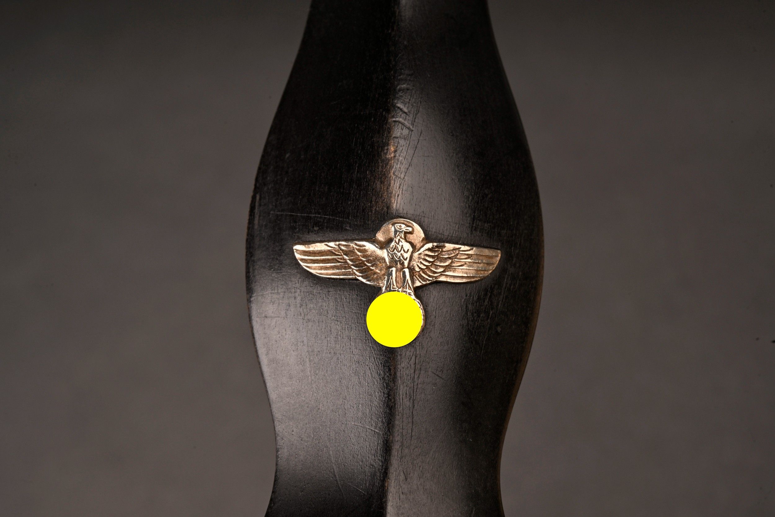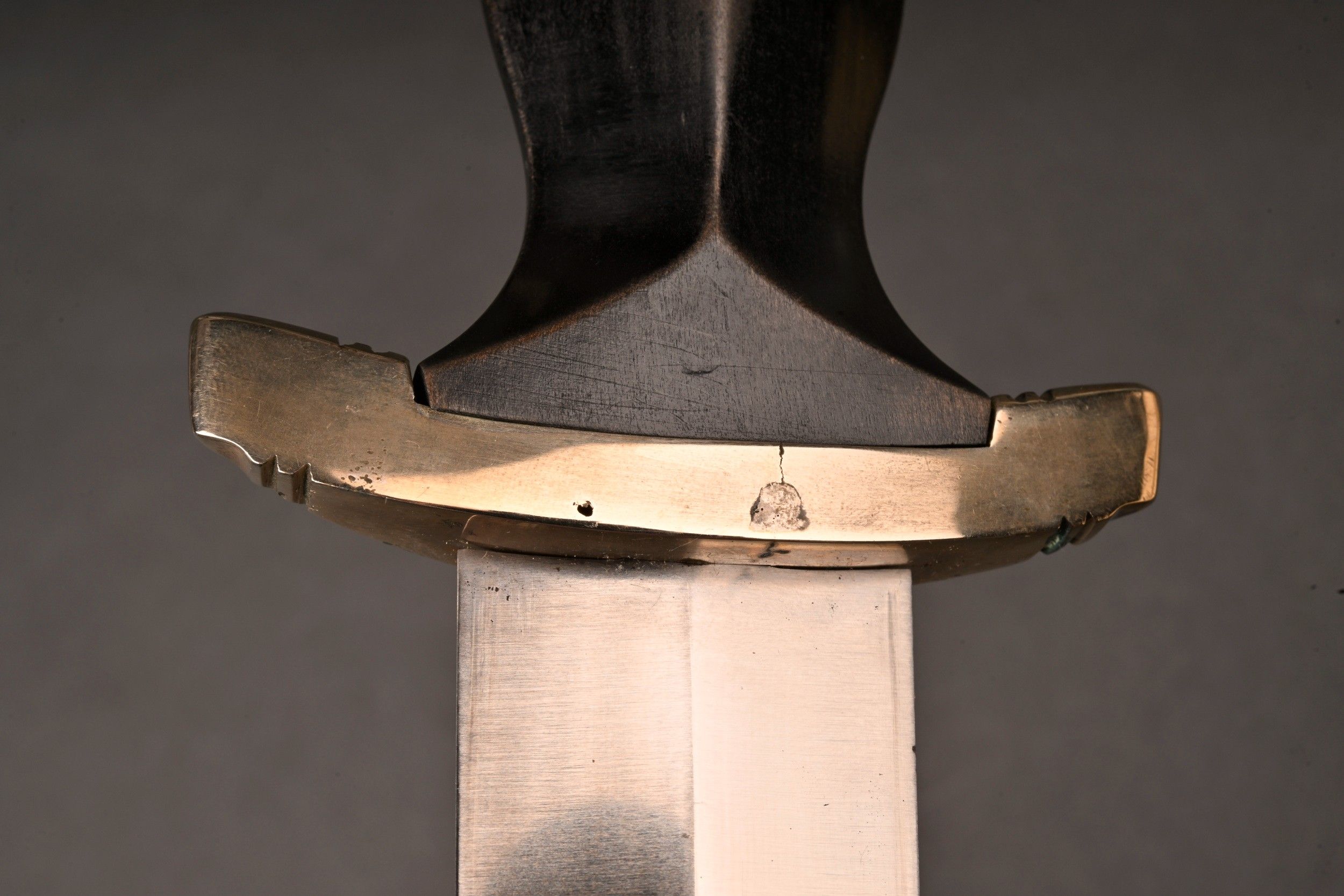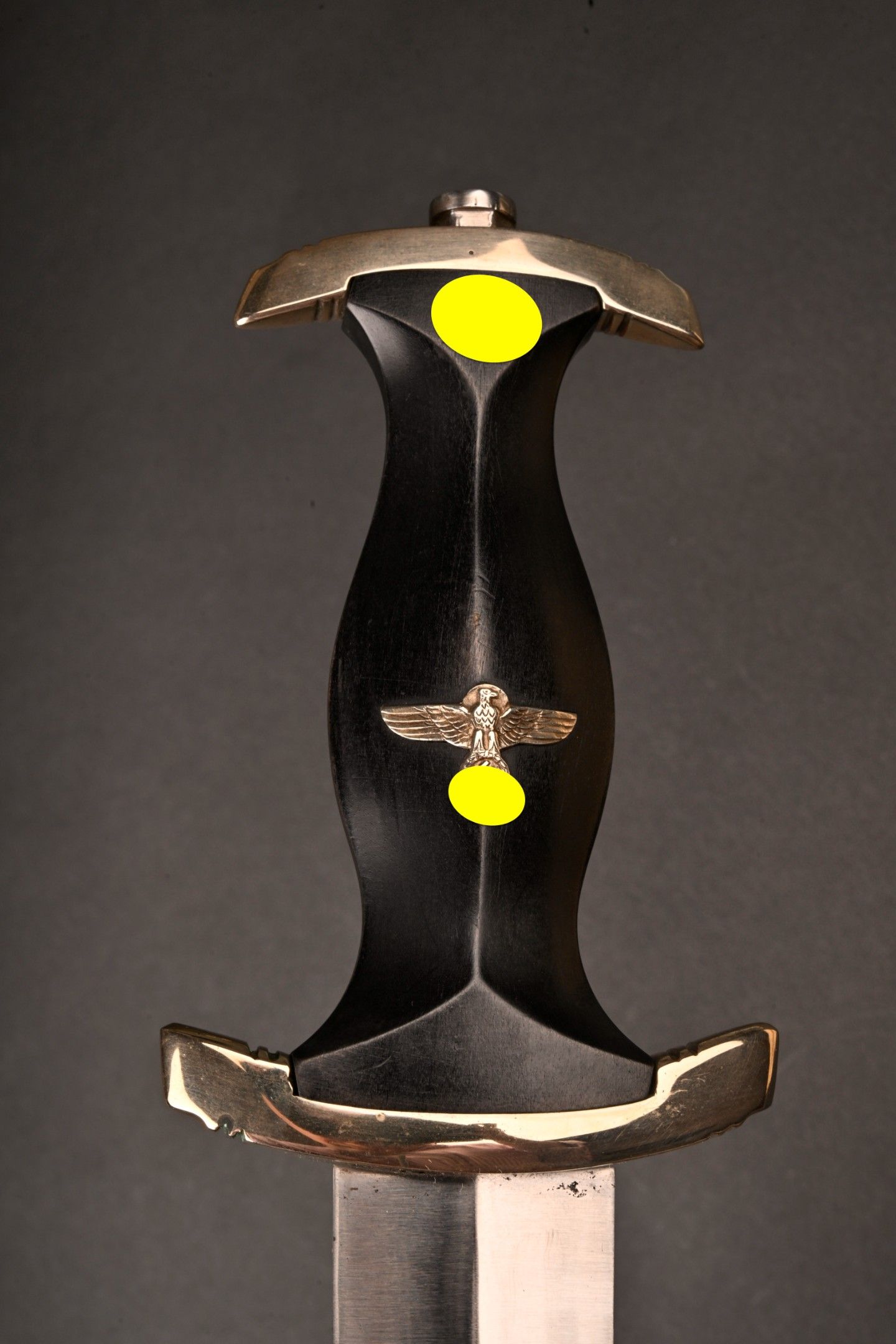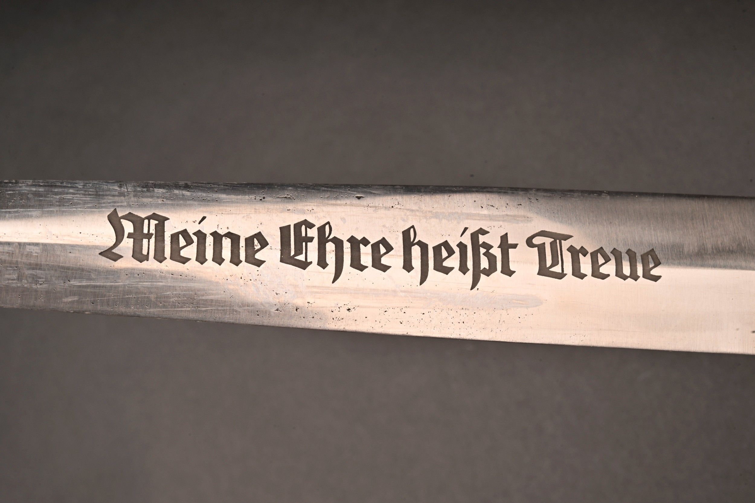 Dague SS modèle 1936. Comme il se doit, cette dague ne comporte aucune marque de fabricant, ce qui est conforme au modèle. La fusée est sans trace de choc ni de manipulation, si ce n’est une infime trace perceptible à la base au dos. Toutes les garnitures de la dague sont en maillechort. Aucune marque de centre de contrôle et de distribution n’apparait au dos de la garde, ce qui là aussi parfaitement conforme au modèle. La lame est sans défaut avec une belle devise. Le fourreau conserve la quasi-totalité de son bronzage et ses garnitures sont en métal nickelé. La bélière à double chainette possède ses maillons en métal nickelé et le nœud sans fin est évidé, ce qui permet d’apercevoir une partie des lettres DRGM. Le kulturzeichen est bien présent sur le second maillon de la chainette supérieure. Le mélange de matériaux maillechort (pour la dague) et métal nickelé (pour le fourreau) est caractéristique des productions sorties entre 1939 et 1943. Dague qui devient très difficile de trouver en très bel état comme c’est le cas pour cet exemplaire. SS Dagger Model 1936 As expected this dagger bears no maker mark which is correct for the model. The grip shows no impact or handling marks apart from a tiny mark near the base on the reverse. All fittings are nickel silver and the crossguard bears no control or distribution center marking which again is correct for the model. The blade is flawless with a finely etched motto. The scabbard retains nearly all of its blued finish and the fittings are nickel plated metal. The double chain hanger has nickel plated links with an openwork endless knot showing part of the DRGM lettering. The kulturzeichen is visible on the second upper chain link. The combination of nickel silver on the dagger and nickel-plated fittings on the scabbard is typical of production between 1939 and 1943. Dagger of exceptional preservation and difficult to find in this condition.