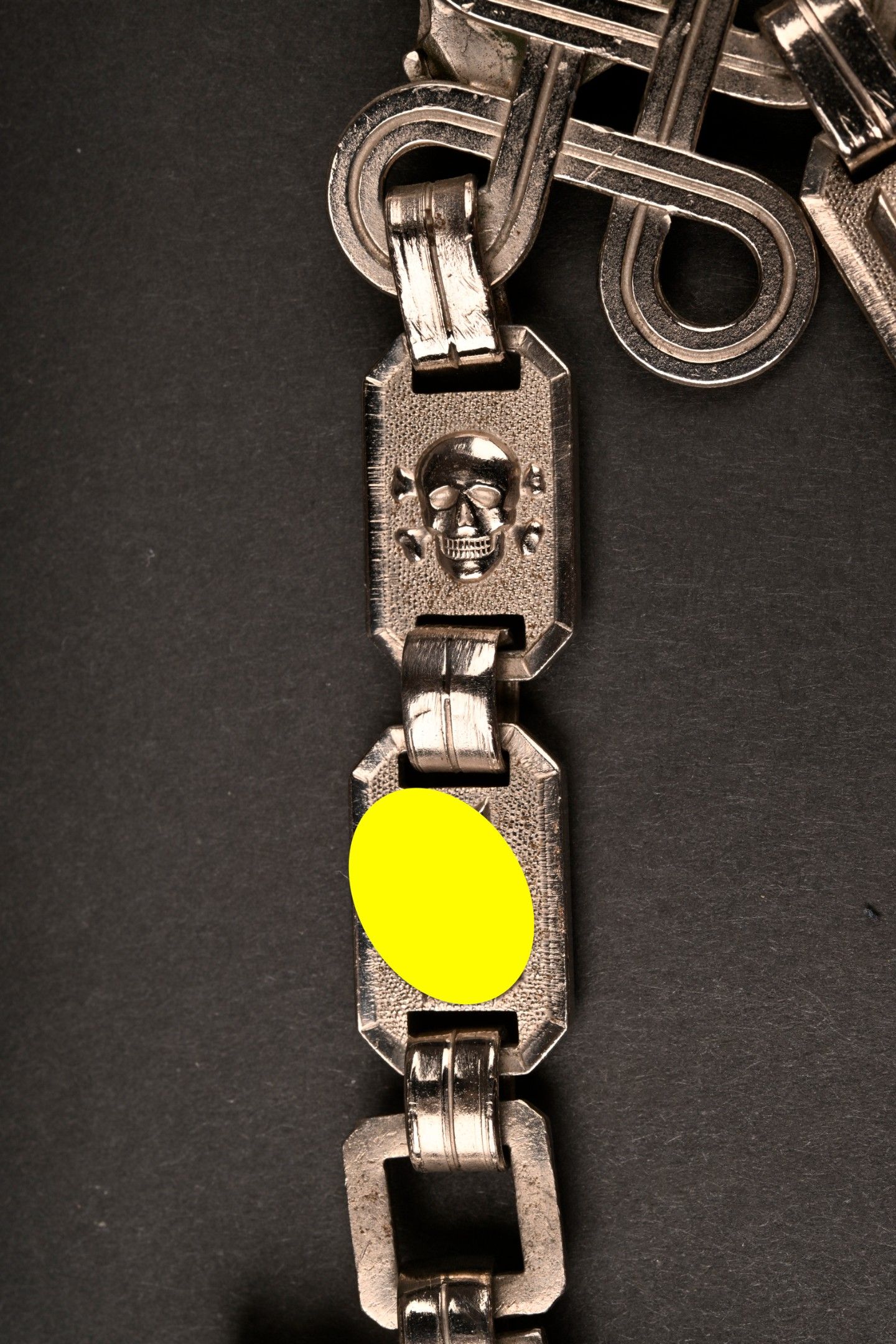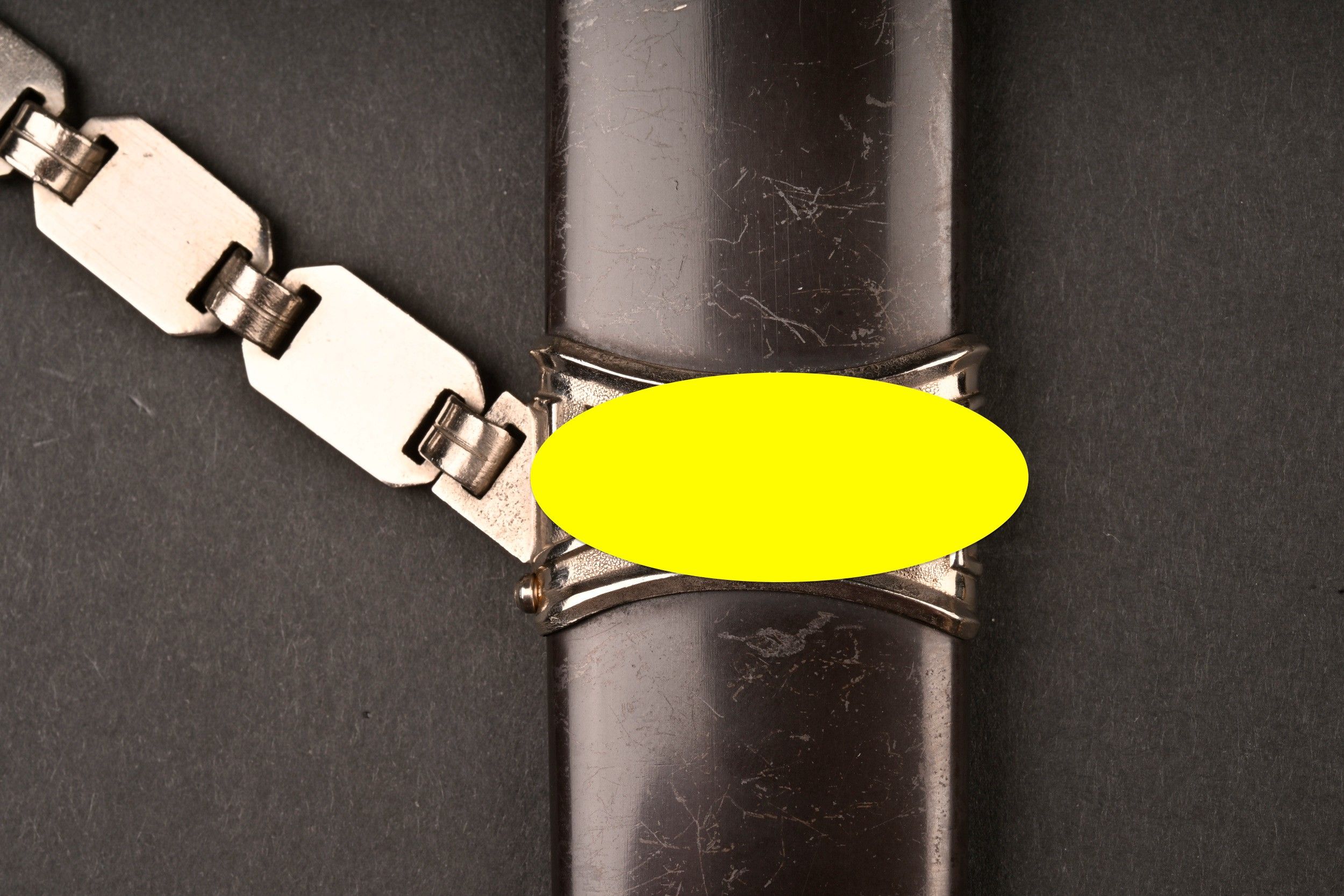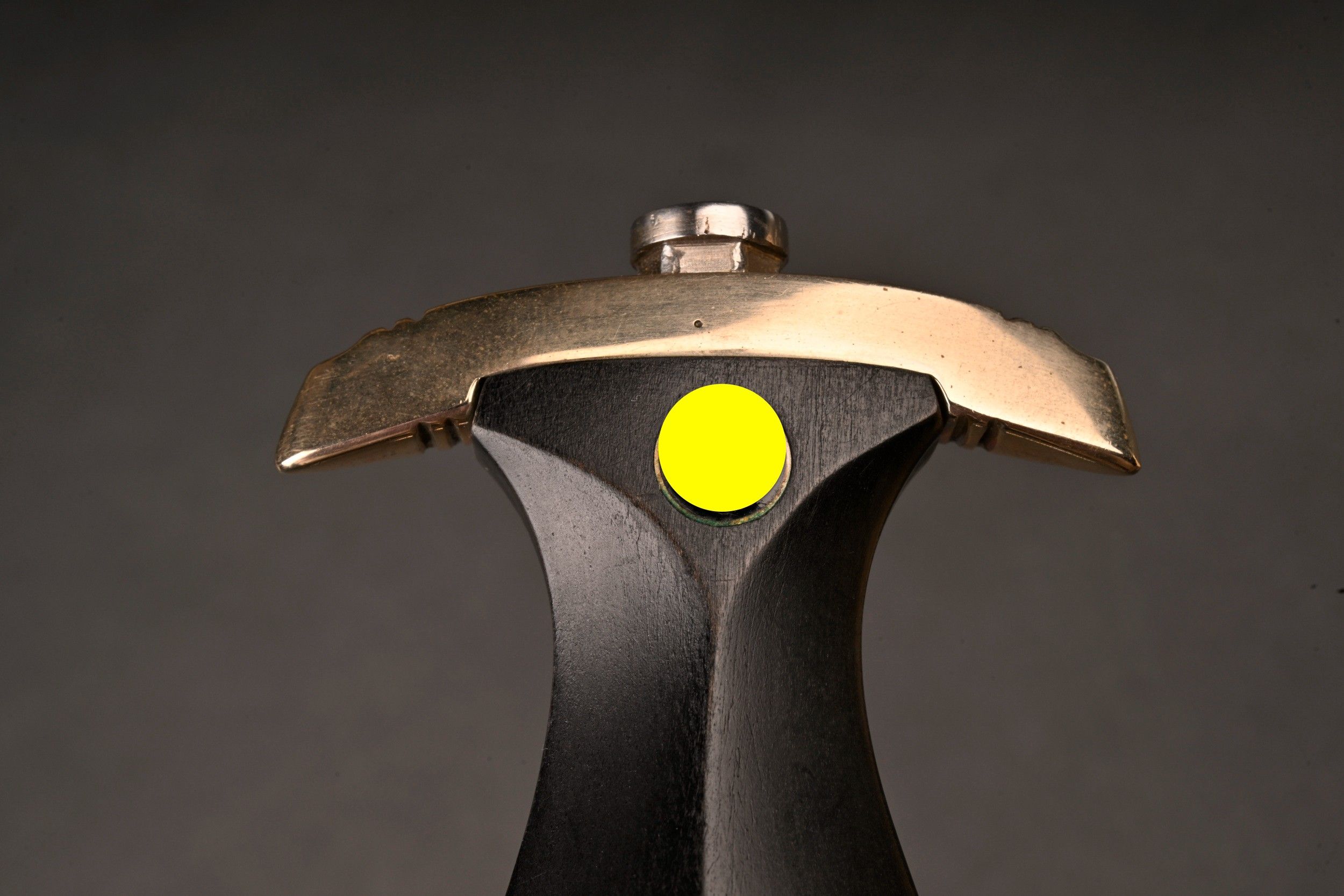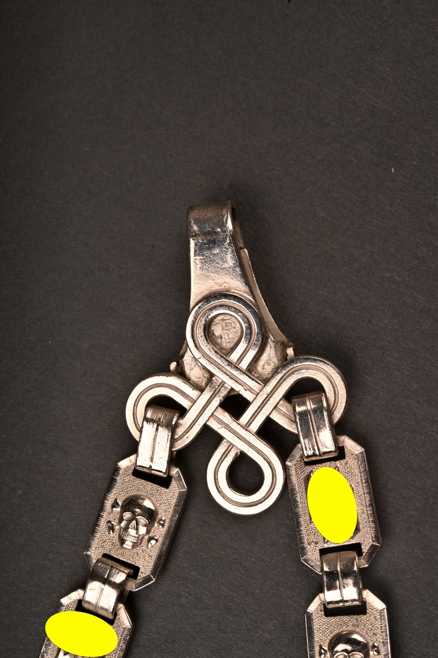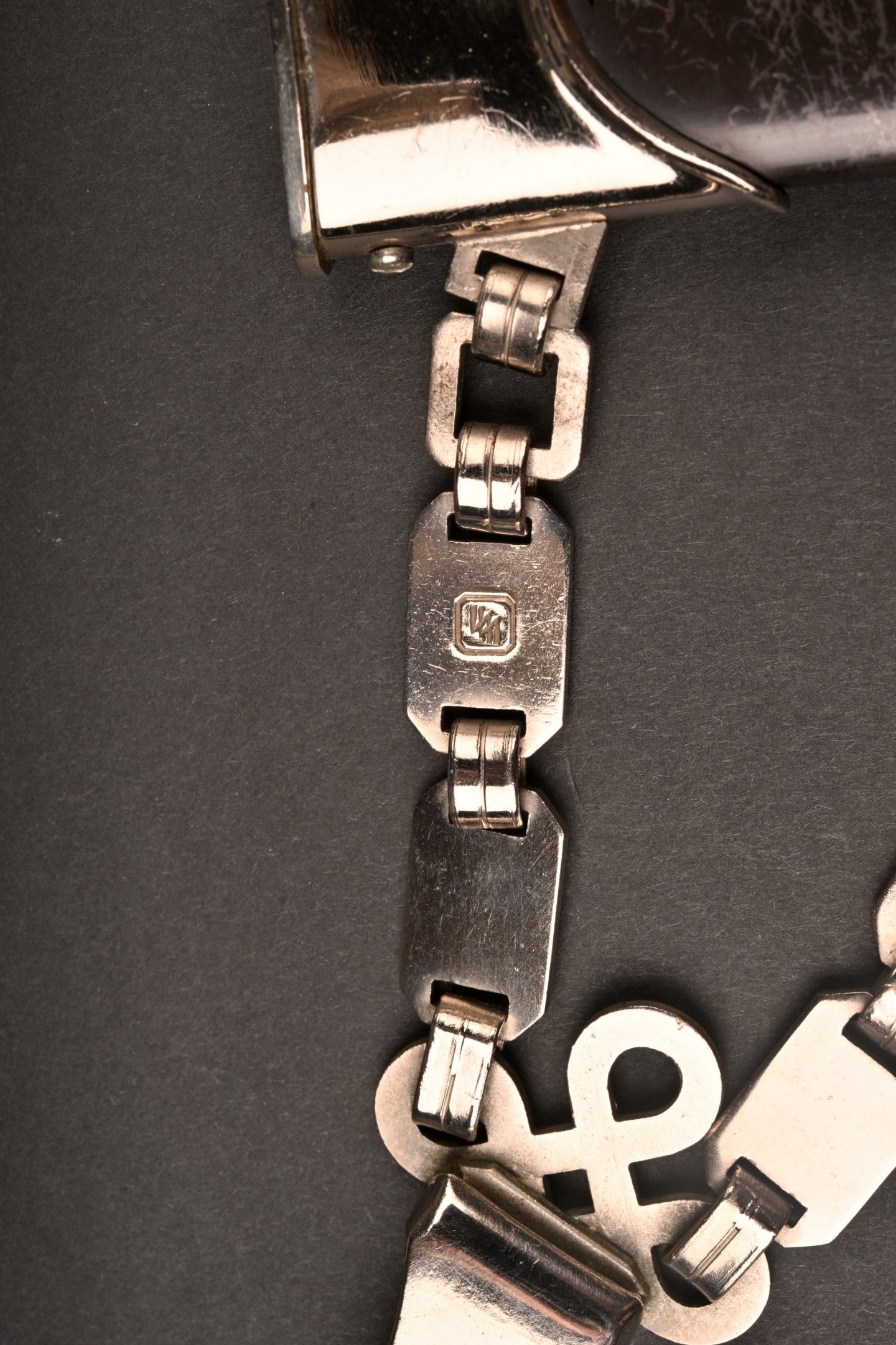 Dague SS modèle 1936. Comme il se doit, cette dague ne comporte aucune marque de fabricant, ce qui est conforme au modèle. La fusée est sans trace de choc ni de manipulation, si ce n’est une infime trace perceptible à la base au dos. Toutes les garnitures de la dague sont en maillechort. Aucune marque de centre de contrôle et de distribution n’apparait au dos de la garde, ce qui là aussi parfaitement conforme au modèle. La lame est sans défaut avec une belle devise. Le fourreau conserve la quasi-totalité de son bronzage et ses garnitures sont en métal nickelé. La bélière à double chainette possède ses maillons en métal nickelé et le nœud sans fin est évidé, ce qui permet d’apercevoir une partie des lettres DRGM. Le kulturzeichen est bien présent sur le second maillon de la chainette supérieure. Le mélange de matériaux maillechort (pour la dague) et métal nickelé (pour le fourreau) est caractéristique des productions sorties entre 1939 et 1943. Dague qui devient très difficile de trouver en très bel état comme c’est le cas pour cet exemplaire. SS Dagger Model 1936 As expected this dagger bears no maker mark which is correct for the model. The grip shows no impact or handling marks apart from a tiny mark near the base on the reverse. All fittings are nickel silver and the crossguard bears no control or distribution center marking which again is correct for the model. The blade is flawless with a finely etched motto. The scabbard retains nearly all of its blued finish and the fittings are nickel plated metal. The double chain hanger has nickel plated links with an openwork endless knot showing part of the DRGM lettering. The kulturzeichen is visible on the second upper chain link. The combination of nickel silver on the dagger and nickel-plated fittings on the scabbard is typical of production between 1939 and 1943. Dagger of exceptional preservation and difficult to find in this condition.