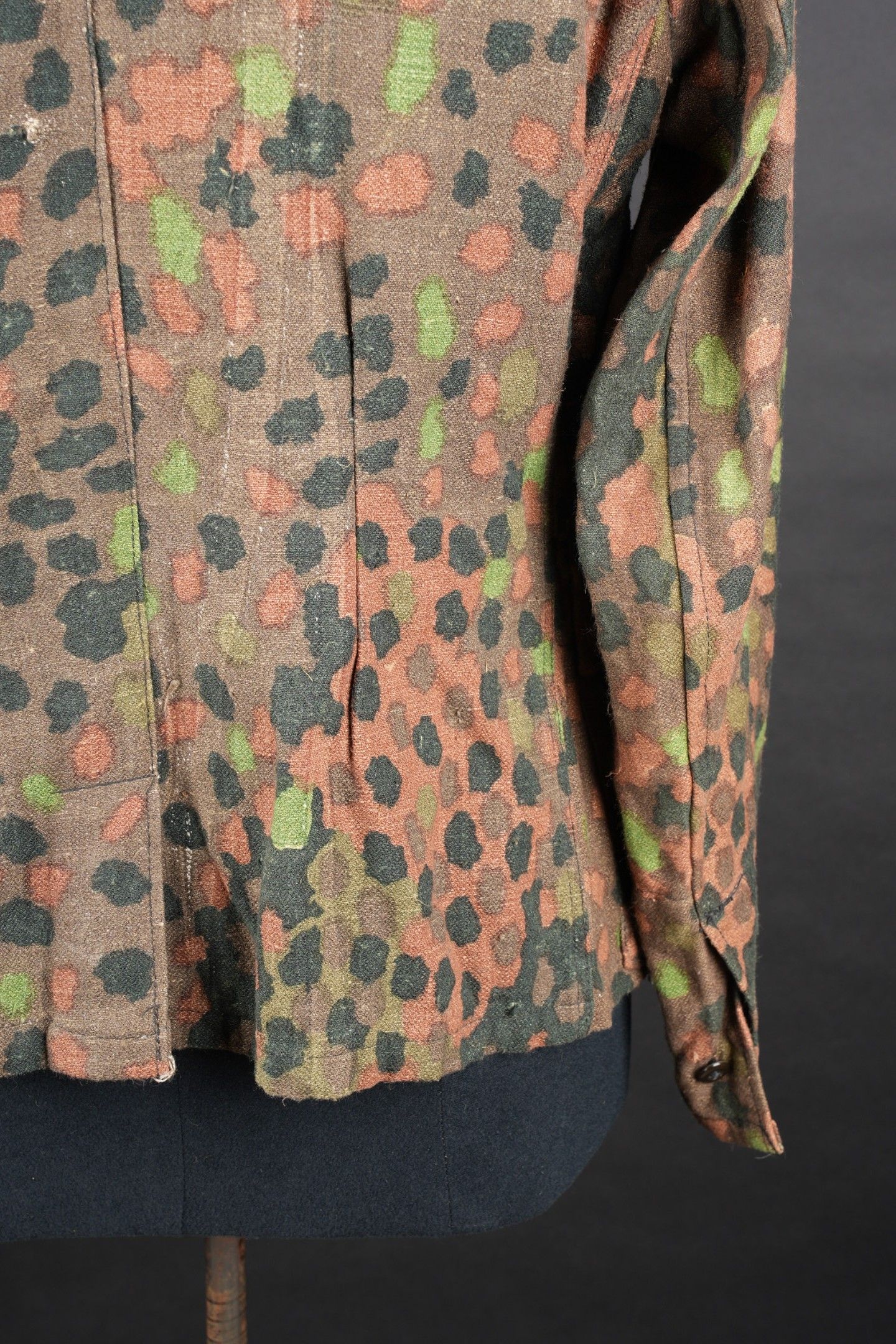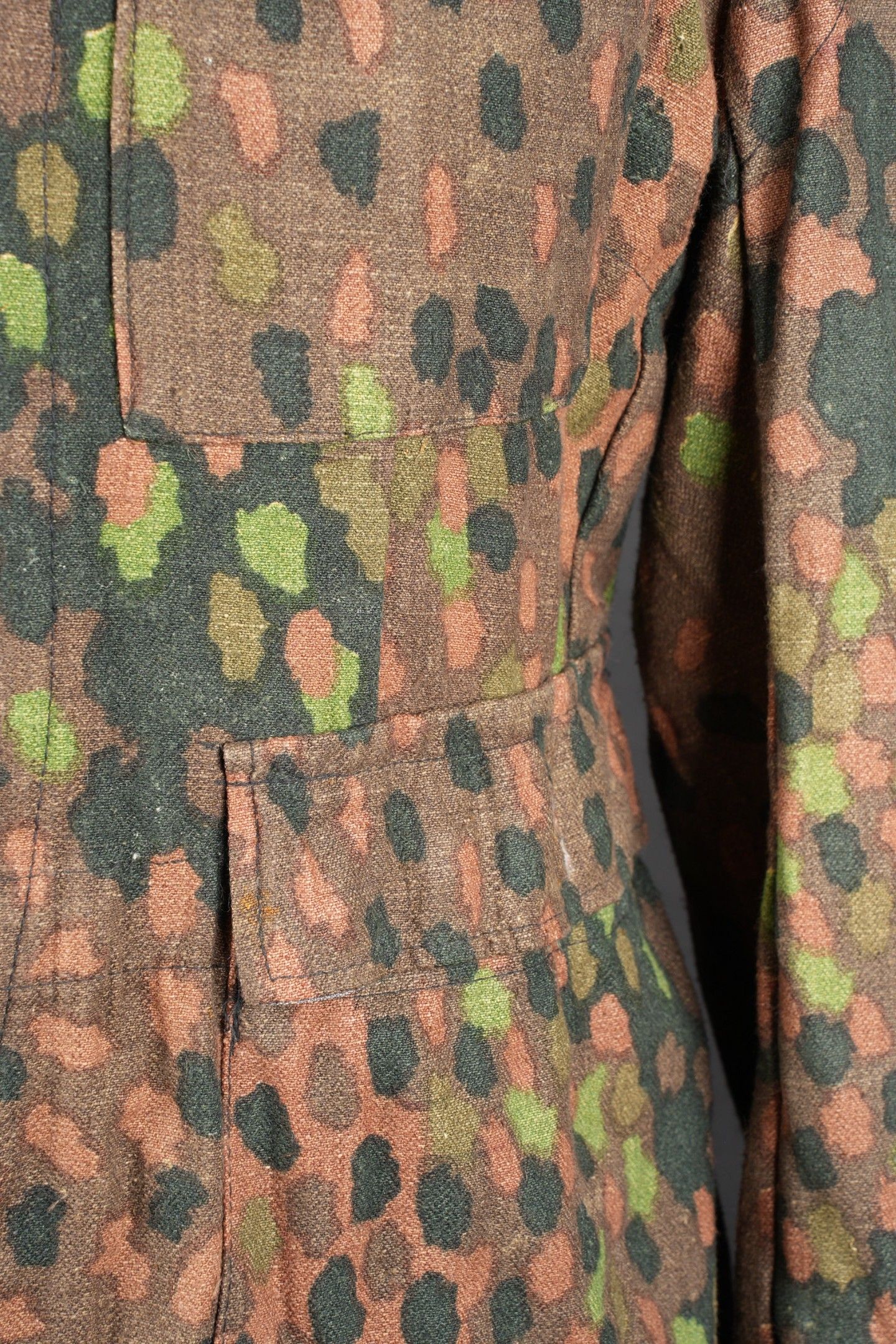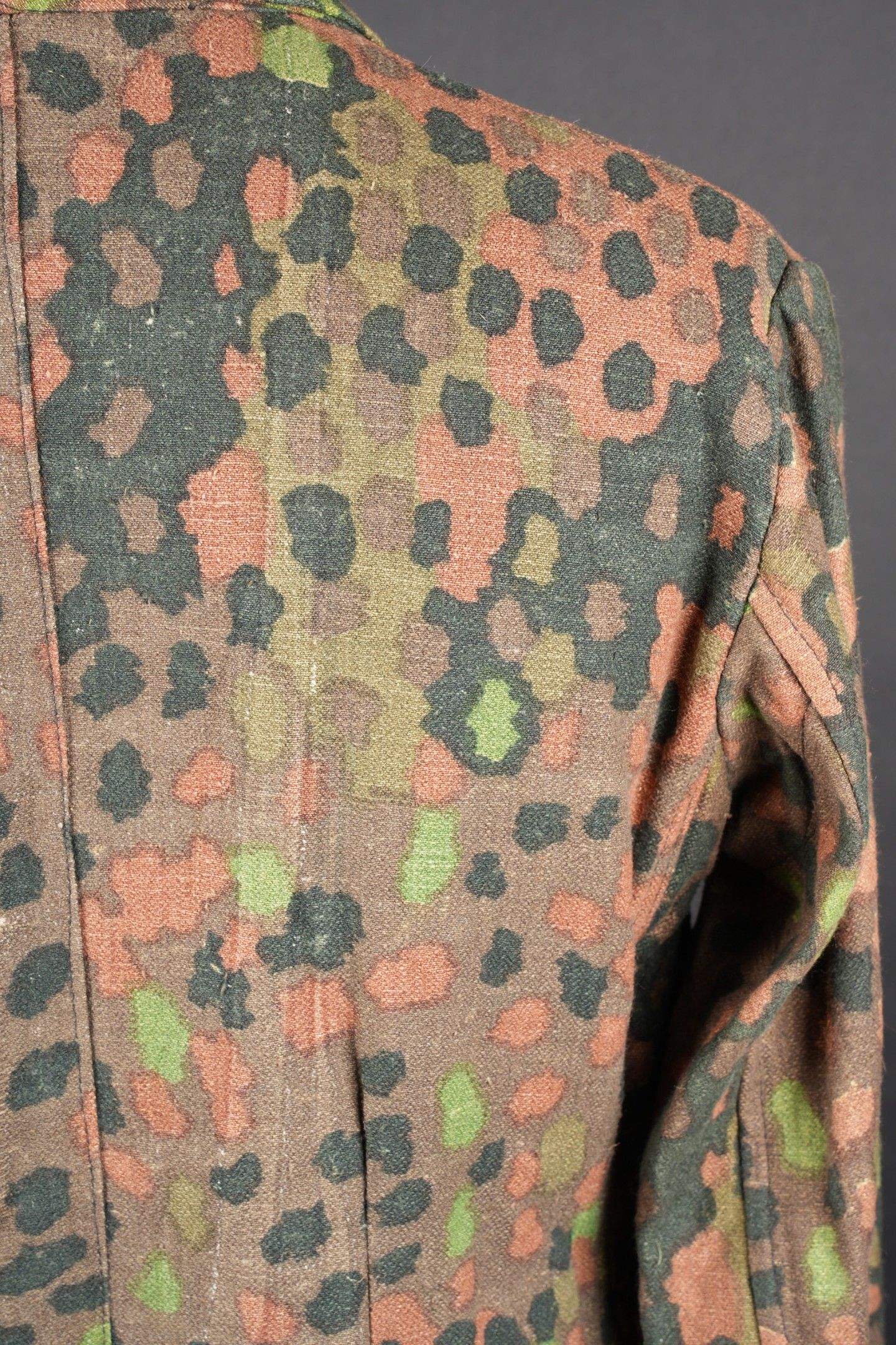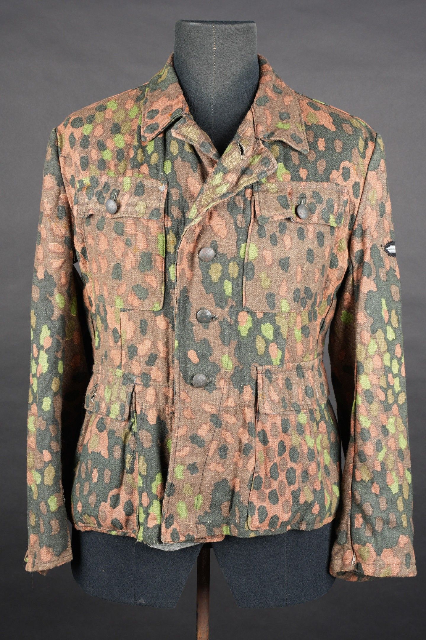 Vareuse petits pois SS. En tissu camouflé. Tous les boutons sont présents et en couleur d'origine. Il semble qu'ils ont été recousus. Couleurs très vives . Aigle de manche brodé cousu main au niveau de la manche gauche. Intérieur en parti doublé en tissu soyeux gris/bleu. Fabrication Betr Ra. Indication de taille 42 42 92 67 66. Couleurs très vives. A noter une légère usure et patine de la pièce. Etat I-. SS Pea Dot Tunic Made of camouflage fabric with all buttons present and retaining their original color. Buttons appear to have been resewn. Very bright colors. Hand-sewn sleeve eagle on the left arm. Partial lining in silky grey-blue fabric. Maker label Betr Ra with size markings 42 42 92 67 66. Colors exceptionally vivid. Slight wear and patina consistent with age. Condition I-.
