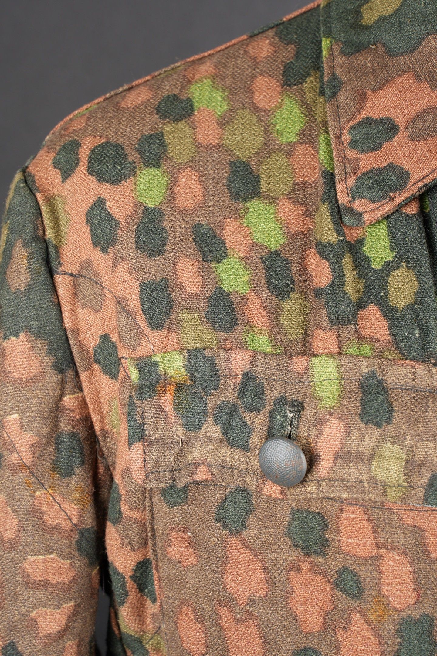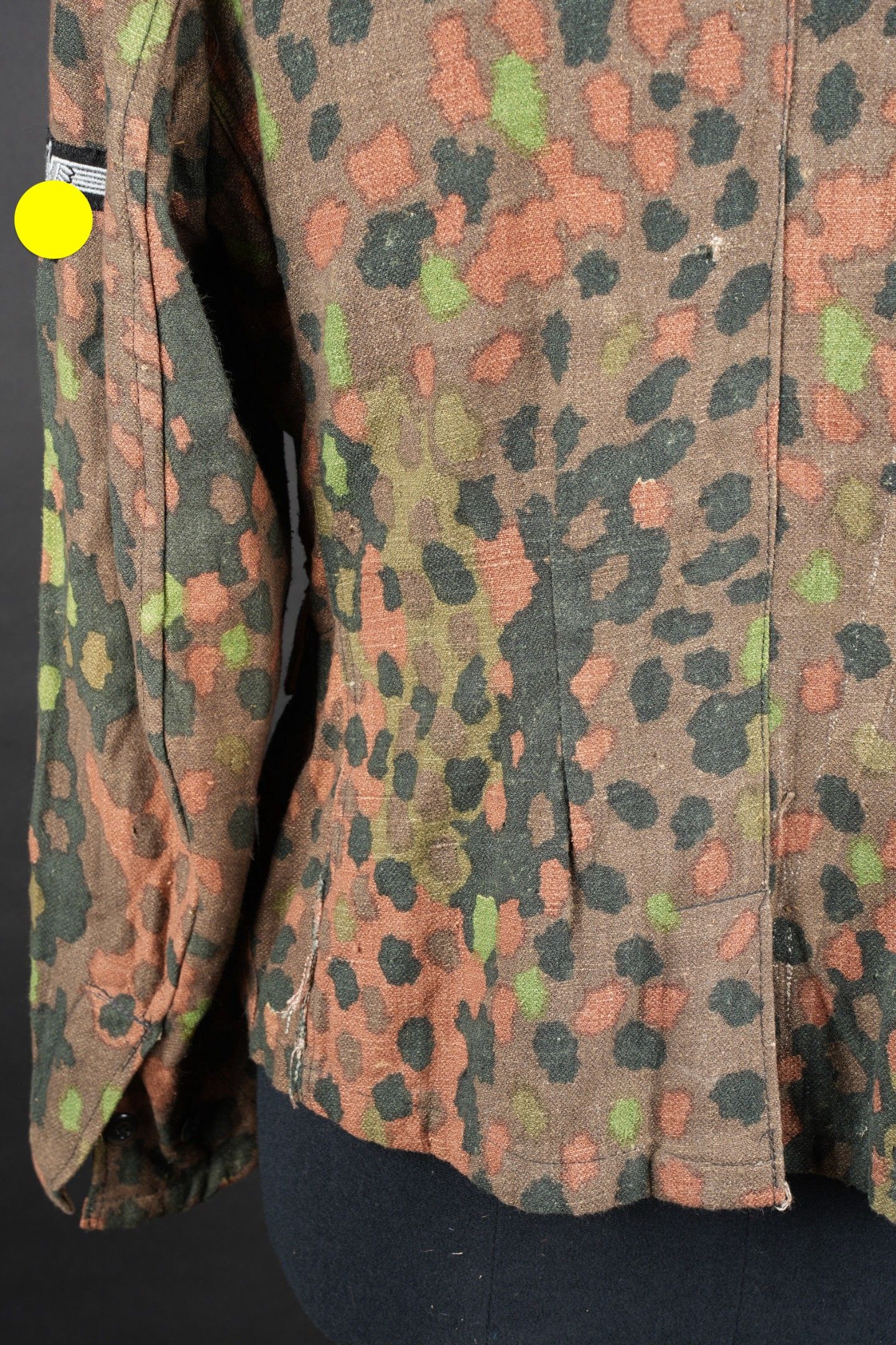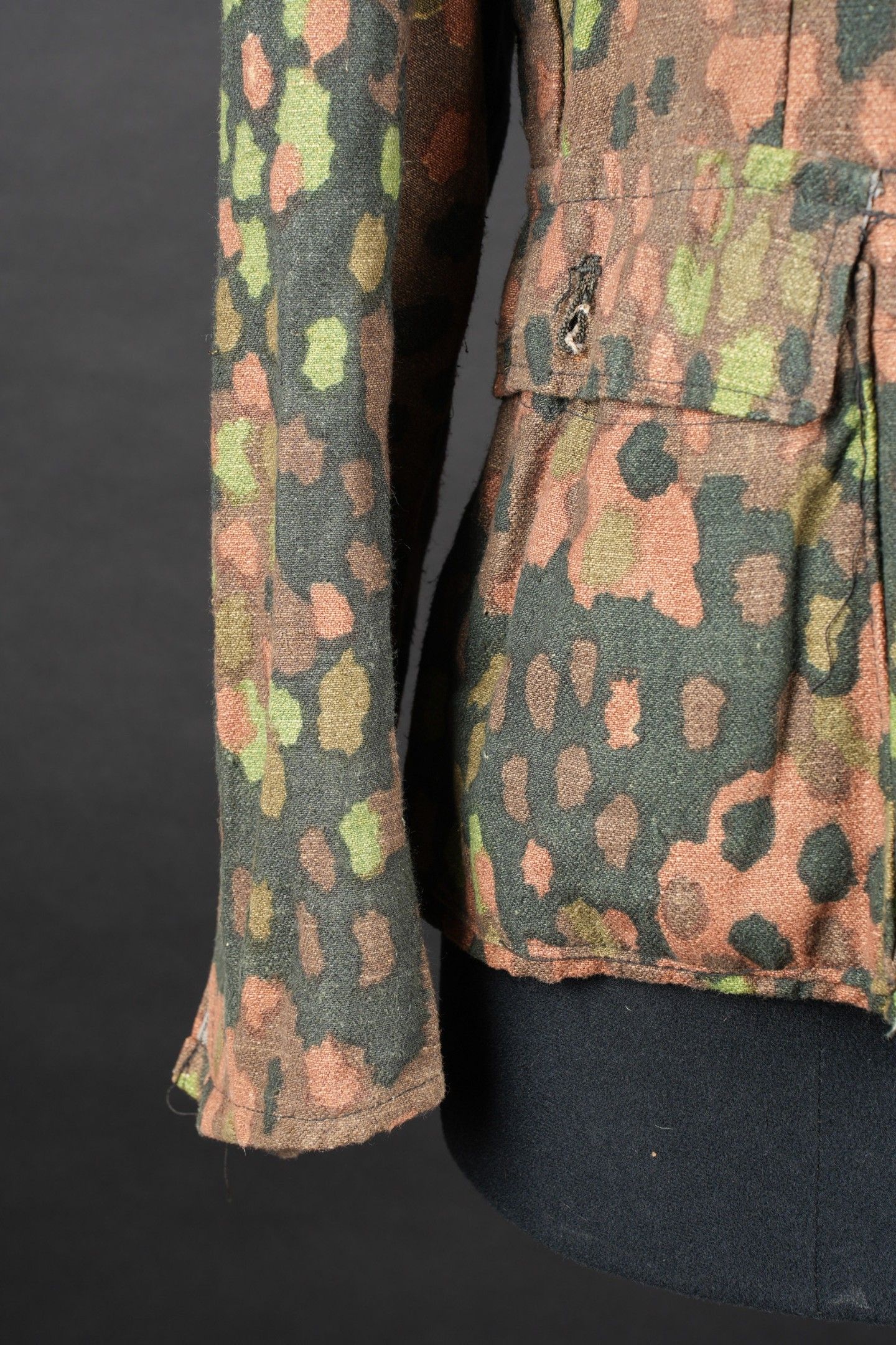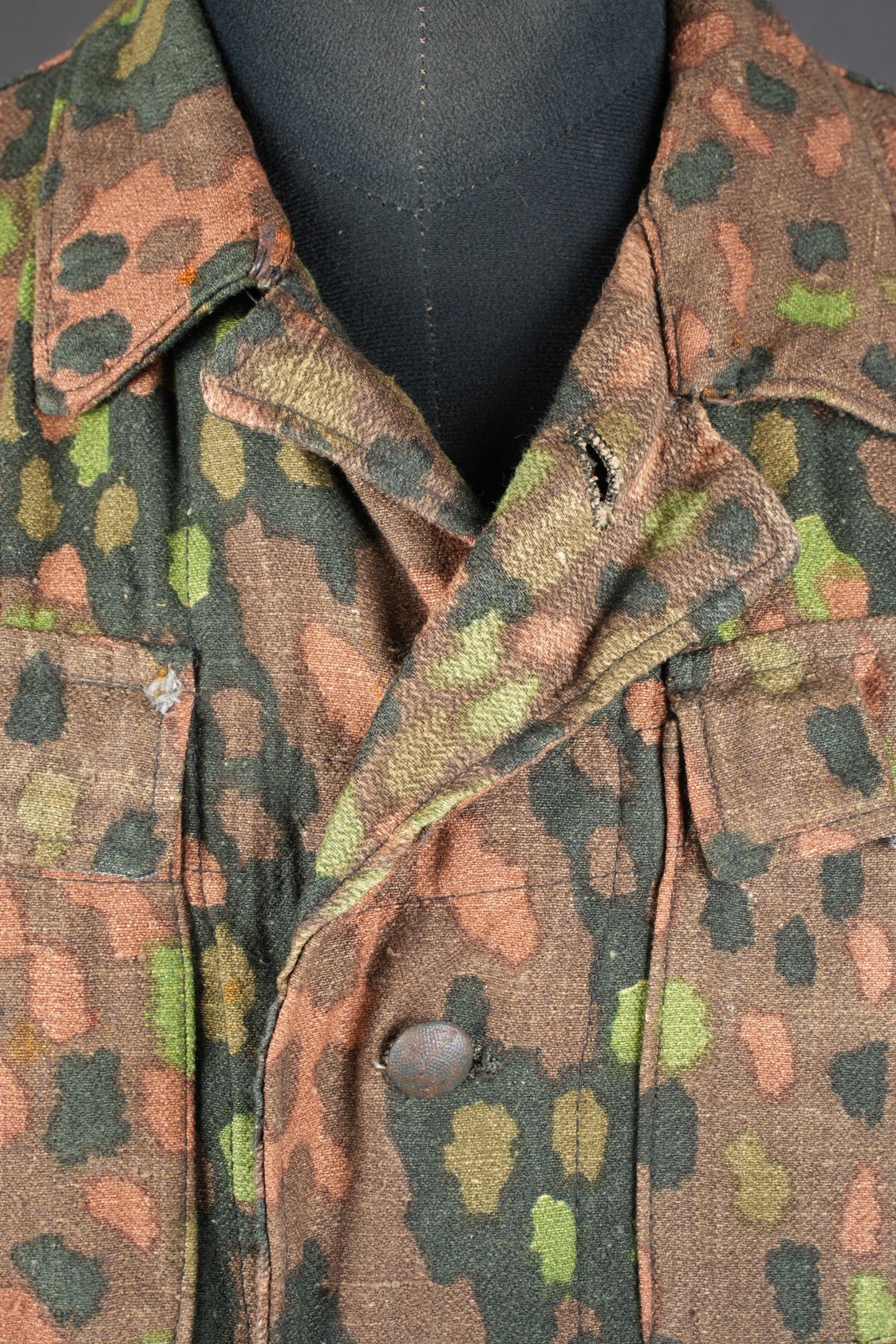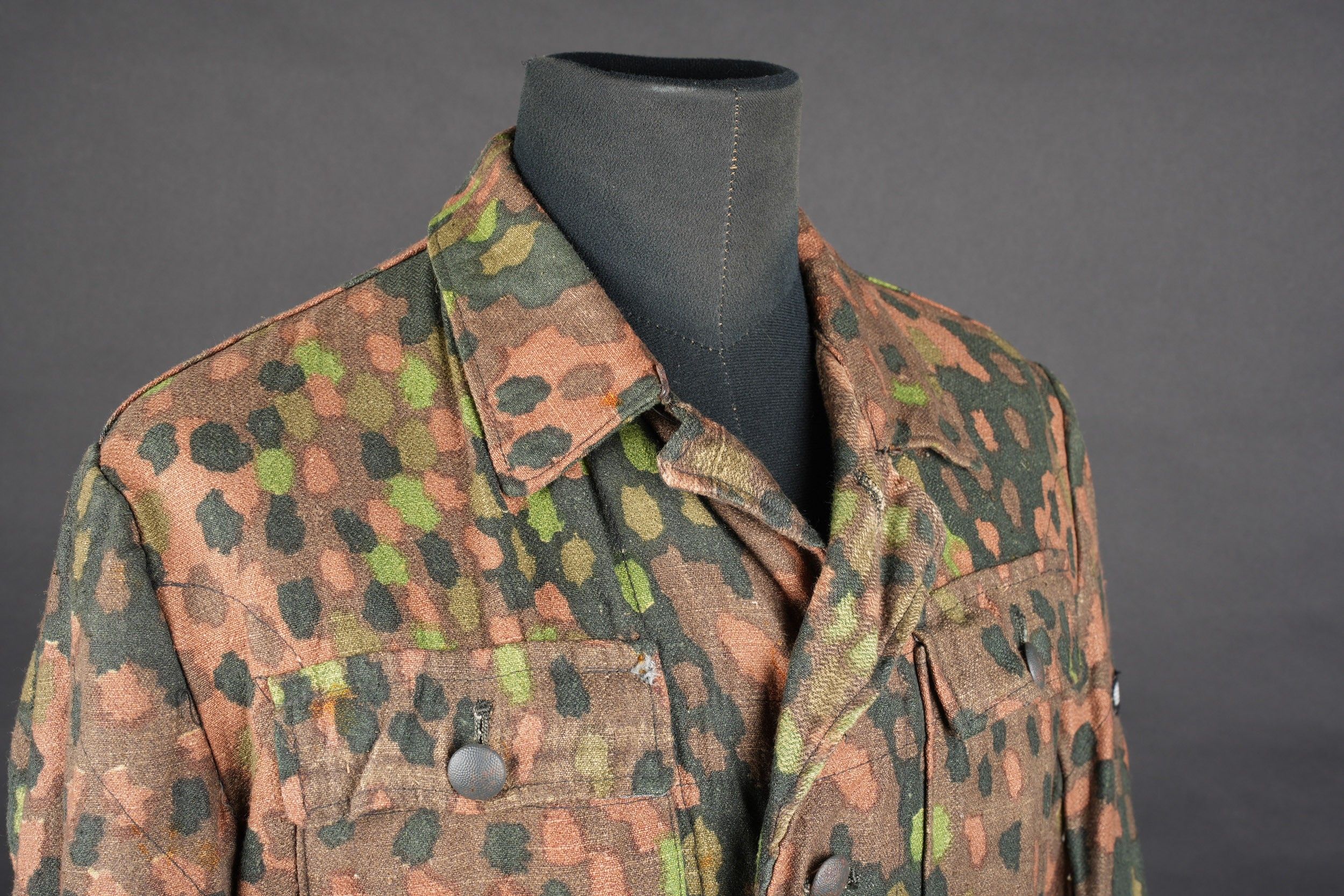 Vareuse petits pois SS. En tissu camouflé. Tous les boutons sont présents et en couleur d'origine. Il semble qu'ils ont été recousus. Couleurs très vives . Aigle de manche brodé cousu main au niveau de la manche gauche. Intérieur en parti doublé en tissu soyeux gris/bleu. Fabrication Betr Ra. Indication de taille 42 42 92 67 66. Couleurs très vives. A noter une légère usure et patine de la pièce. Etat I-. SS Pea Dot Tunic Made of camouflage fabric with all buttons present and retaining their original color. Buttons appear to have been resewn. Very bright colors. Hand-sewn sleeve eagle on the left arm. Partial lining in silky grey-blue fabric. Maker label Betr Ra with size markings 42 42 92 67 66. Colors exceptionally vivid. Slight wear and patina consistent with age. Condition I-.