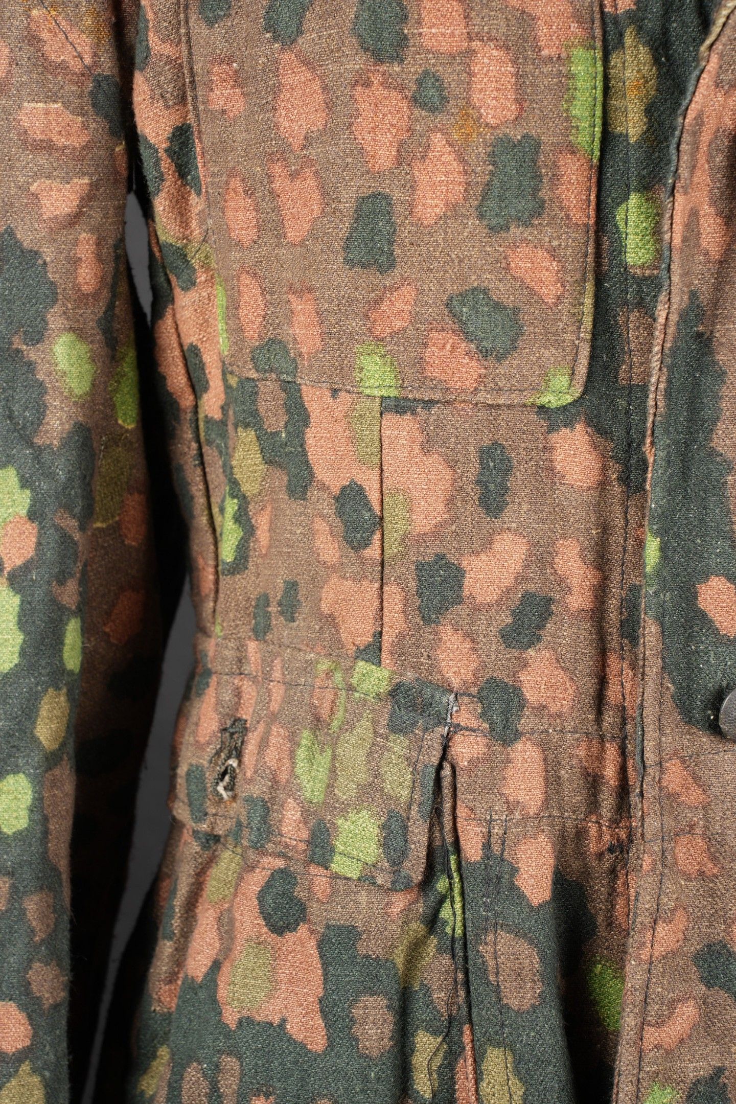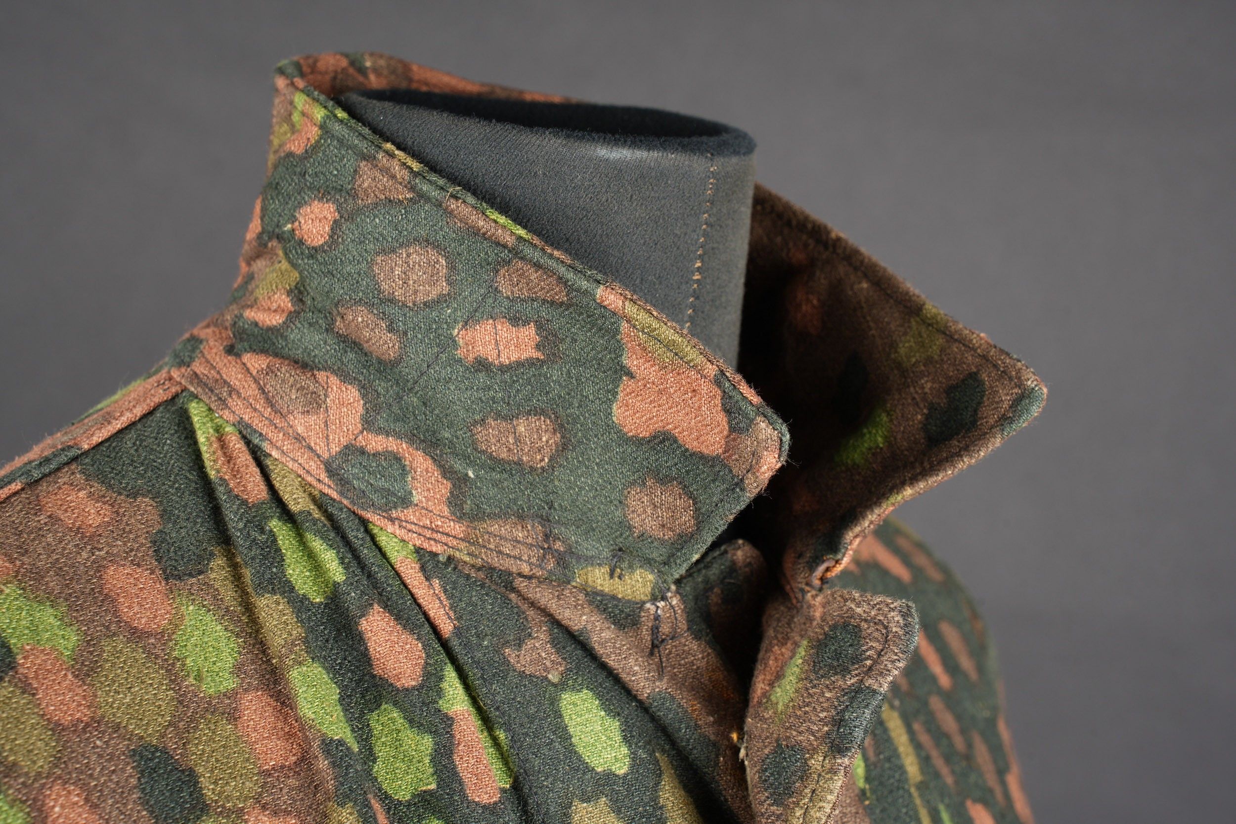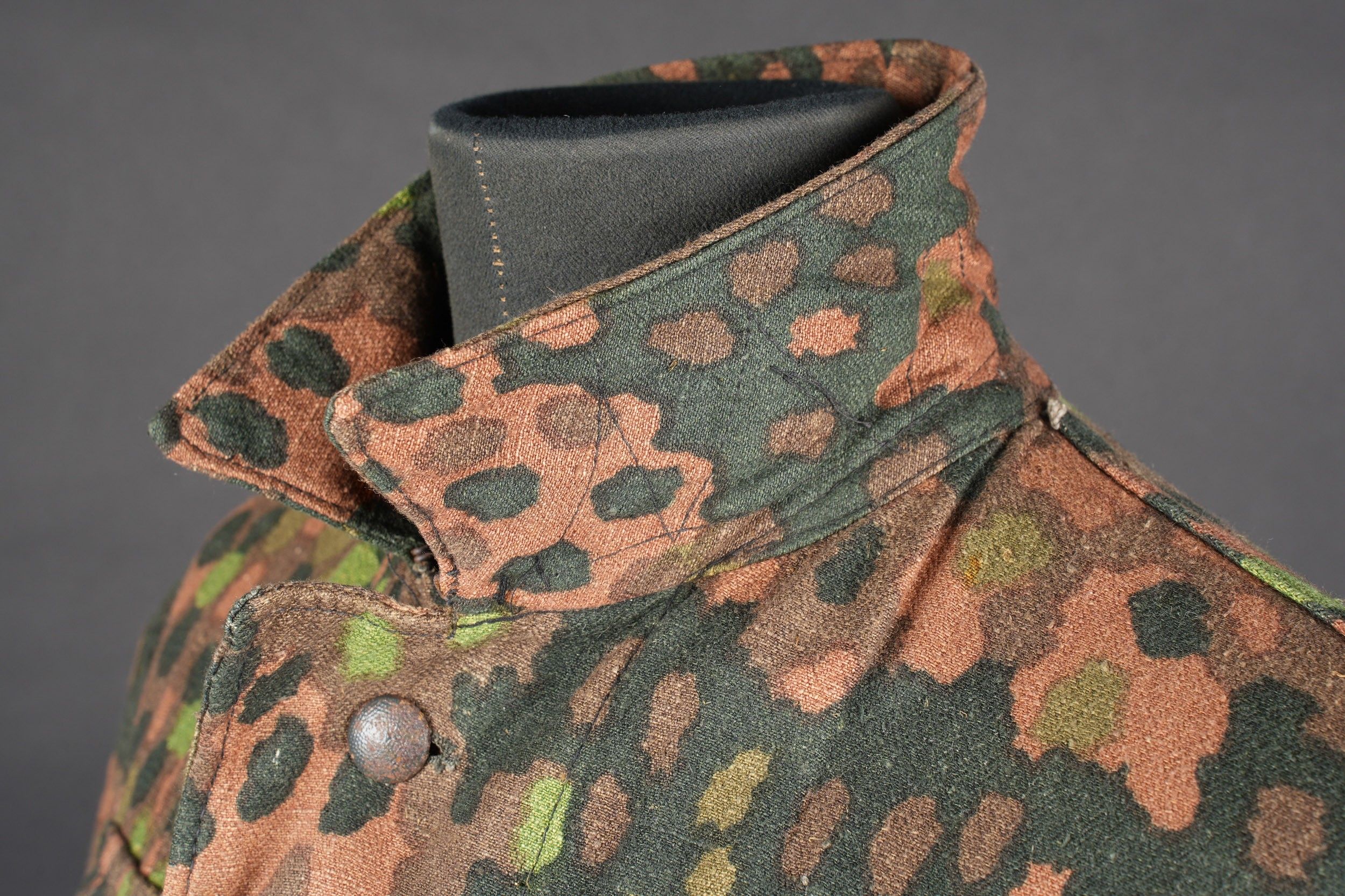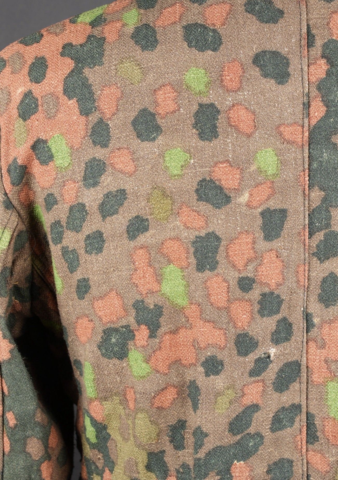 Vareuse petits pois SS. En tissu camouflé. Tous les boutons sont présents et en couleur d'origine. Il semble qu'ils ont été recousus. Couleurs très vives . Aigle de manche brodé cousu main au niveau de la manche gauche. Intérieur en parti doublé en tissu soyeux gris/bleu. Fabrication Betr Ra. Indication de taille 42 42 92 67 66. Couleurs très vives. A noter une légère usure et patine de la pièce. Etat I-. SS Pea Dot Tunic Made of camouflage fabric with all buttons present and retaining their original color. Buttons appear to have been resewn. Very bright colors. Hand-sewn sleeve eagle on the left arm. Partial lining in silky grey-blue fabric. Maker label Betr Ra with size markings 42 42 92 67 66. Colors exceptionally vivid. Slight wear and patina consistent with age. Condition I-.