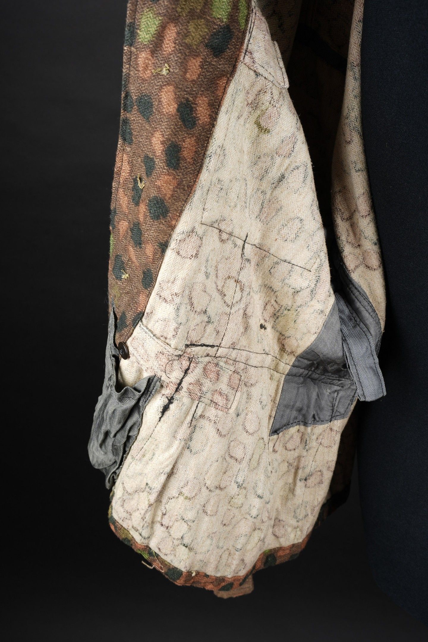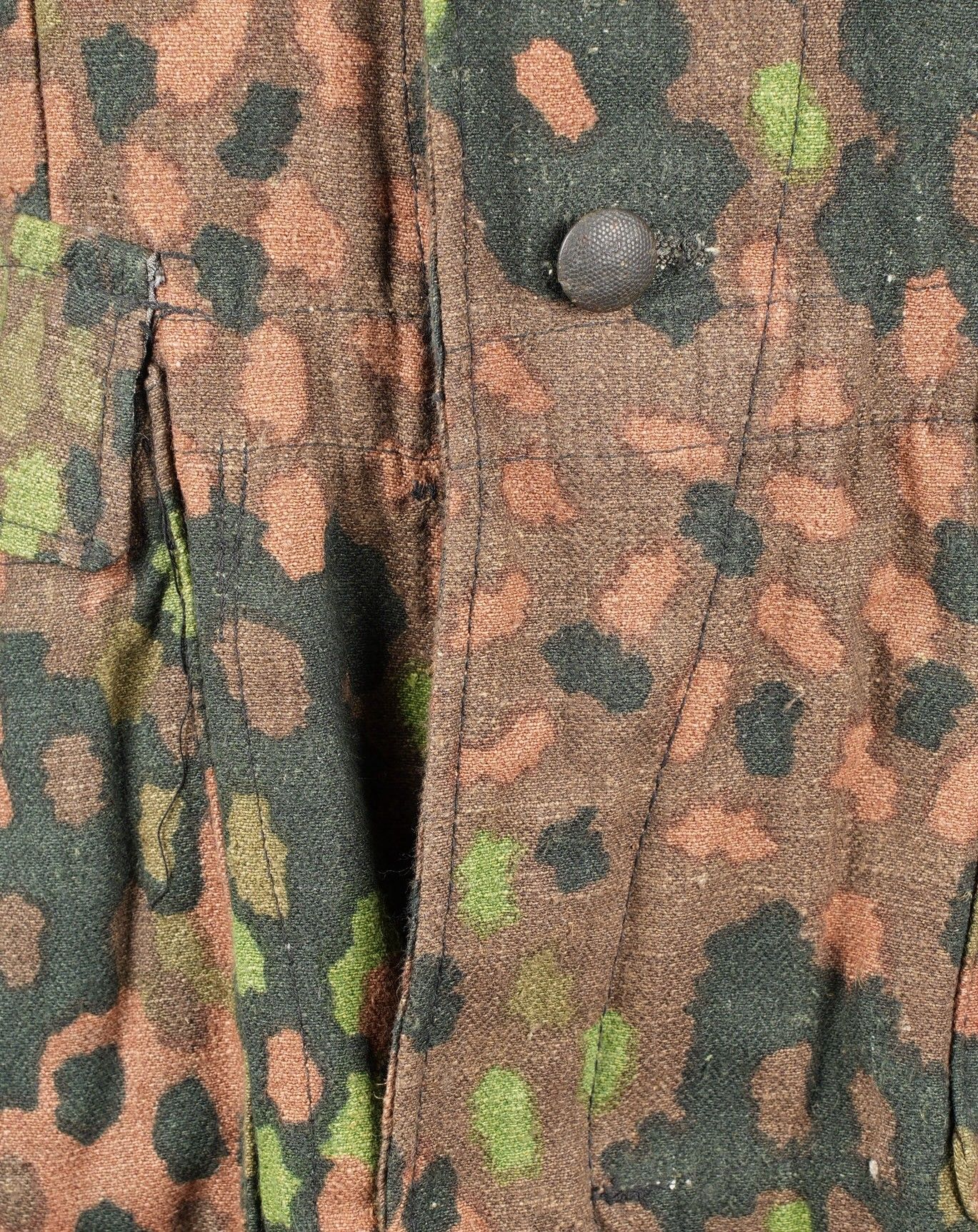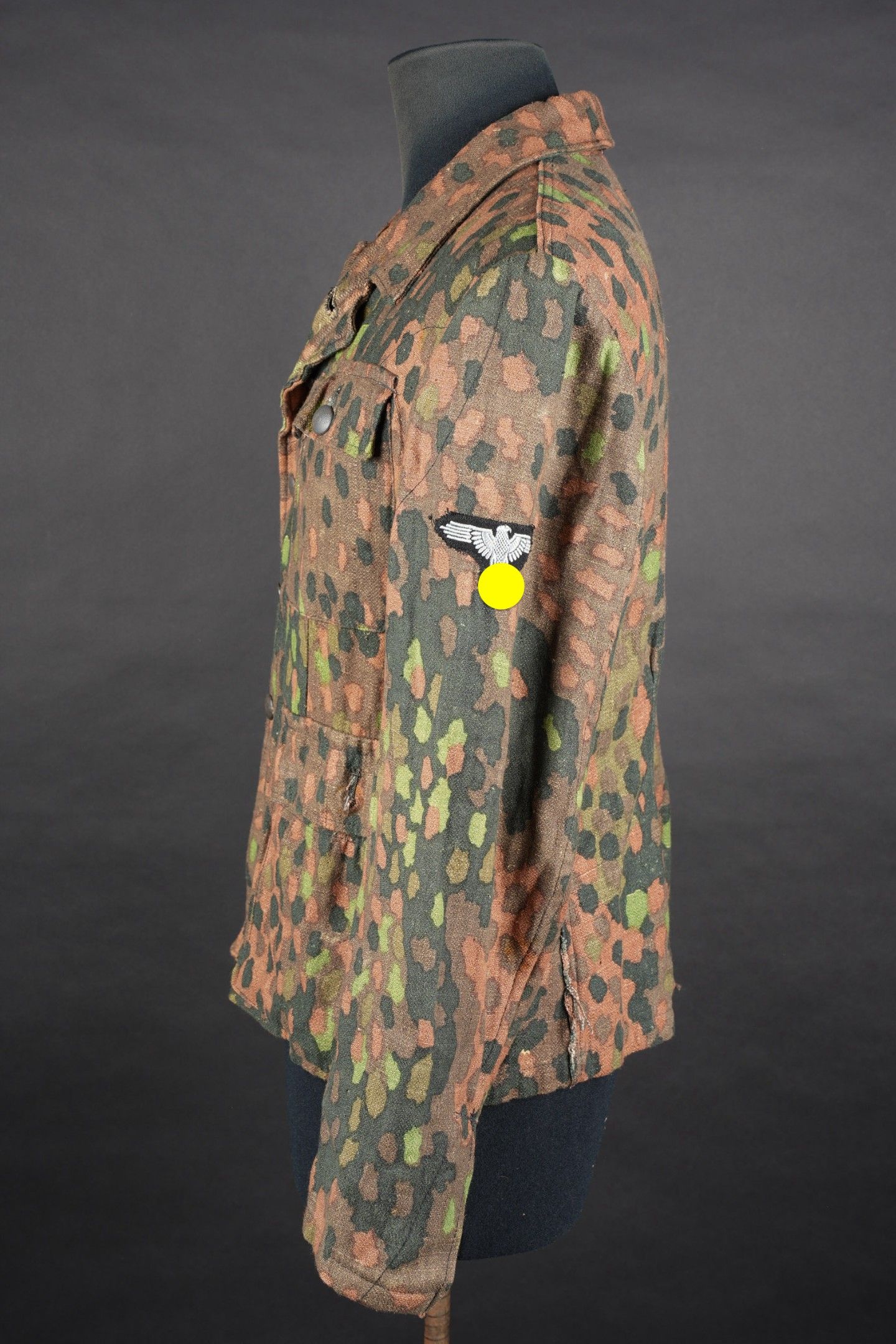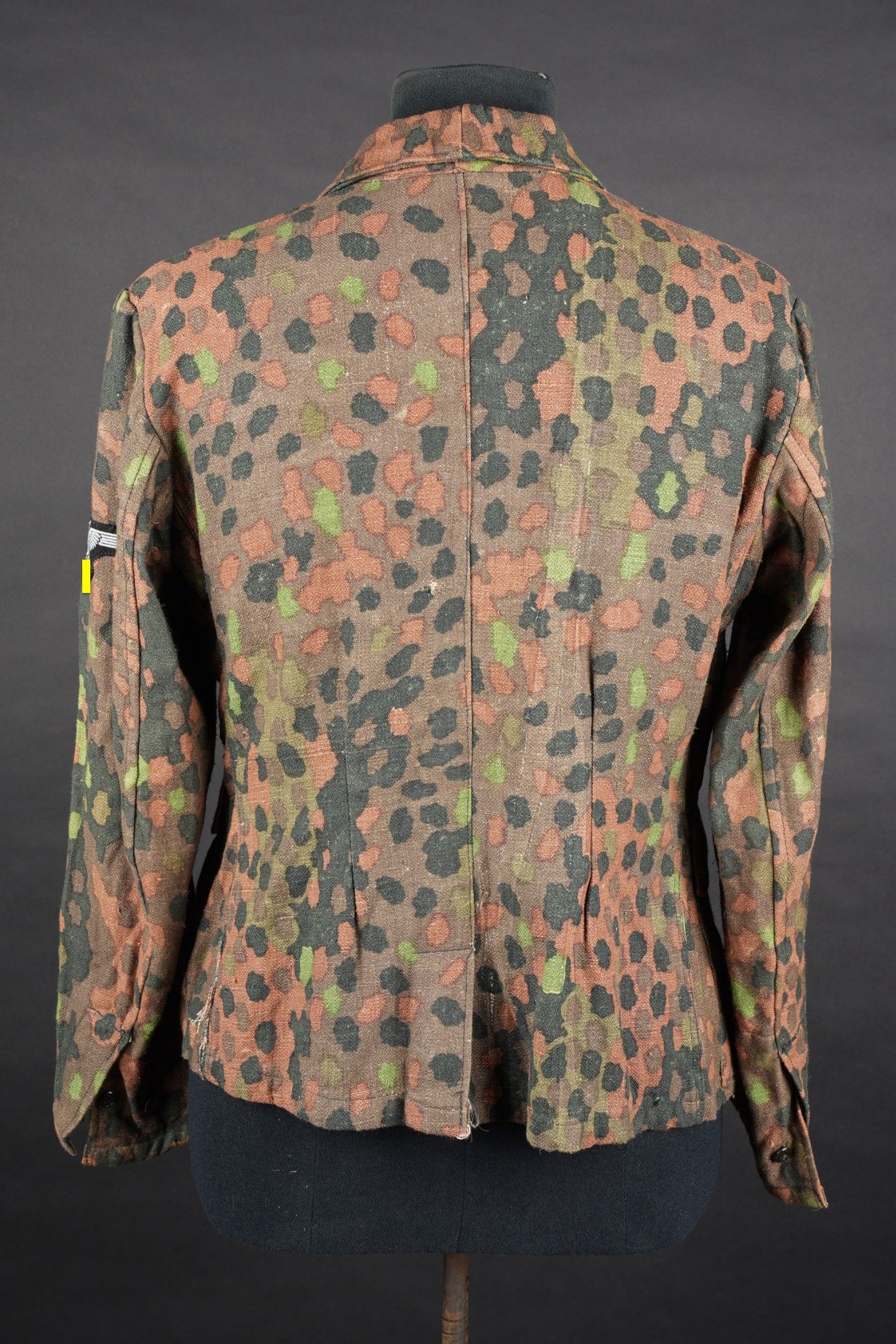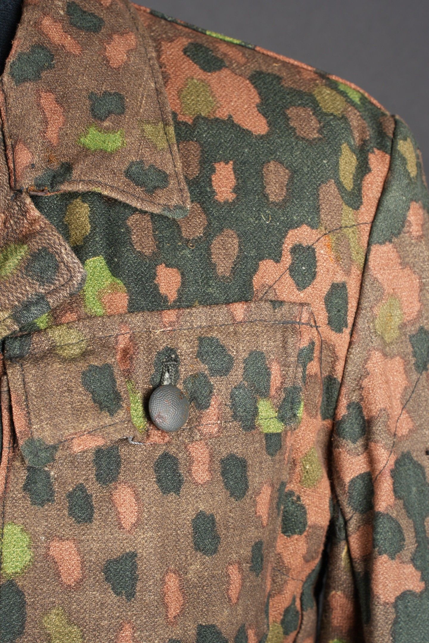 Vareuse petits pois SS. En tissu camouflé. Tous les boutons sont présents et en couleur d'origine. Il semble qu'ils ont été recousus. Couleurs très vives . Aigle de manche brodé cousu main au niveau de la manche gauche. Intérieur en parti doublé en tissu soyeux gris/bleu. Fabrication Betr Ra. Indication de taille 42 42 92 67 66. Couleurs très vives. A noter une légère usure et patine de la pièce. Etat I-. SS Pea Dot Tunic Made of camouflage fabric with all buttons present and retaining their original color. Buttons appear to have been resewn. Very bright colors. Hand-sewn sleeve eagle on the left arm. Partial lining in silky grey-blue fabric. Maker label Betr Ra with size markings 42 42 92 67 66. Colors exceptionally vivid. Slight wear and patina consistent with age. Condition I-.
