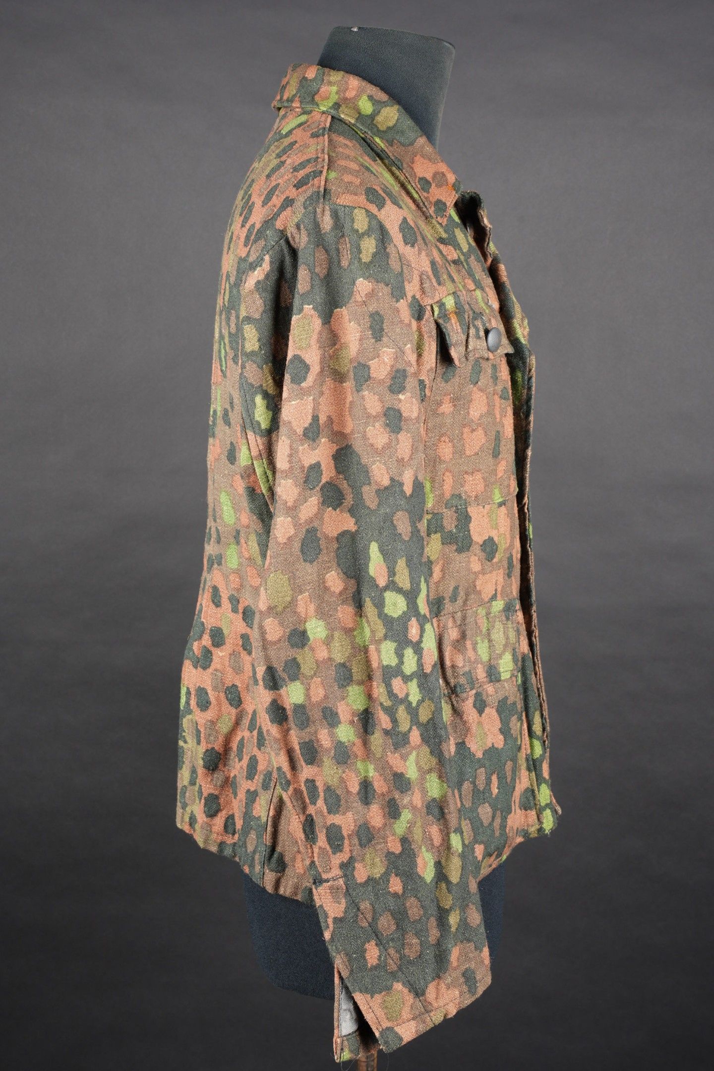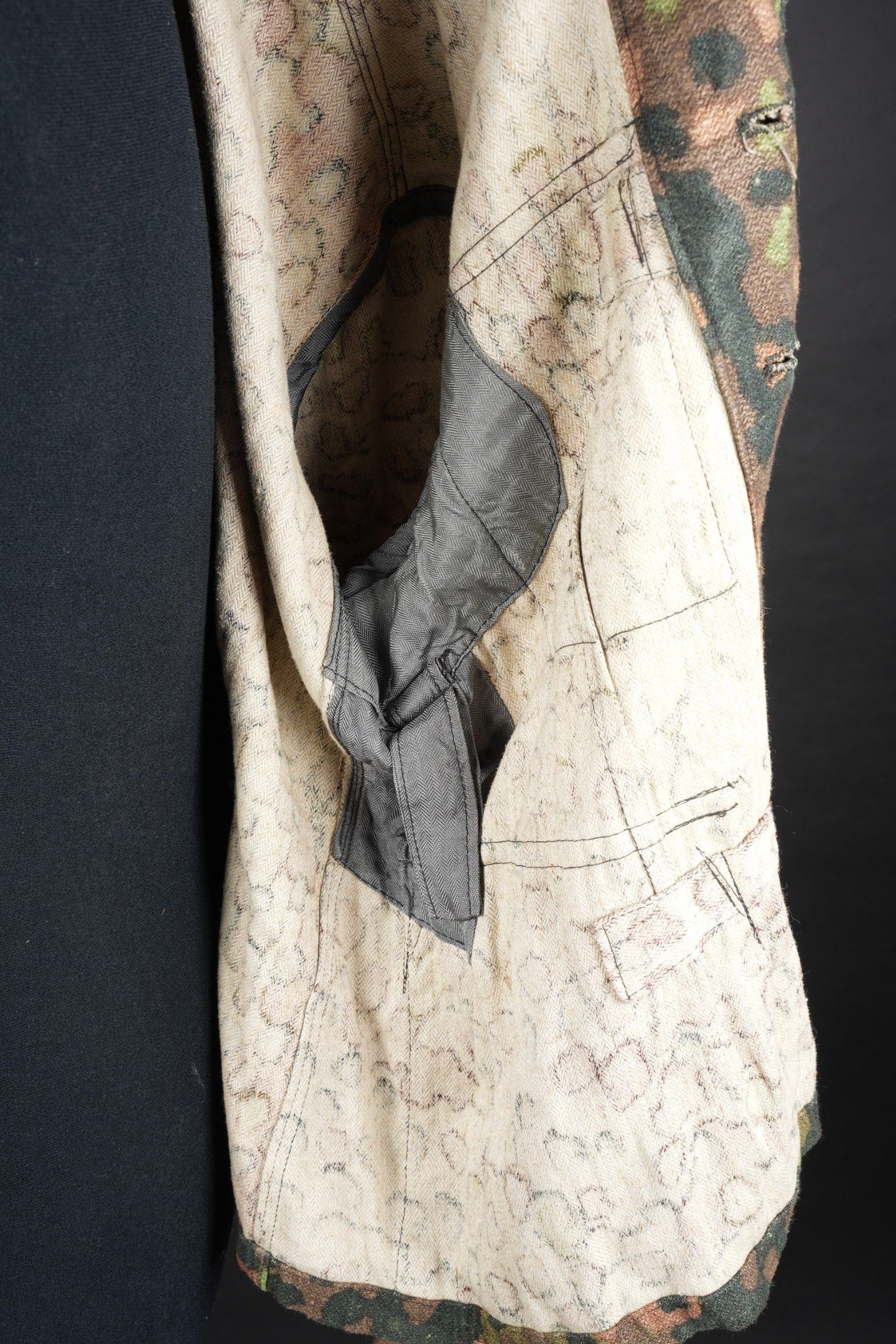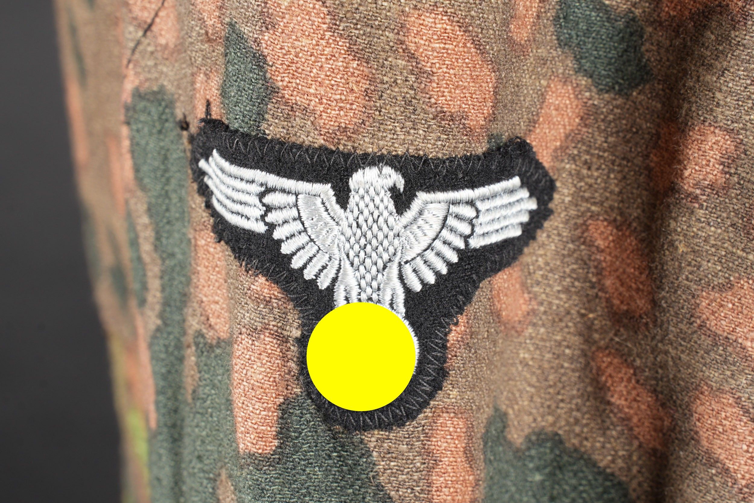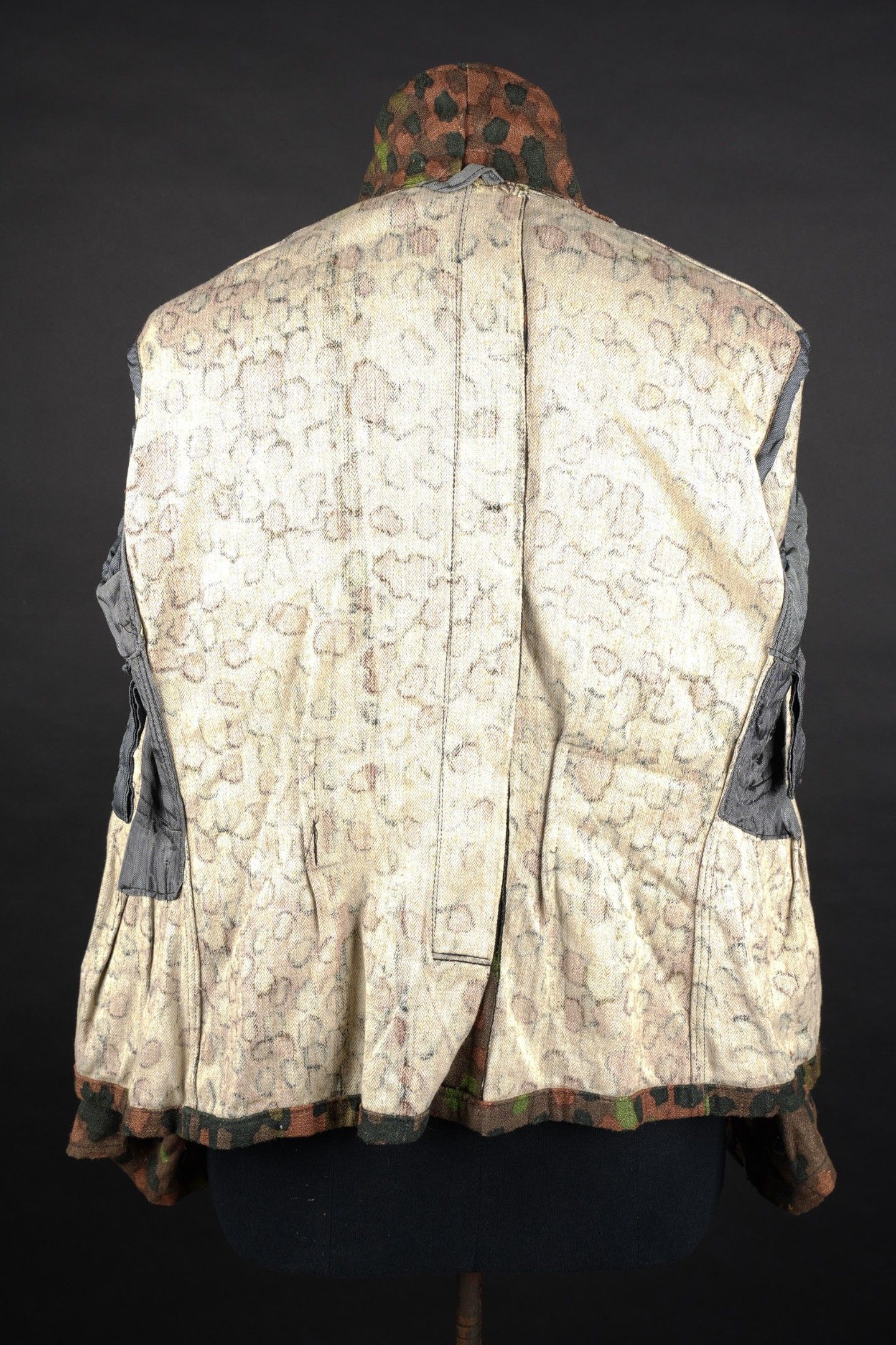 Vareuse petits pois SS. En tissu camouflé. Tous les boutons sont présents et en couleur d'origine. Il semble qu'ils ont été recousus. Couleurs très vives . Aigle de manche brodé cousu main au niveau de la manche gauche. Intérieur en parti doublé en tissu soyeux gris/bleu. Fabrication Betr Ra. Indication de taille 42 42 92 67 66. Couleurs très vives. A noter une légère usure et patine de la pièce. Etat I-. SS Pea Dot Tunic Made of camouflage fabric with all buttons present and retaining their original color. Buttons appear to have been resewn. Very bright colors. Hand-sewn sleeve eagle on the left arm. Partial lining in silky grey-blue fabric. Maker label Betr Ra with size markings 42 42 92 67 66. Colors exceptionally vivid. Slight wear and patina consistent with age. Condition I-.