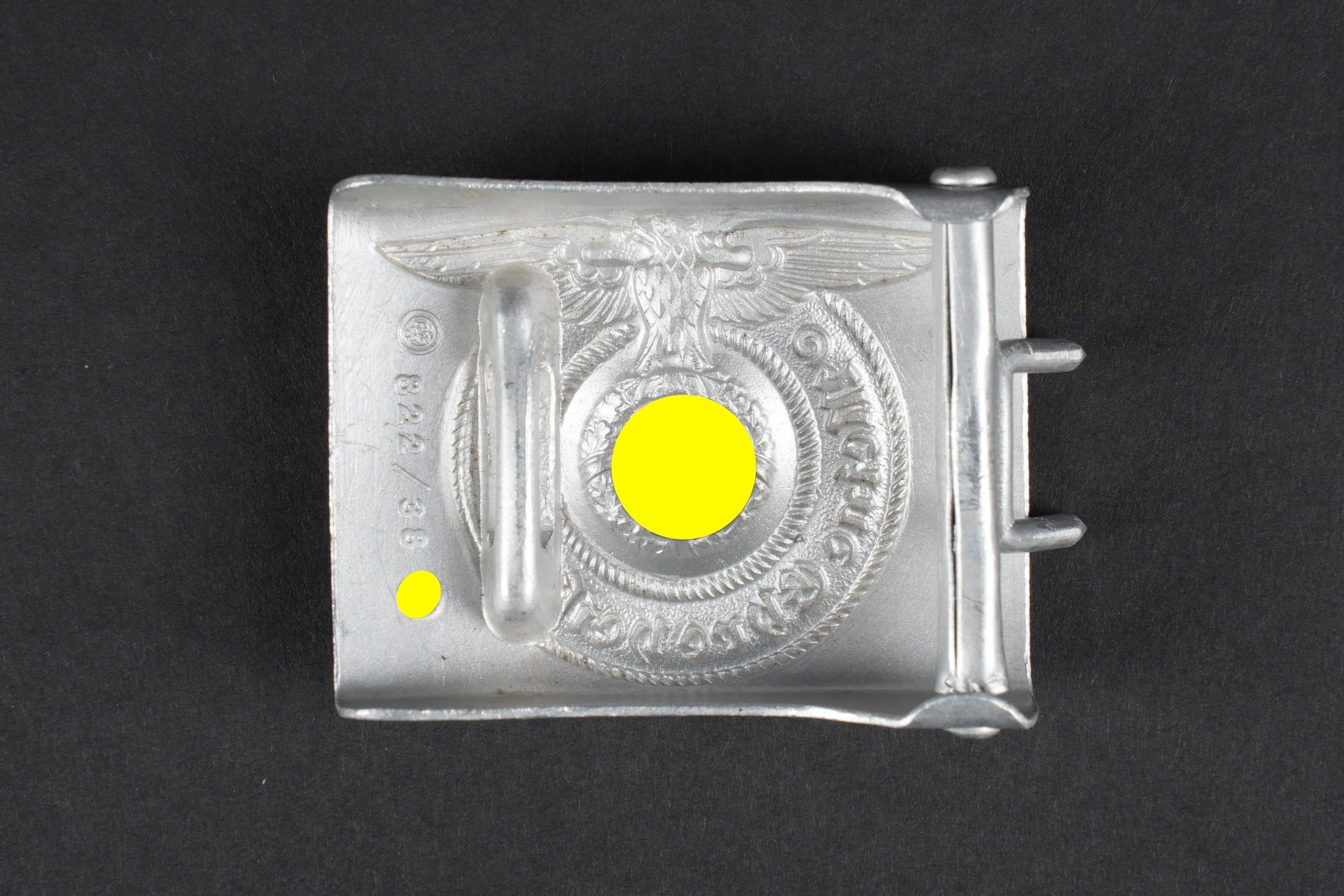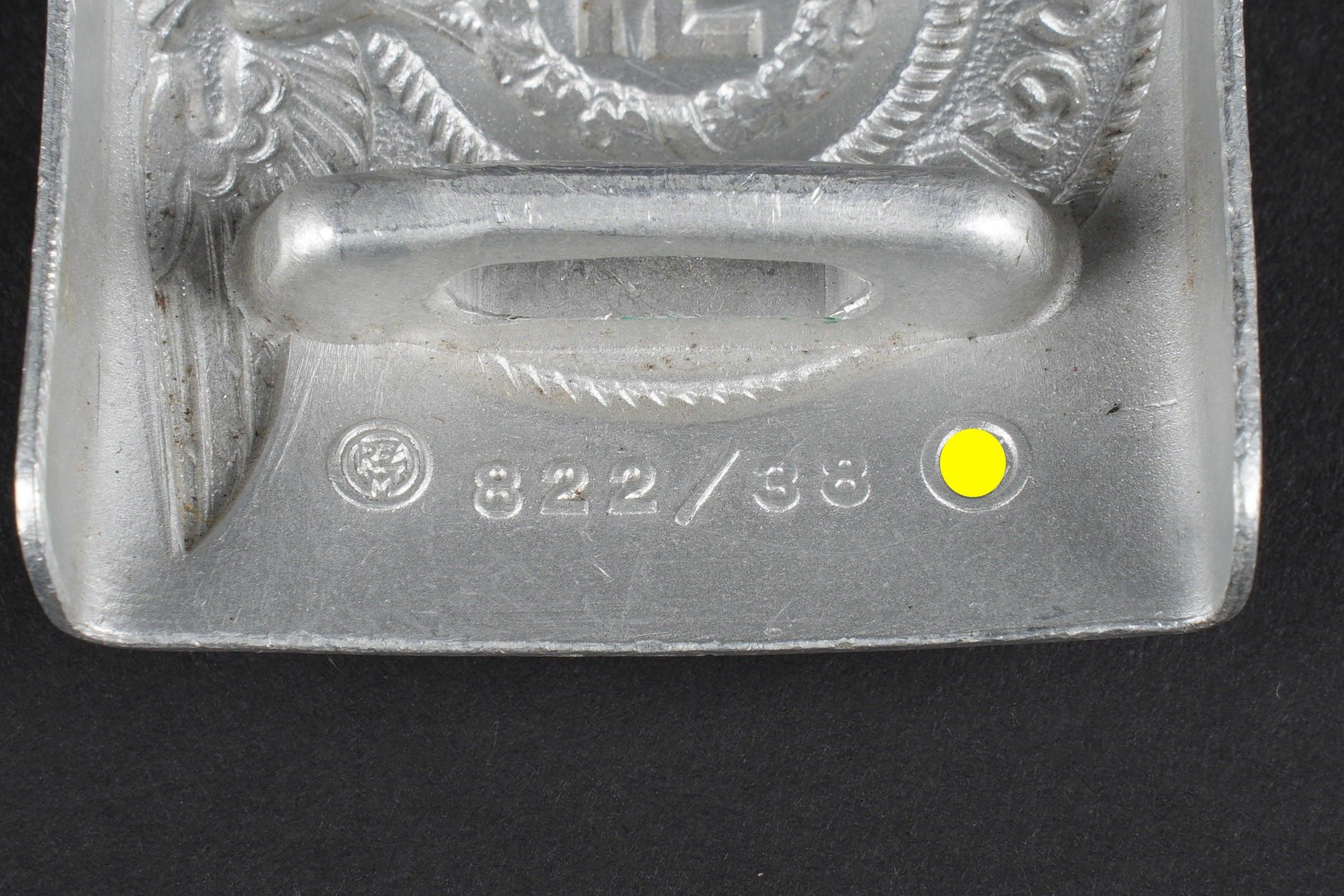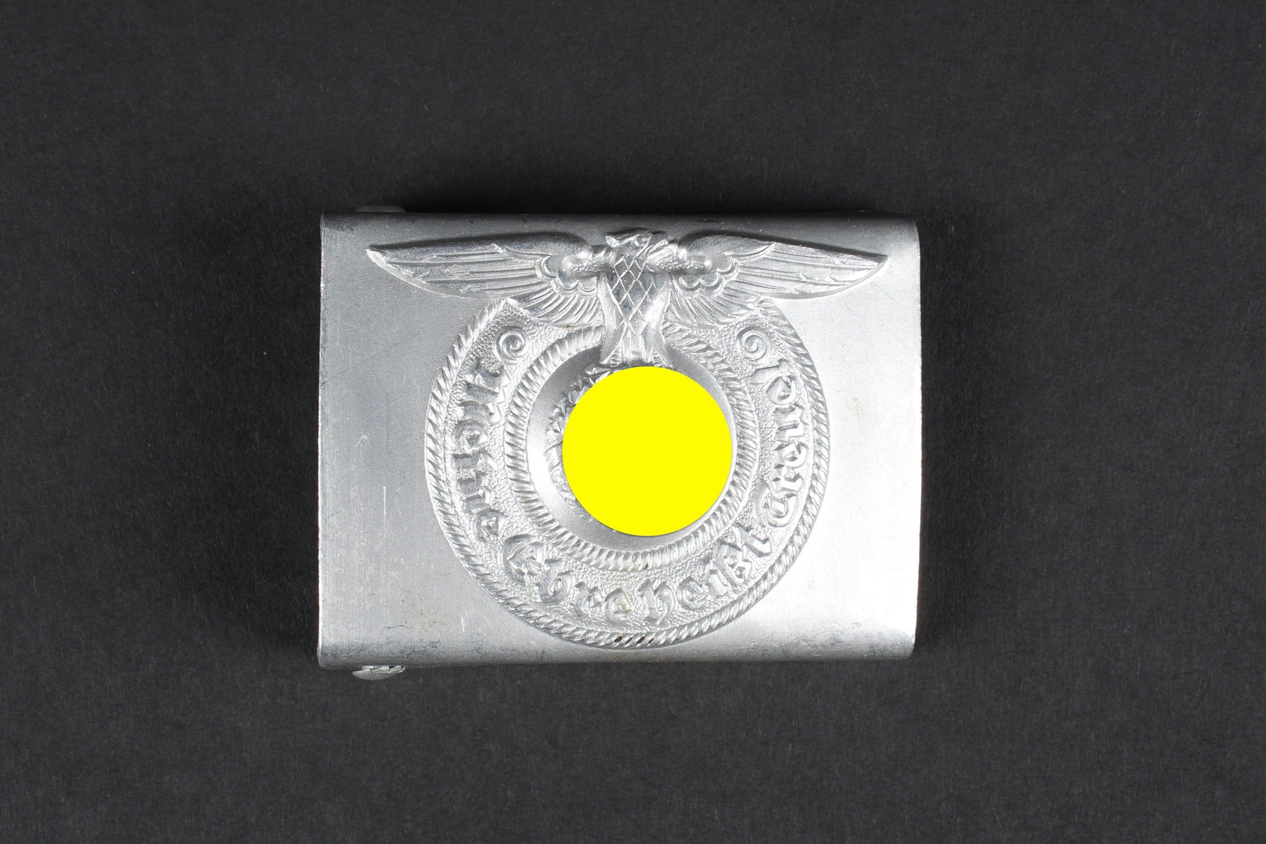 Boucle de ceinturon SS. En aluminium, couleur argenté en très bon état. Boucle à deux ardillons présente. Fabrication RZM 822/38 SS, correspondant au fabricant Richard Sieper or C.T. Dicke. A noter une légère usure et patine de la pièce. Etat I-. SS Belt Buckle Made of aluminum with silver finish in very good condition. Double-prong type. Marked RZM 822/38 SS corresponding to the manufacturer Richard Sieper or C.T. Dicke. Light wear and patina consistent with age. Condition I-.