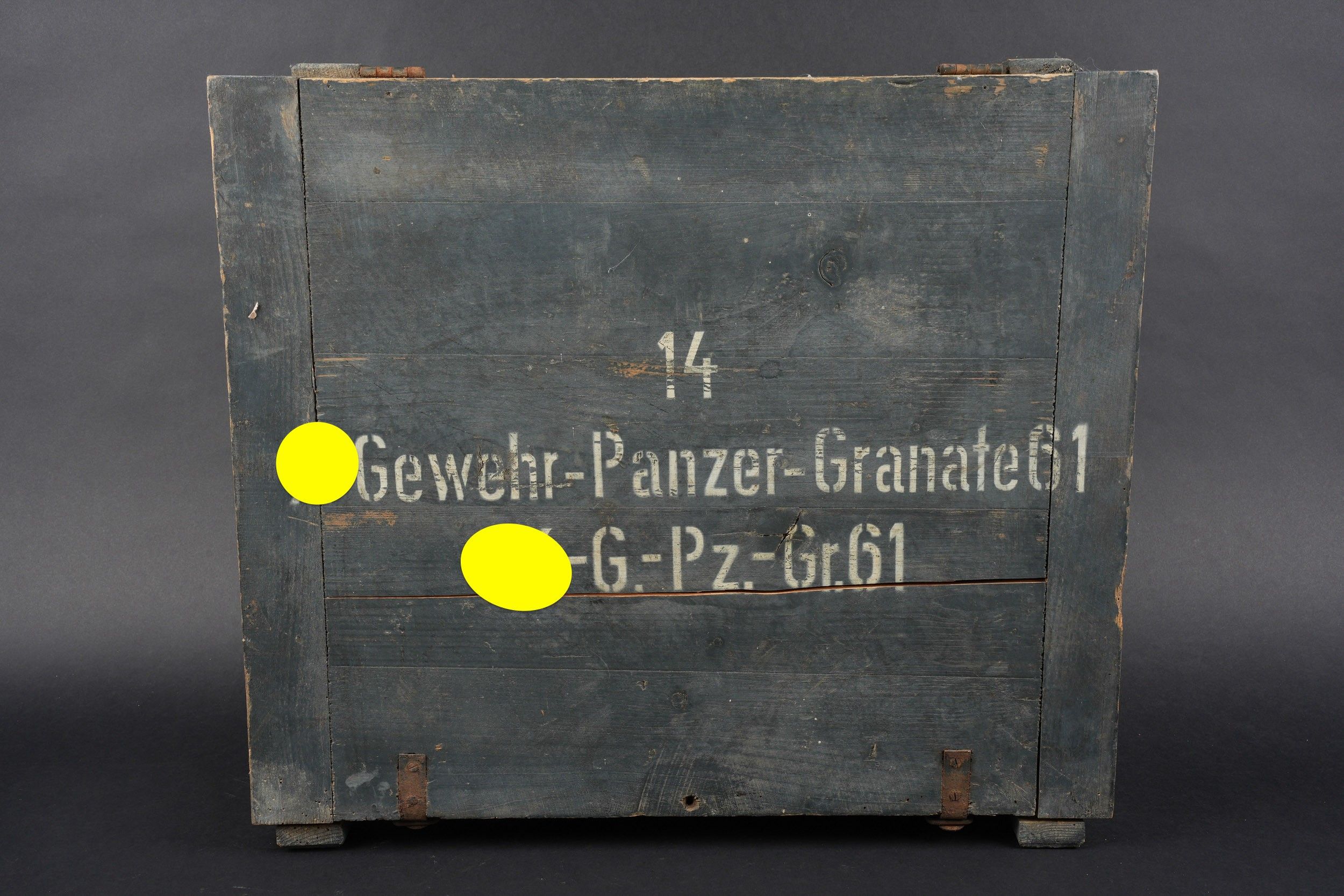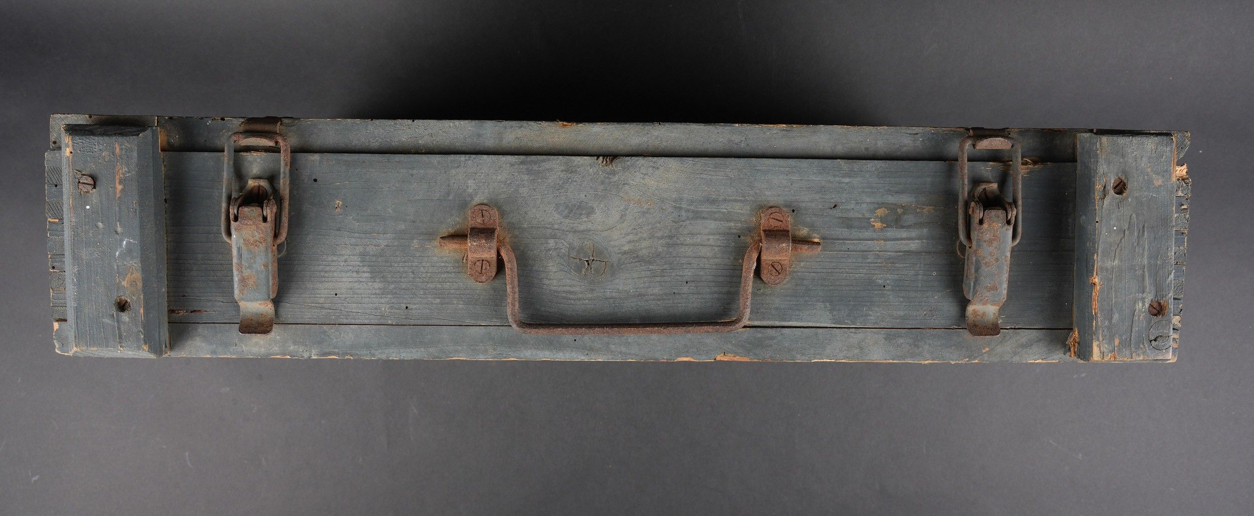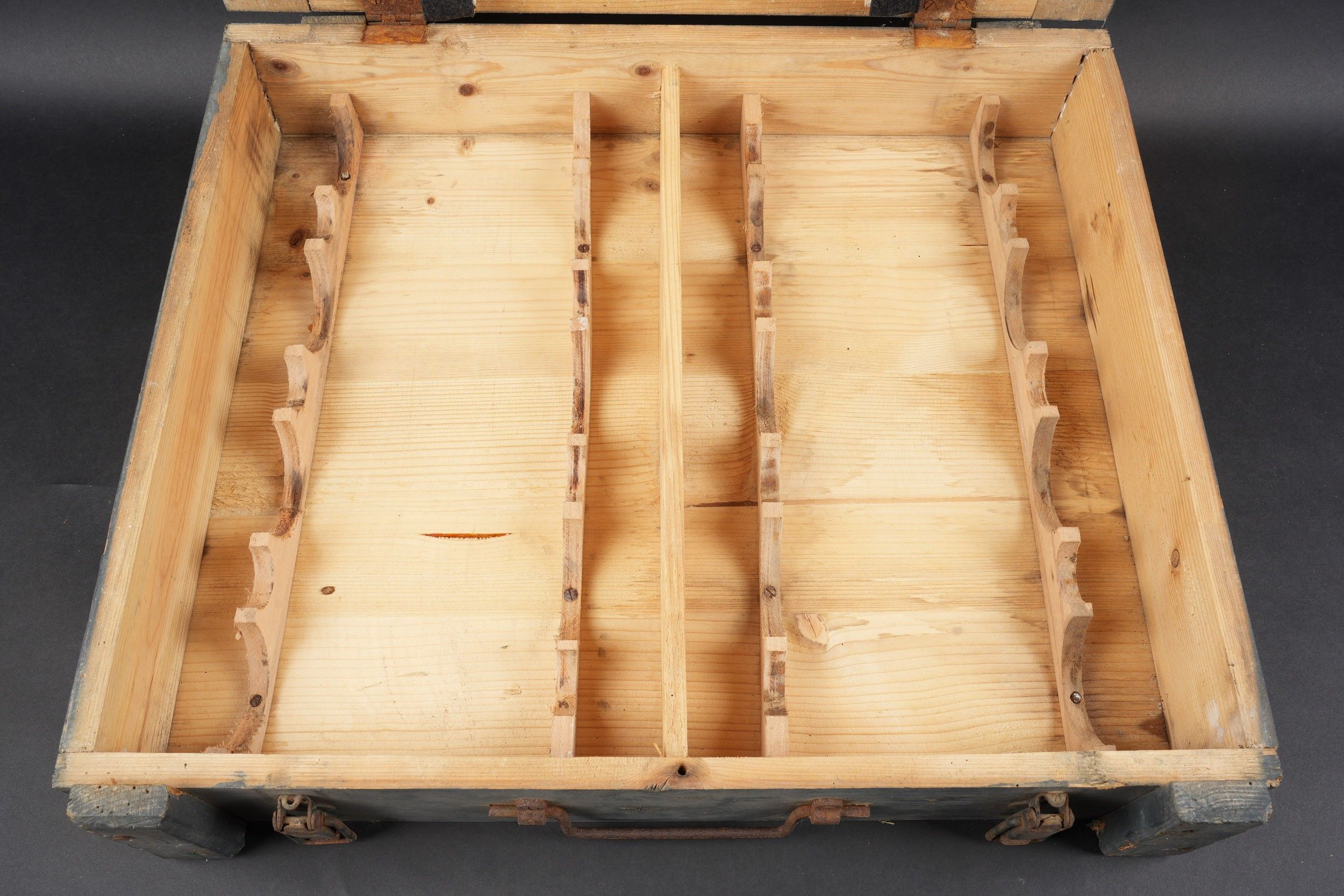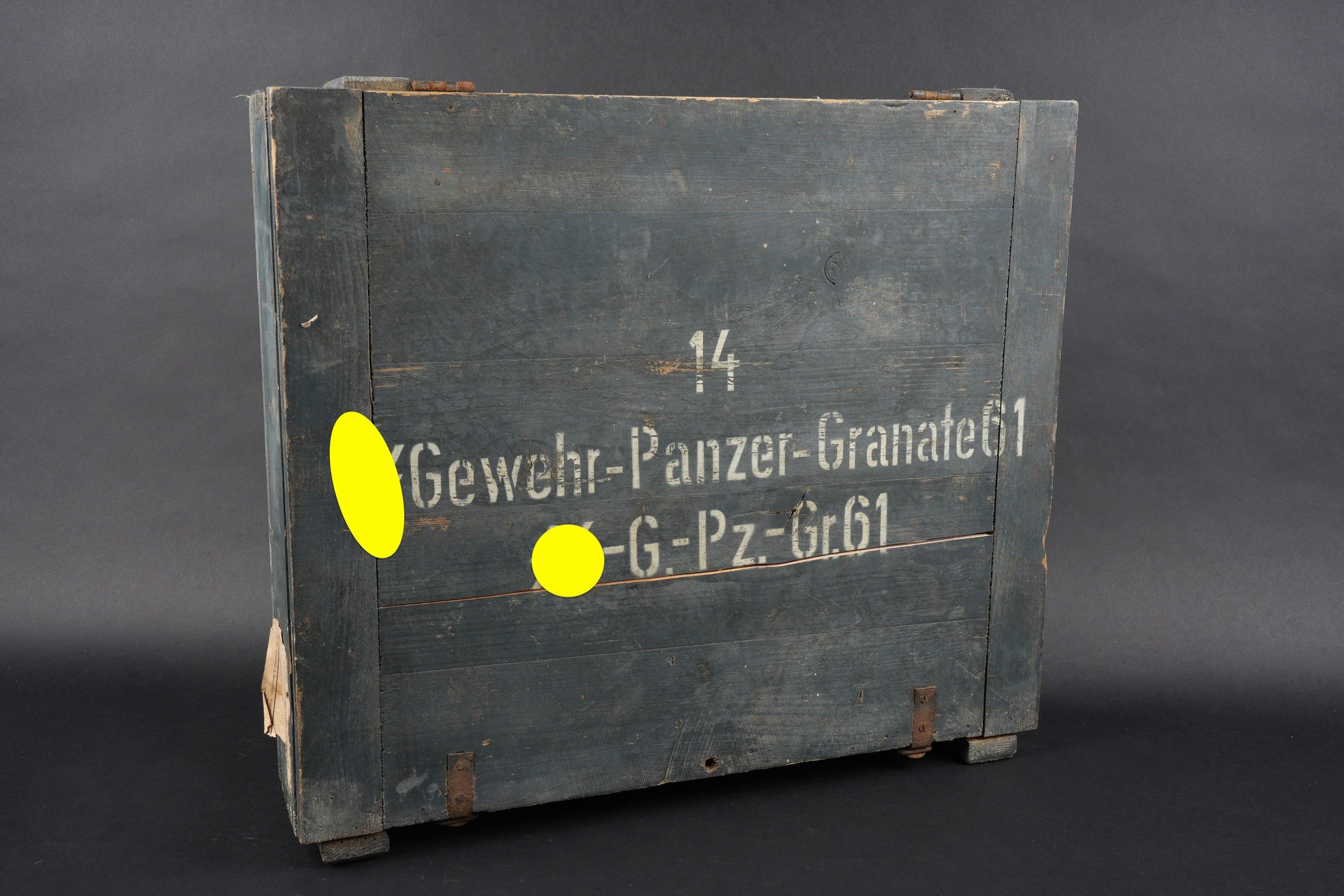 Caisse à grenade SS. En bois. Quelques manques visibles sur les côtés. Couleur d'origine à 80%. Couvercle marqué 14 SS Gewehr Panzer Granate 61 SS G PS GR 61. Poignée de transport et crochets de fermeture oxydés. Couvercle disposant de renfort en bois, doublé de drap noir. Etiquette marquée 14 Stück SS G PZ GR 61 DOV, datée 1943. Les racks interne sont présents. A noter une certaine usure et patine de la pièce. Etat II+. SS Grenade Box Made of wood with some visible chips along the edges. Retains about 80% of its original color. Lid marked 14 SS Gewehr Panzer Granate 61 SS G PS GR 61. Transport handle and metal latches oxidized. Lid reinforced with wooden strips lined in black cloth. Label marked 14 Stück SS G PZ GR 61 DOV dated 1943. Internal racks intact. Some wear and patina consistent with age. Condition II+.