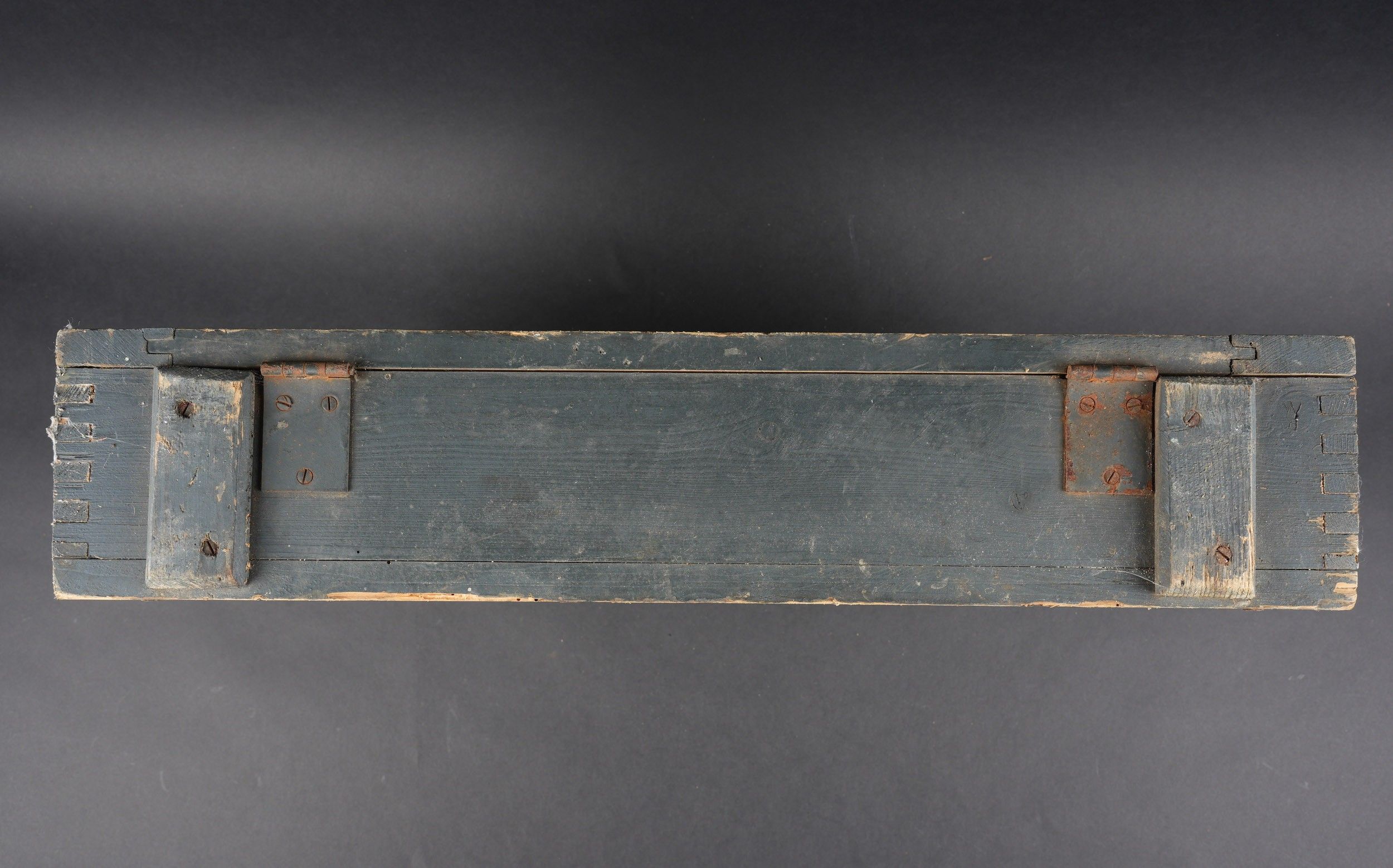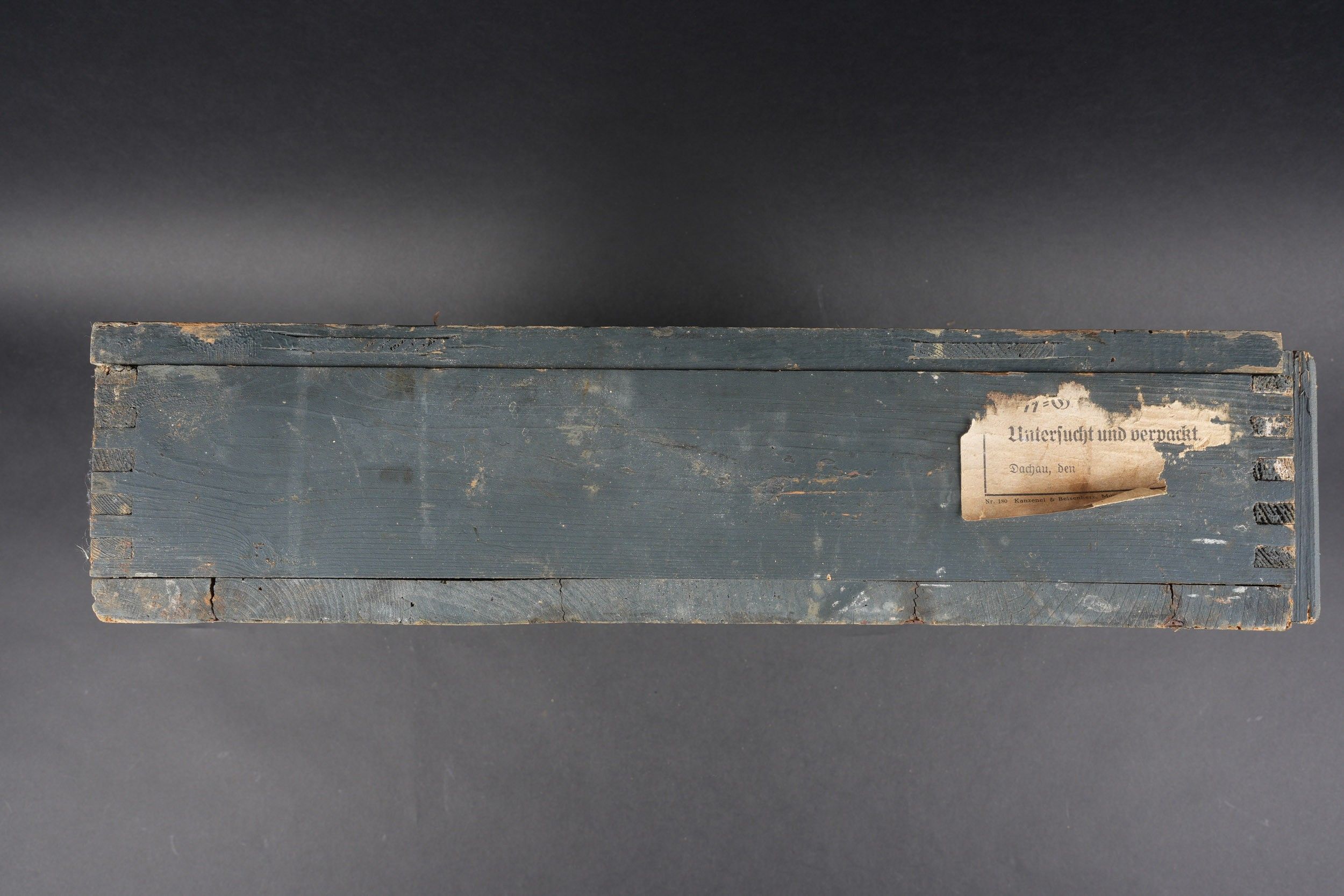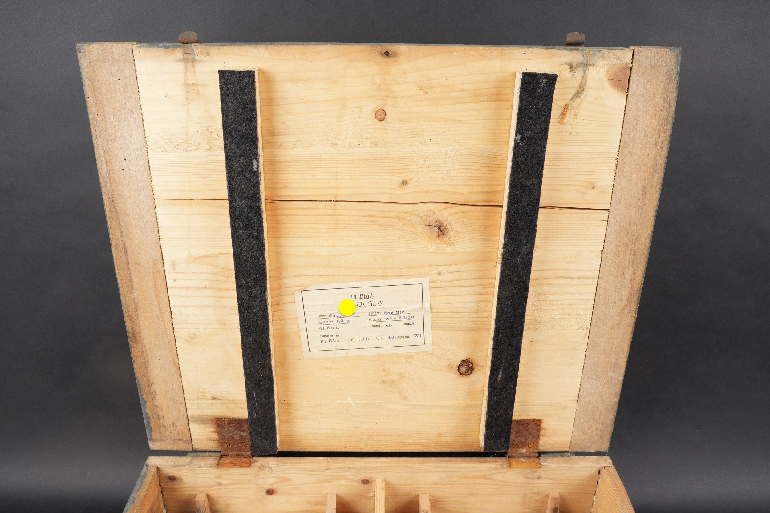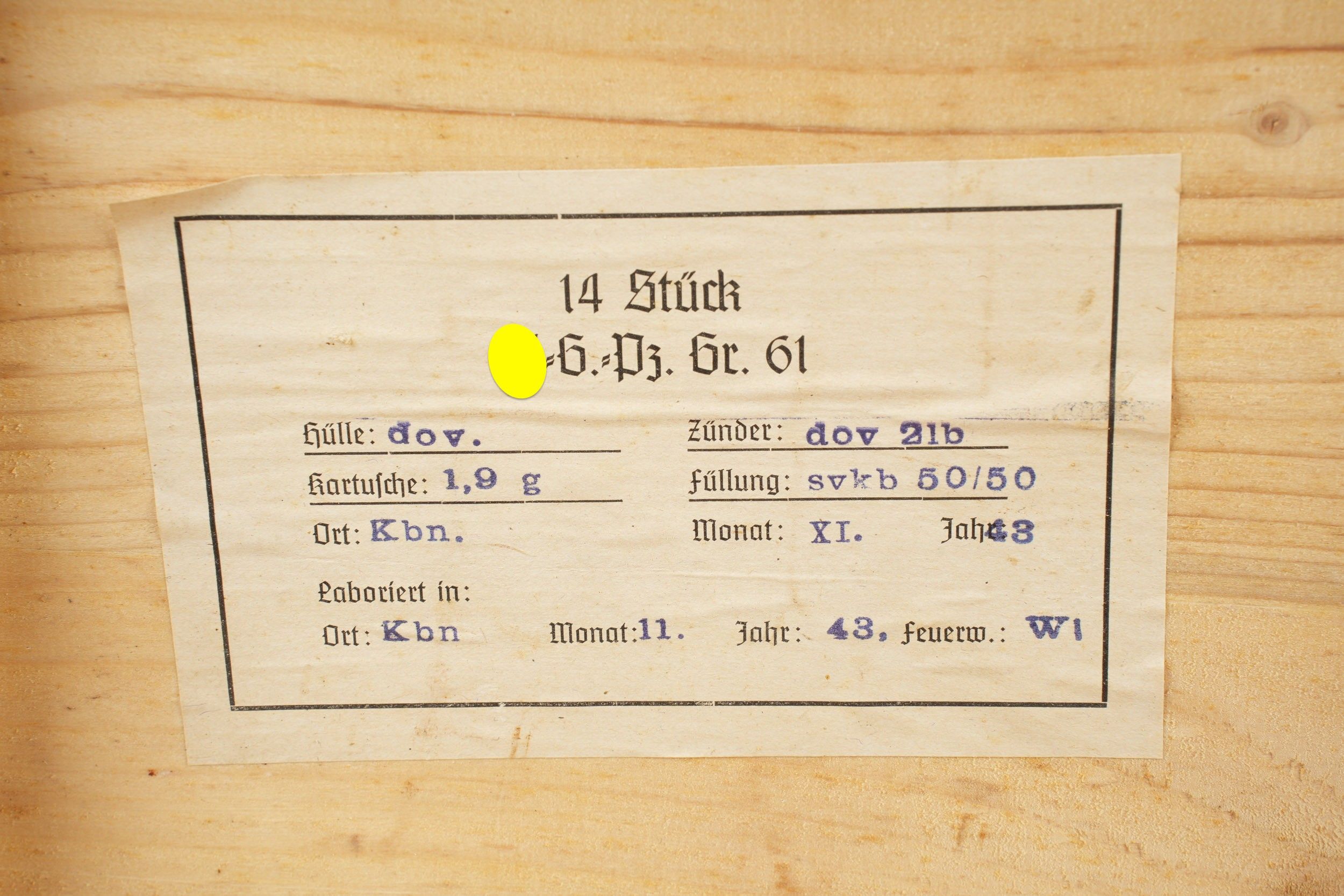 Caisse à grenade SS. En bois. Quelques manques visibles sur les côtés. Couleur d'origine à 80%. Couvercle marqué 14 SS Gewehr Panzer Granate 61 SS G PS GR 61. Poignée de transport et crochets de fermeture oxydés. Couvercle disposant de renfort en bois, doublé de drap noir. Etiquette marquée 14 Stück SS G PZ GR 61 DOV, datée 1943. Les racks interne sont présents. A noter une certaine usure et patine de la pièce. Etat II+. SS Grenade Box Made of wood with some visible chips along the edges. Retains about 80% of its original color. Lid marked 14 SS Gewehr Panzer Granate 61 SS G PS GR 61. Transport handle and metal latches oxidized. Lid reinforced with wooden strips lined in black cloth. Label marked 14 Stück SS G PZ GR 61 DOV dated 1943. Internal racks intact. Some wear and patina consistent with age. Condition II+.