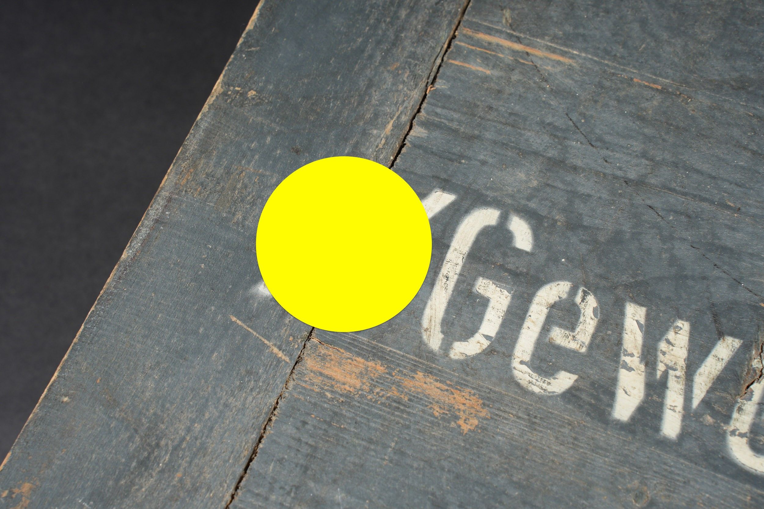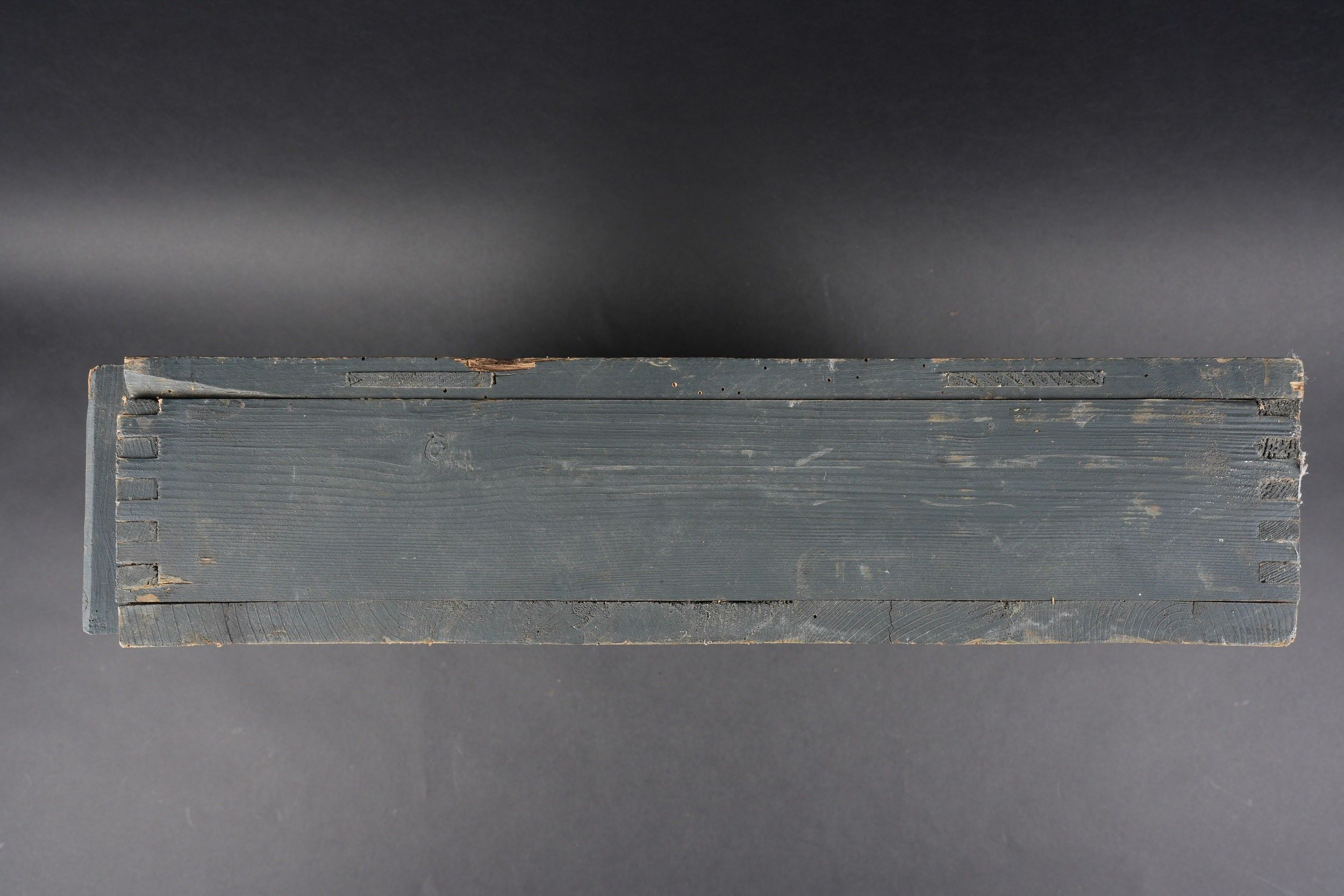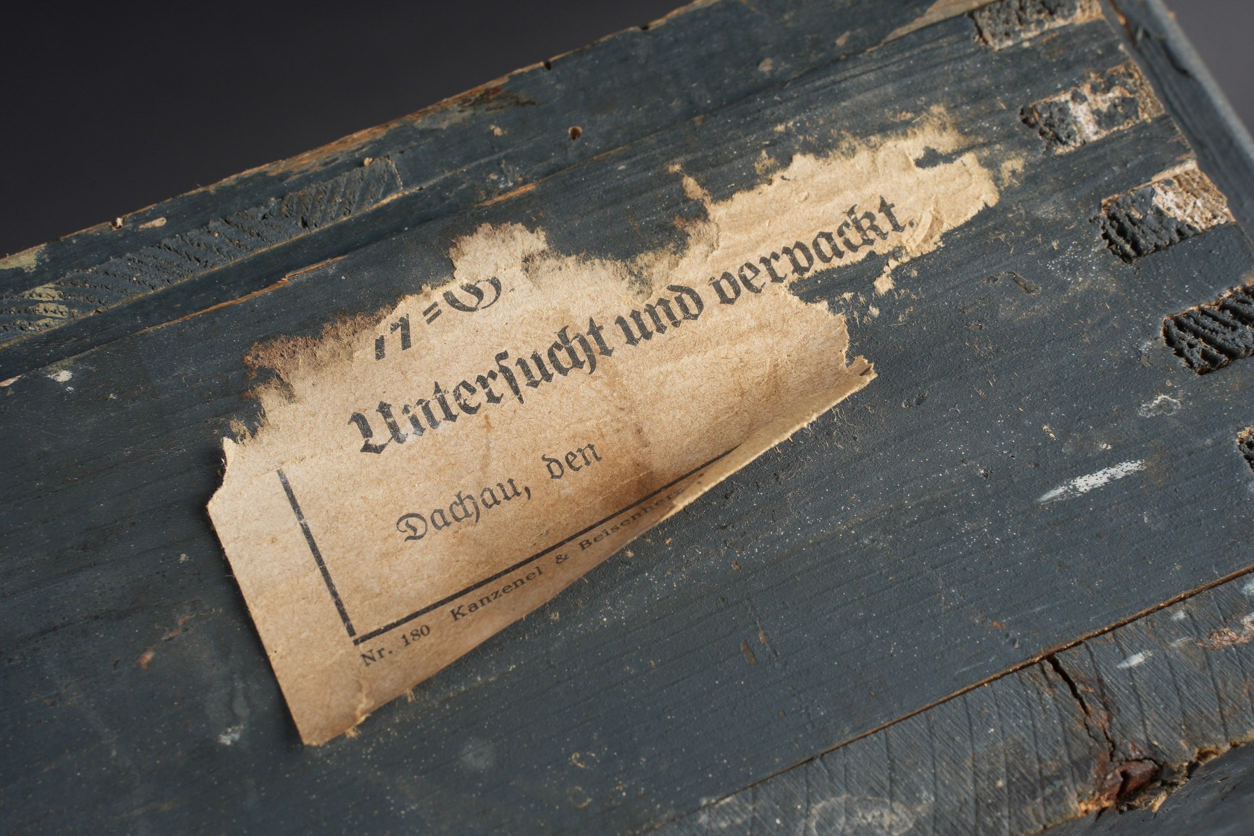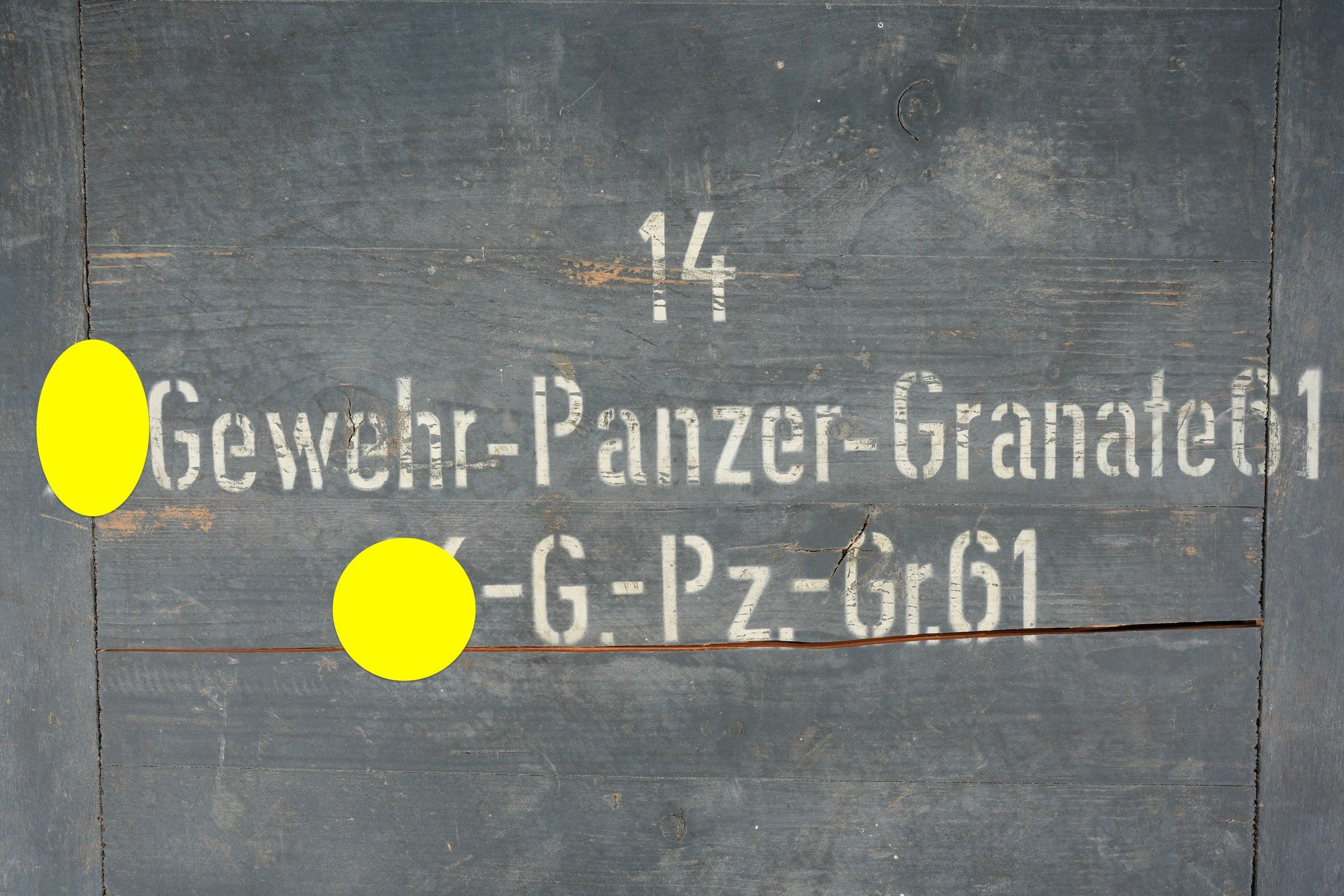 Caisse à grenade SS. En bois. Quelques manques visibles sur les côtés. Couleur d'origine à 80%. Couvercle marqué 14 SS Gewehr Panzer Granate 61 SS G PS GR 61. Poignée de transport et crochets de fermeture oxydés. Couvercle disposant de renfort en bois, doublé de drap noir. Etiquette marquée 14 Stück SS G PZ GR 61 DOV, datée 1943. Les racks interne sont présents. A noter une certaine usure et patine de la pièce. Etat II+. SS Grenade Box Made of wood with some visible chips along the edges. Retains about 80% of its original color. Lid marked 14 SS Gewehr Panzer Granate 61 SS G PS GR 61. Transport handle and metal latches oxidized. Lid reinforced with wooden strips lined in black cloth. Label marked 14 Stück SS G PZ GR 61 DOV dated 1943. Internal racks intact. Some wear and patina consistent with age. Condition II+.