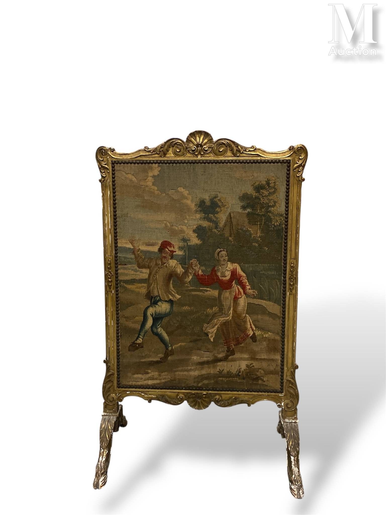 en bois doré sculpté et mouluré de coquilles et volutes d'acanthe, sur deux pieds sabots. Garni d'une tapisserie à décor de deux danseurs.