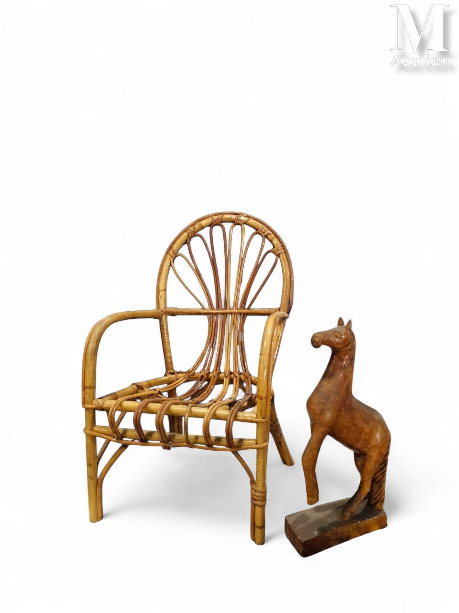 On y joint une sculpture en bois d'équidé et une chaise d'enfant osier