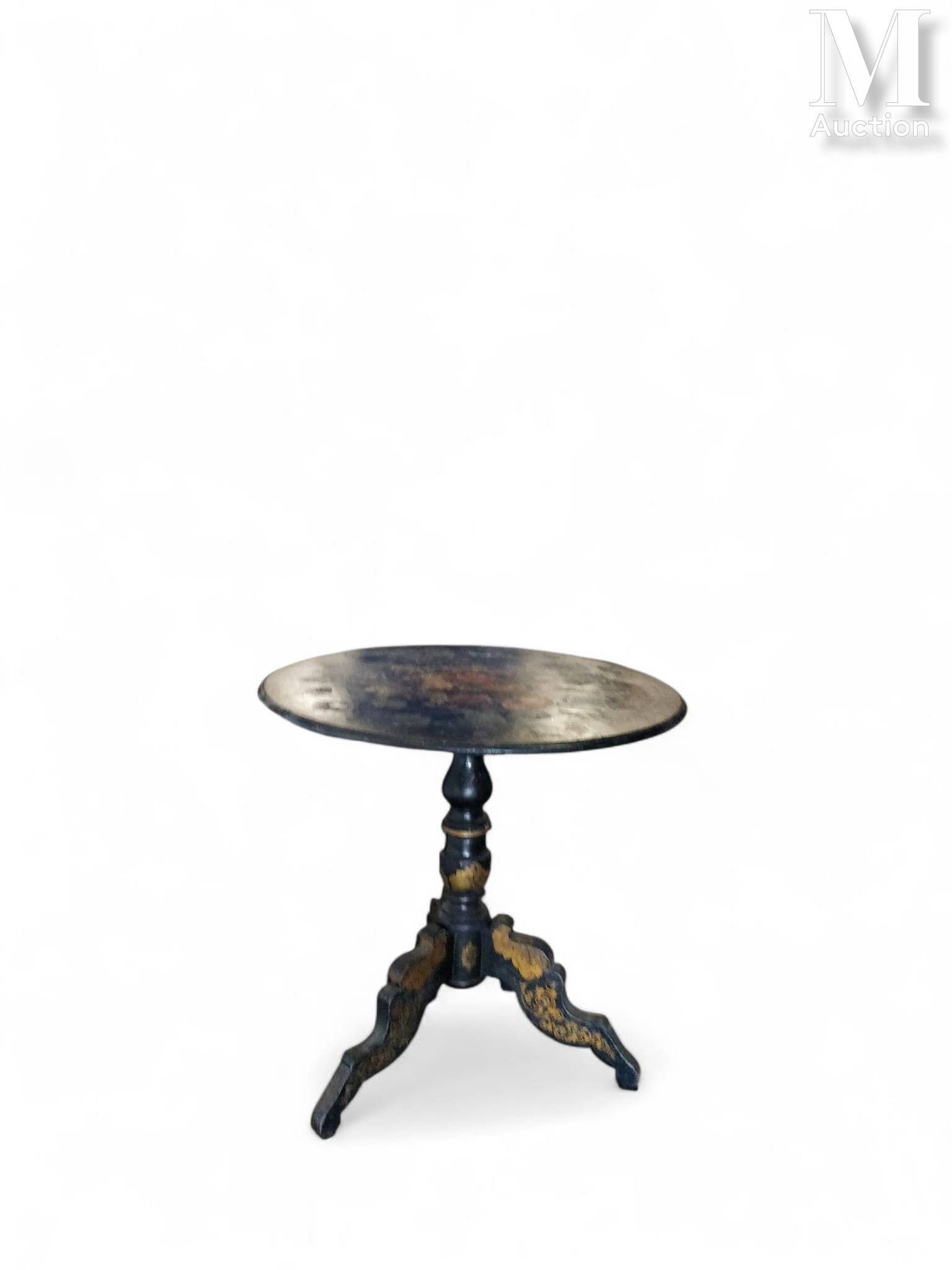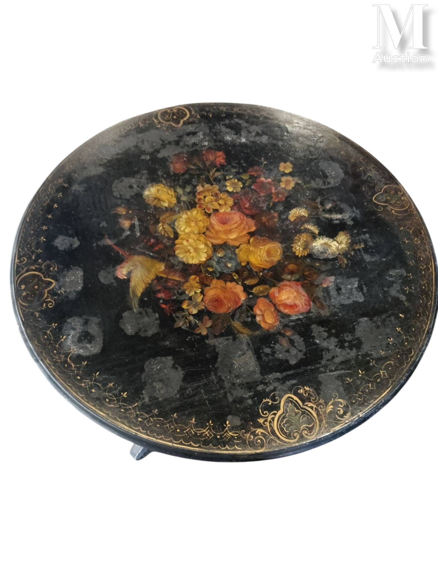 -Grand guéridon en bois noirci, le plateau à décor peint d'un oiseau au centre d'un bouquet de fleur. Le piétement tripode