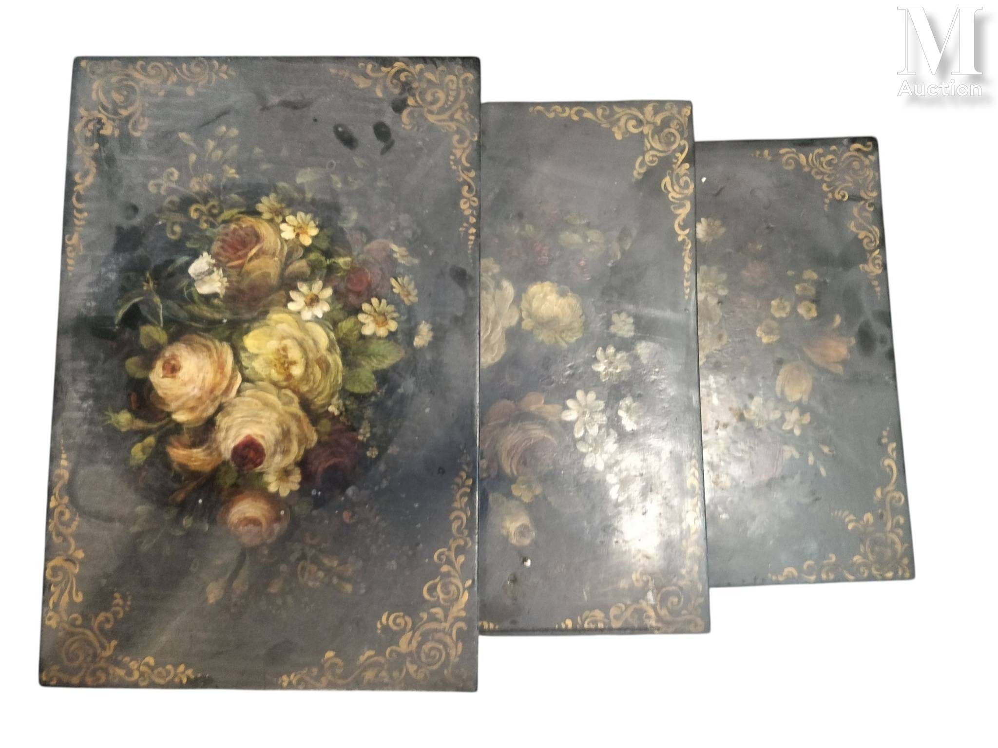 -Table gigognes en bois noirci, le plateau à décor peint d'un bouquet agrémenté de volute doré. Le piétement ajourée et polylobé se terminant par quatre petits pieds