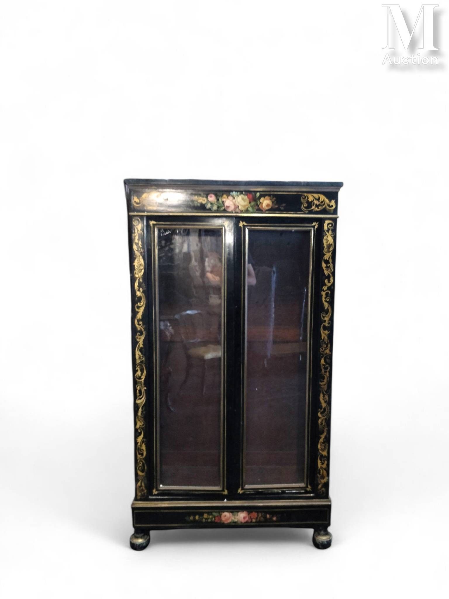 -Vitrine en bois noirci, elle ouvre à deux portes vitrés, la corniche cintré de laiton, flancs et montants à décors de feuilles d'acanthes dorés et de bouquets de fleurs. Elle repose sur quatre pieds toupies