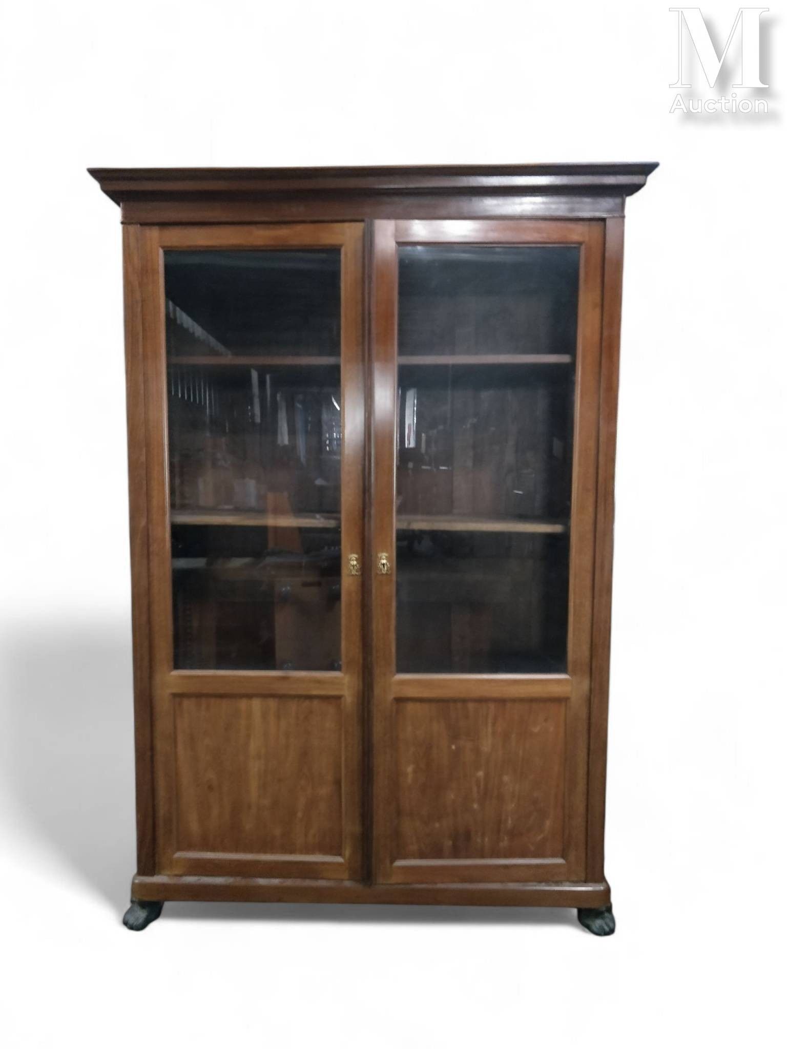 En bois naturel, elle ouvre à deux portes vitrées, la corniche moulurée à légère doucine, les montants droits reposant sur deux pieds griffes antérieurs et deux pieds droits postérieurs. Les entrées de serrures en laiton à décors de chimères