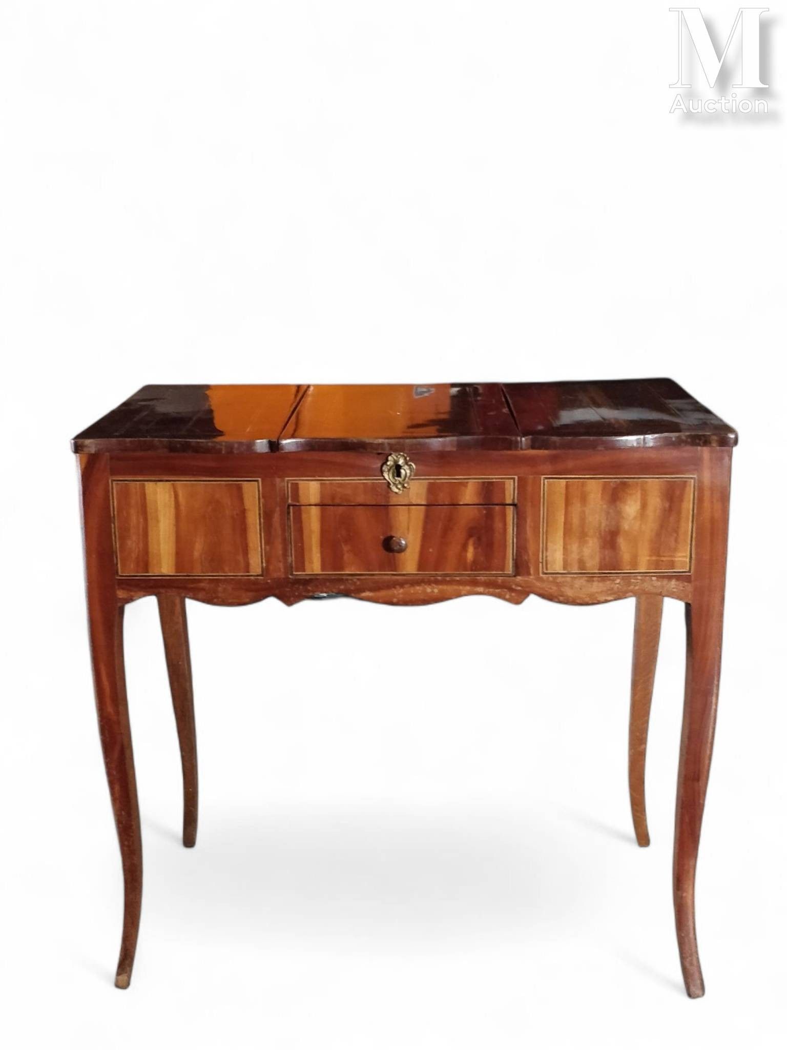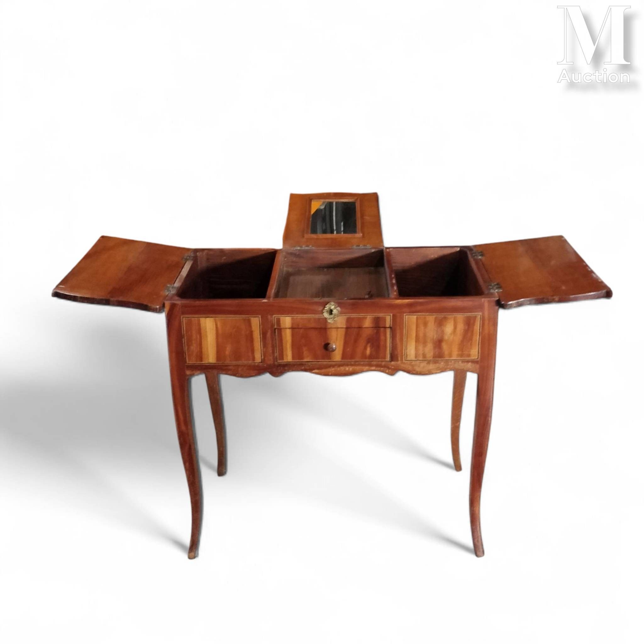 en bois et placage de bois indigènes, marqueterie de filet composé. Elle ouvre par trois battants découvrant casier et miroir ainsi qu'un tiroir en ceinture. Les montants droits et les pieds cambrés