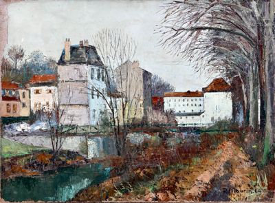Ecole FRANÇAISE du XXème siècle Village en bord de rivière H…